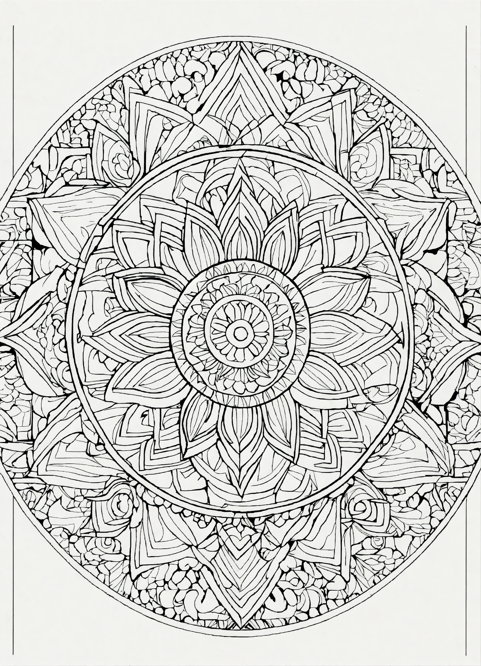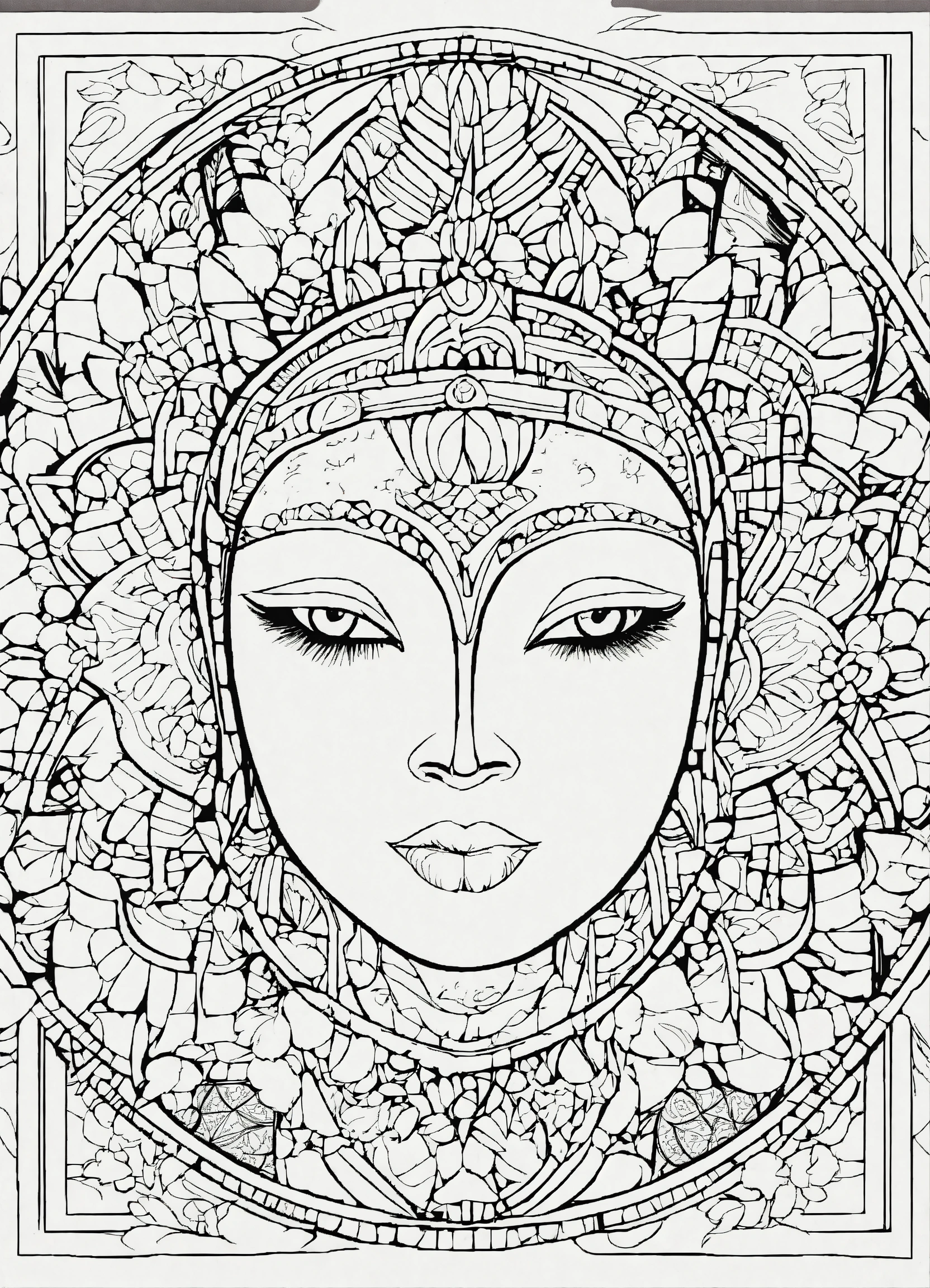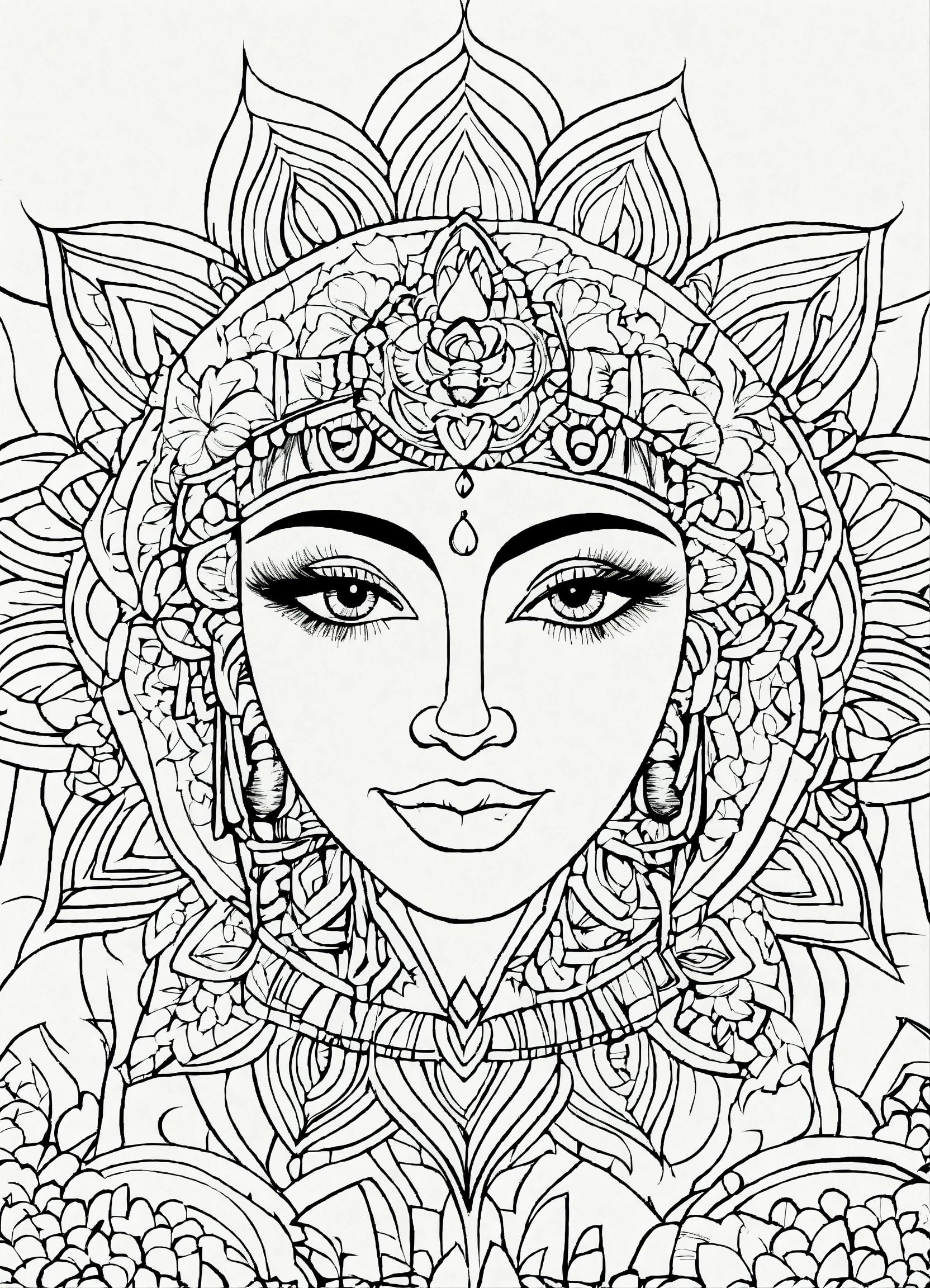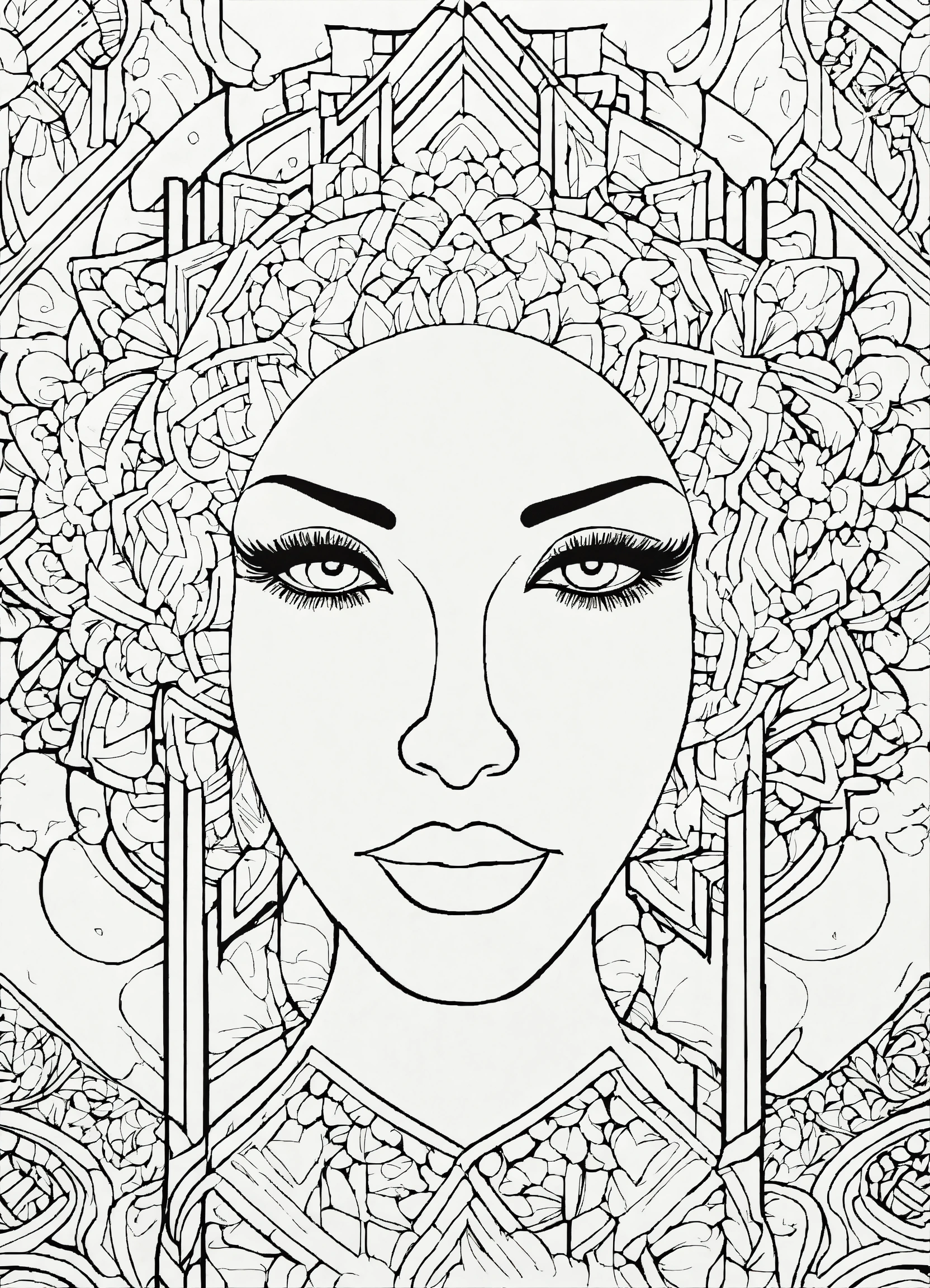 Coloring page for adults, bold lines, dark lines, mandala cartoon body, mandala cartoon face, mandala face, random, white background, clean line art, fine line art
