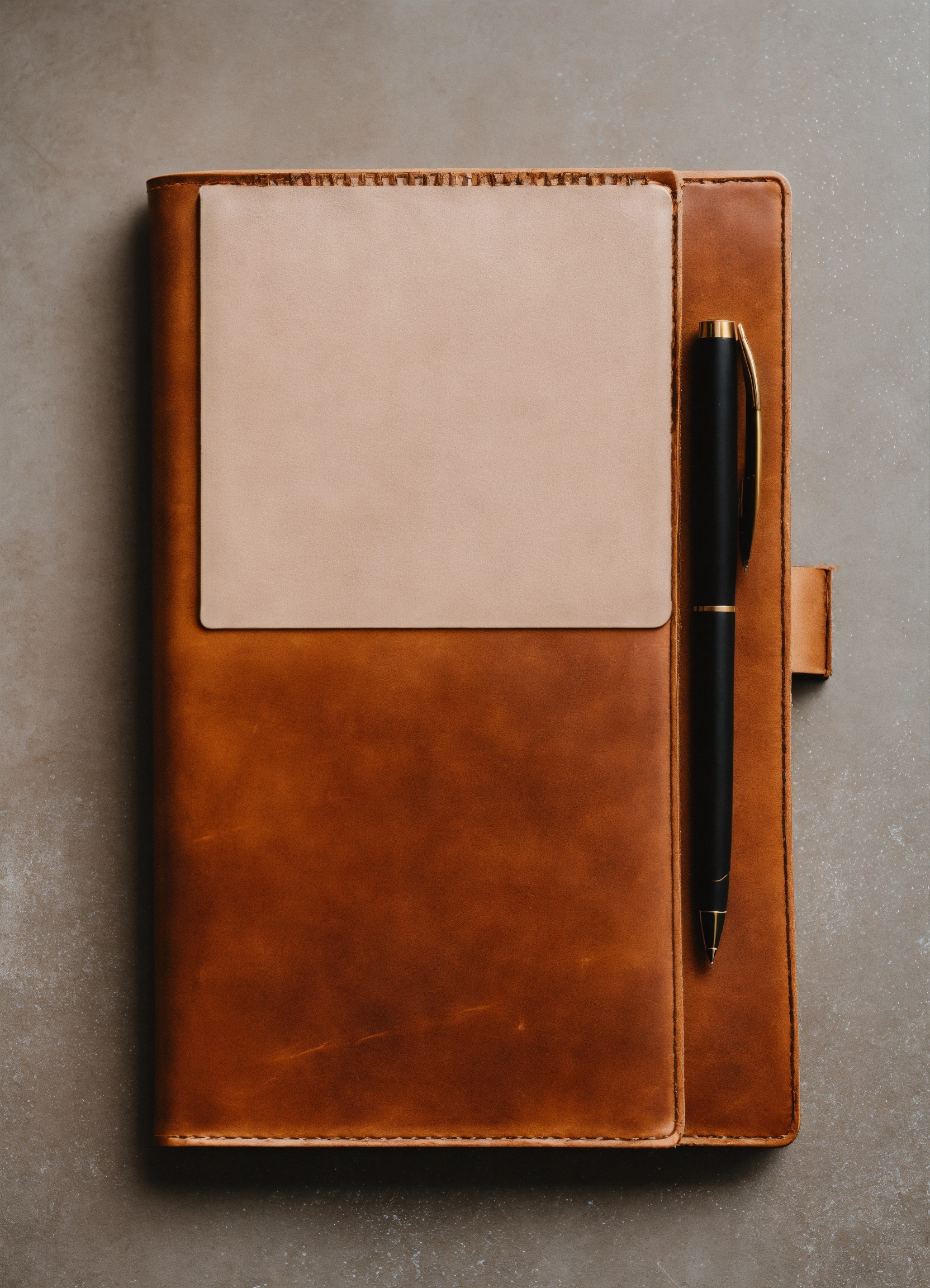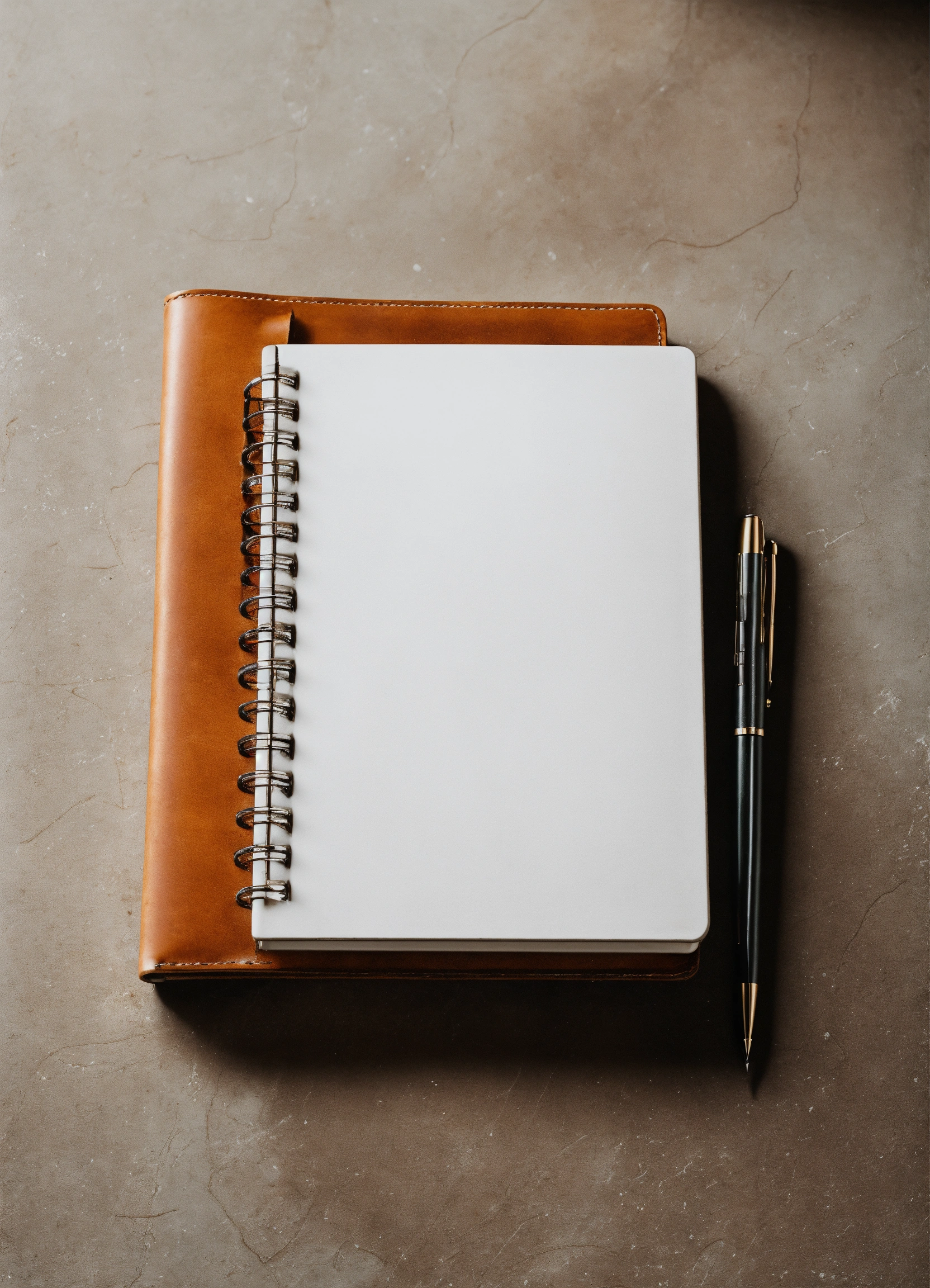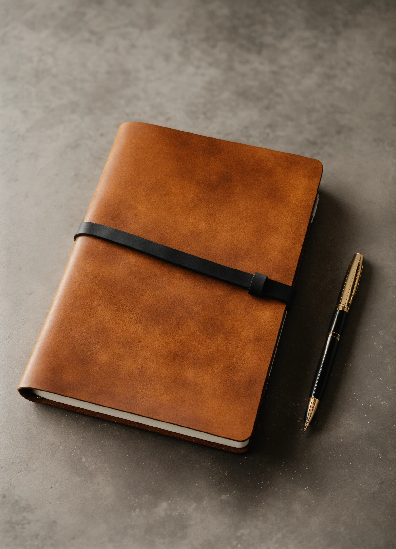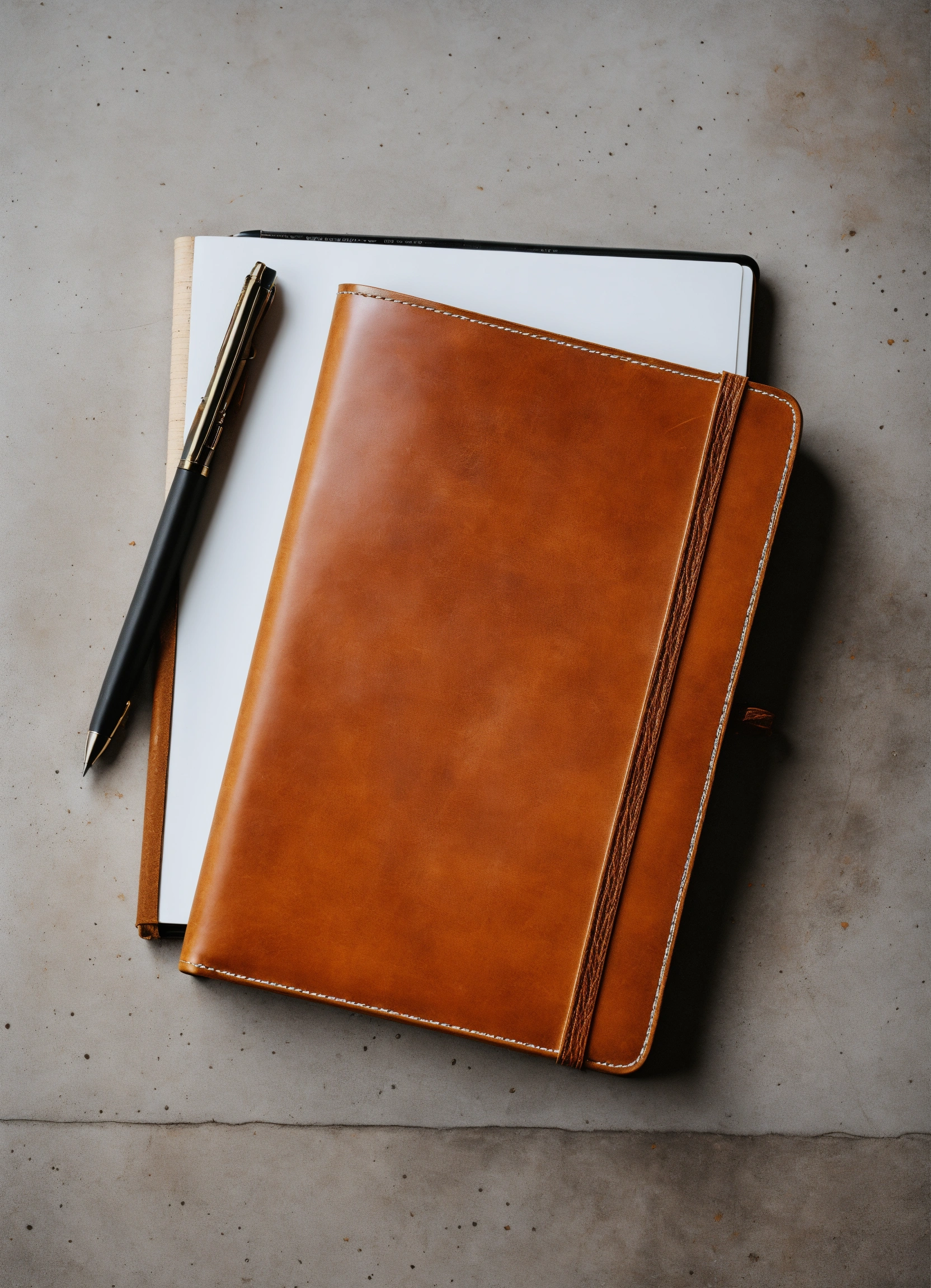 Leather notebook with pen lying on a white table, top view, minimalist style, on a concrete background