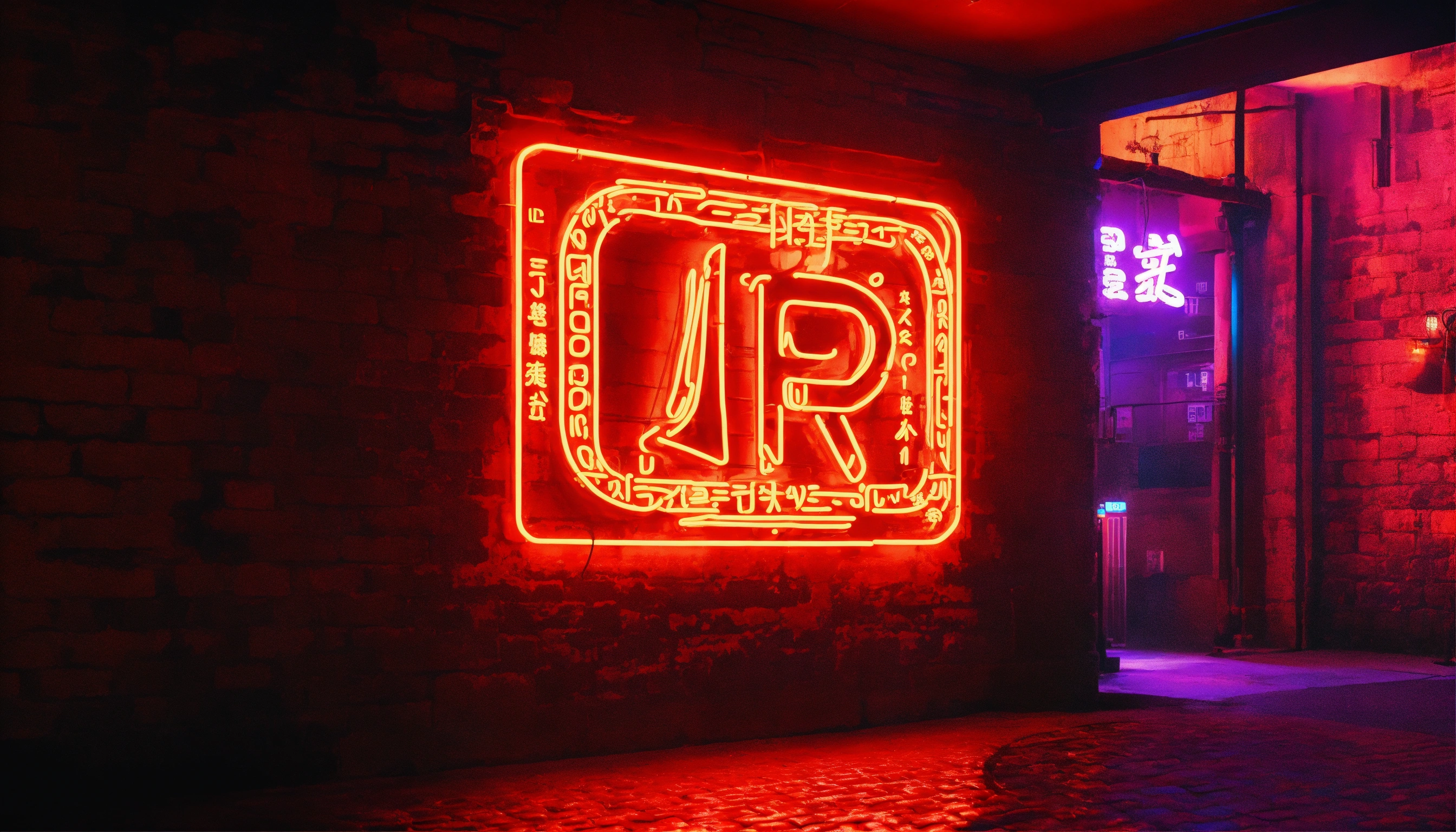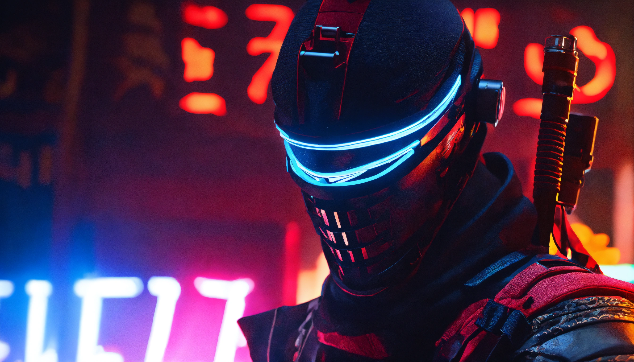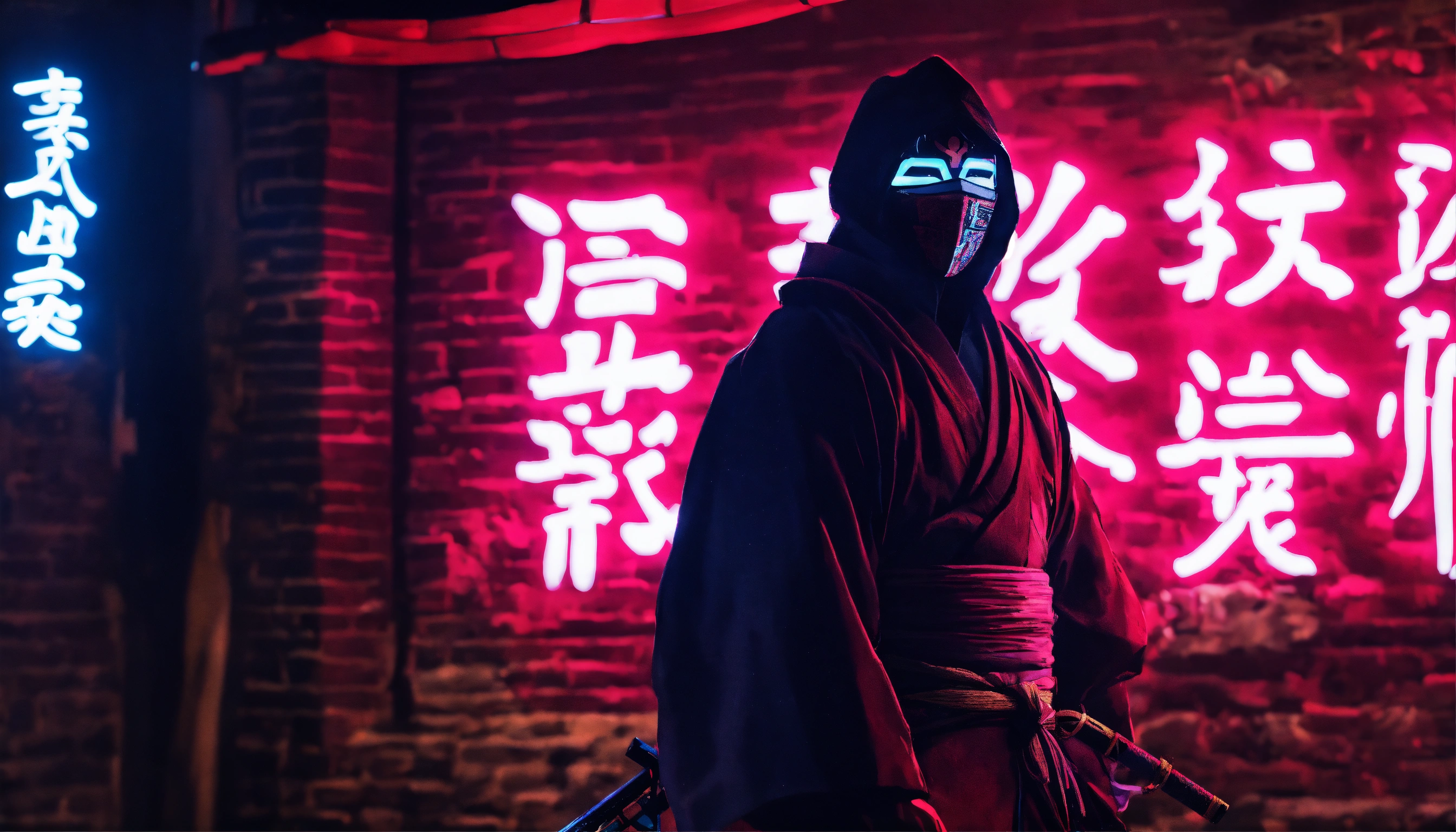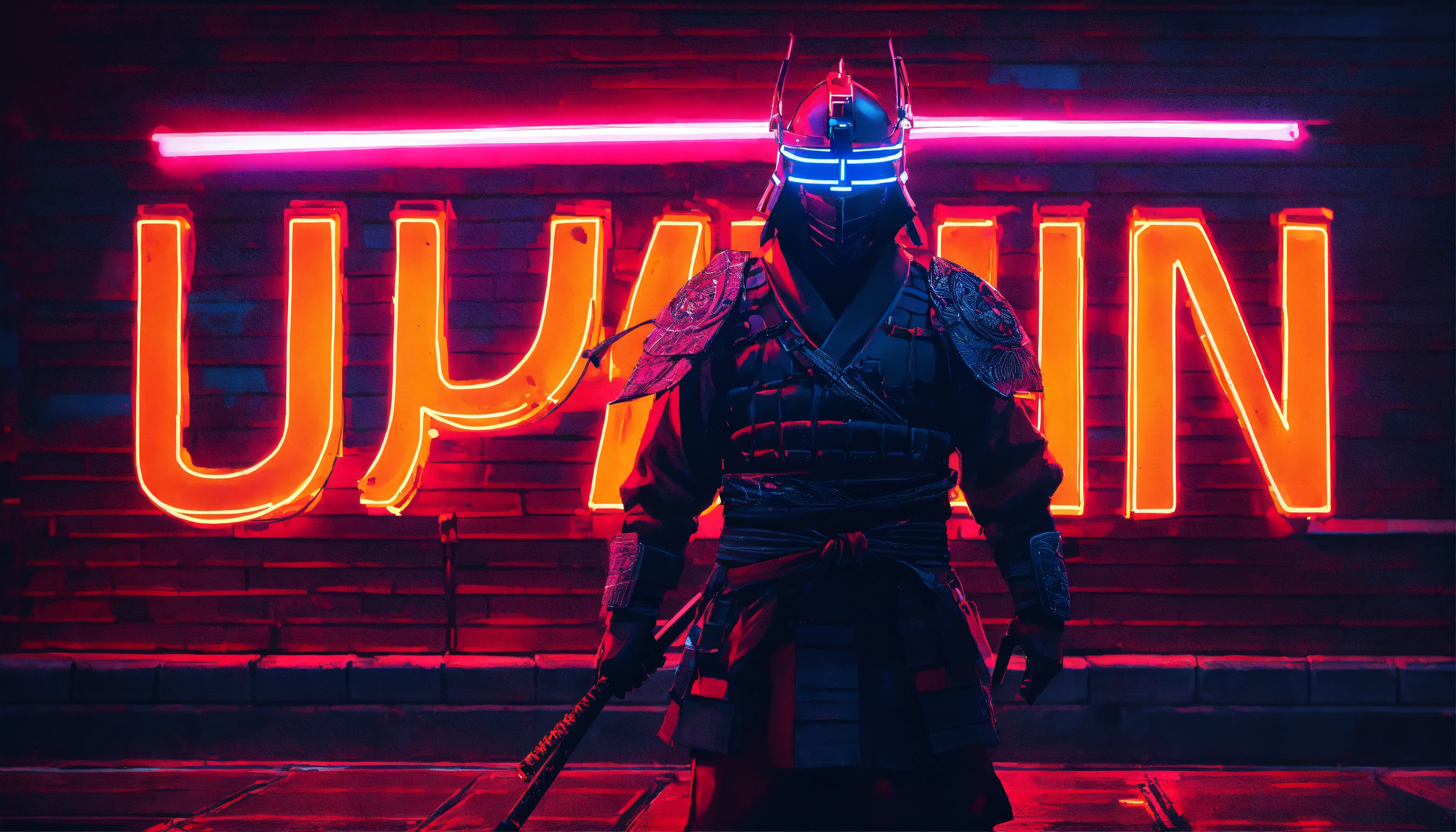 Text neon japan avec un masque de ronin sur un mur en brique ultra hd avec des néon