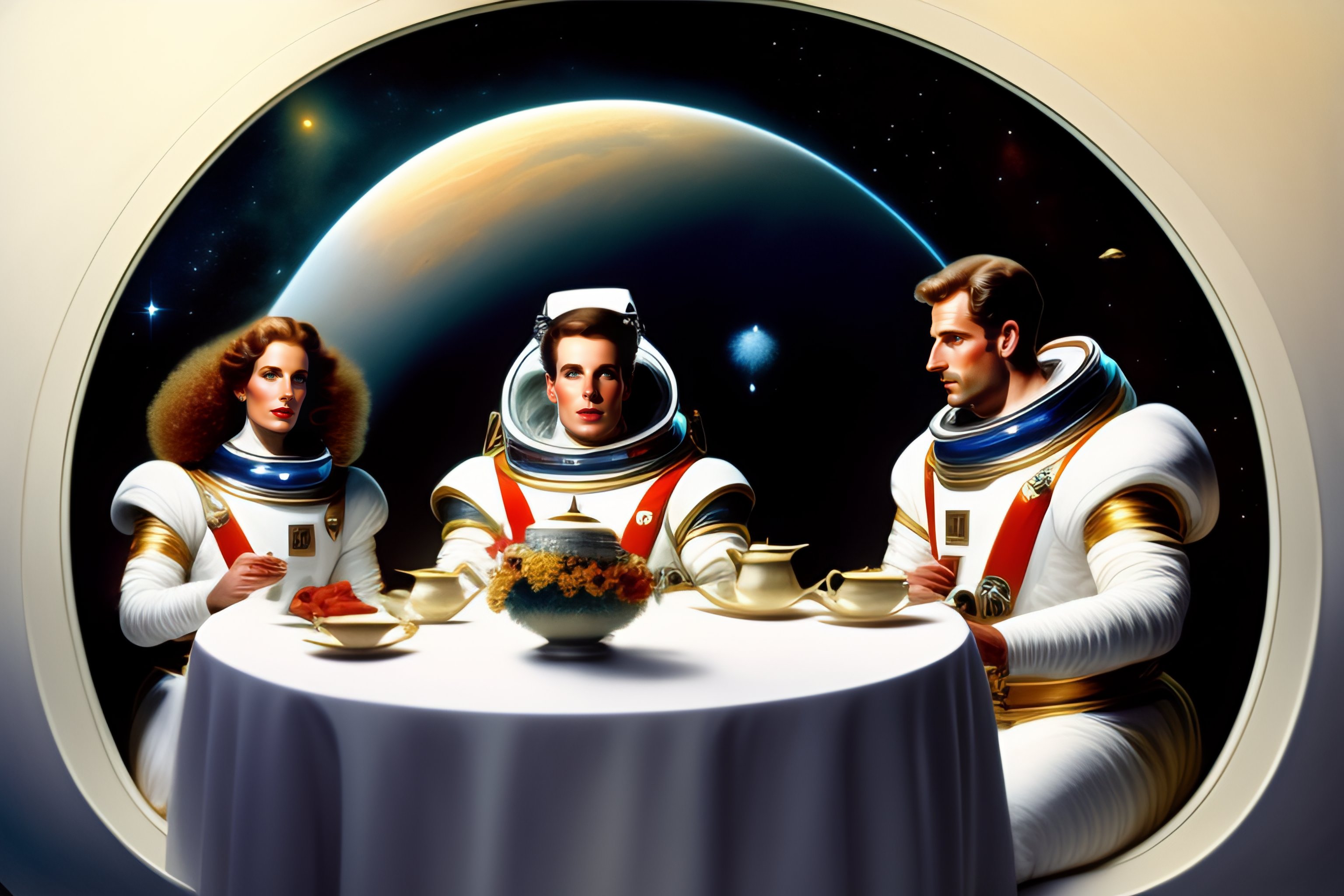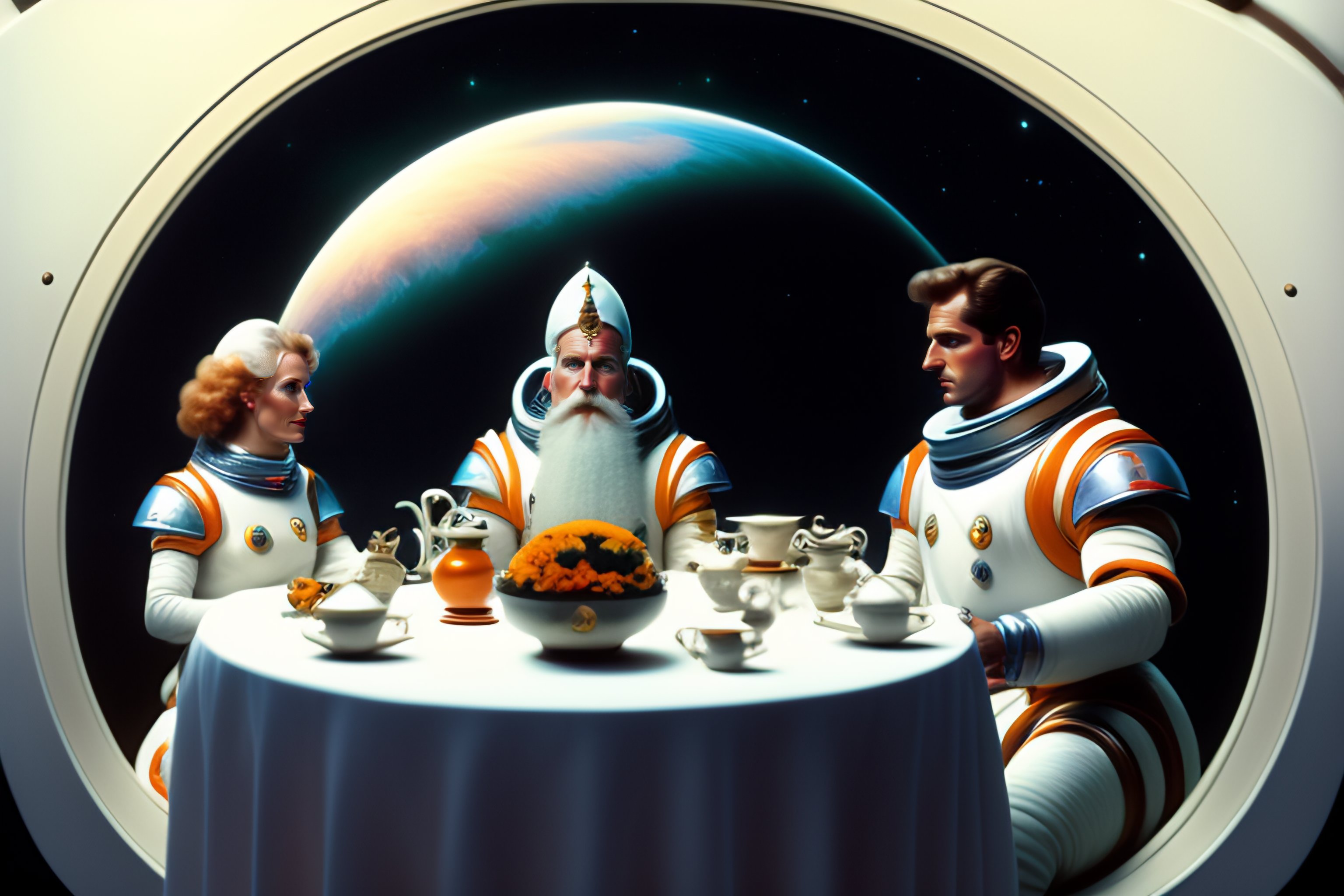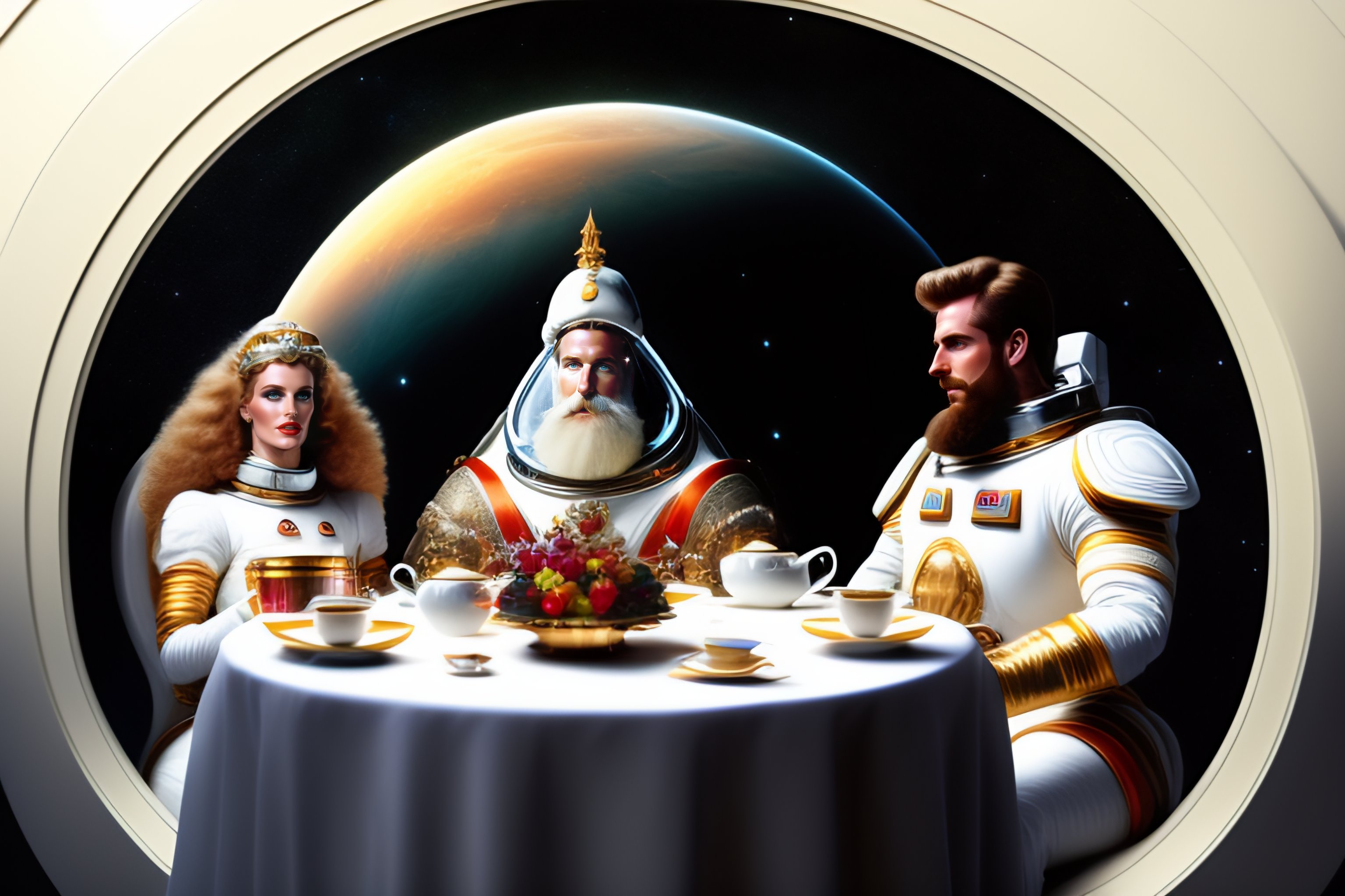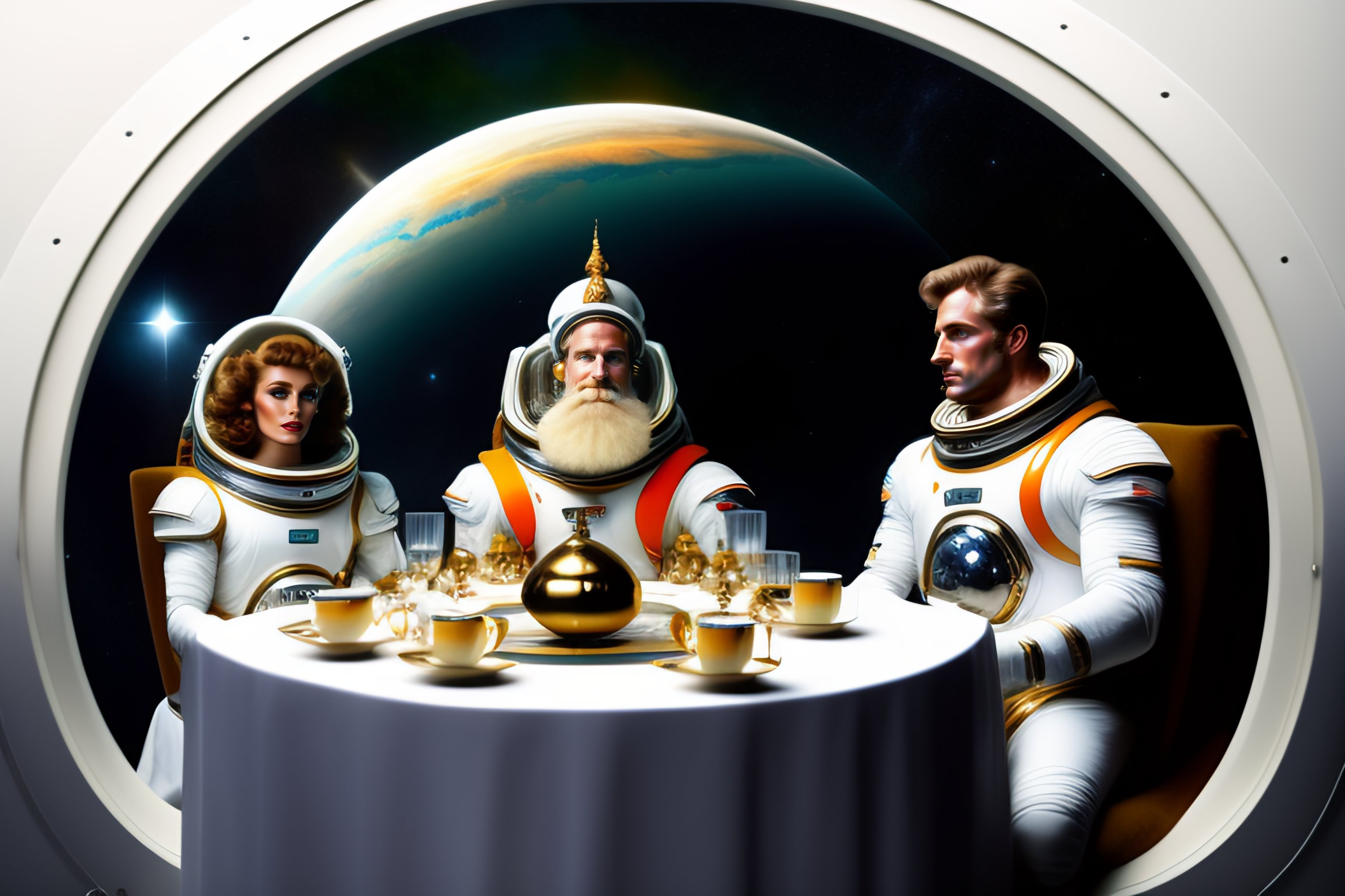 Three white men are drinking tea in a space shuttle. one of them is the god with a long white beard. two others are astronaunts having space suits on but without helmets. illuminators, stars. a big futuristic kettle and a vase full of jem are in the middle of the table which they are sitting at.