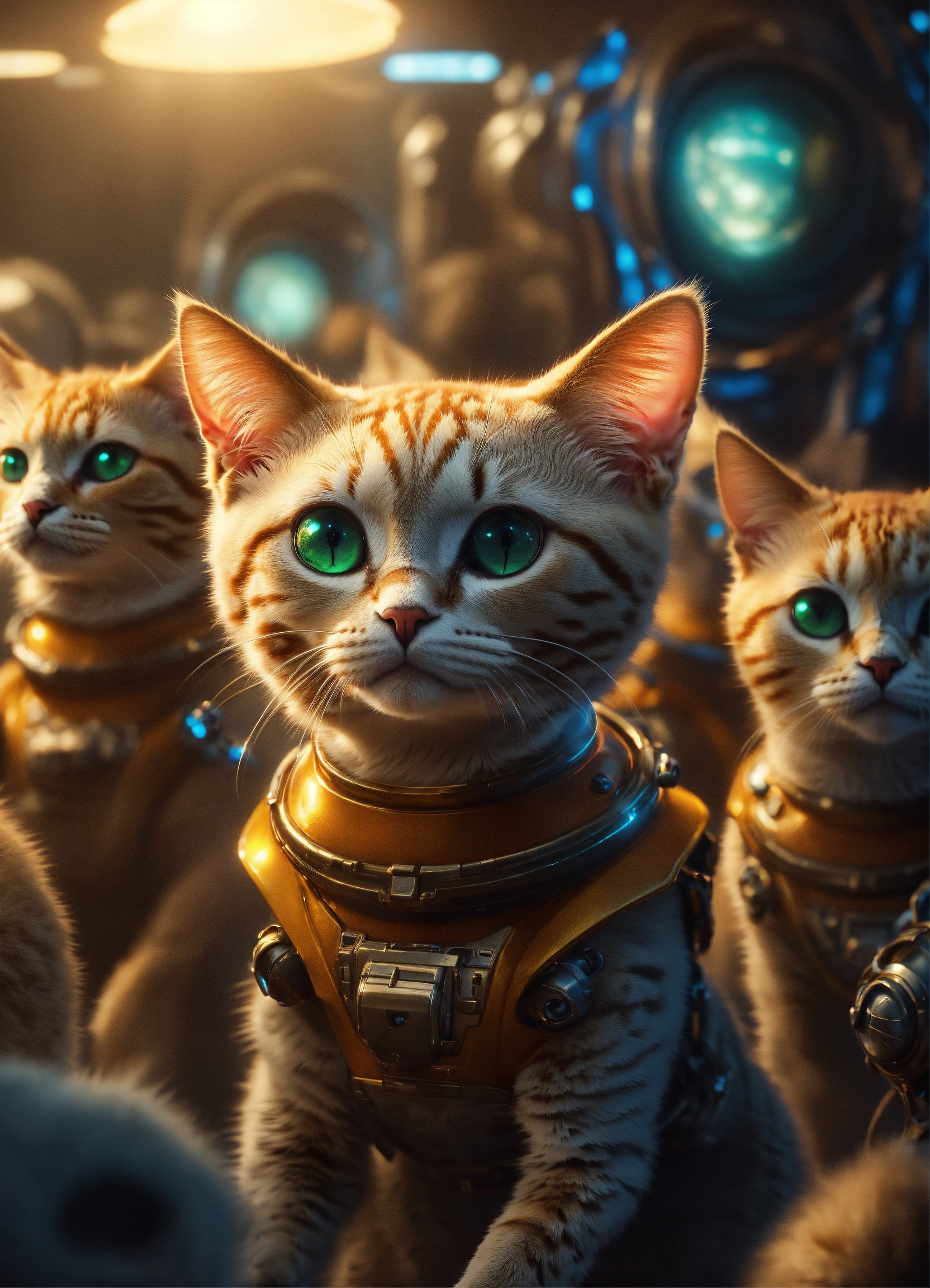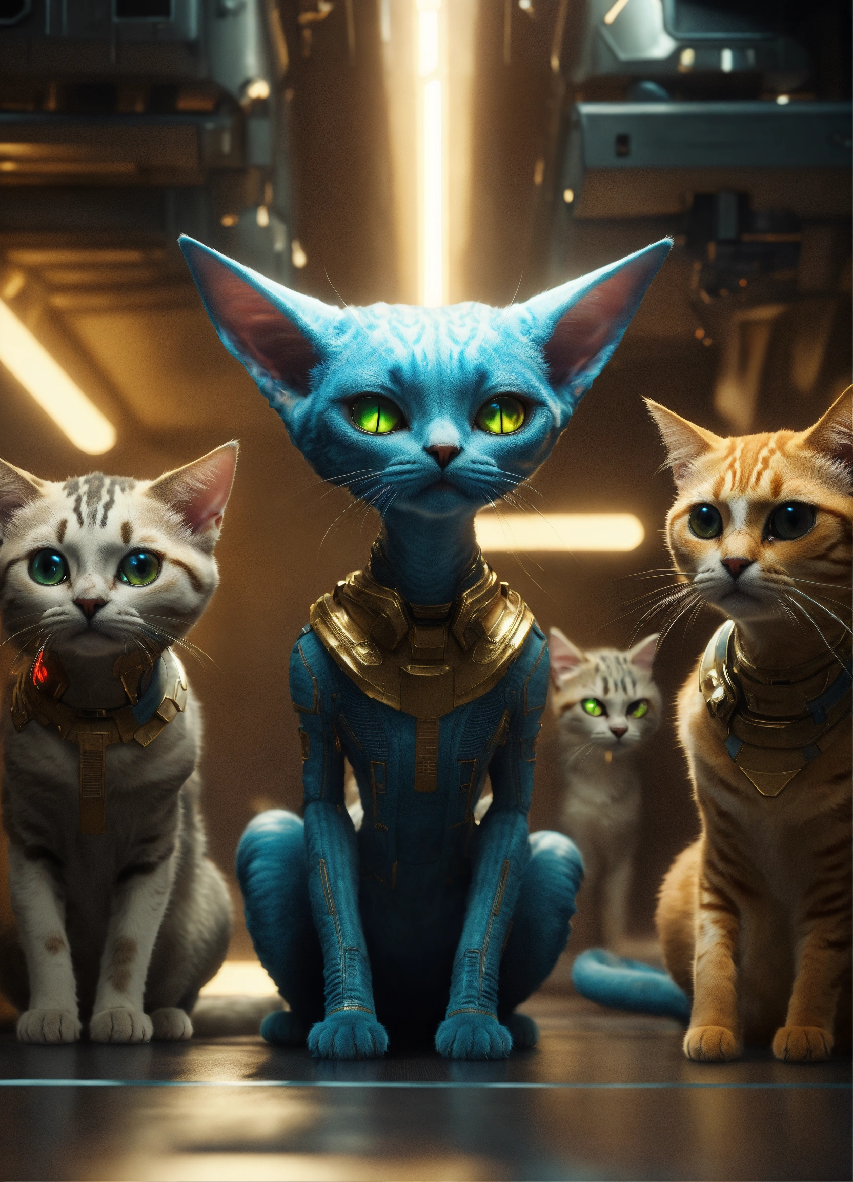Many different creepy alien race individuals cats. fantasy, sharp focus, digital art, hyper realistic, 8k, unreal engine, highly detailed, hd 4k, dramatic lighting, trending on artstation, background spaceship