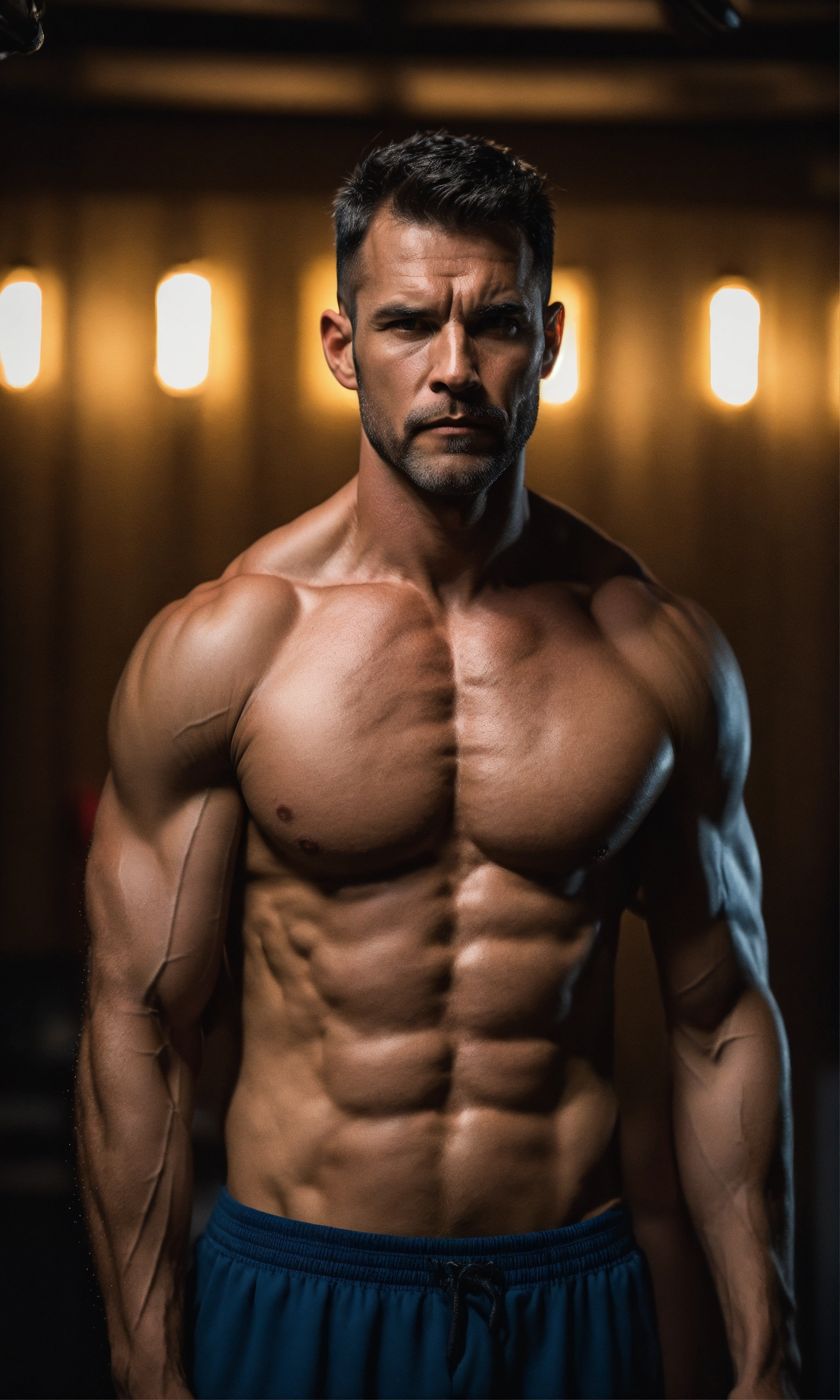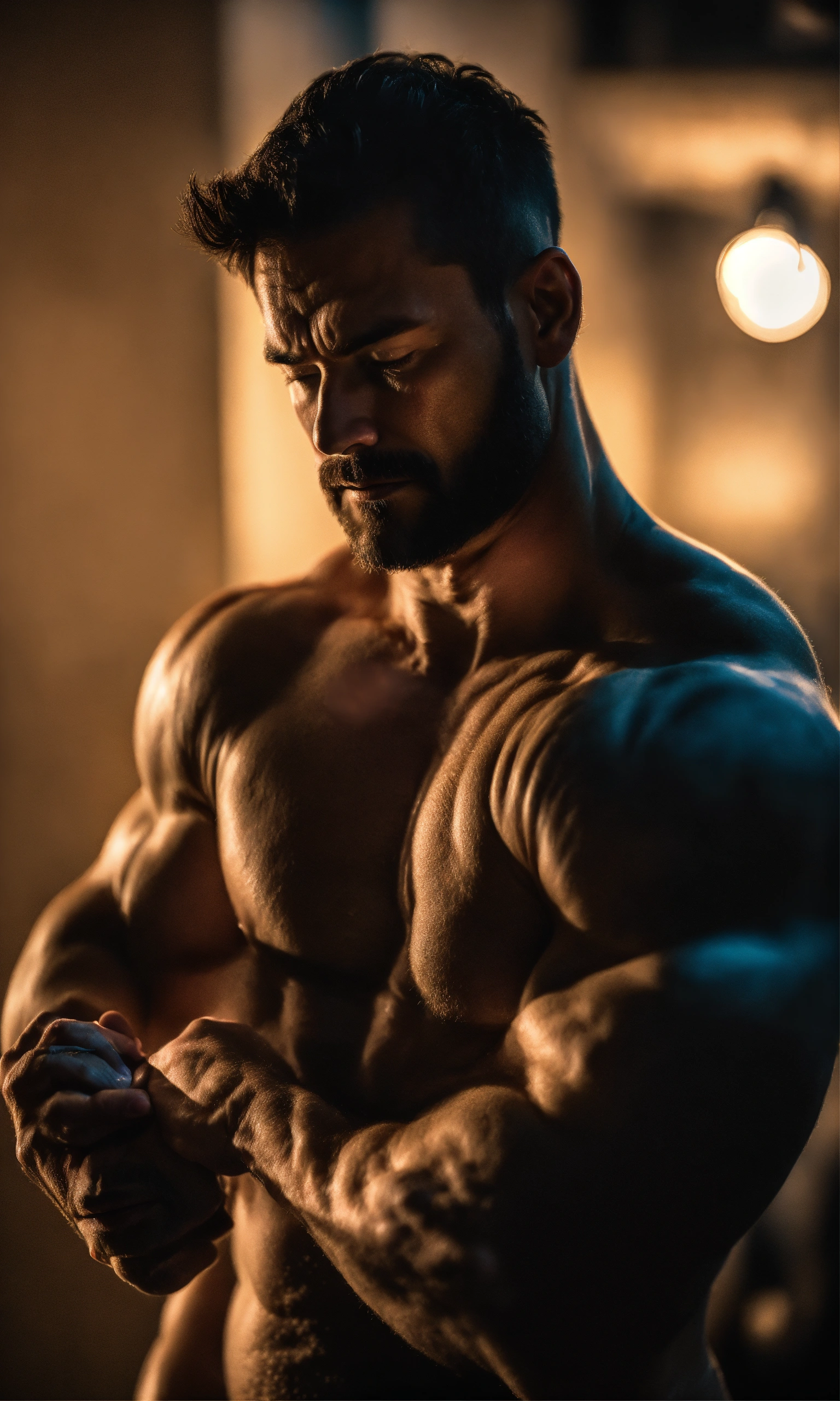 "inner and outer strength man testing the limits of body and mind", deep focus, minimal physical strain, nikon d850, soft ambient lighting, photorealistic portrayal of subtle resilience.