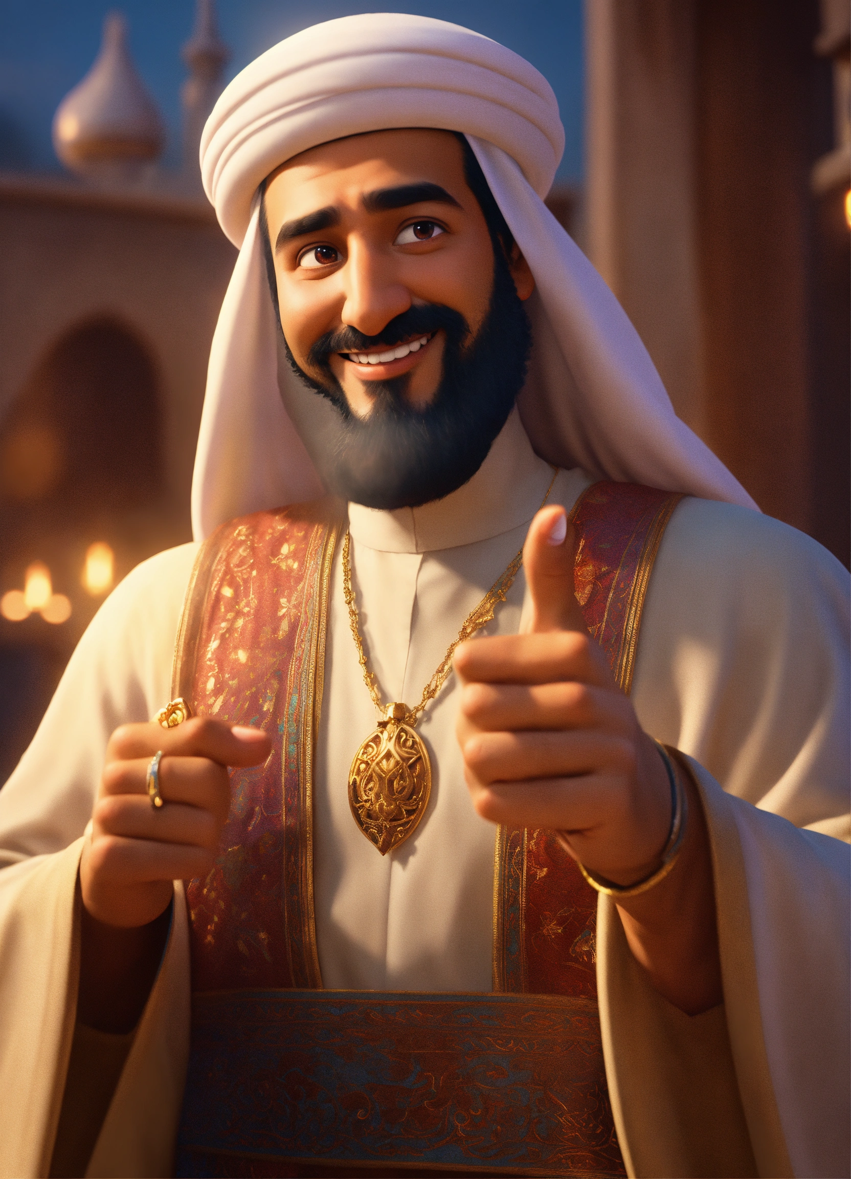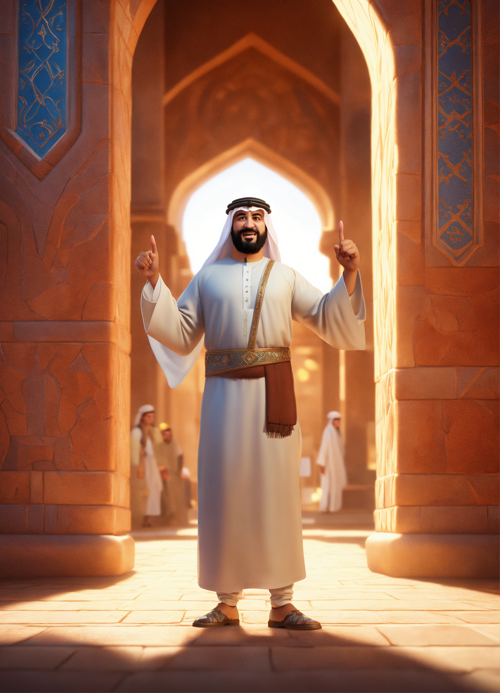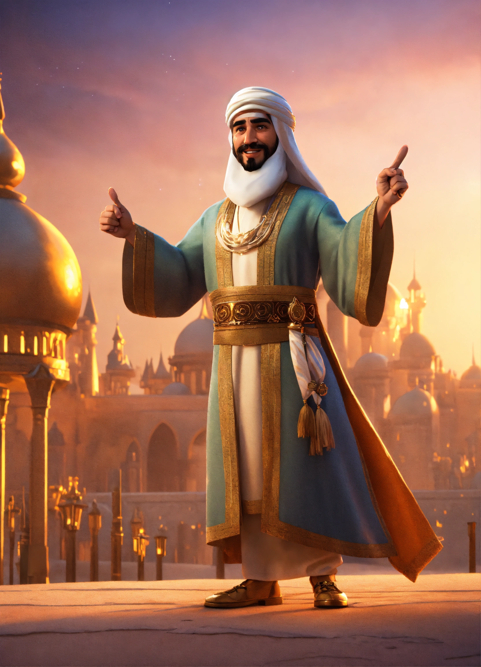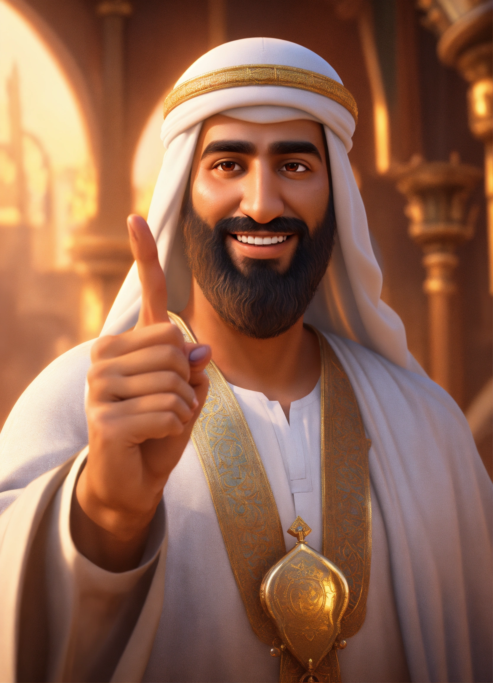 Create a 3d rendering of an arab sheikh showing his index finger up in disney animation style. he points his finger up - he is triumphant - he is delighted - he is joyful (pixar art style)++ highly detailed digital painting, art stations, concept art, soft focus, hard focus, illustrations. cinematic, visual effects, hdr, unreal engine 5, ray tracing, soft light, 8k, high detail, sparkling backlighting, luxury gem, game art, 3d, cartoon, colorful, magical, mysterious
