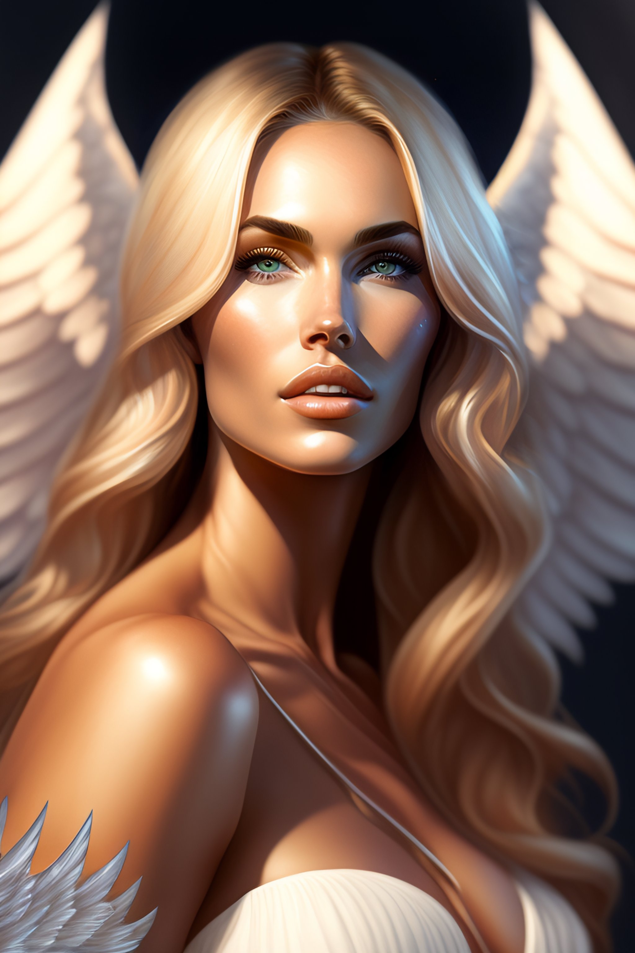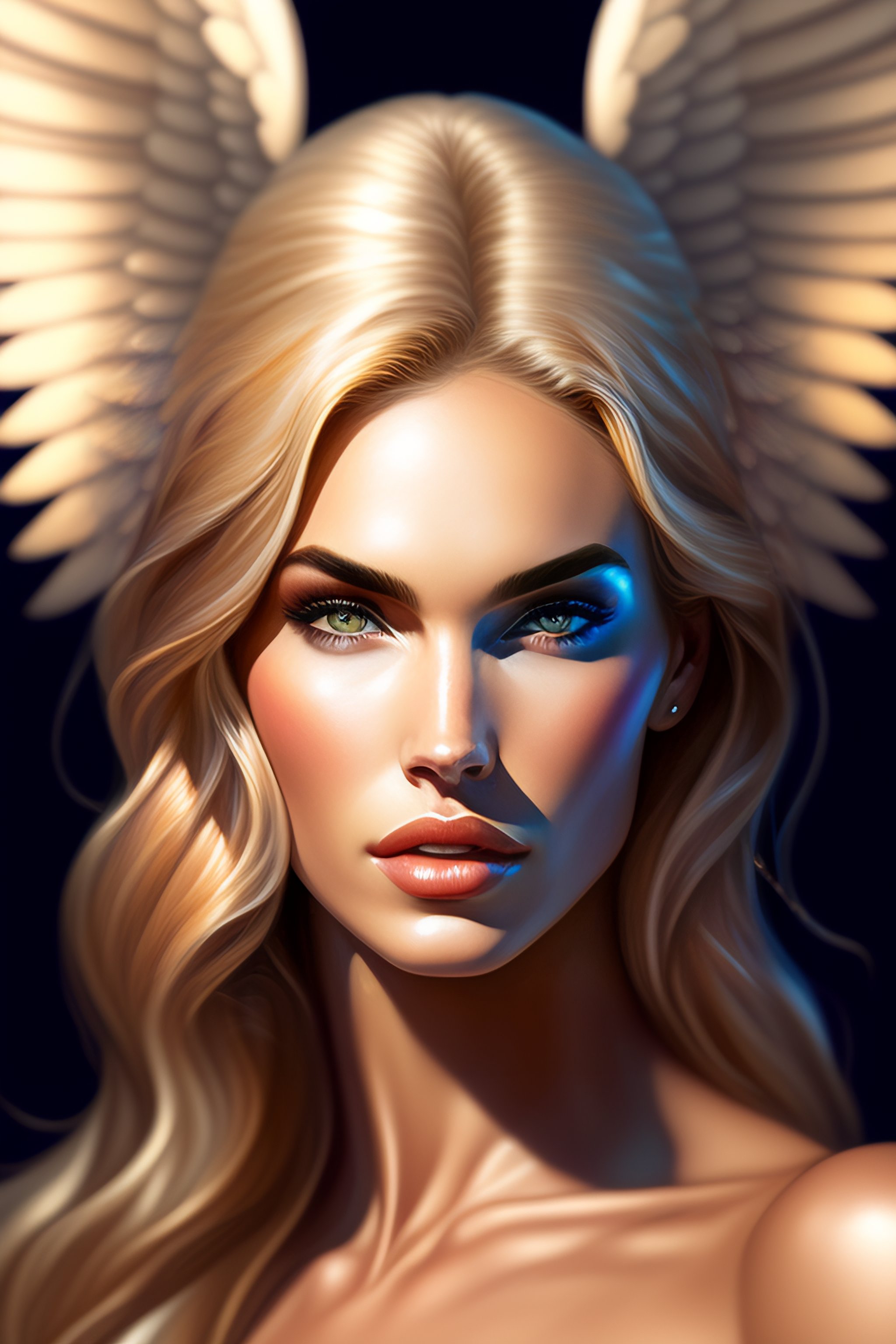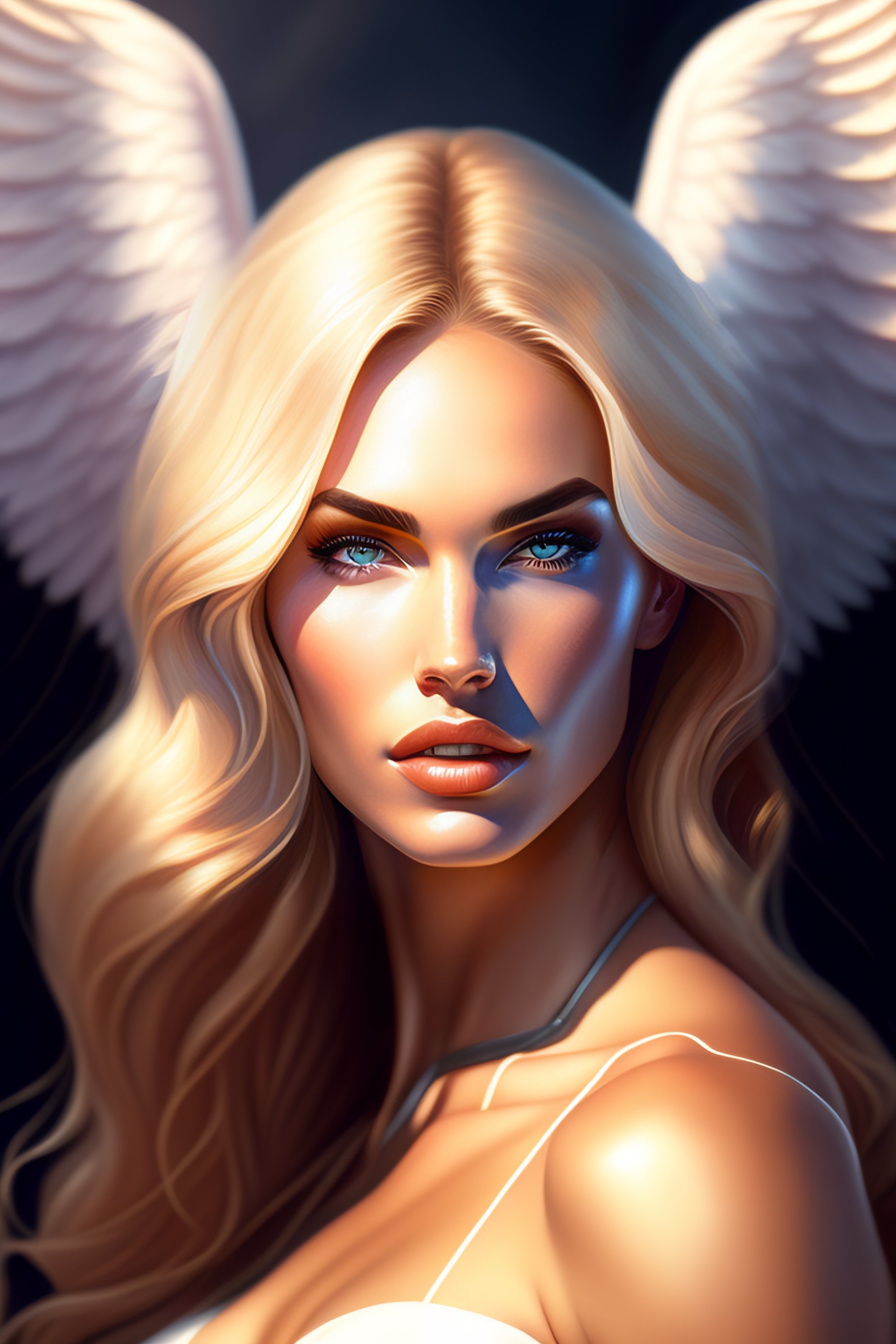 Portrait of megan fox as an blonde angel, wings, intricate, headshot, highly detailed, digital painting, artstation, concept art, sharp focus, cinematic lighting, illustration, art by artgerm and greg rutkowski, alphonse mucha, cgsociety