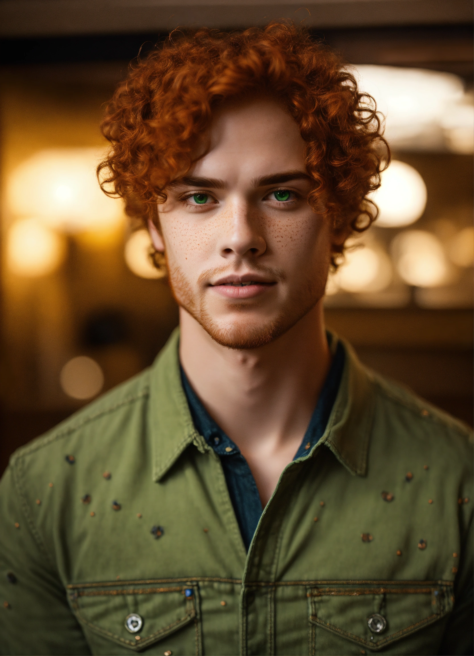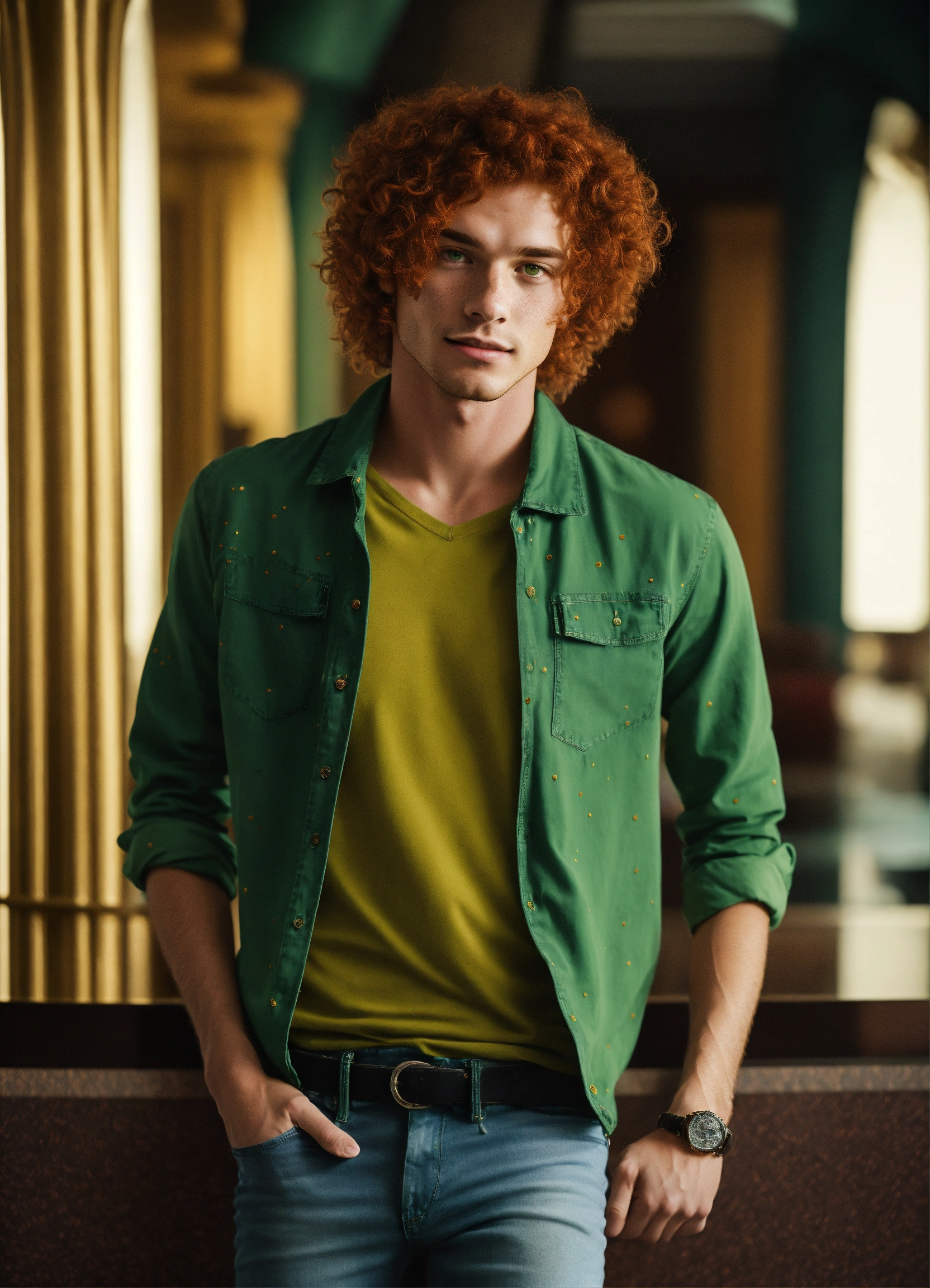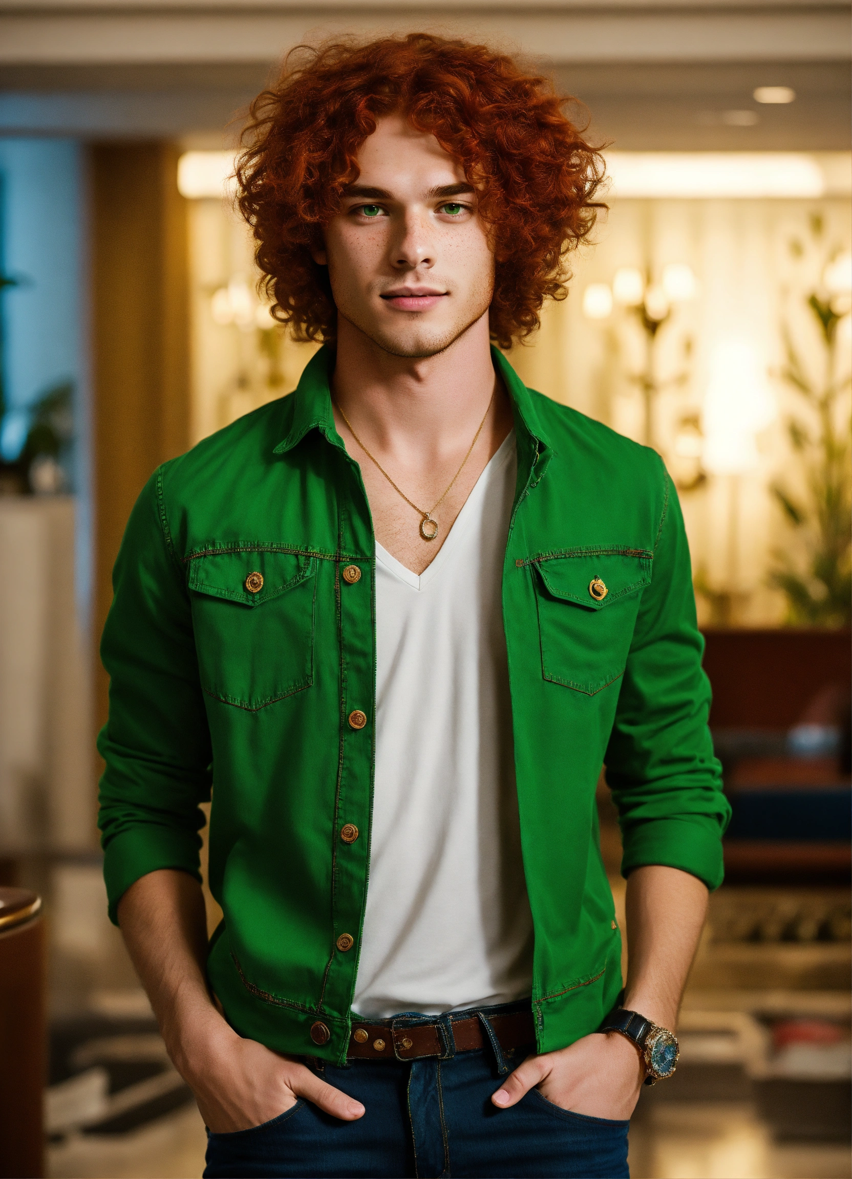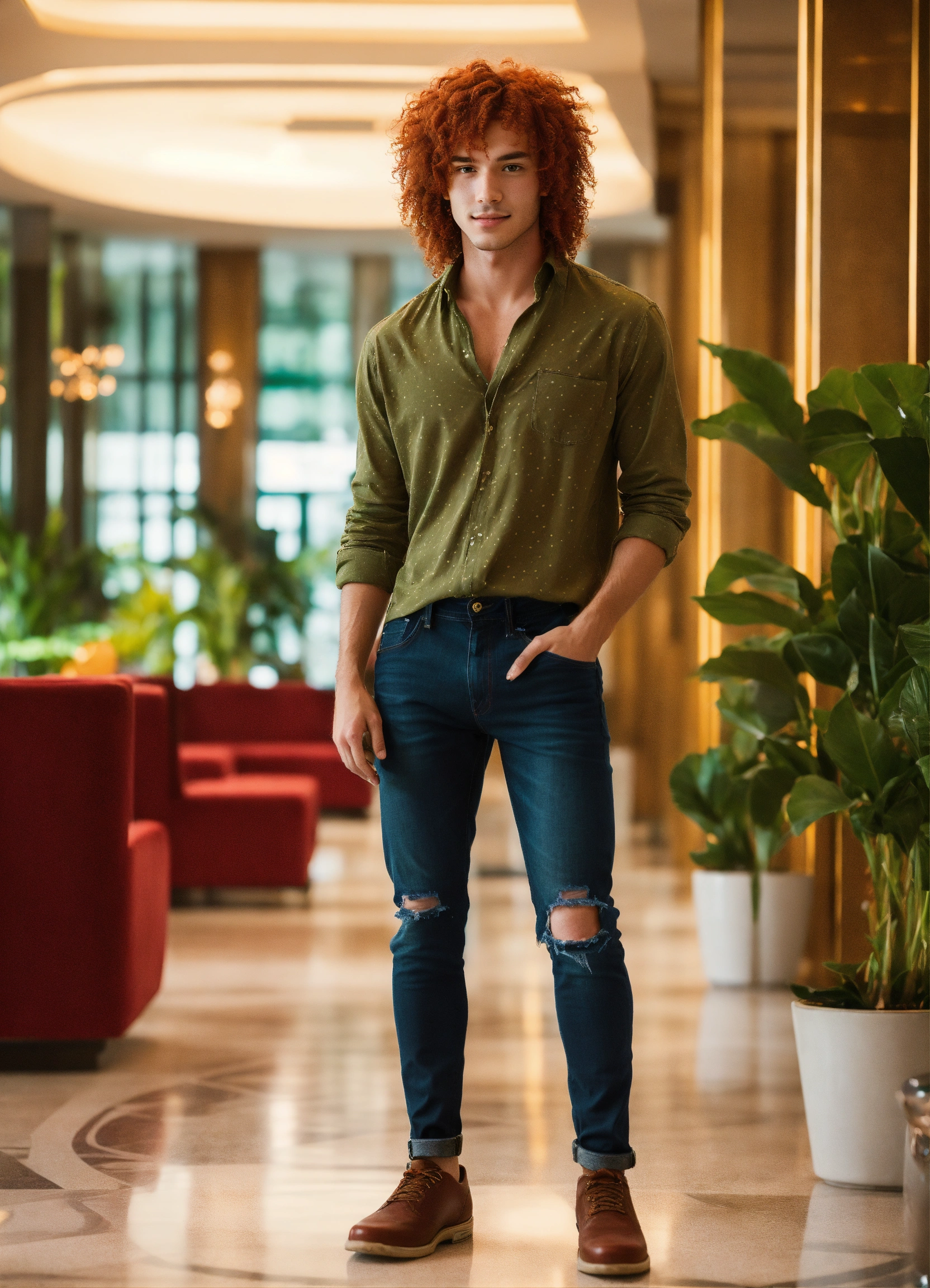 An alien university male student. red curly hair. angular face. round green eyes. freckled body, in haute couture jeans and shirt. in upscale hotel lobby. athletic frame happy persona.
