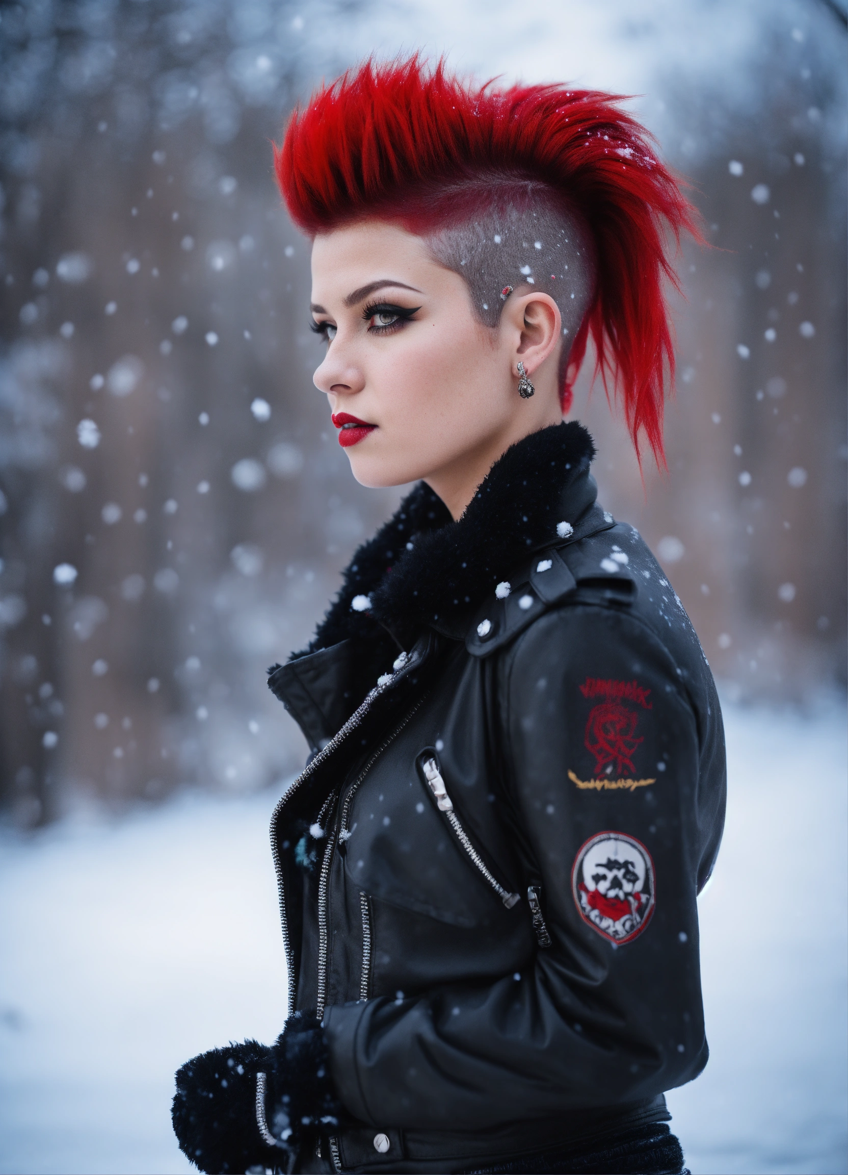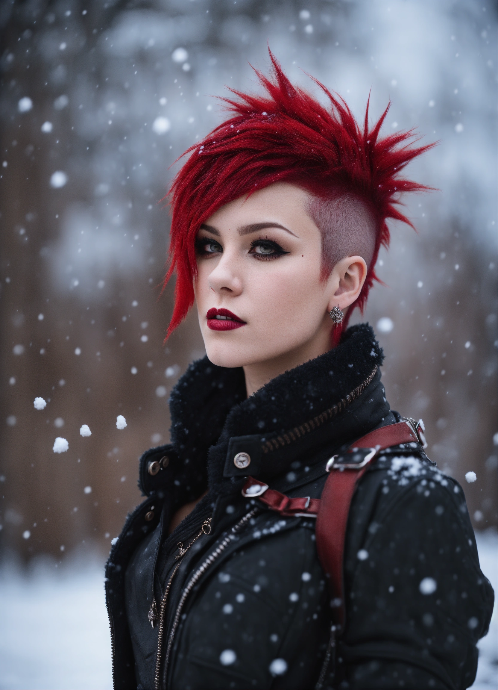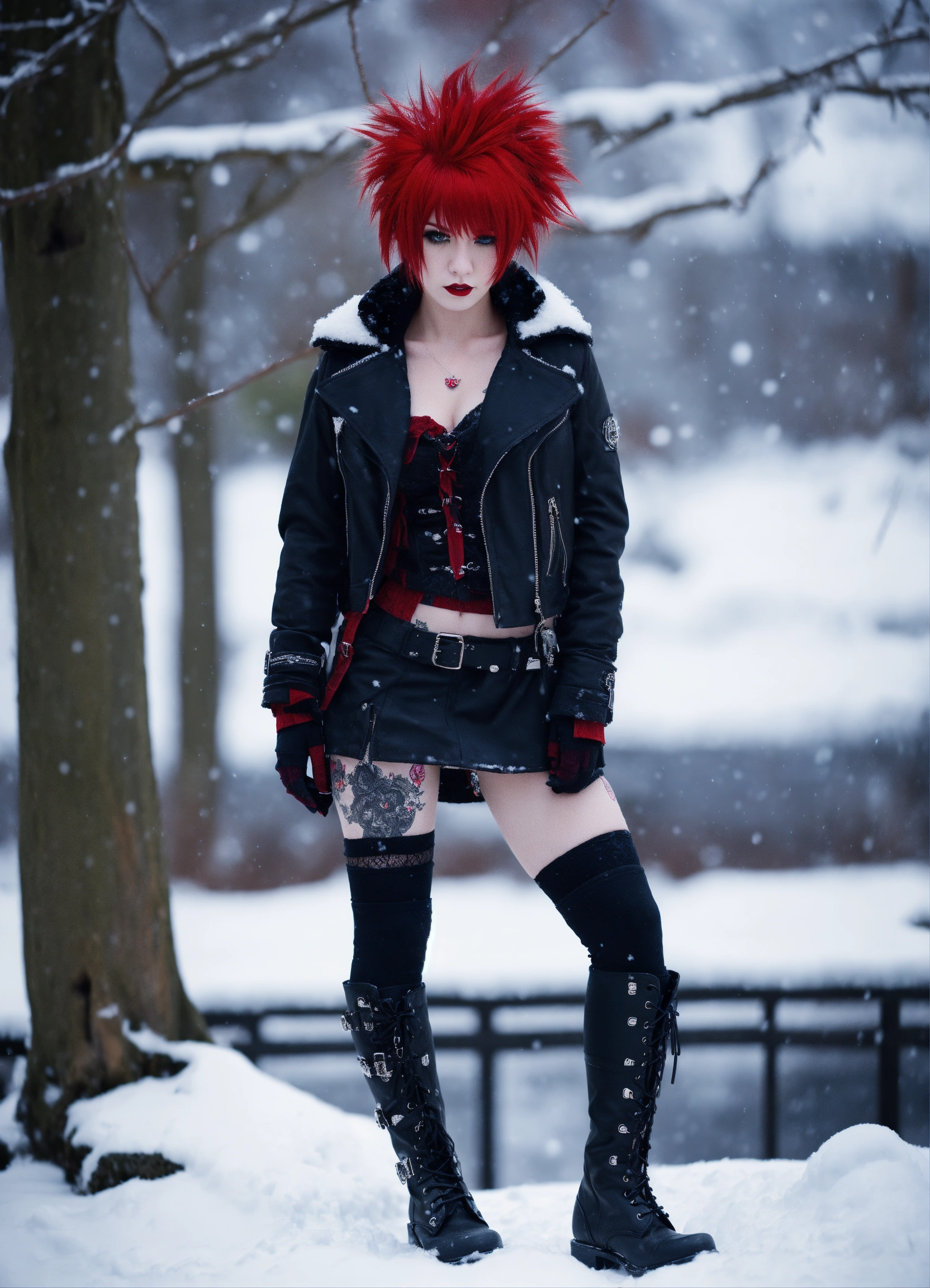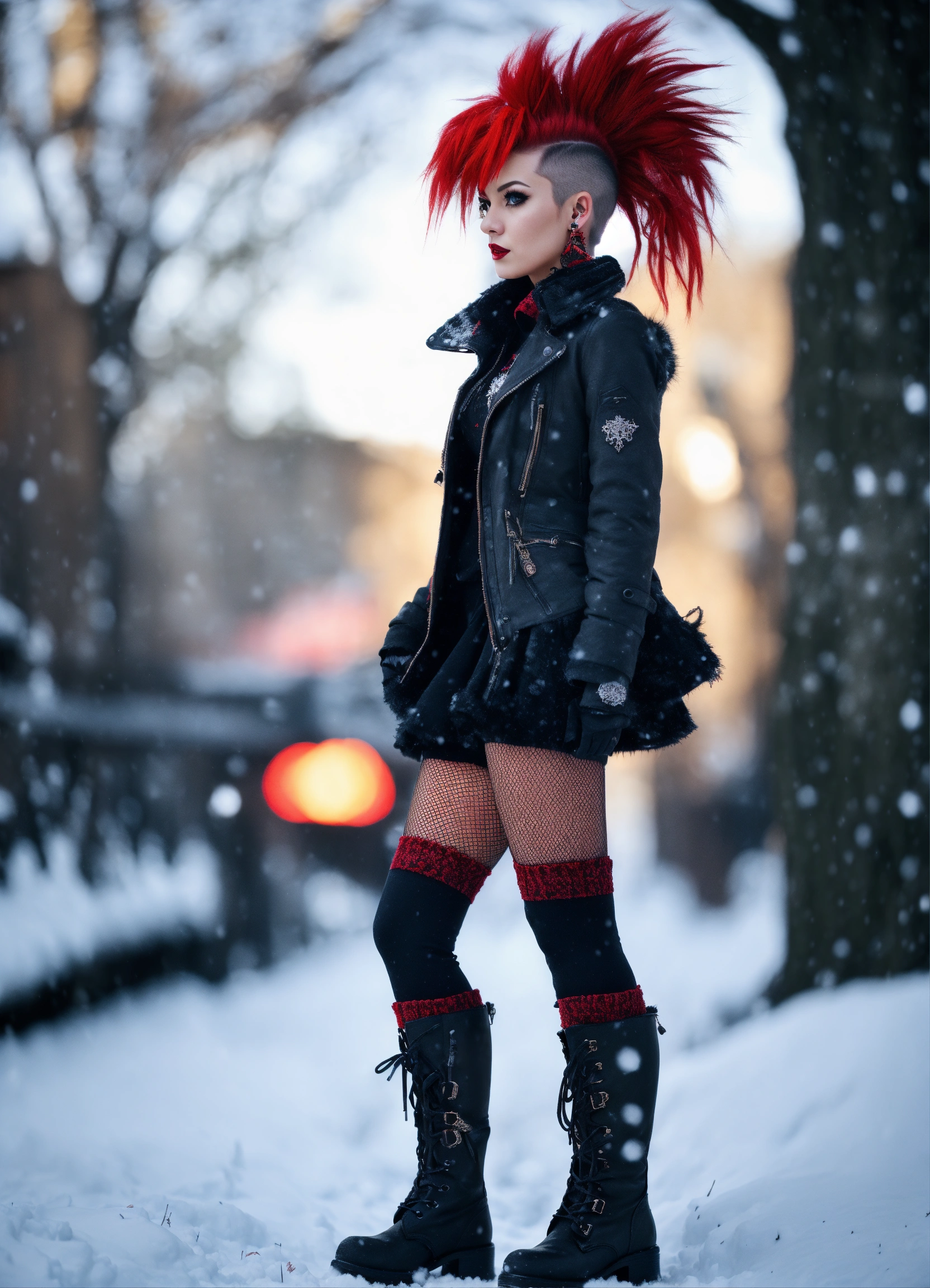 Highly detailed photo realistic, gothpunk girl, mohawk haircut, stockings, combat boots, winter snow, red mohawk hair, 85mm bokeh, red and blck colors