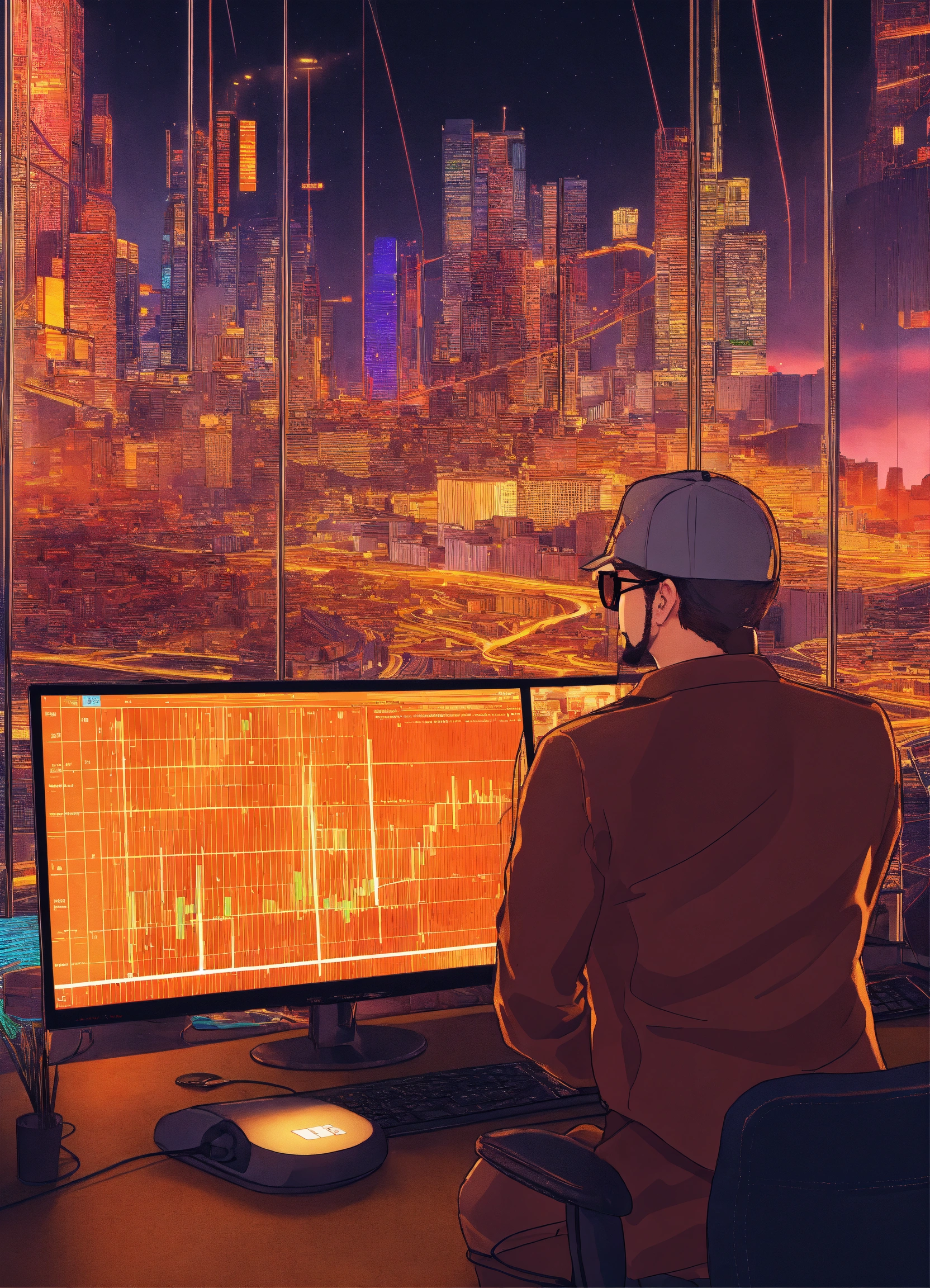 Eres un diseñador gráfico e ilustrador digital profesional, diseña al estilo urbano en uhd 8k 3d. una ilustracion digital representa el trading con criptomonedas, este diseño es para mandarlo imprimir en 3 cuadros decorativos.