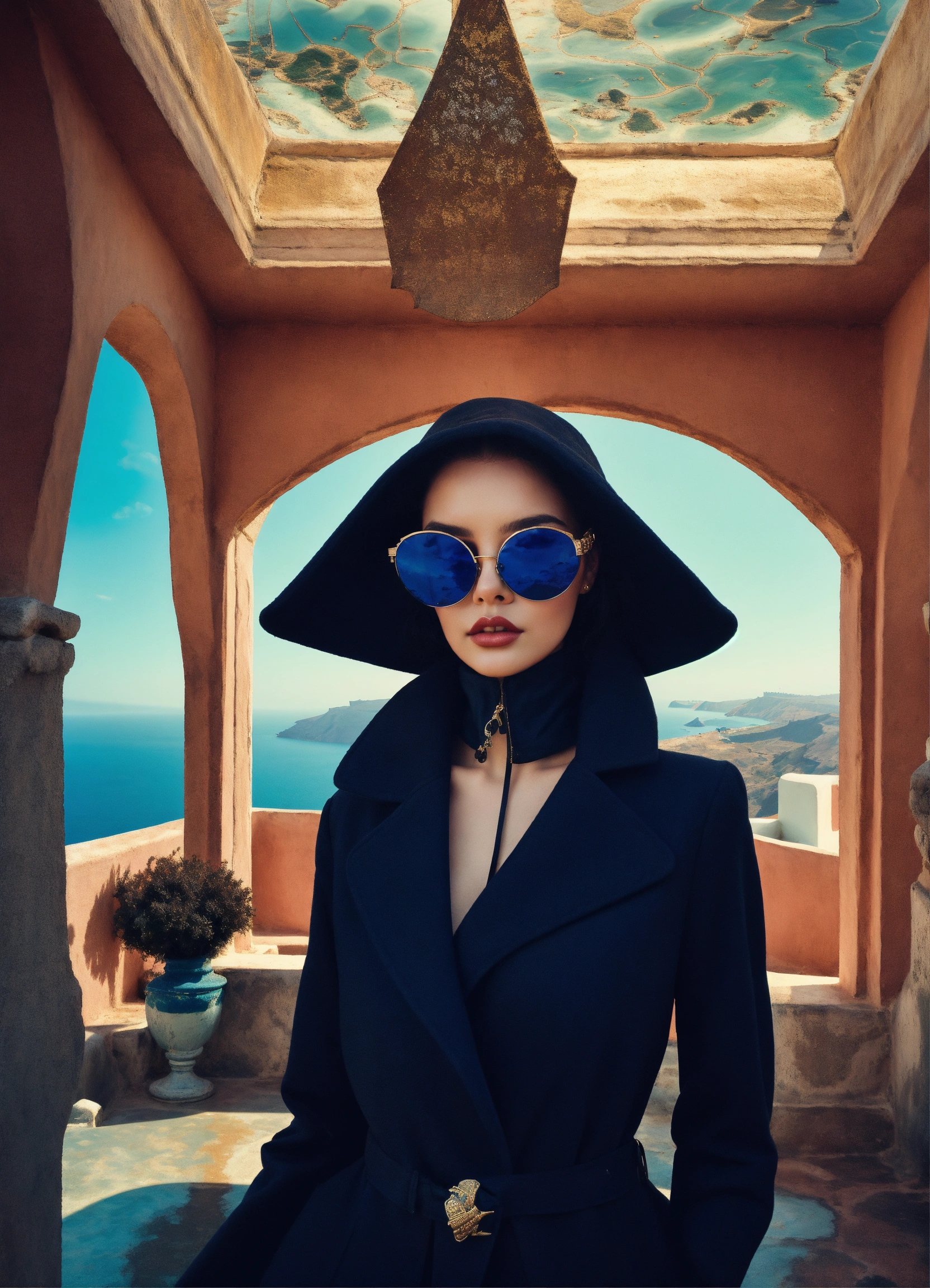 Photography in a futuristic sci fi mansion, of a 60's gorgeous woman in dark coat and large sunglasses, on hollydays in greek island santorini, 80 degree view, art by sergio lopez, natalie shau, james jean and salvador dali