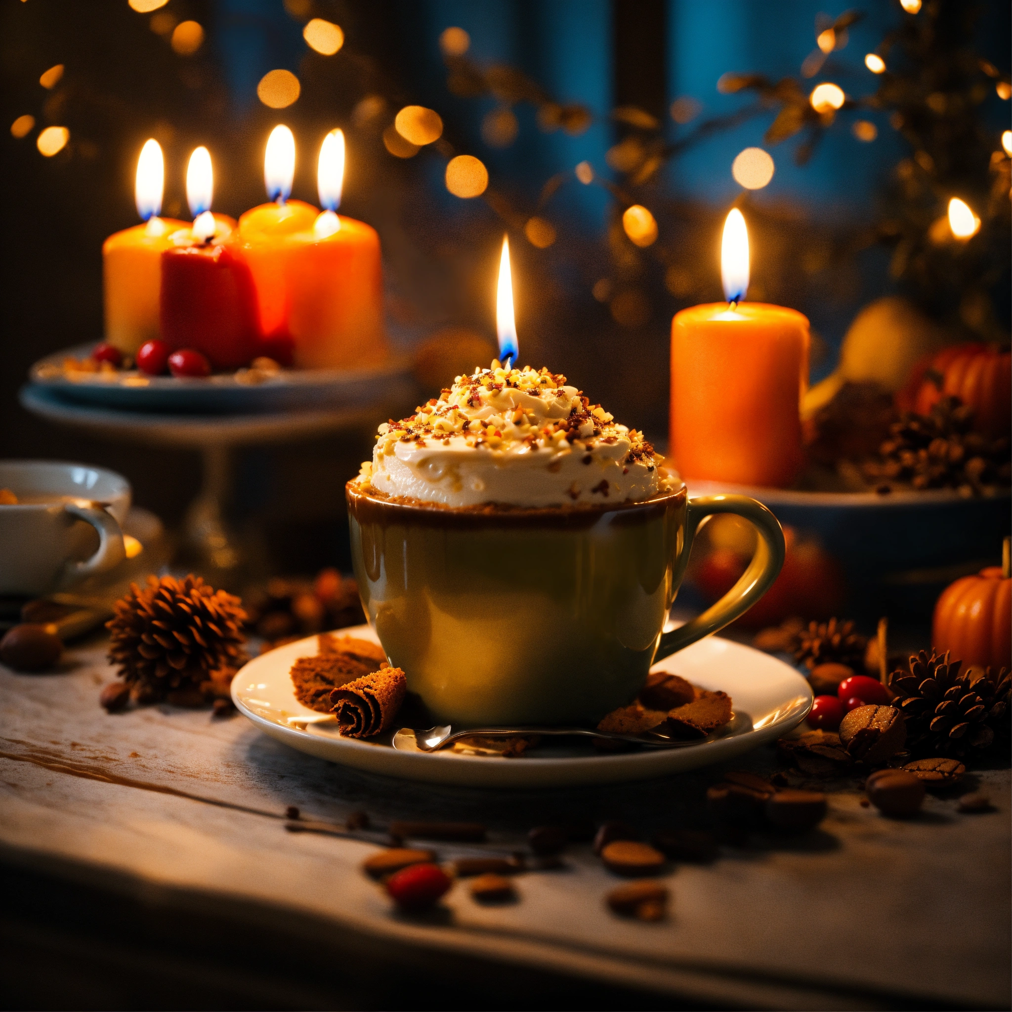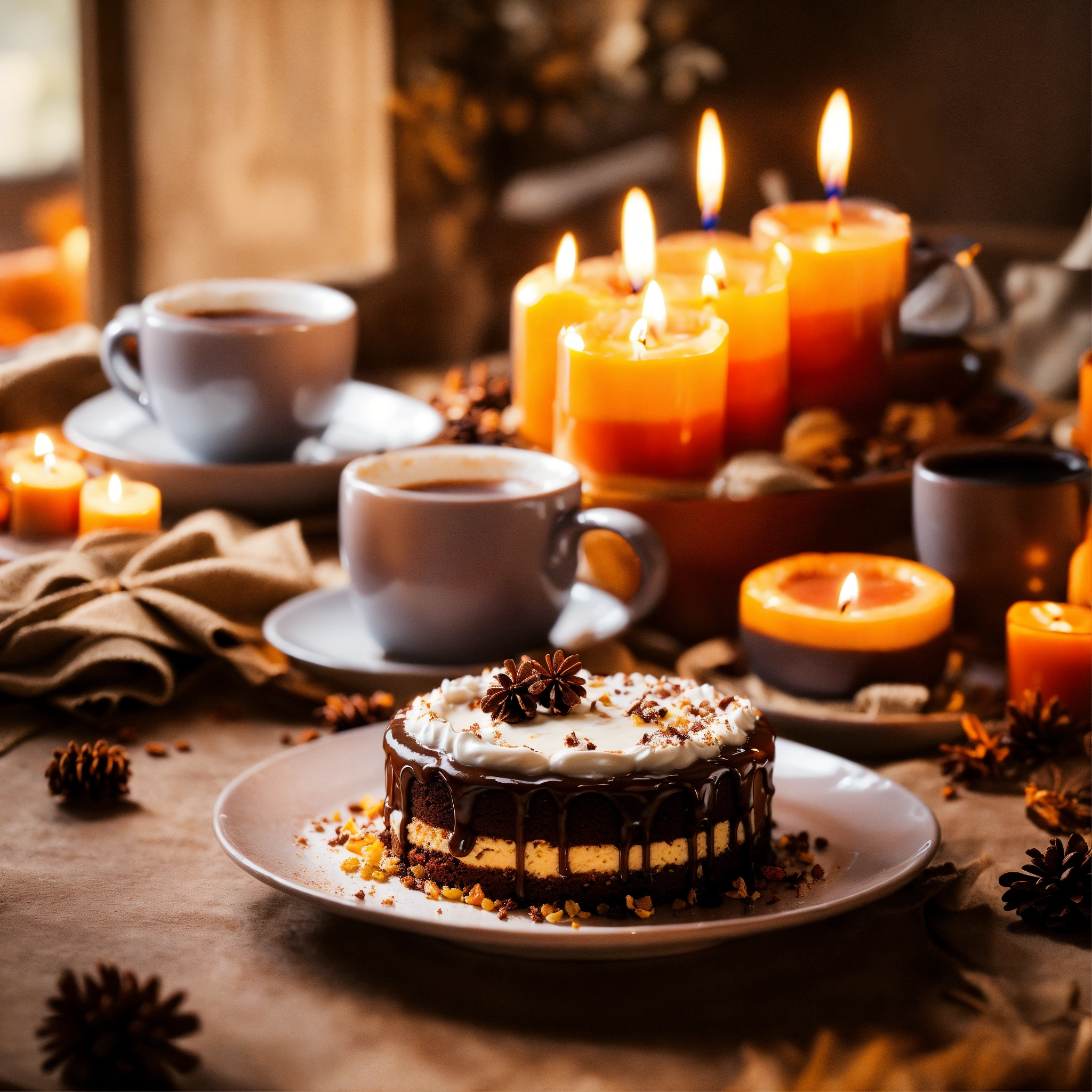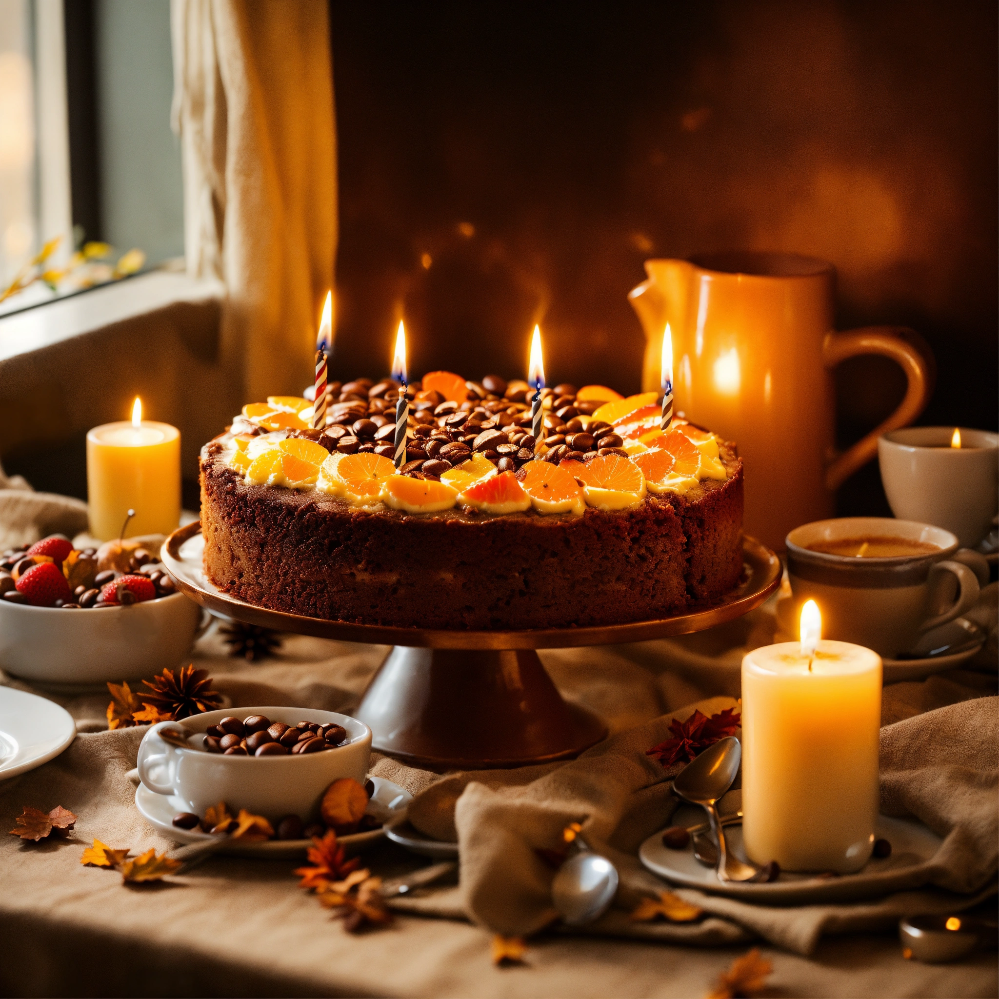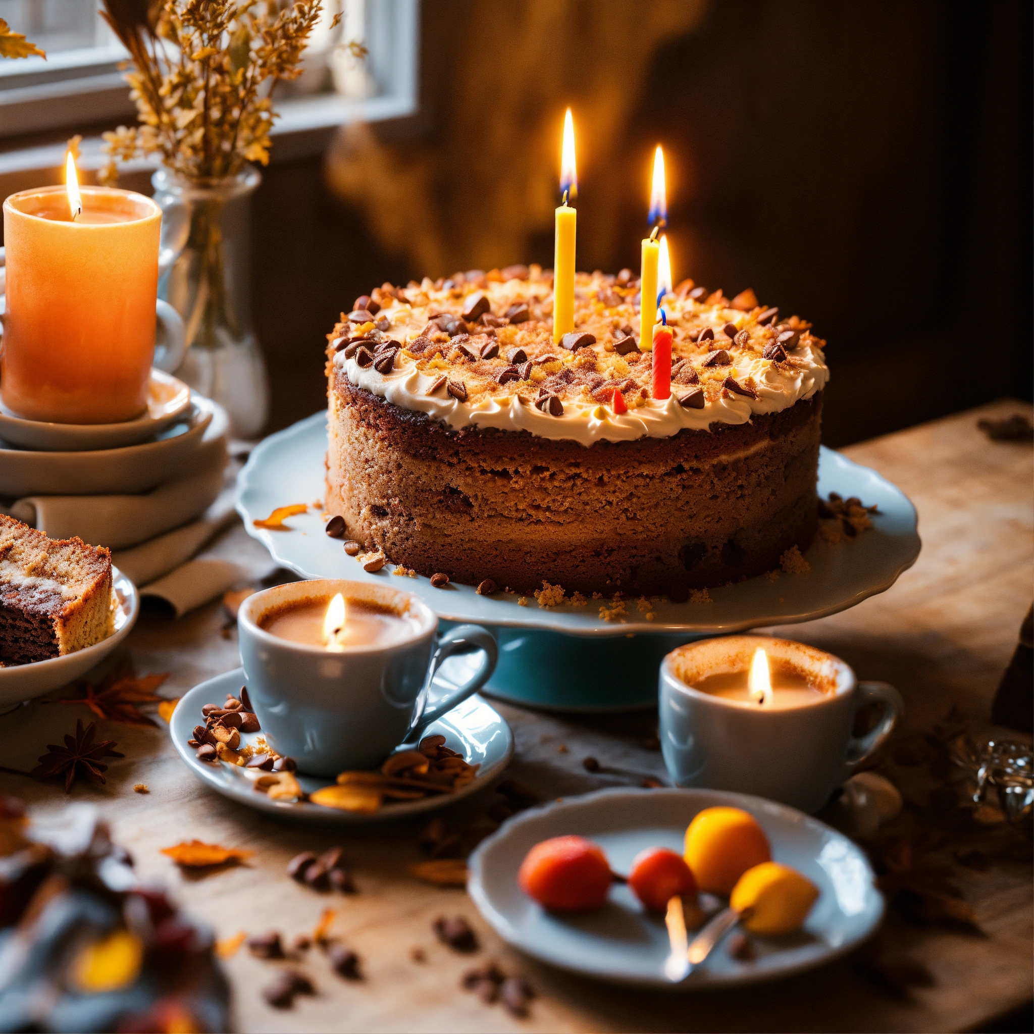 Breakfast table hot coffee birthday cake with candles autumn ambient warm light
