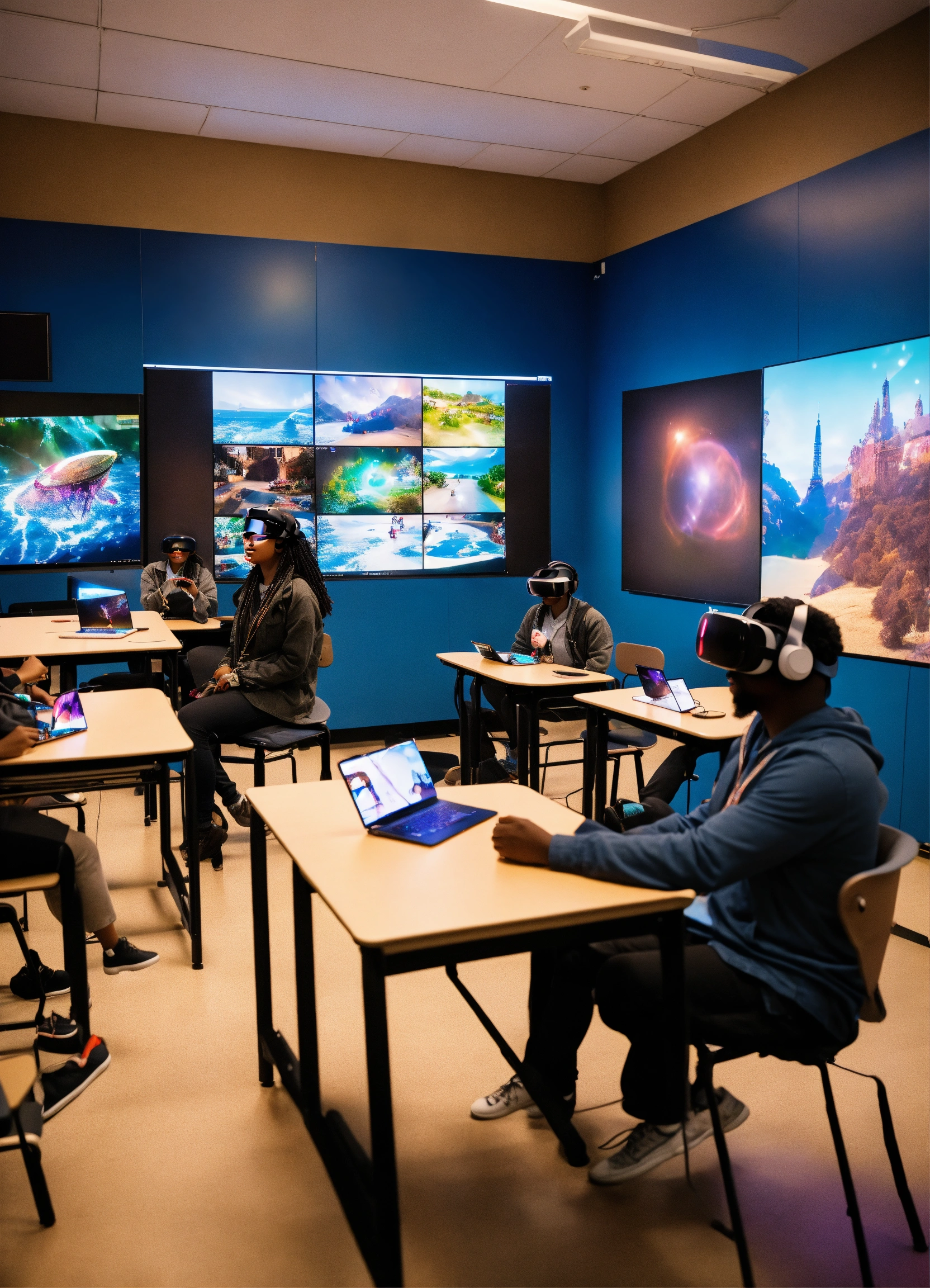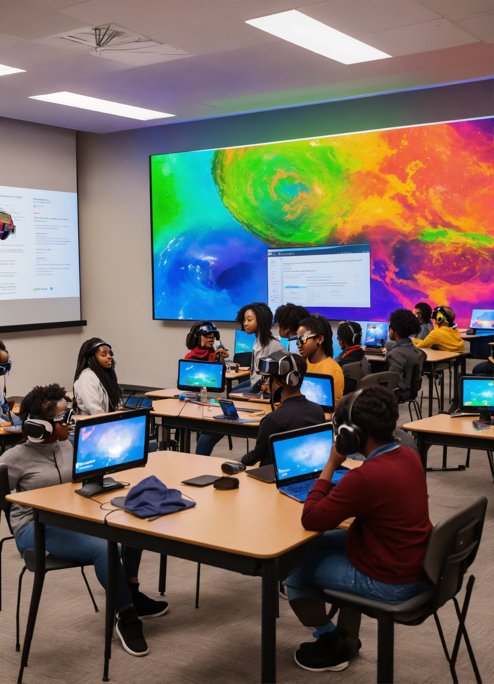 A lively classroom filled with students of color engrossed in their vr experiences. the room is equipped with modern technology, including tables integrated with ai. an instructor of color is at the forefront, directing students with holographic displays.