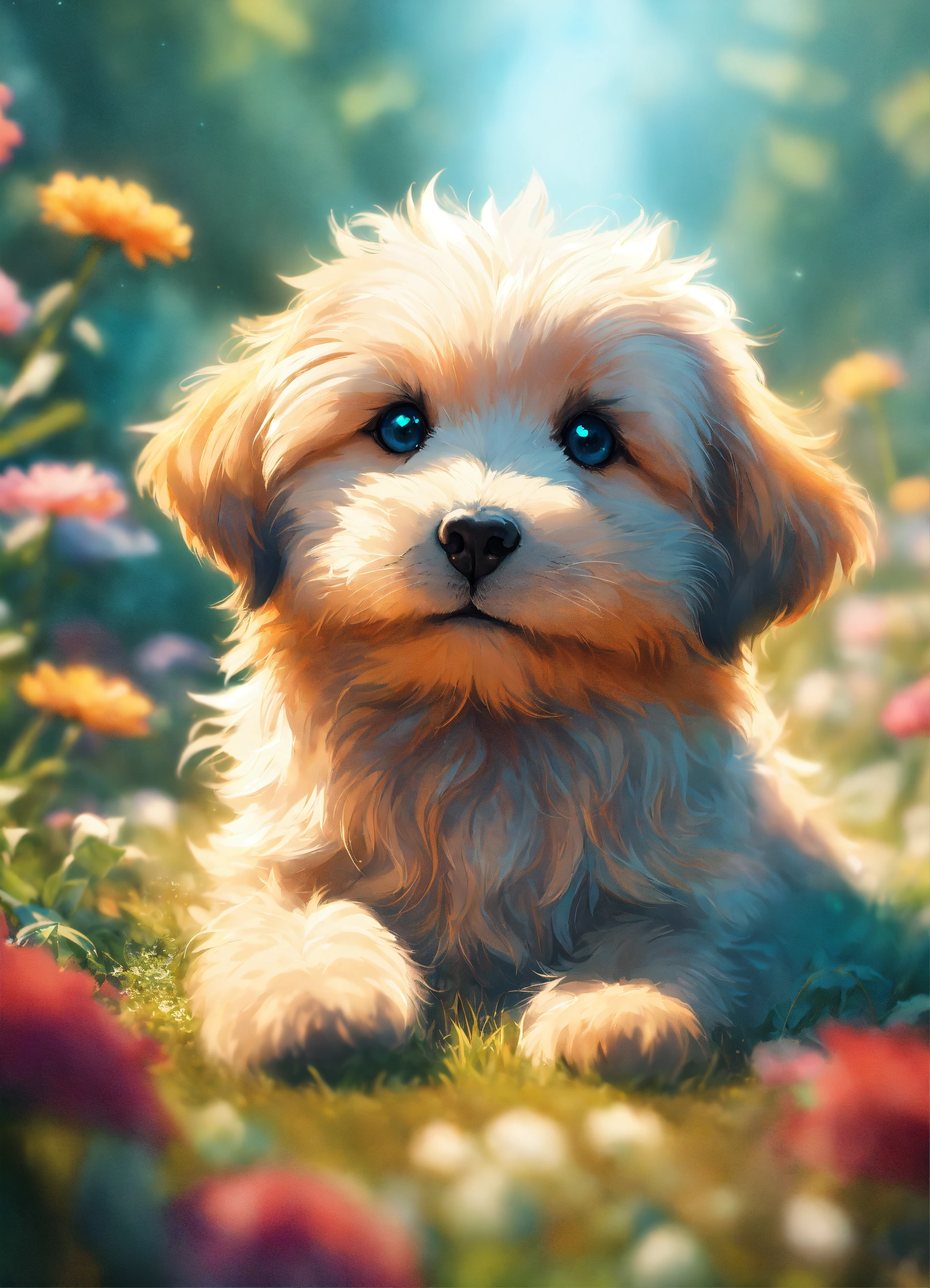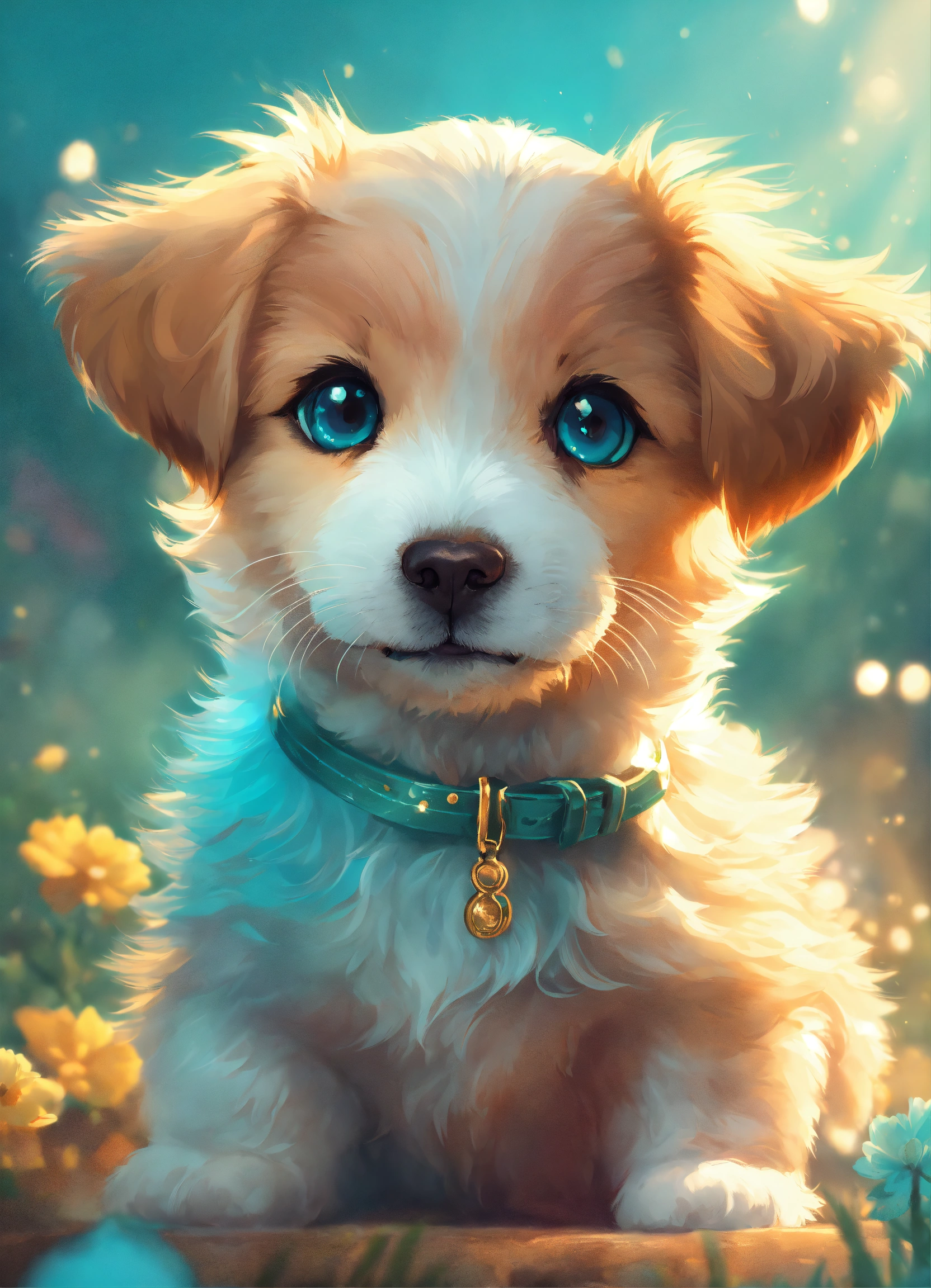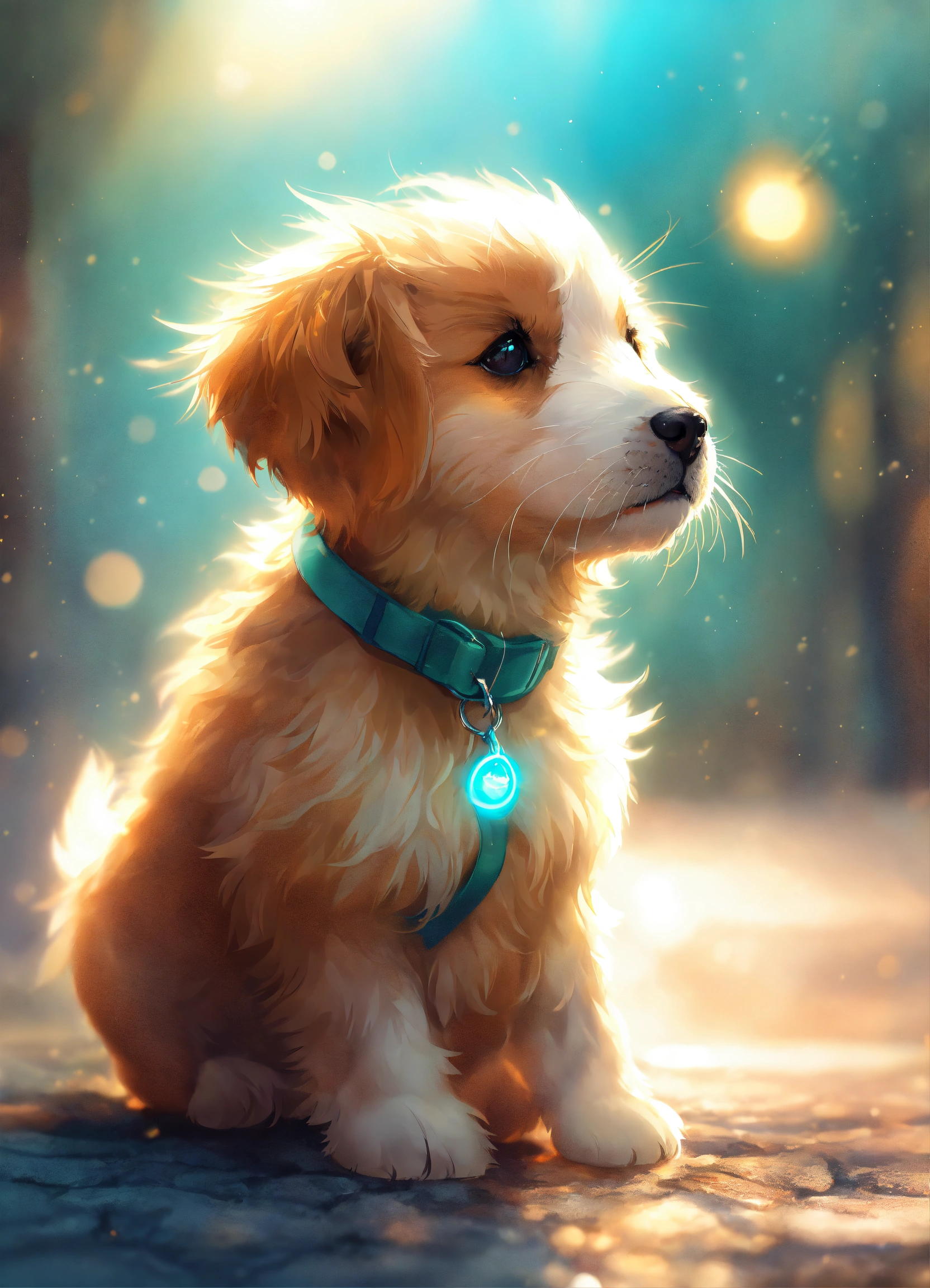 Very cute illustration for a cute puppy, digital art, highly detailed, rim light, exquisite lighting, clear focus, very coherent, details visible, soft lighting, character design, concept, atmospheric, fluffy, vibrant colors, trending on artstation, foggy, sun flare, light teal
