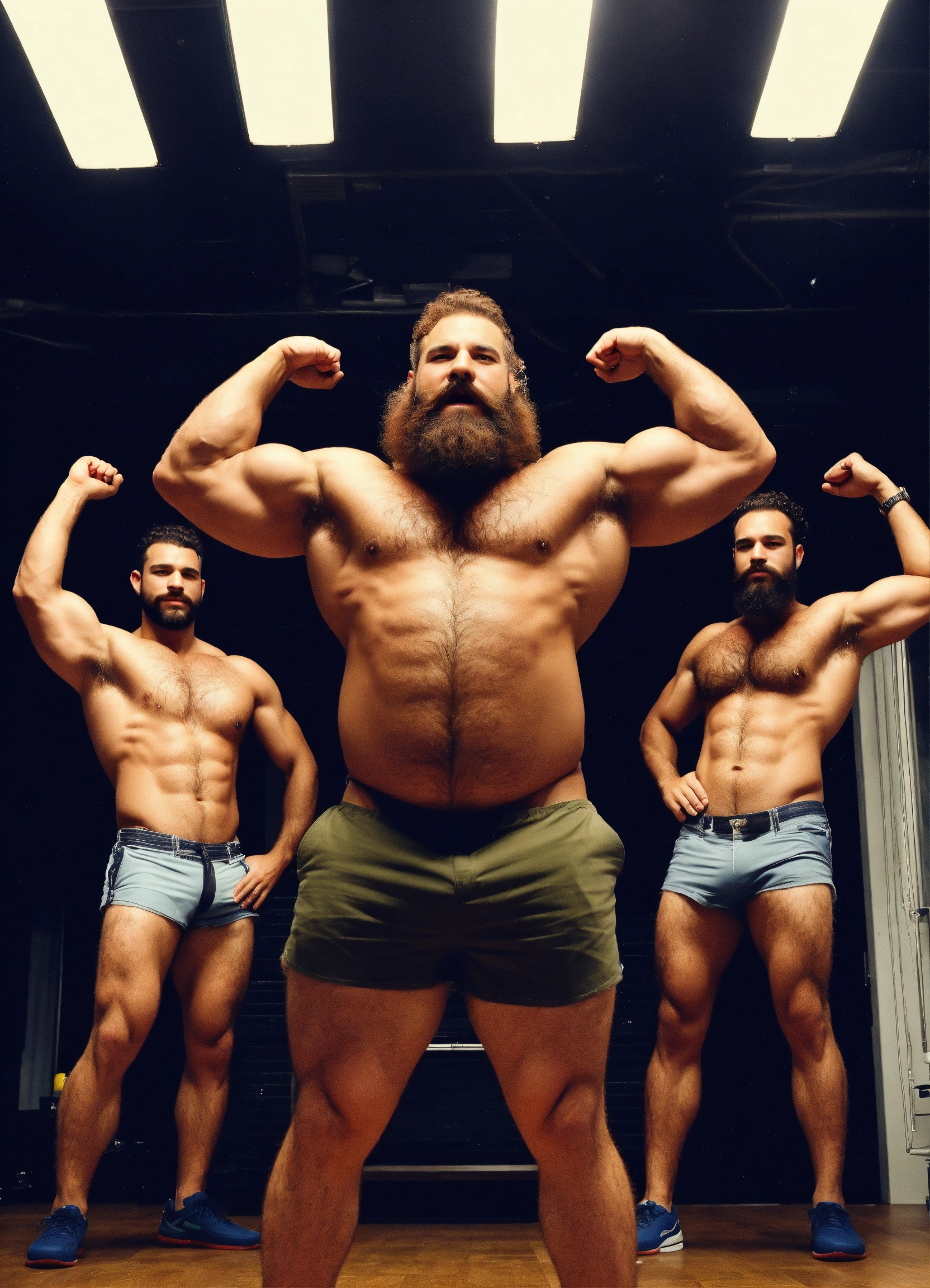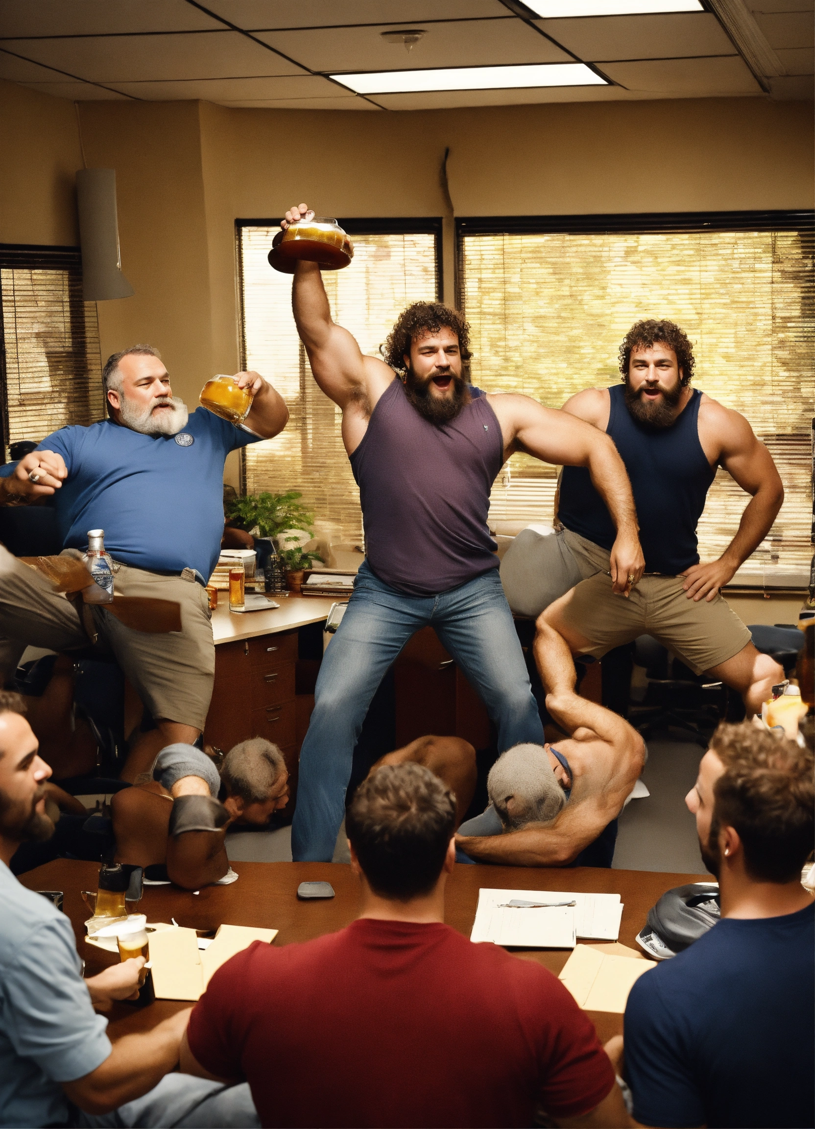 Group of 6 burly, average looking, hairy, manly, average bodies, arms raised, beer bellies, ethnic men ogling each other's bodies in an occupied office, dad energy, epic, hairy backs, most arms up, hairy armpits, curly hair, shorts, beard, hairy arms, size difference, photography, high resolution, very detailed, smooth, clear, clean 4k in the style of bruce weber