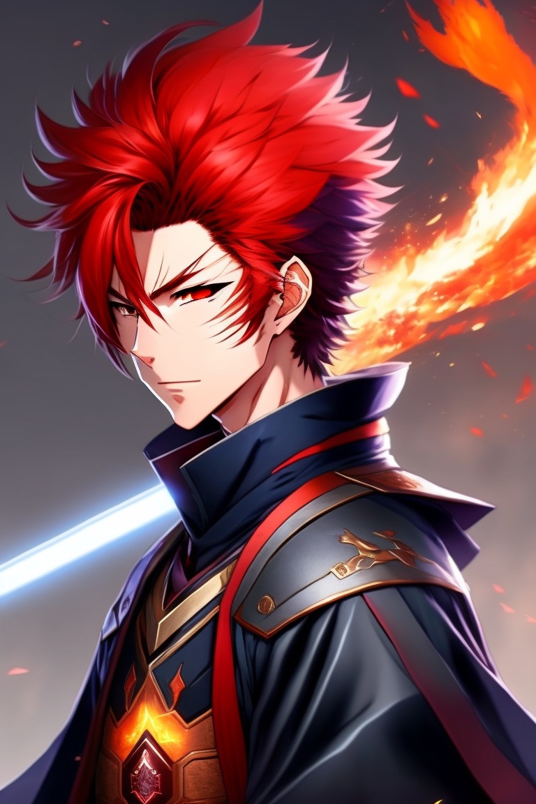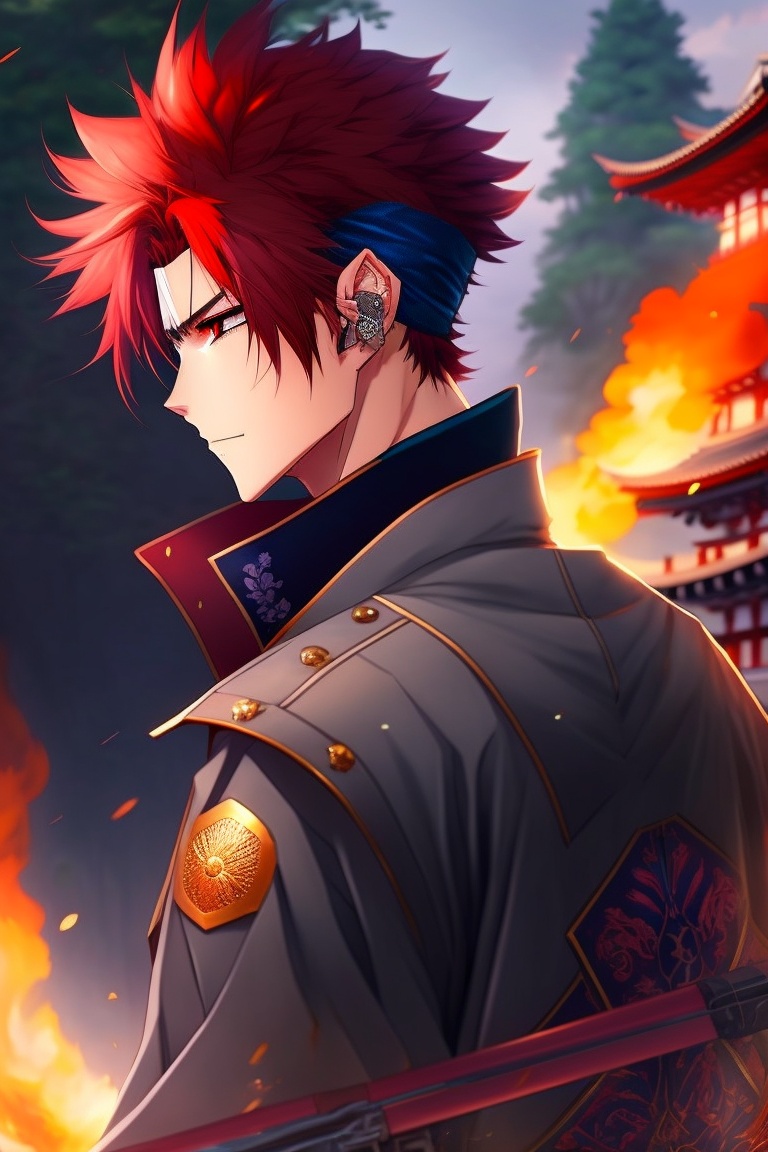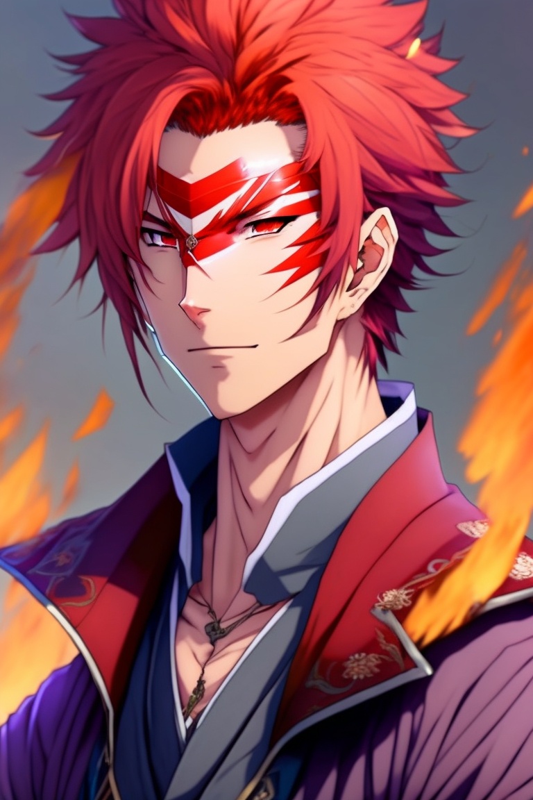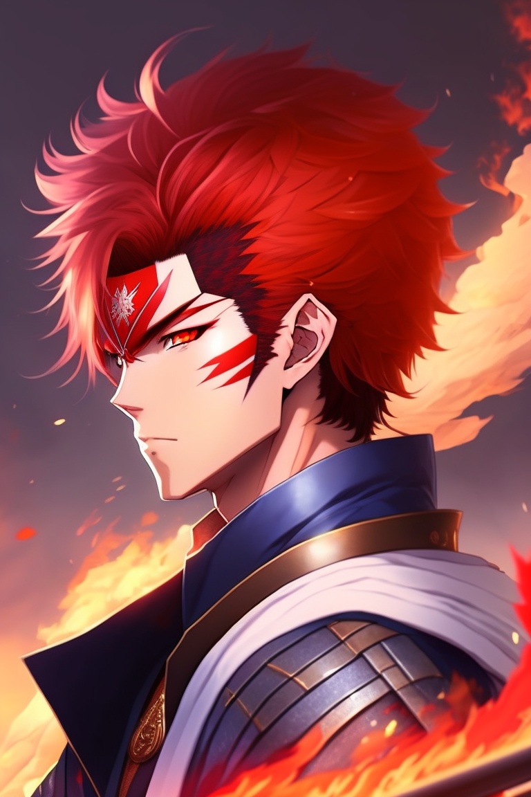 Anime boy, anime, samurai warrior, wearing kimono, sun fire power, burn scars, on his face, red hair, red eyes, similas to tanjiro in the anime kimitsu no yaiba