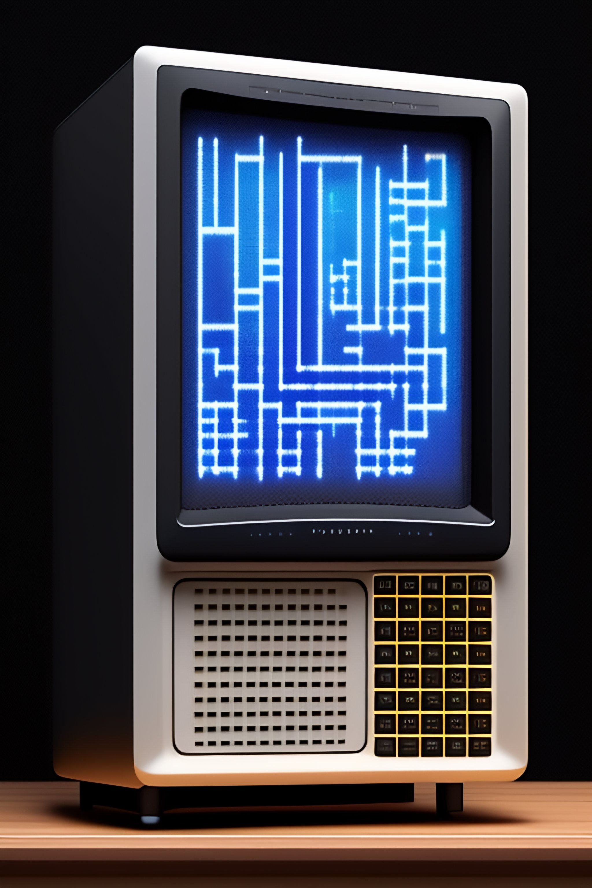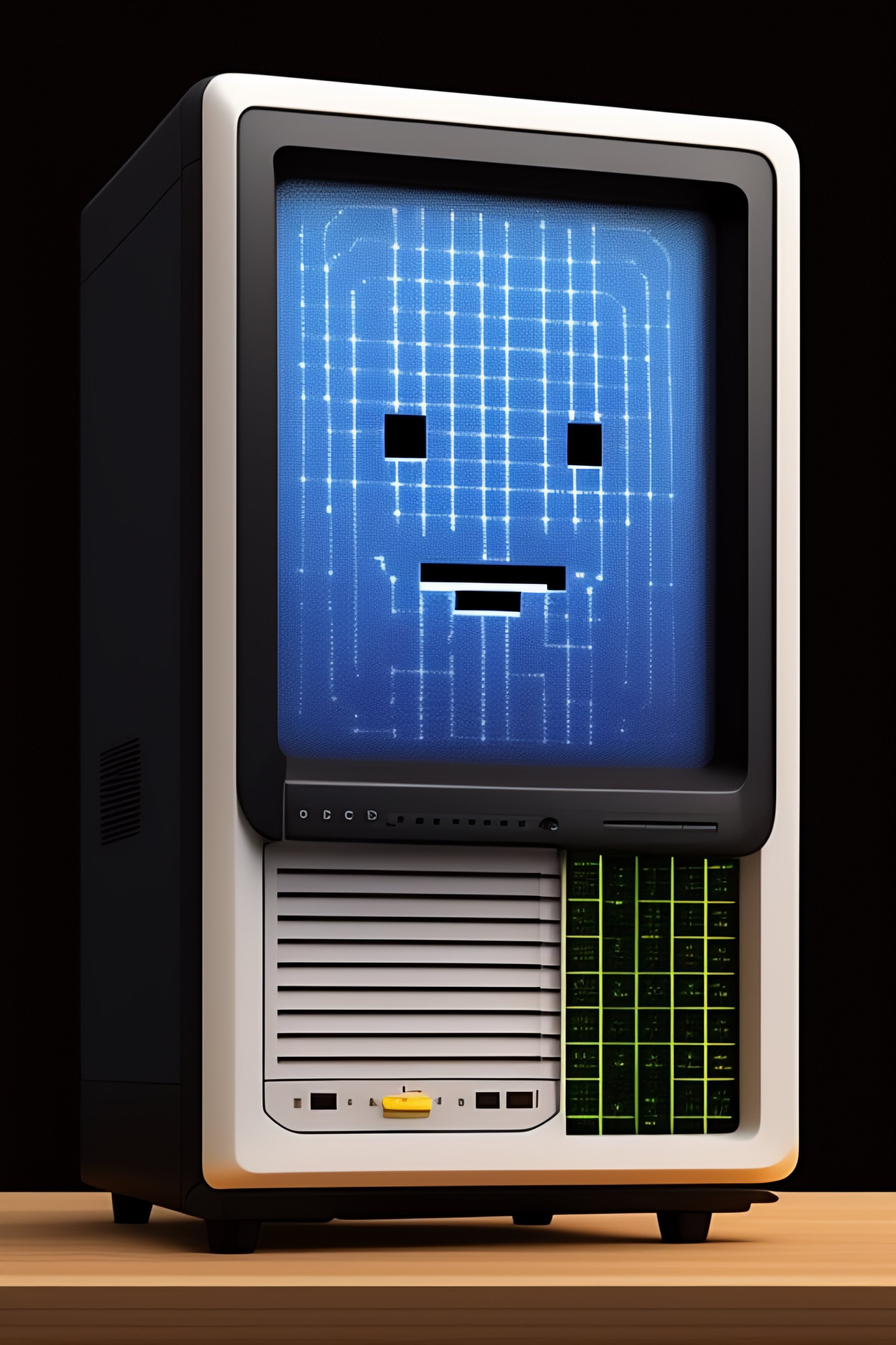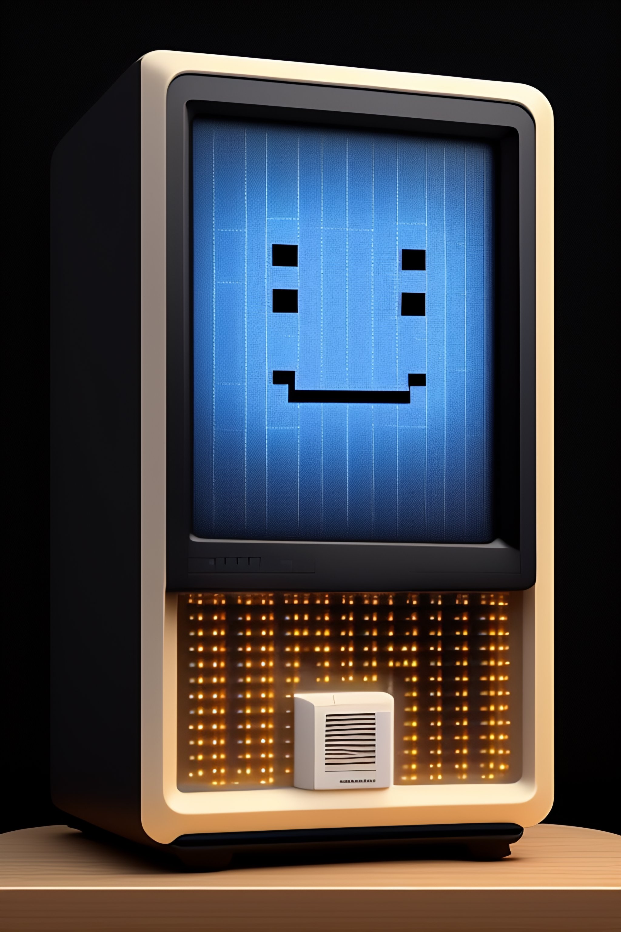 Old computer screen with pixelated smiling face ascii art