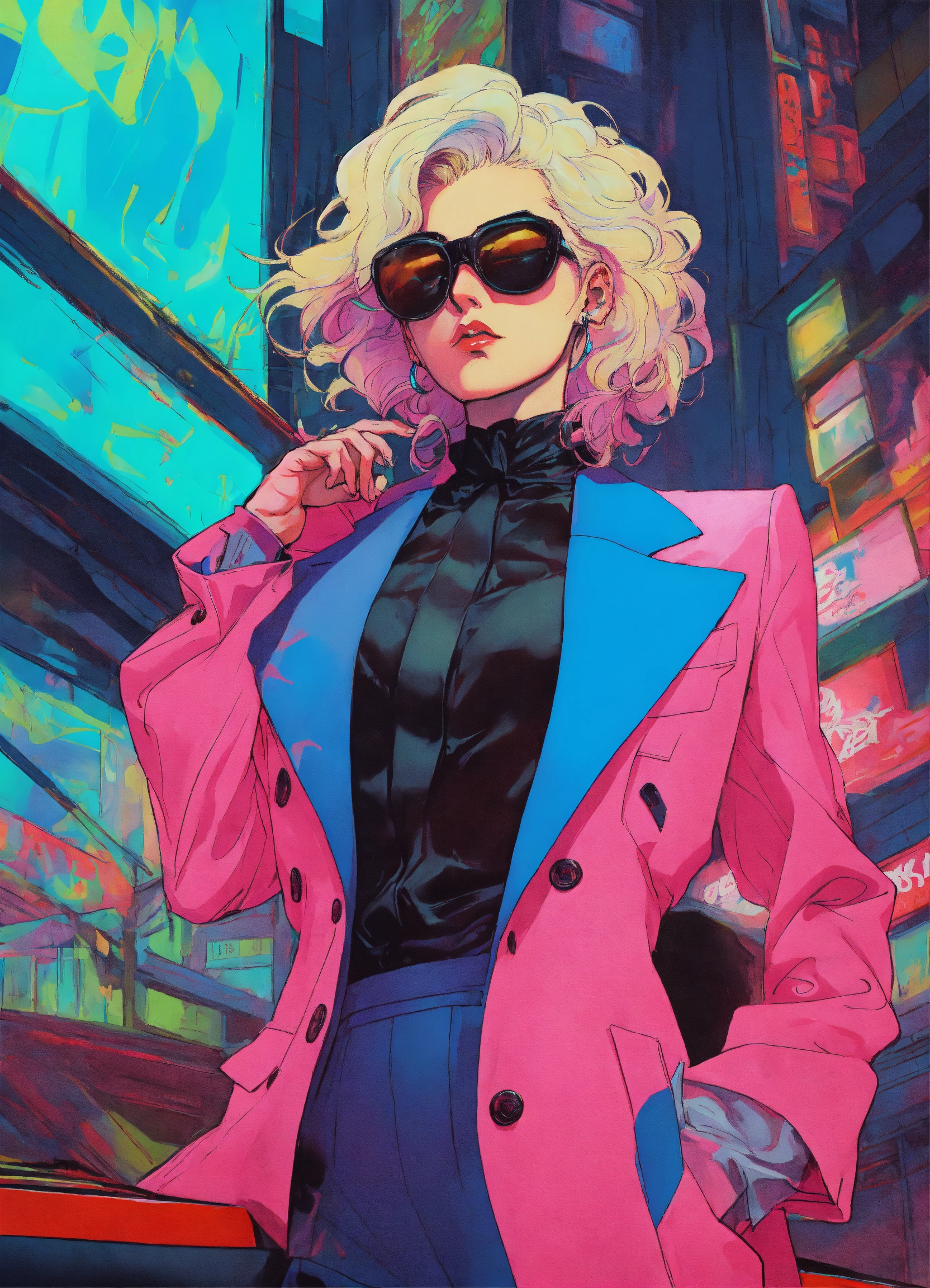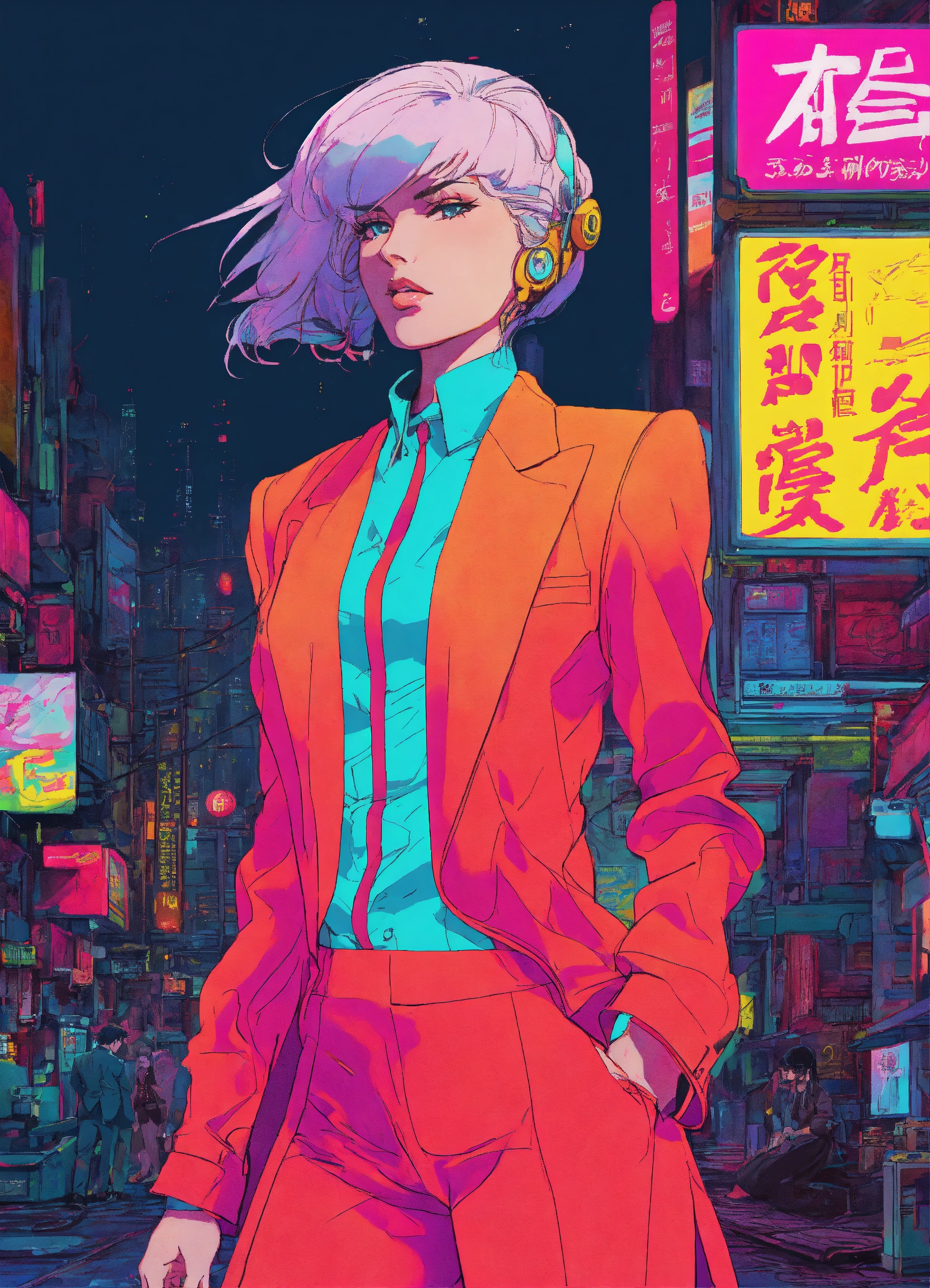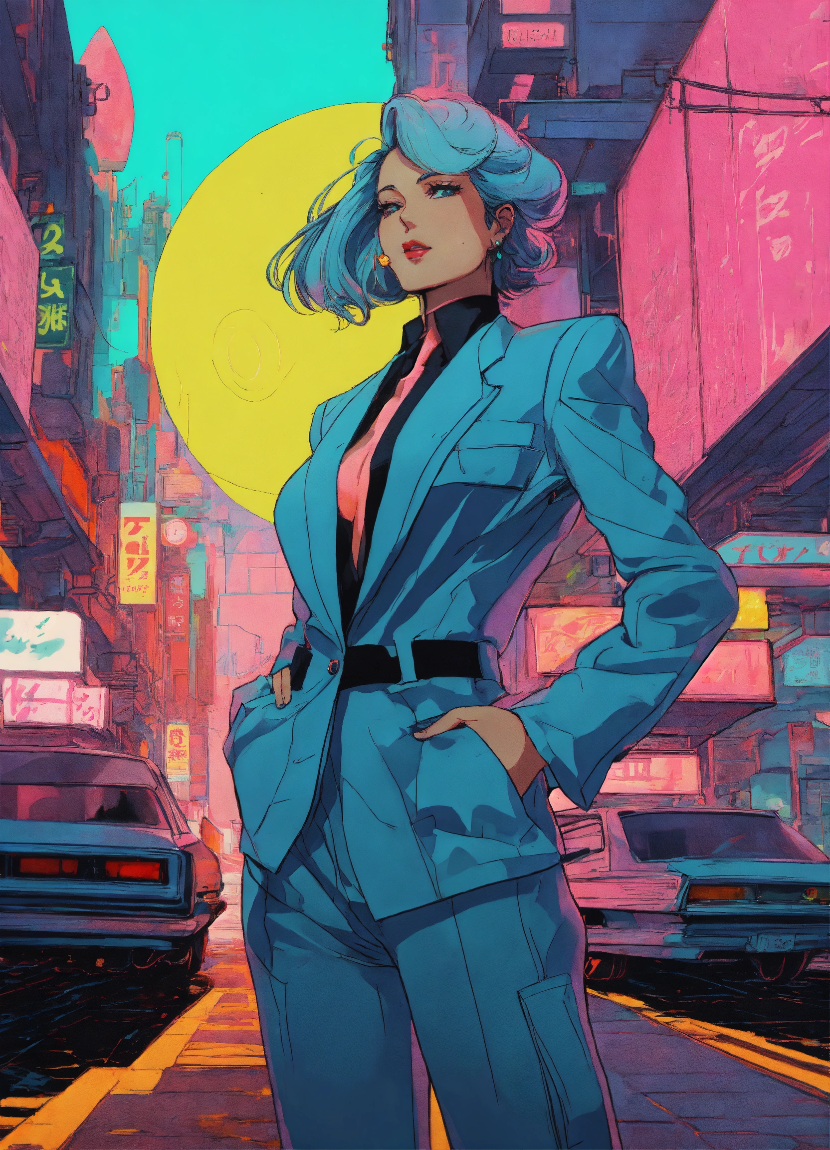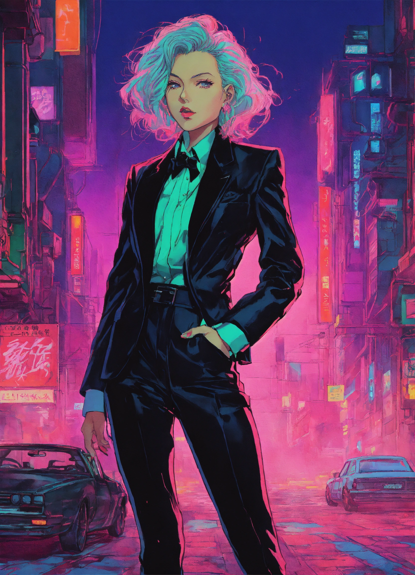 In the style of 90's vintage anime, surrealism, akira style. fine details. a think middle aged cyberpunk woman wearing a tuxedo outfit. neon
