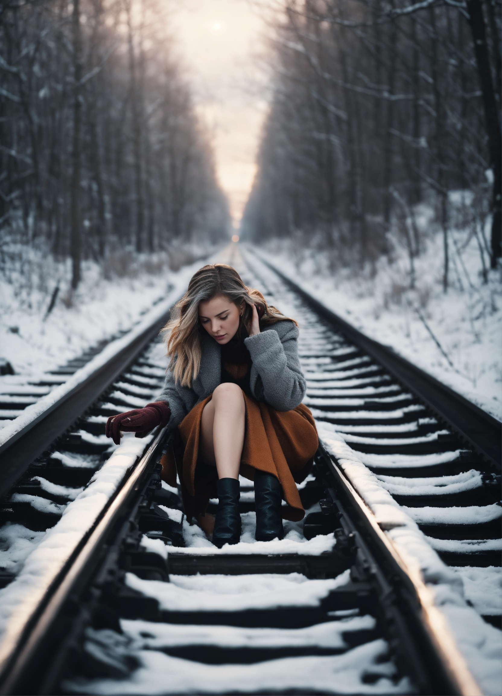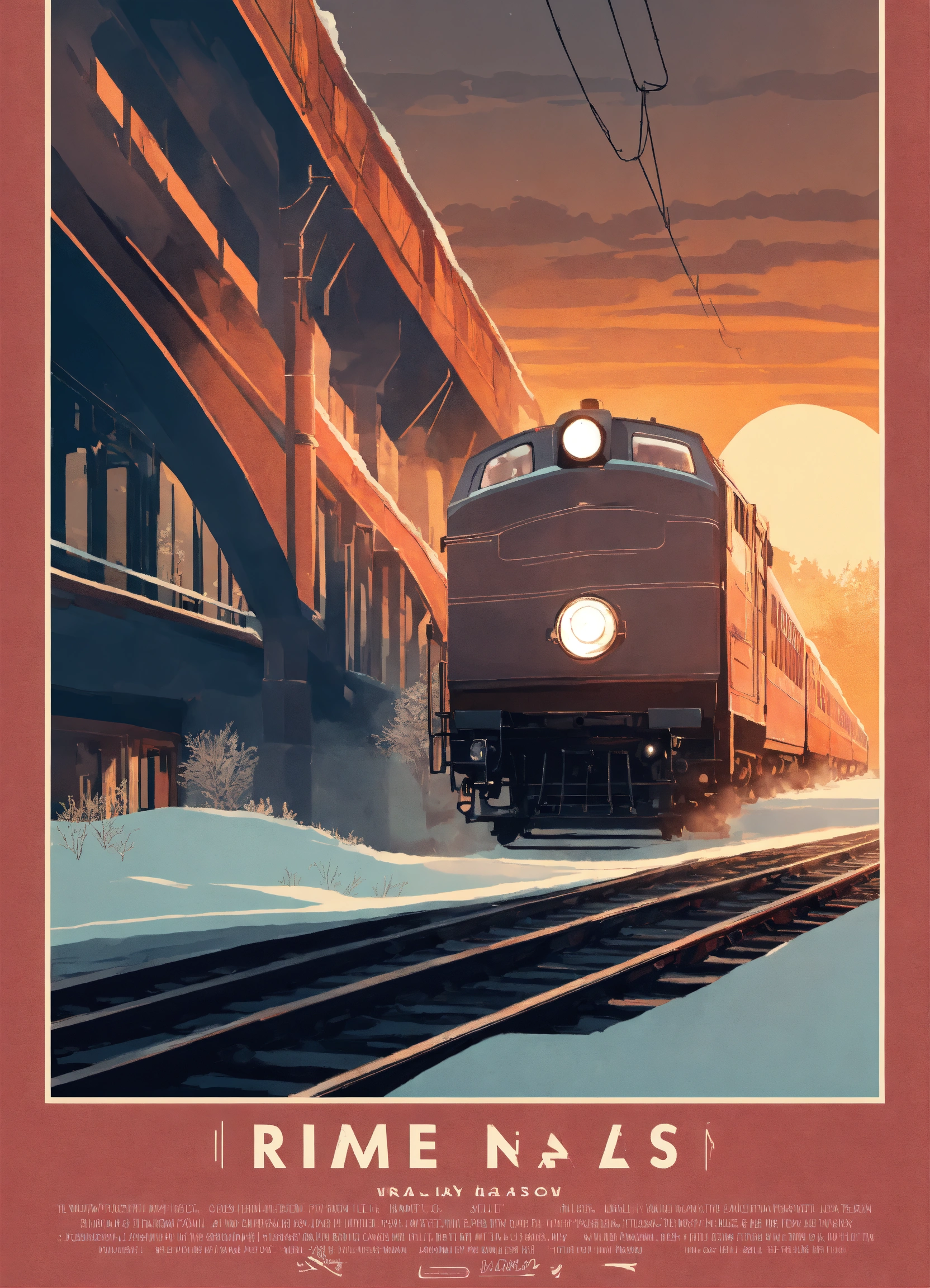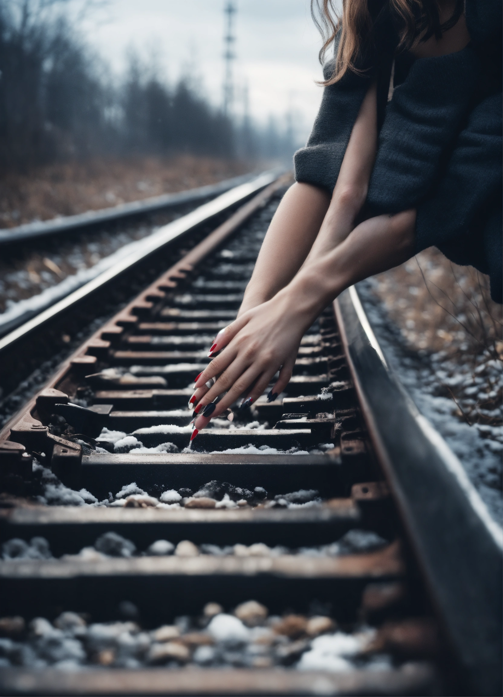 A very beautiful poster of a crime thriller is railway rails, on which a beautiful female hand with a beautiful manicure lies cut off by a train. gray scandinavian tones. the background is winter.