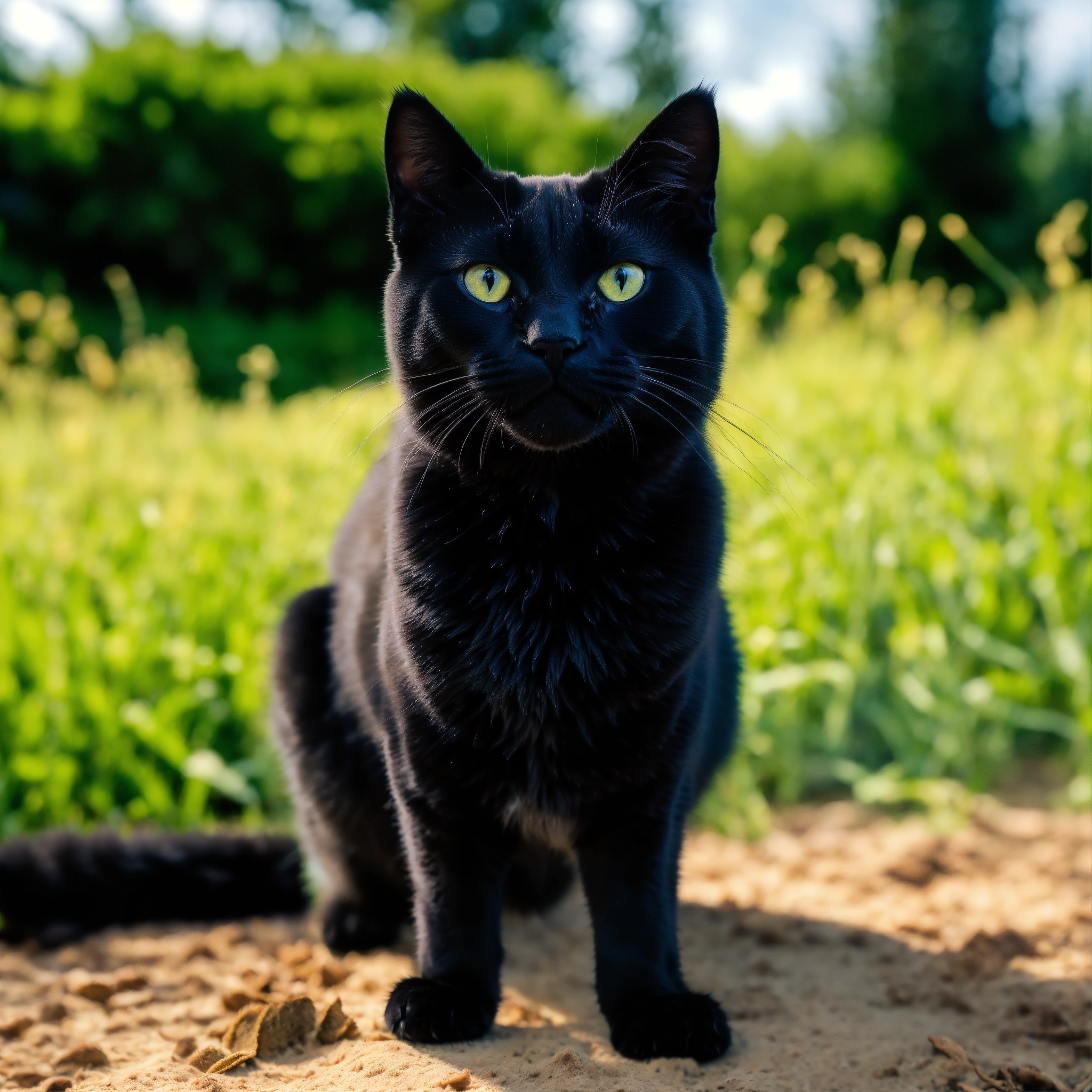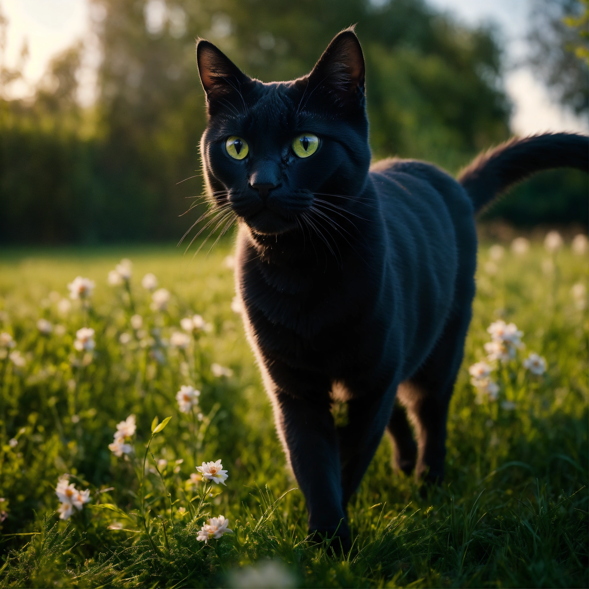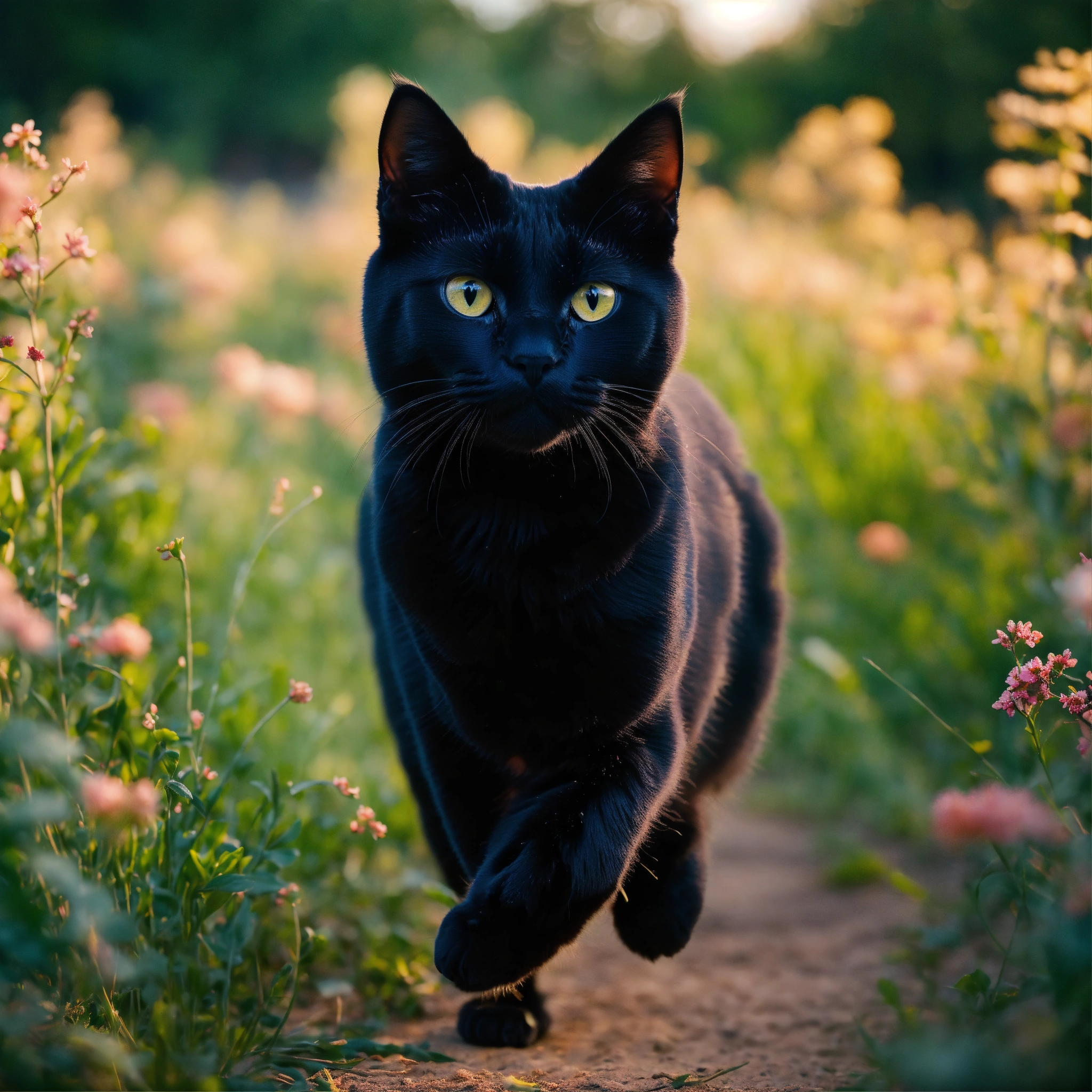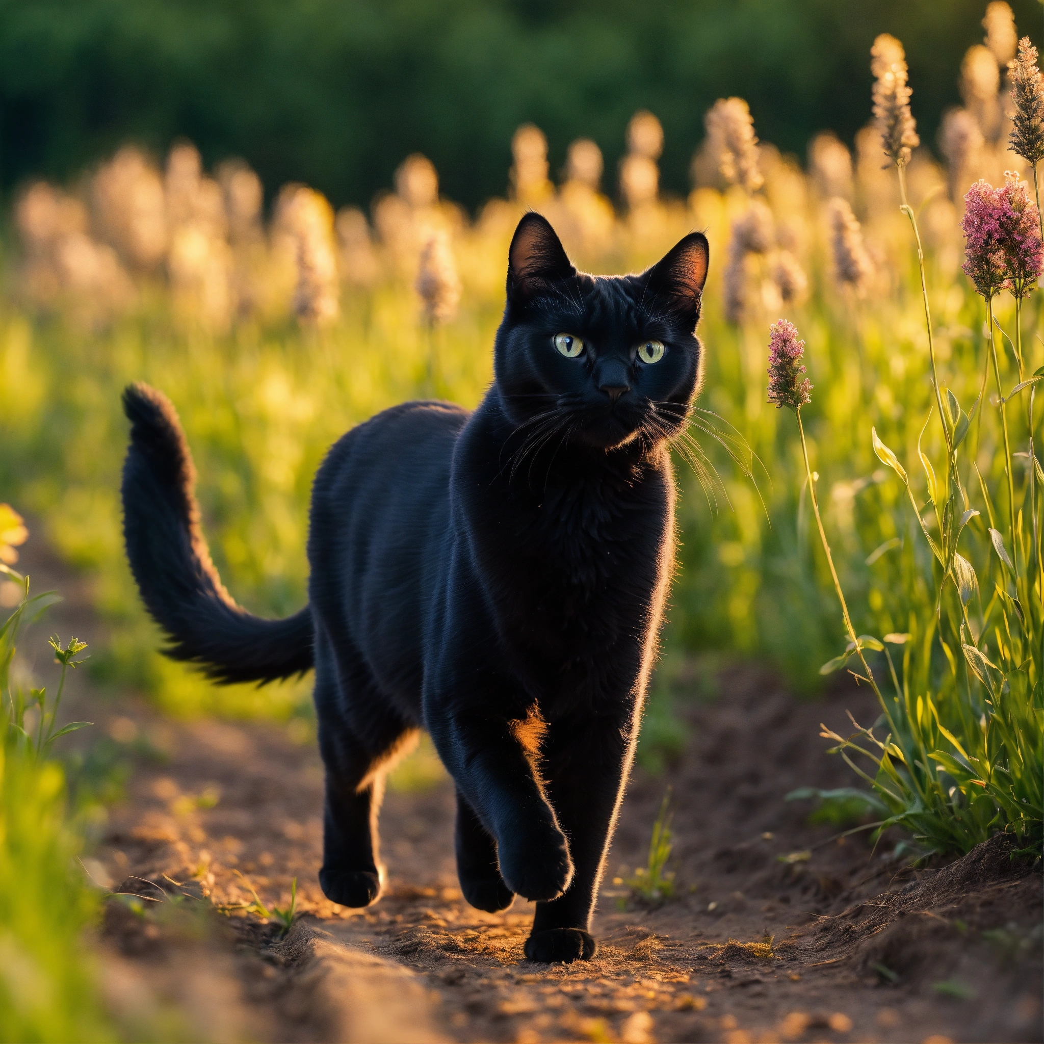 Realistic mid - shot of black cute cat. cat full body close up runs through a field . a 4k photo realistic wide lens shot, cinematic netflix show, very detailed, a lot of light and warm ambience, shot on kodachrome, film grain, halation and bloom in highlights