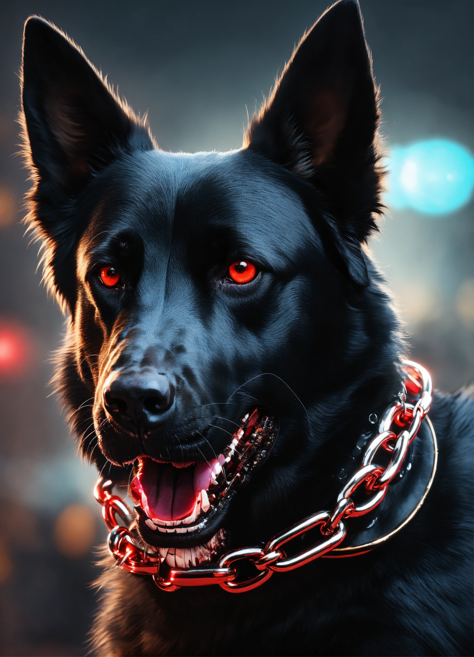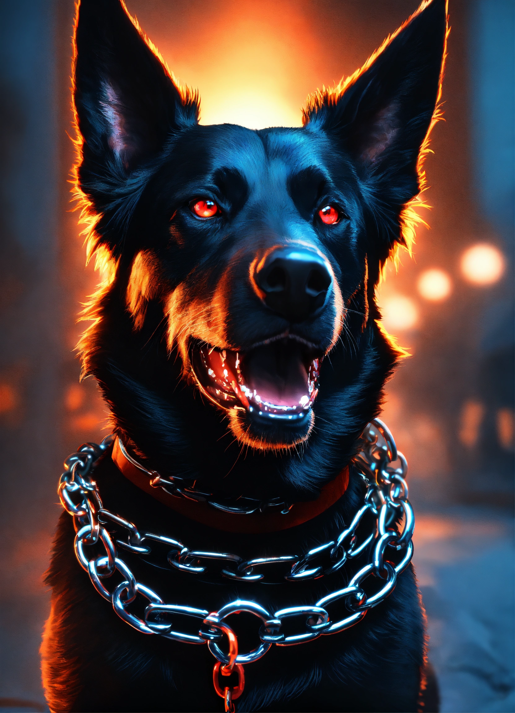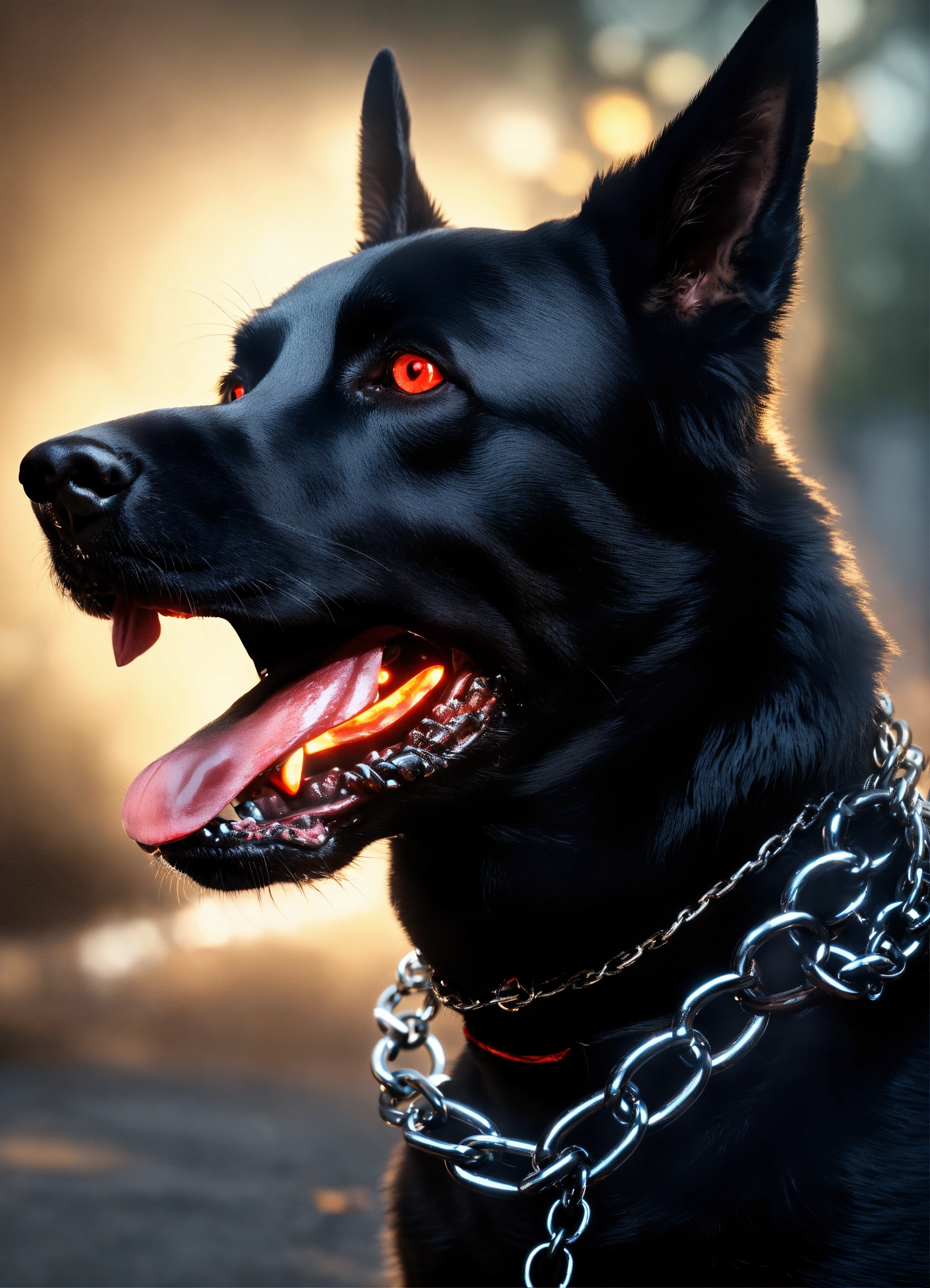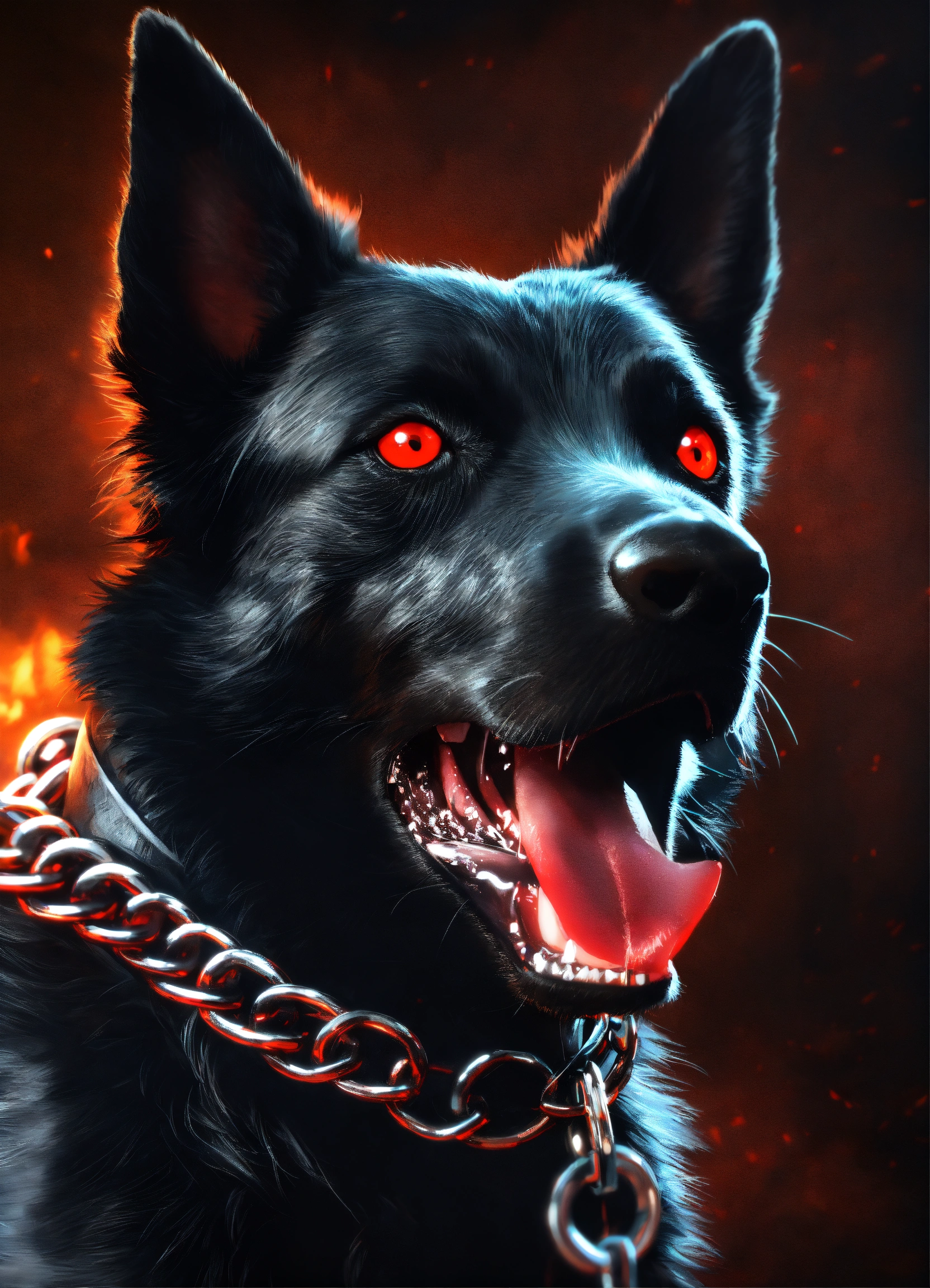 Aggressive black dog foaming at the mouth, wearing a dog chain collar, glowing red eyes, hyperrealistic, 4k render