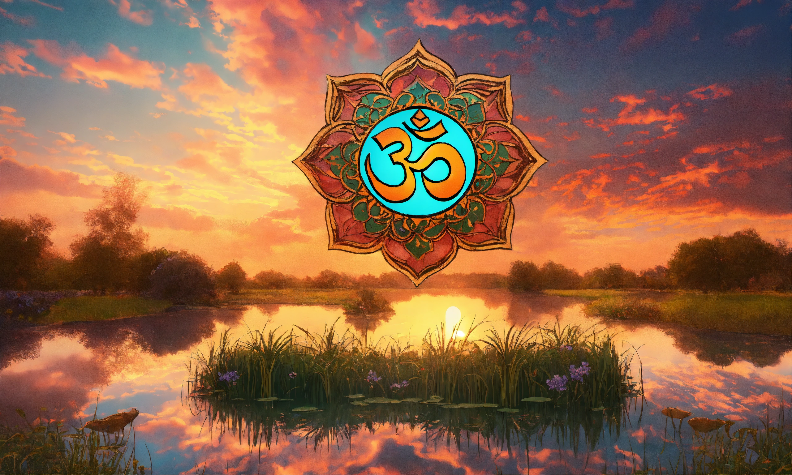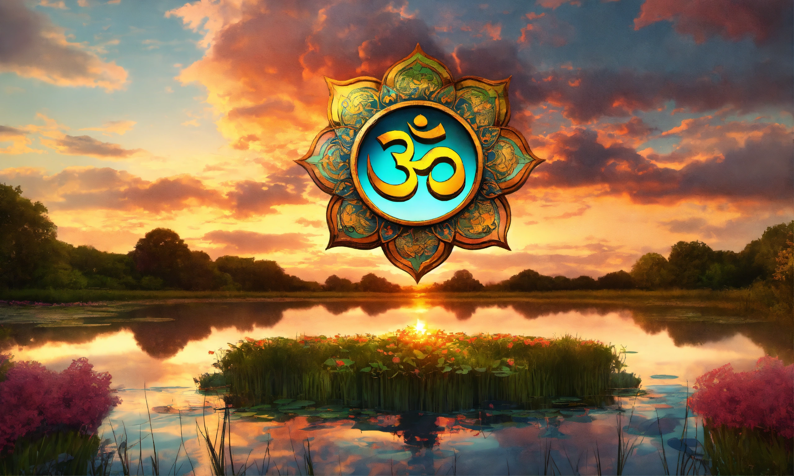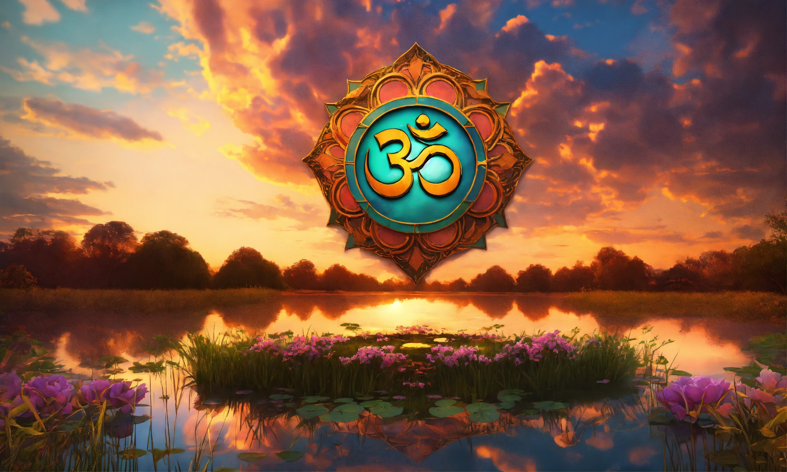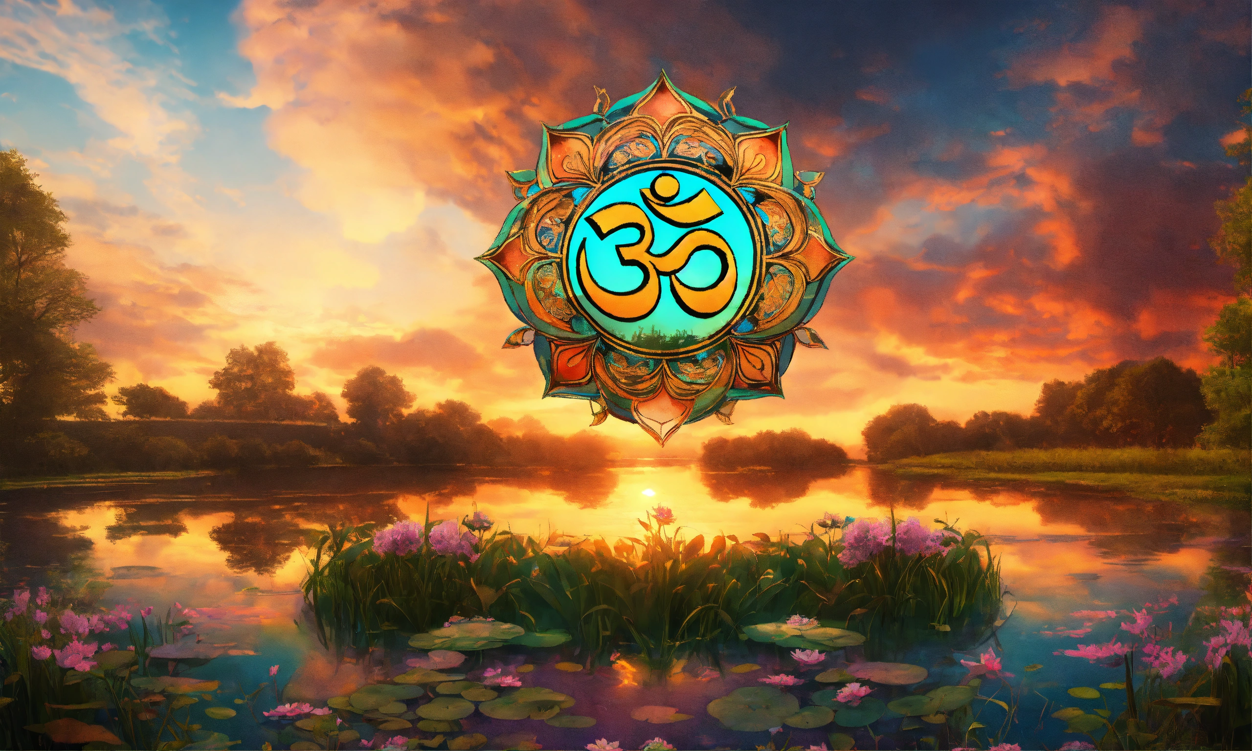 Om symbol by a pond, symmetrical, lots of clouds, 4k, art nouveau style, sunset colours, very detailed
