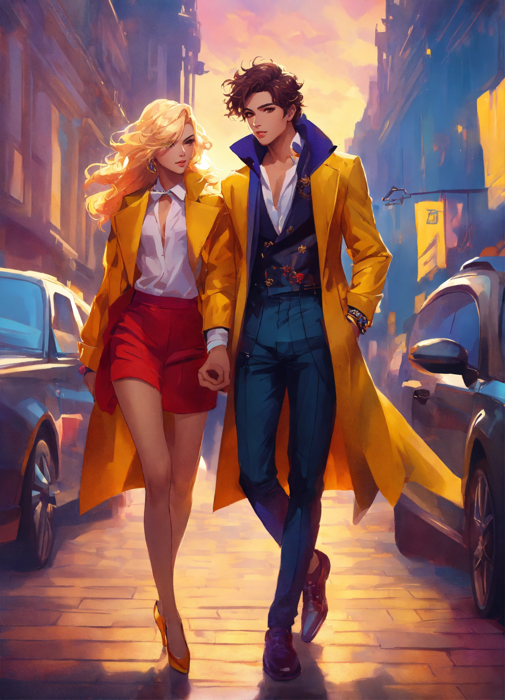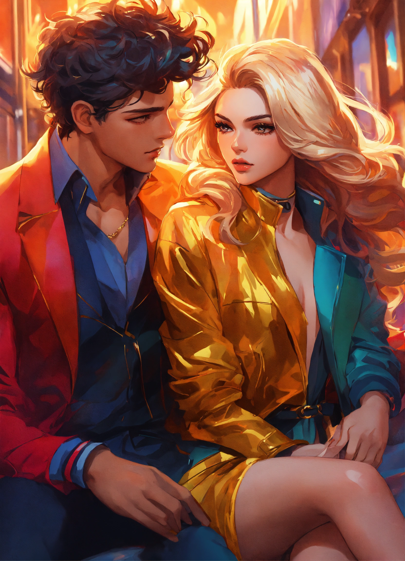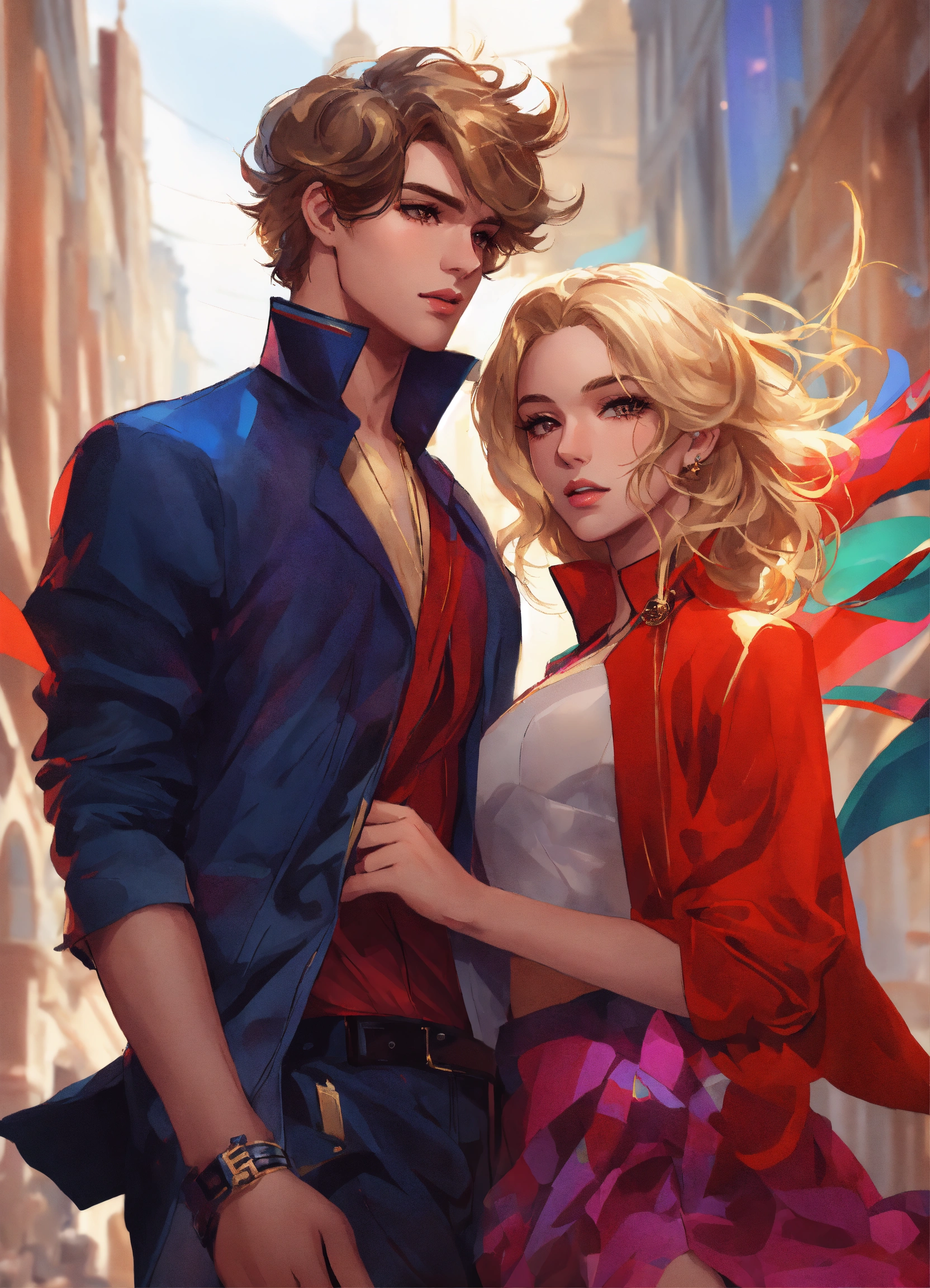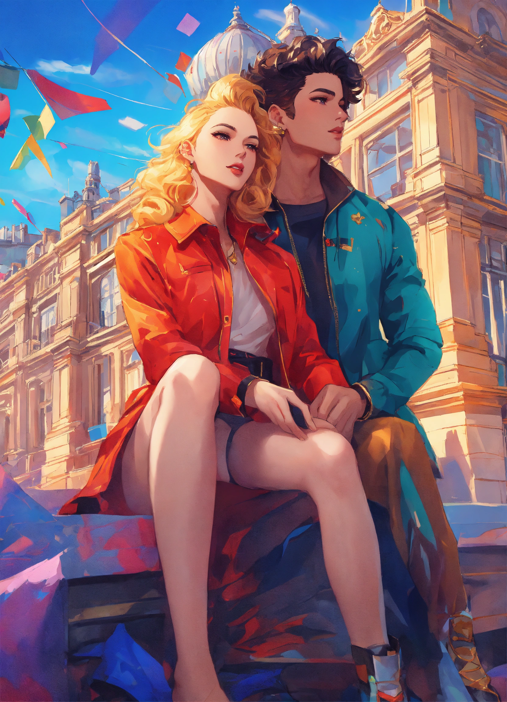 Illustration of london, colorful, vibrant colors, fair skin, the young man wears fashionable clothes, has wavy black tousled hair, the golden haired woman wears fashionable clothes that shows legs, maximalist, 8k photo, animestyle, by artgerm, trending on artstation