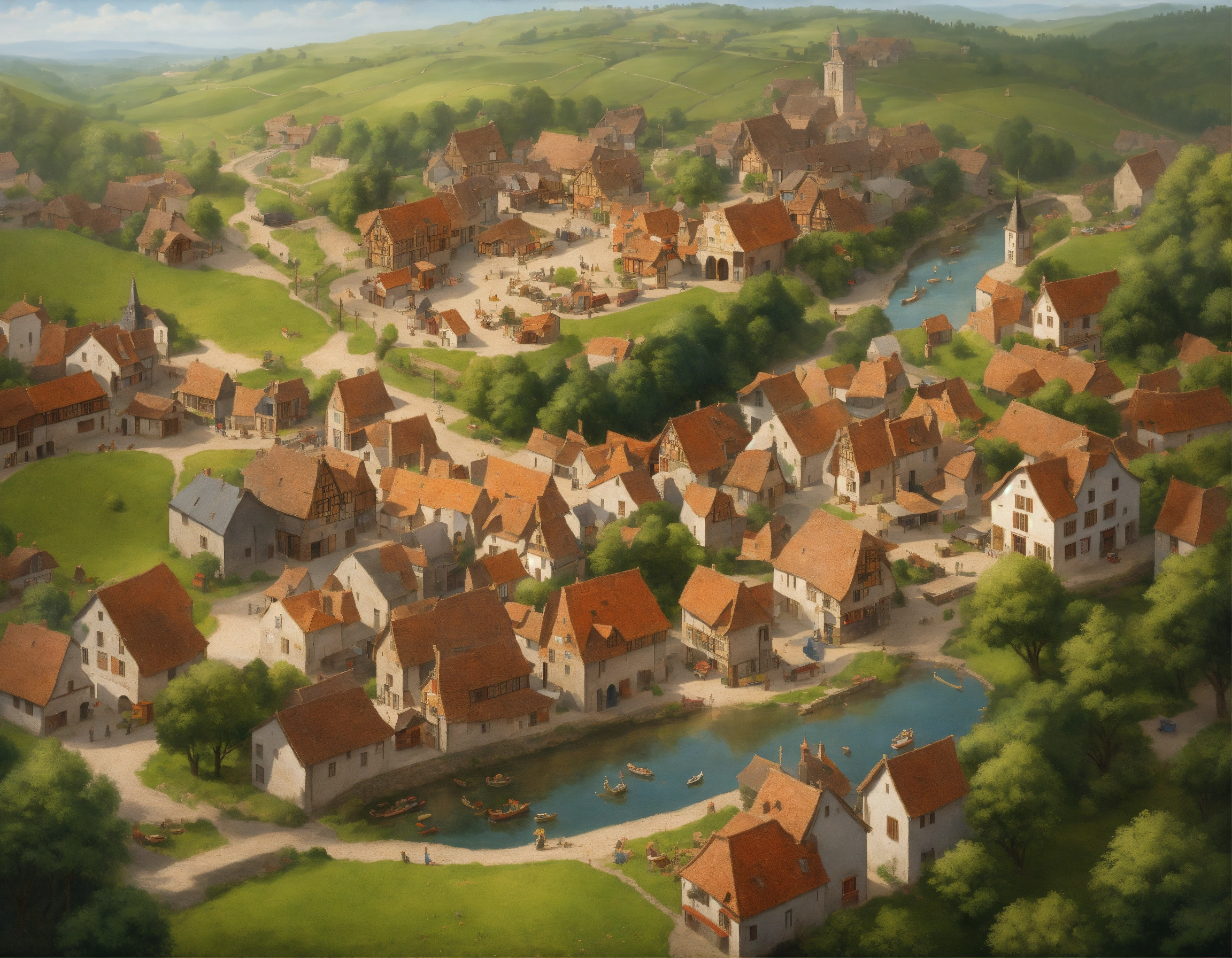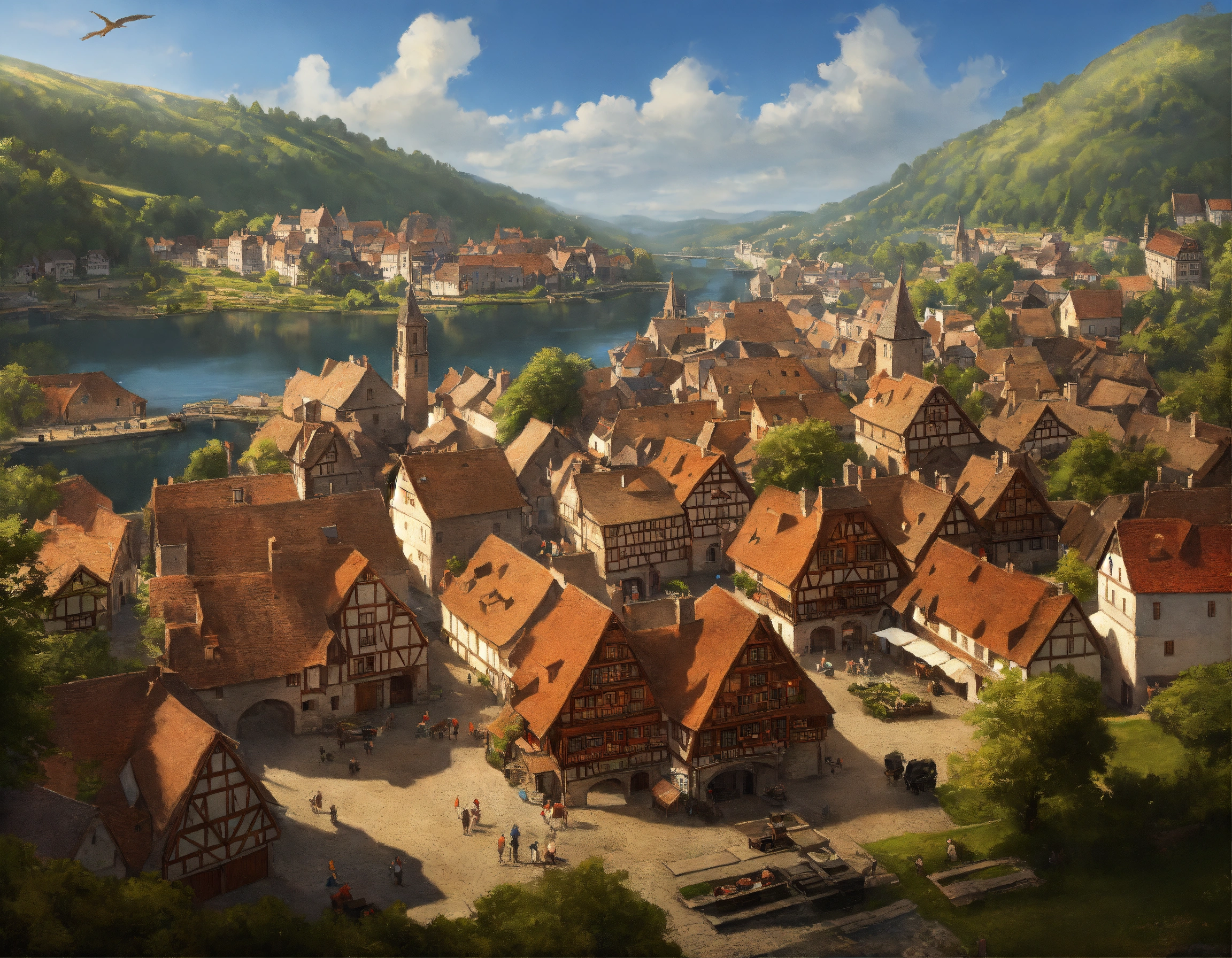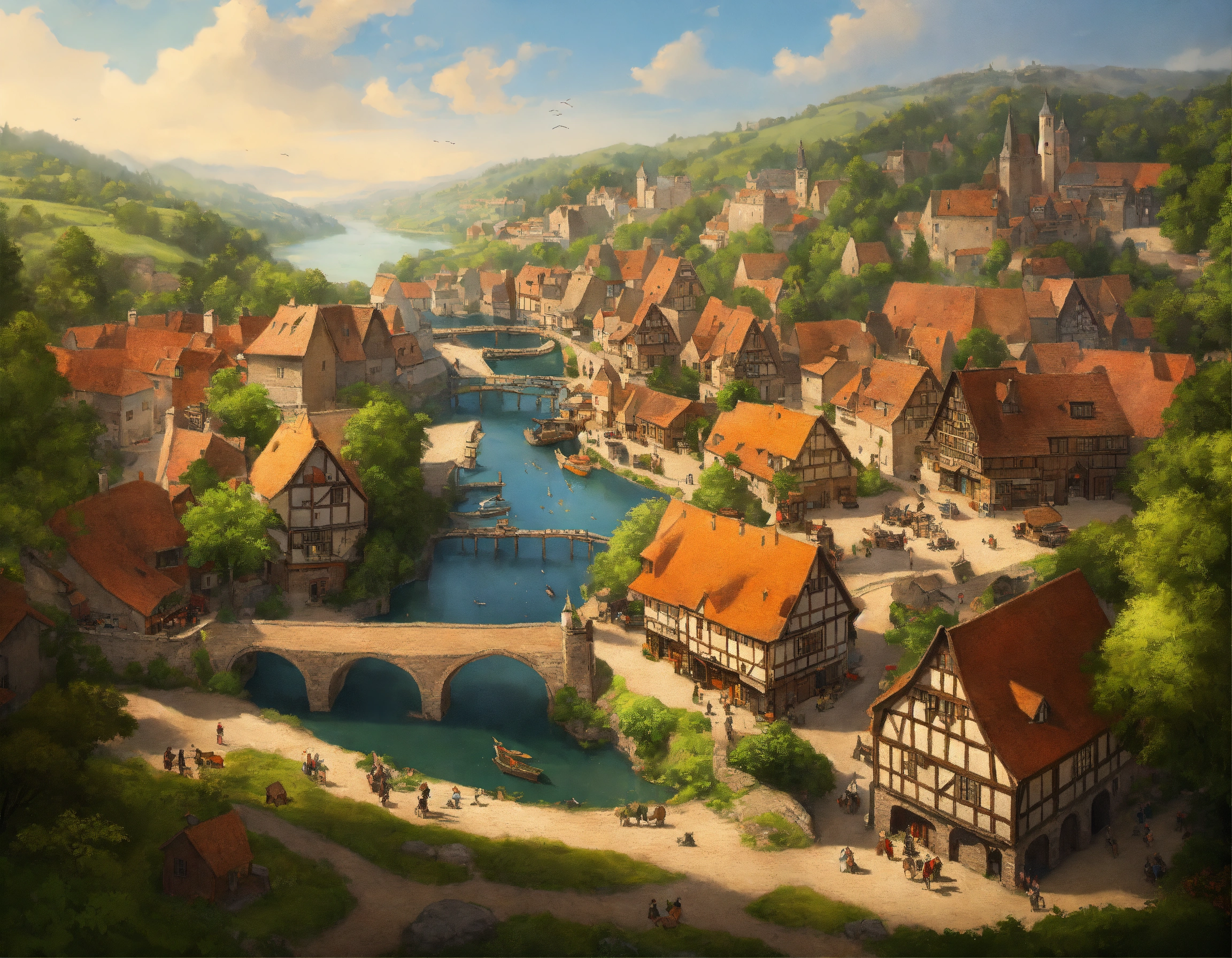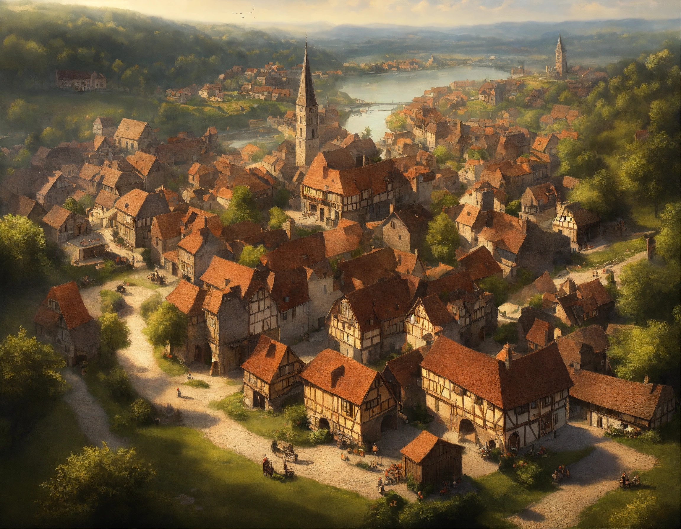 Highly realistic, photography, bird's eye view of a medieval town with 500 inhabitants, one-storey and two-storey wooden houses, half-timbered houses and a few stone houses, no dense building, large open market square in the town center, fortified small jetty with drift, in front of the town runs a small river, a trade route runs through the town, individual farms and homesteads lie around the town, densely wooded rolling hills behind the town, highly detailed, oil painting, ornamented, in the style of nicolas poussin, sharp contours, detailed, morning light, 8k, fantasy