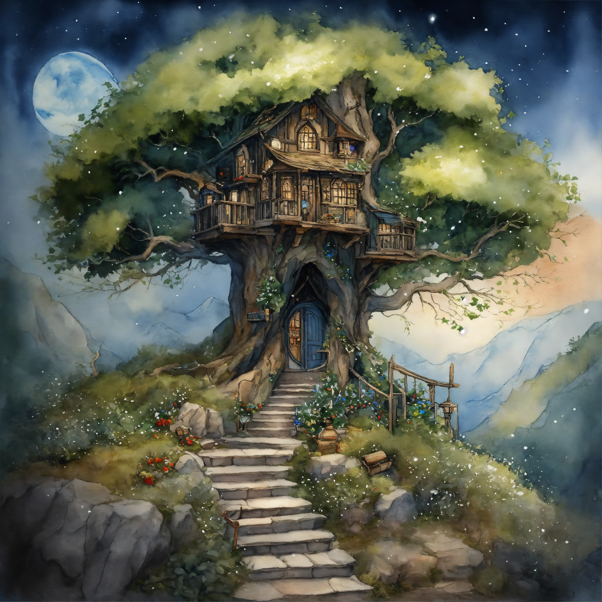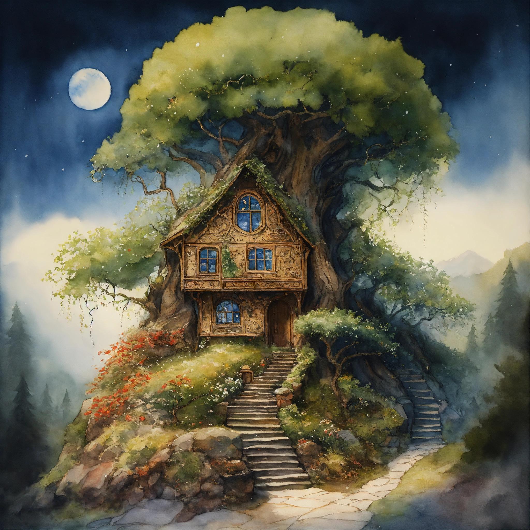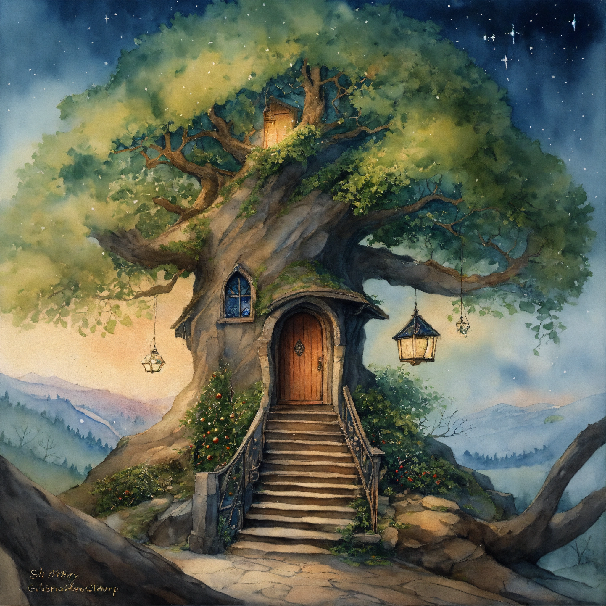 The inside of a magical elvish house, stairs carved on the outside leading to a elfs a workshop within the tree. the branches should reach out across the sky, a christmas story, ivy and holly around the tree, a snow storm forming in the dark blue sky, watercolour painting by cicely mary barker ultra-sharp, ultra-detailed, ""immerse viewers in a captivating fantasy realm. depict an otherworldly landscape concept art