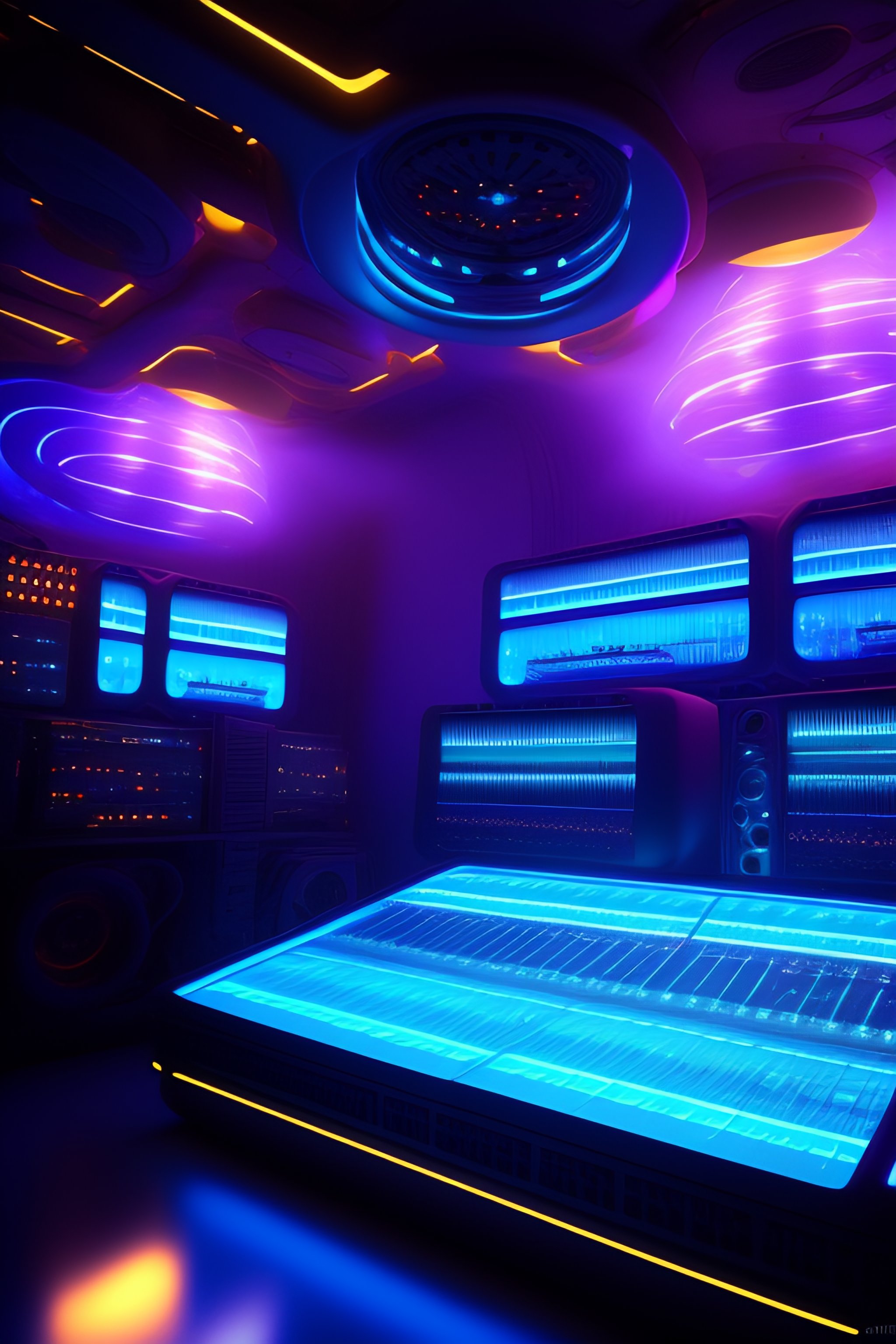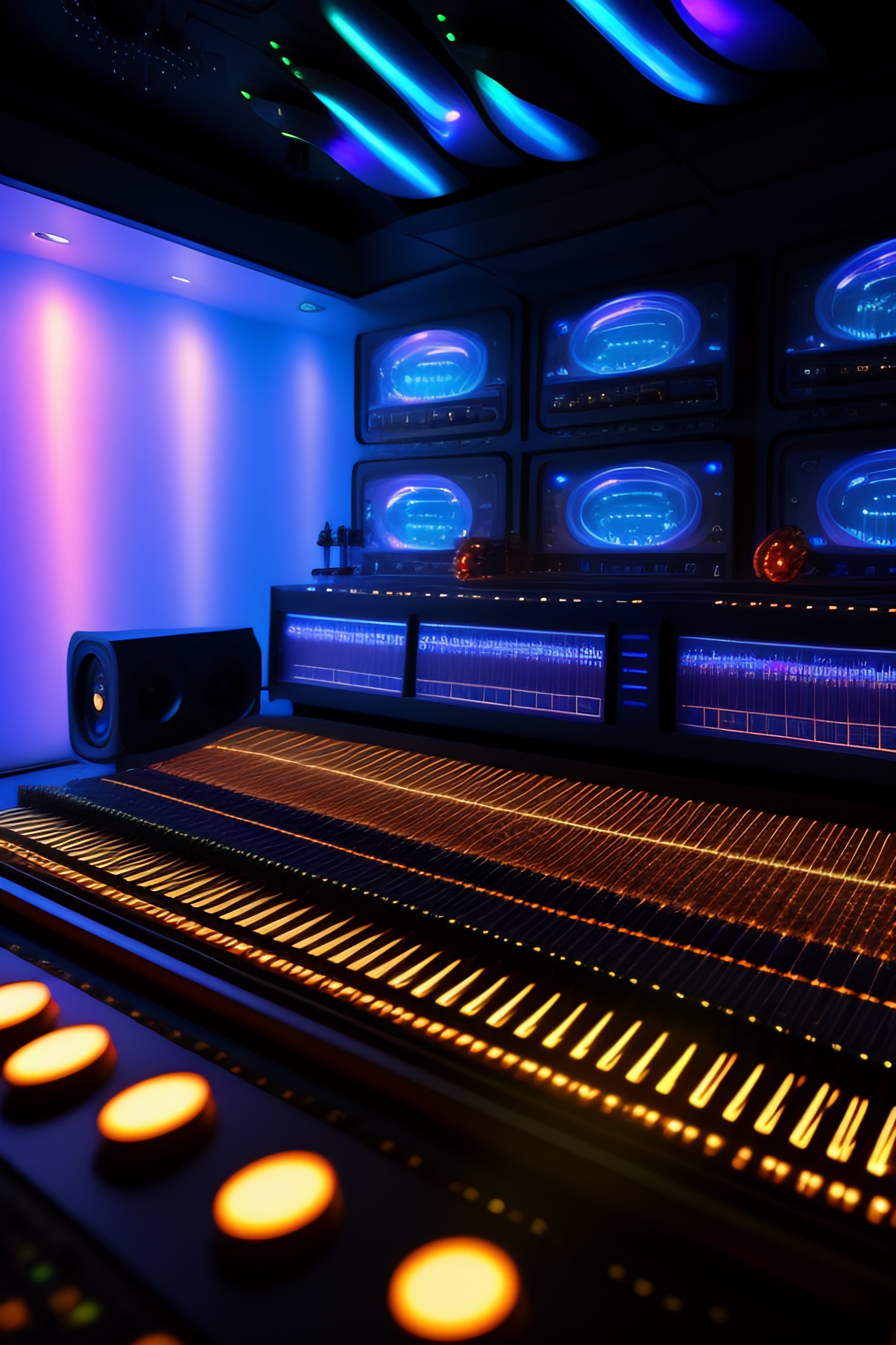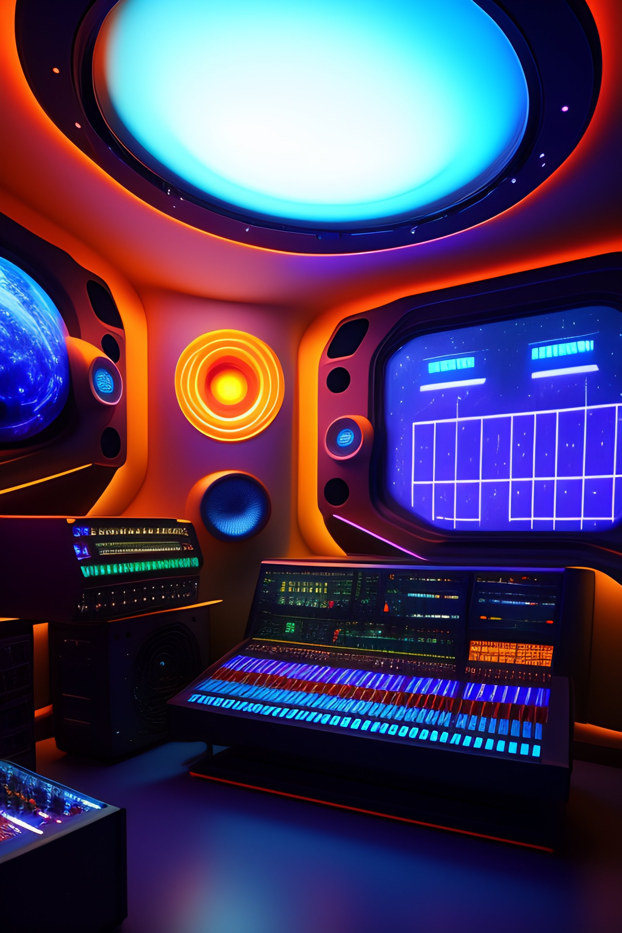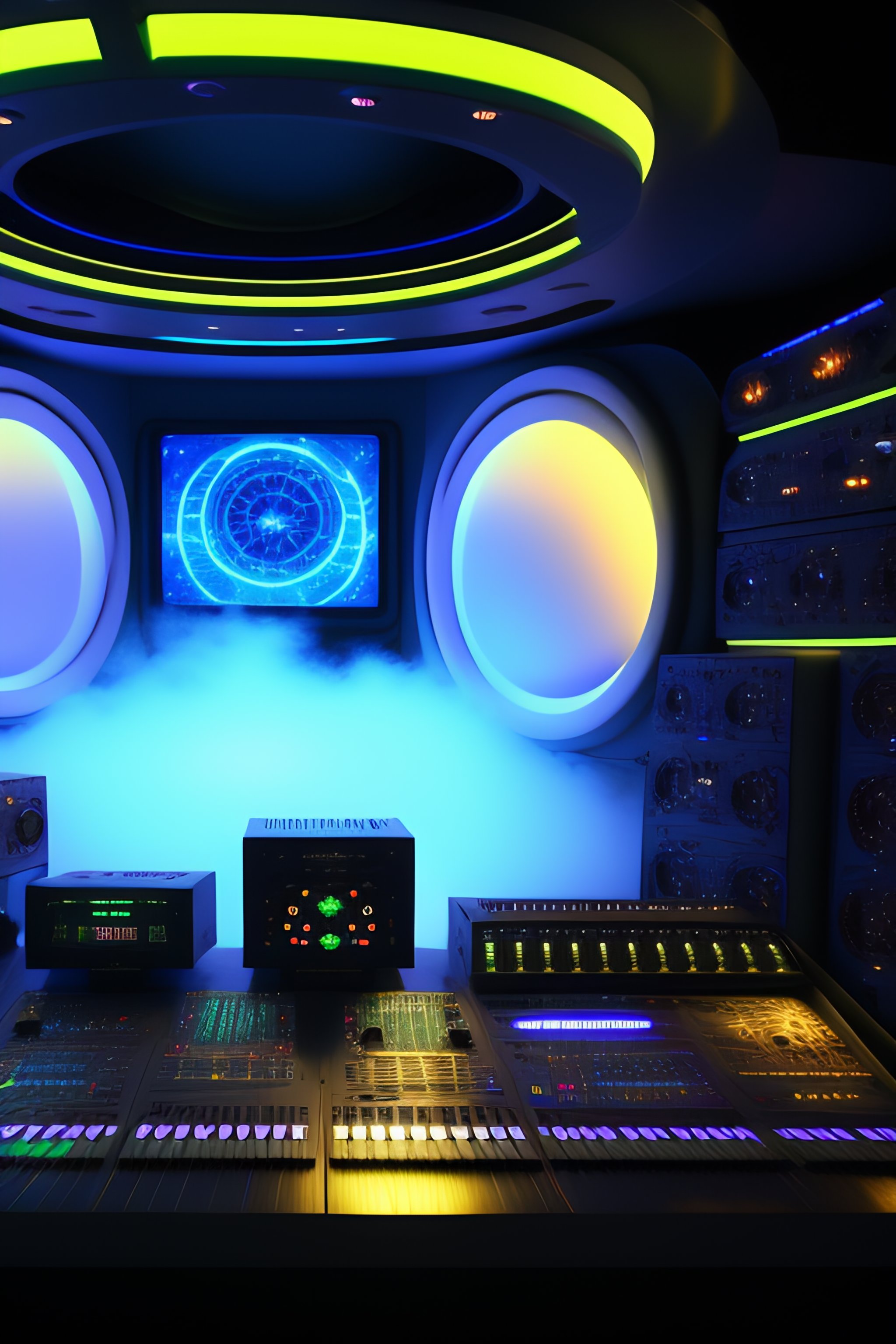 A space station recording studio filled with strange surrealist detailed alien electronic musical-instruments!! with blinking leds and oscilloscopes on screens in detailed alien interiors, backlit fog, designed by larry elmore kerlaft and pixar, photorealistic, 3d render, award winning render, unreal engine, octane render, studio lighting, 8k, hd