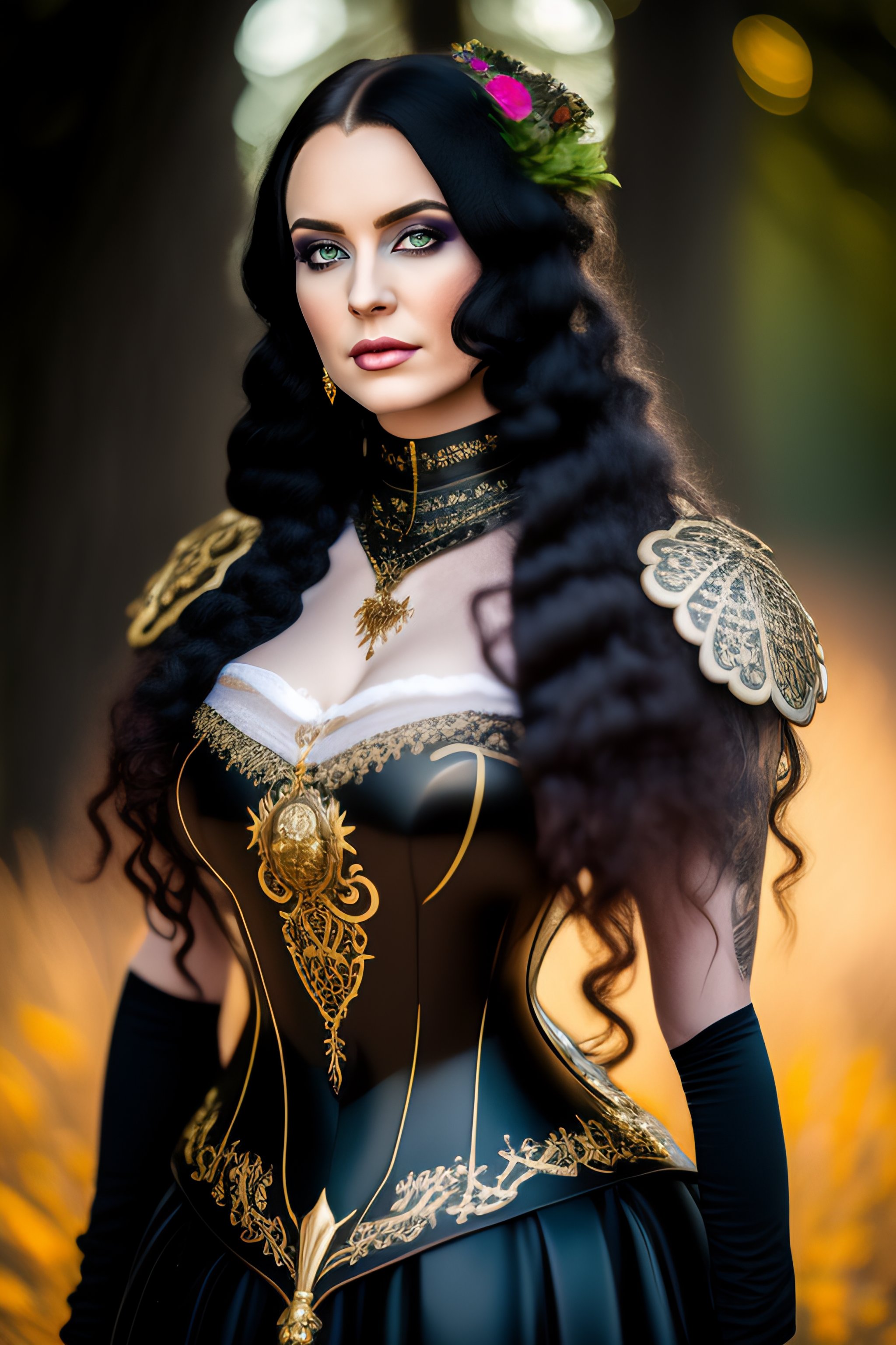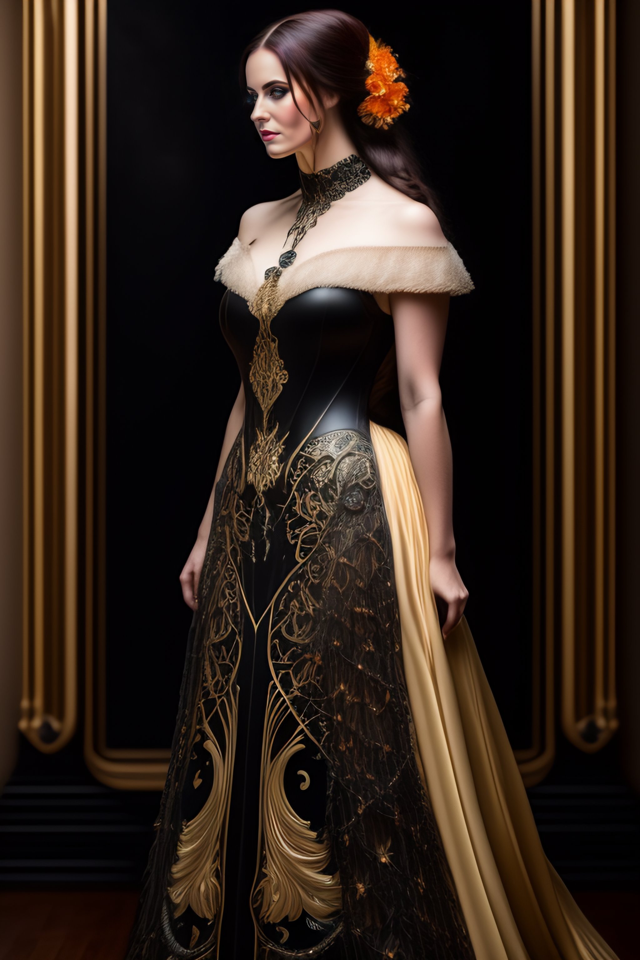 Hazel moore, black metal girl, realistic detailed, beautiful gorgeous, art nouveau dress, proportional body, nikon 70-200mm f/2.8g, art by gustave courbet