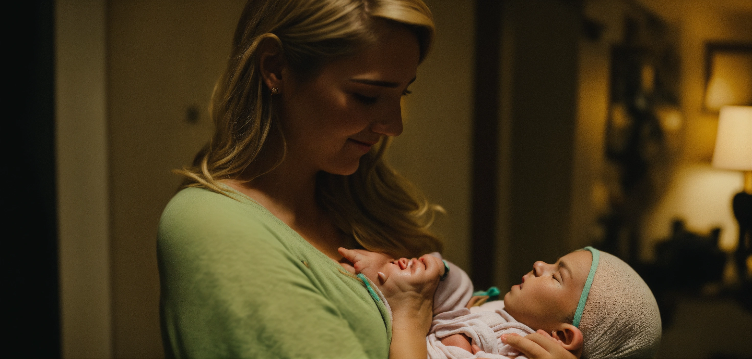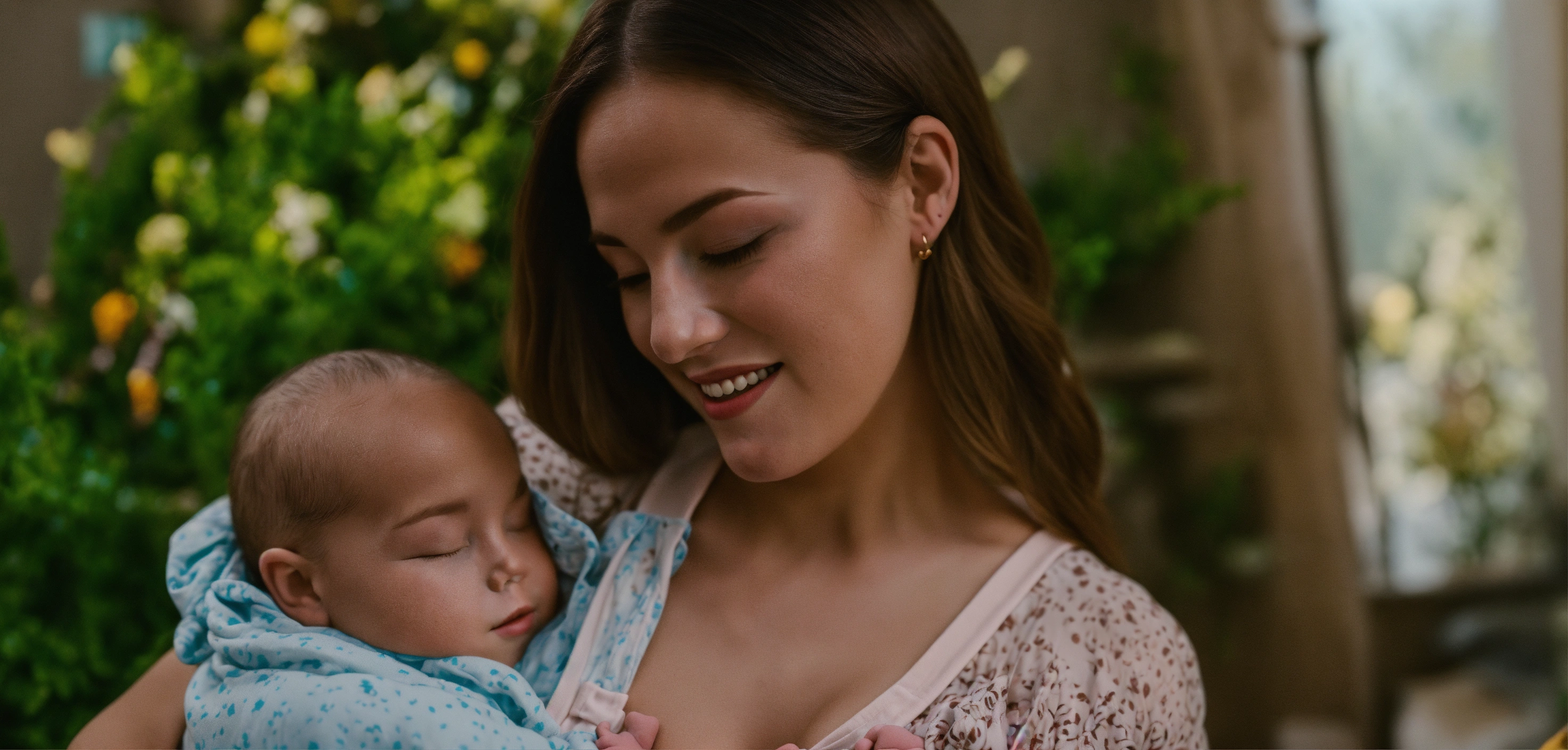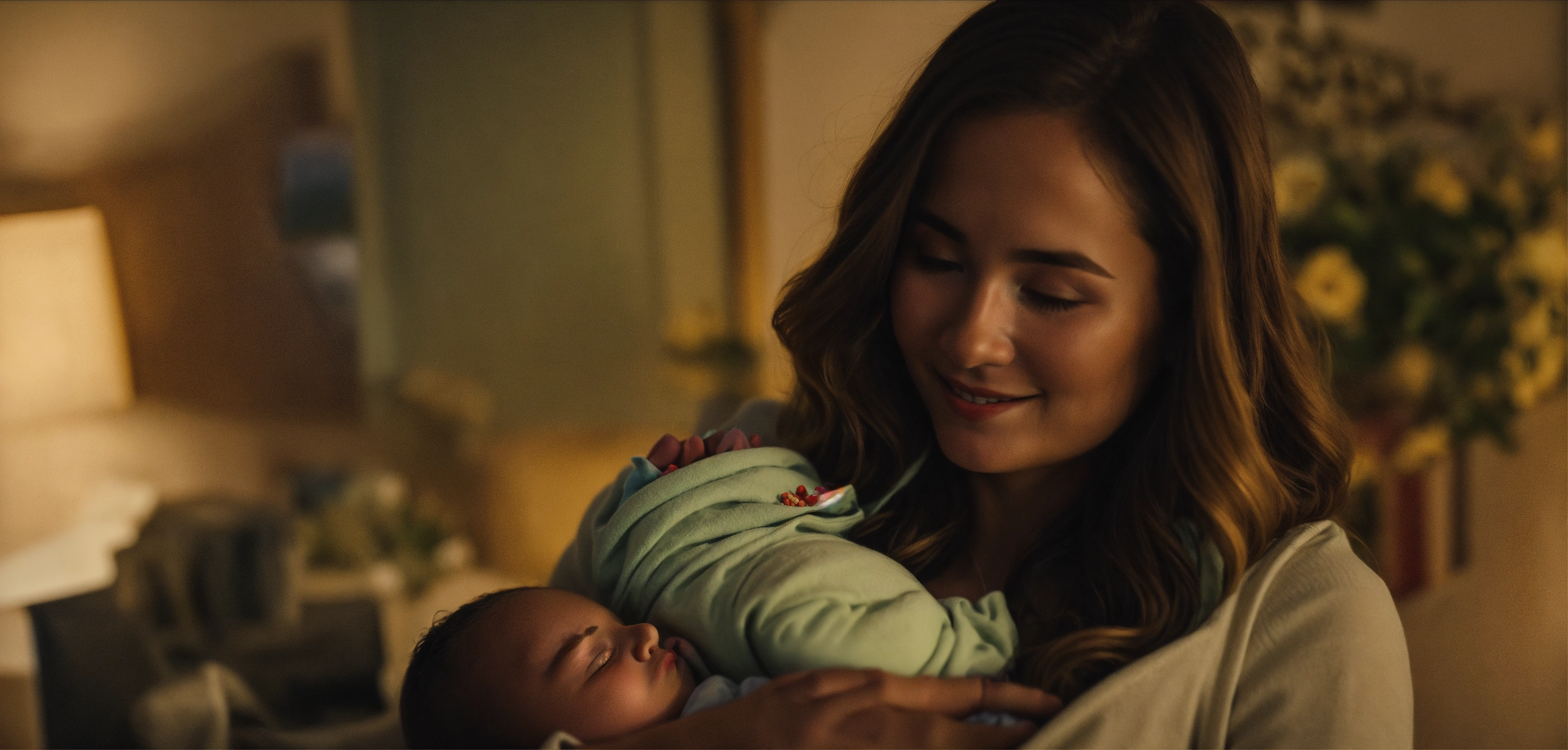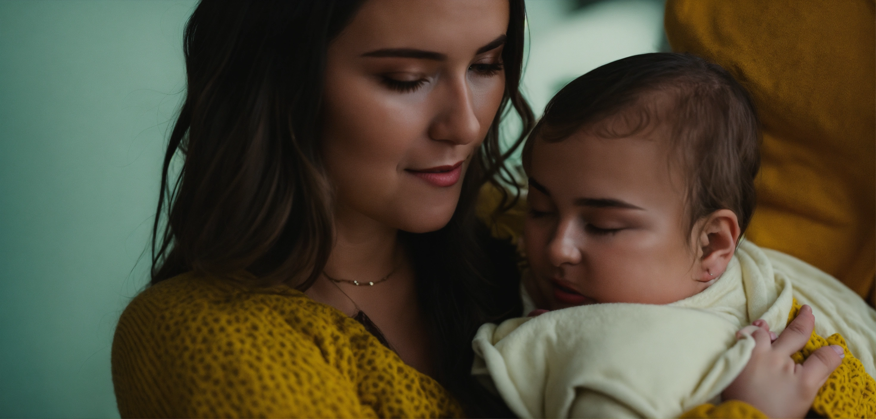 Image of the social media influencer ella schnacky in her late 30s carrying her newborn son