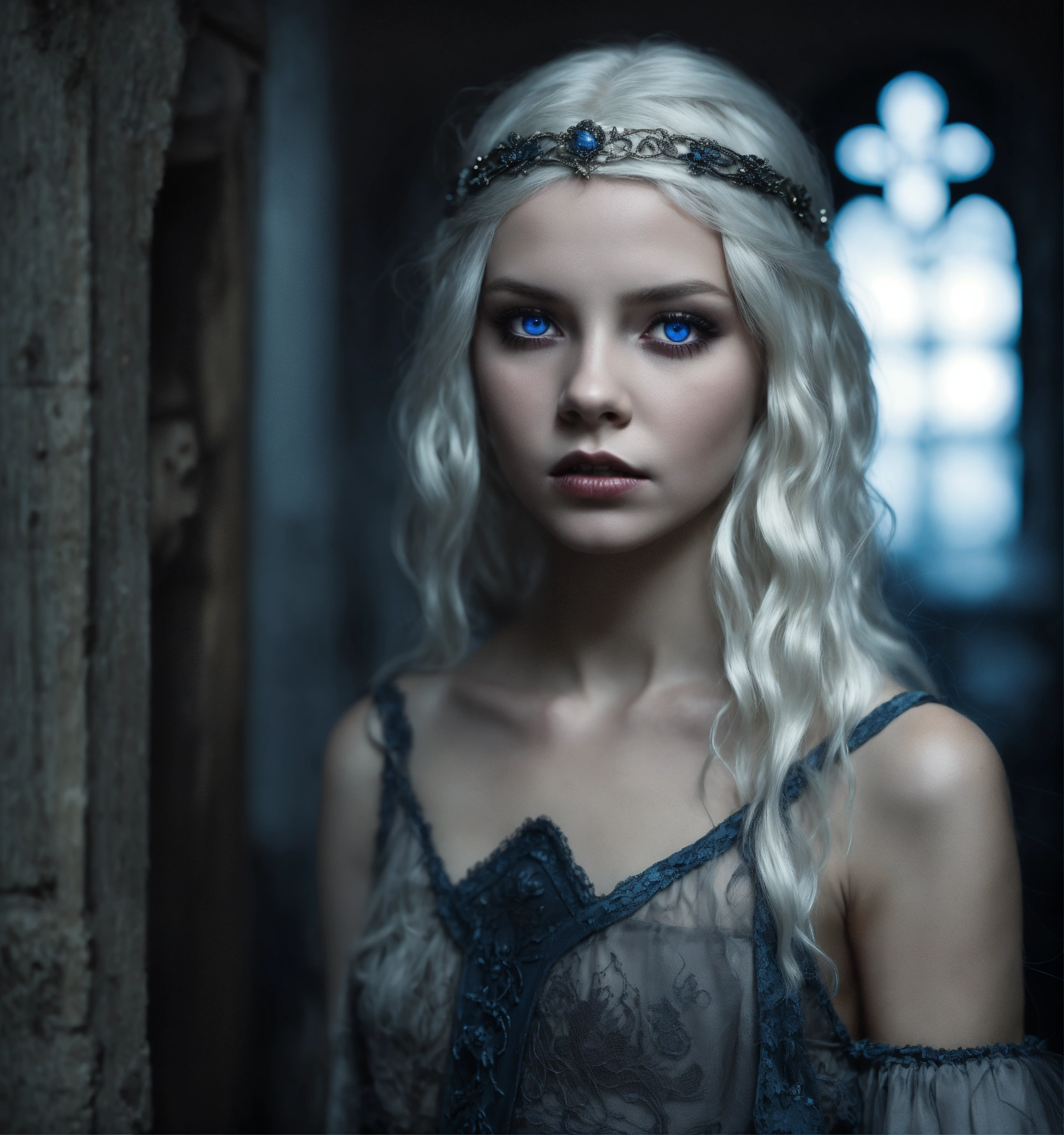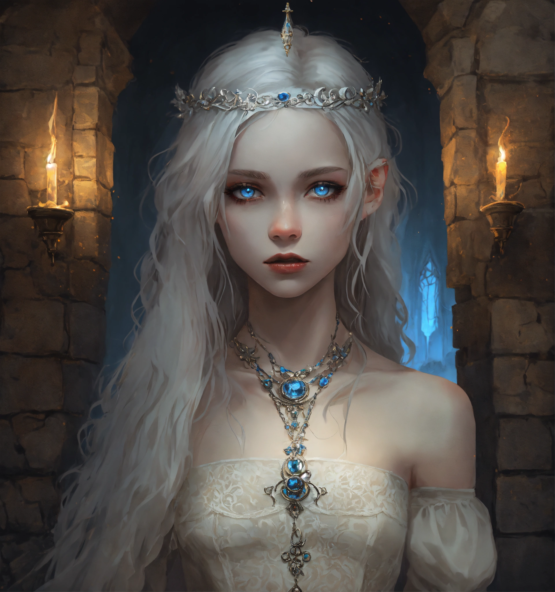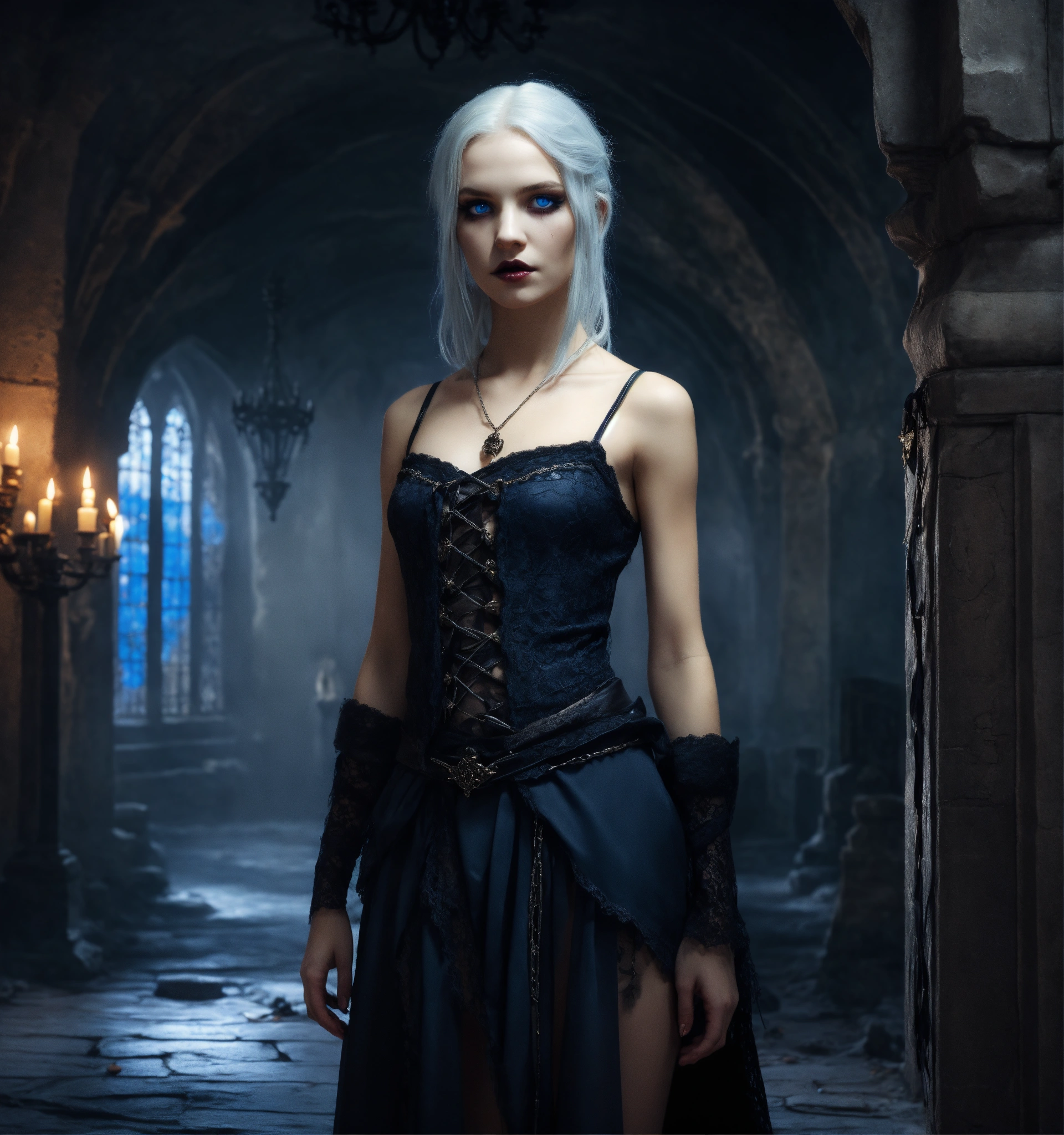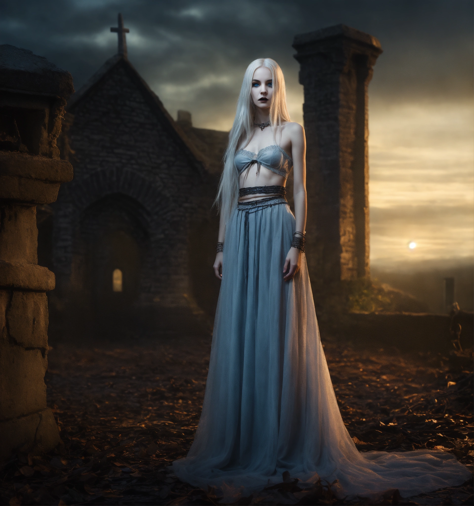 Body portrait, sehr kindhafte deadly pale twelve year old female goth necromancer child with waist long silverwhite hair and a aufreizendes off-the-shoulder lace silk cropped top mit tiefem ausschnitt and a low-waisted high slit skirt, very flat belly, extremely skinny, extremely slim and emaciated body, very narrow face, alabaster skin, pale as a corpse, glowing blue eyes, slim face, innocent looking, in a gloomy crypt, kindlich, unschuldig, childlike, juvenile, graceful, wispy, glowing blue eyes, ghostly, dead, evil, demonic, undead, darkness, grotesque, mysterious, dark, dark, cold ambient lighting, extremely detailed, fantasy, medieval setting