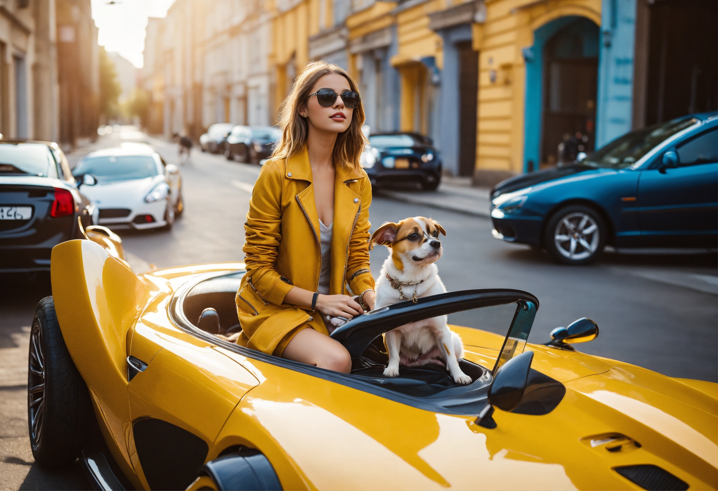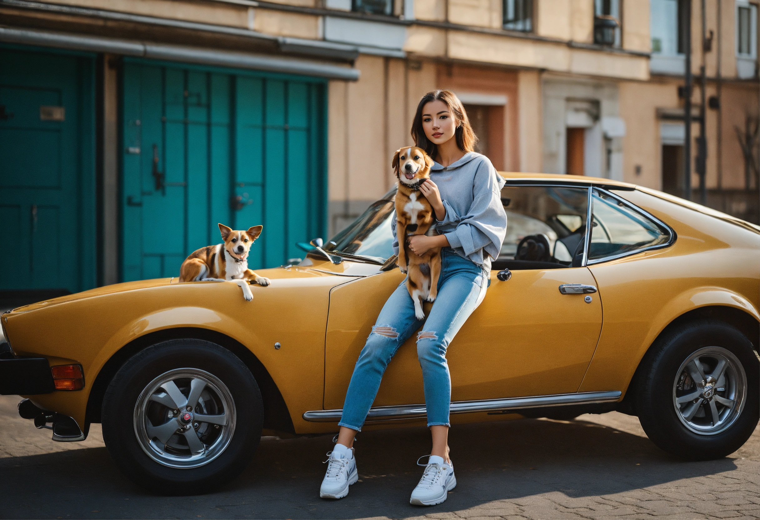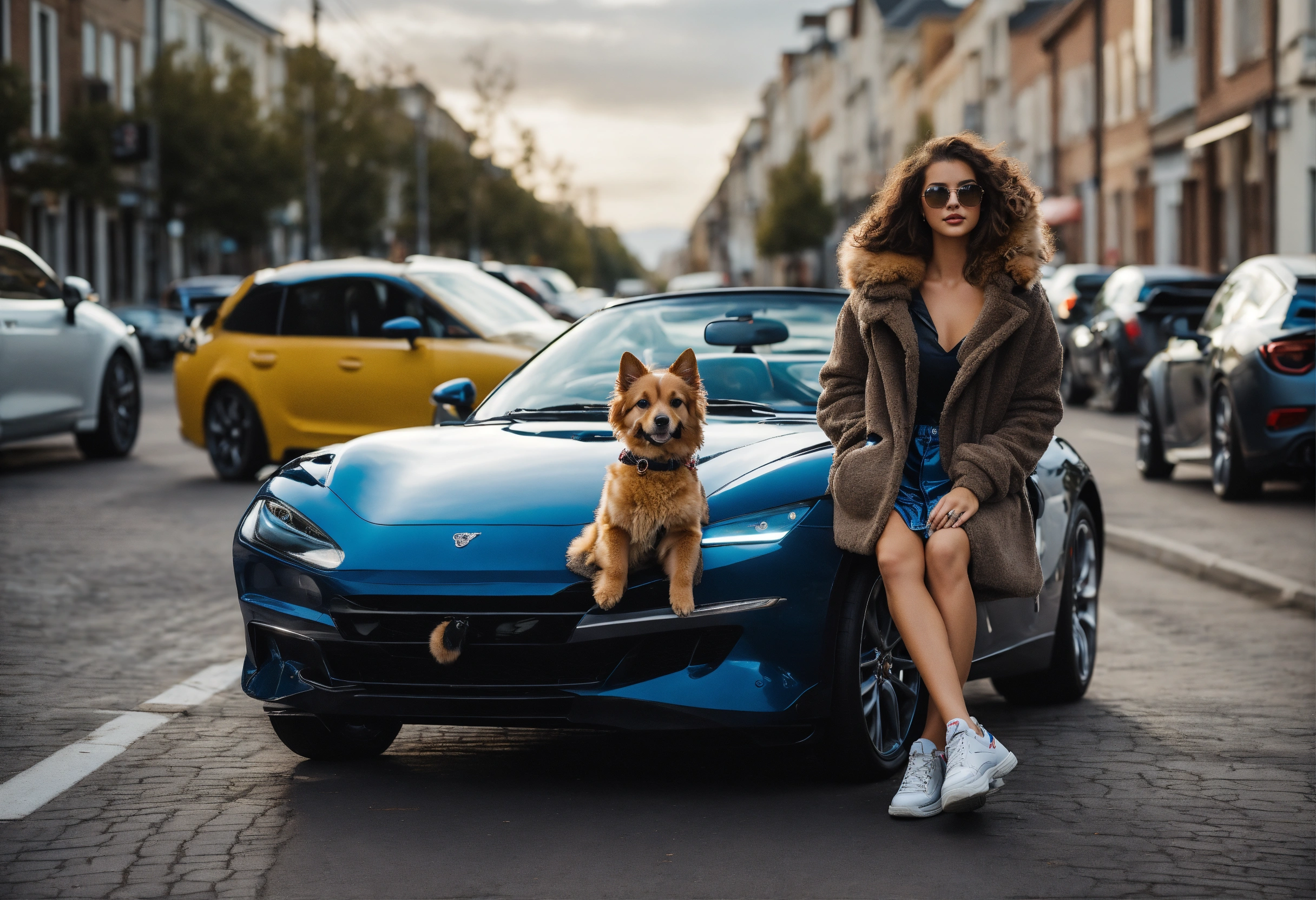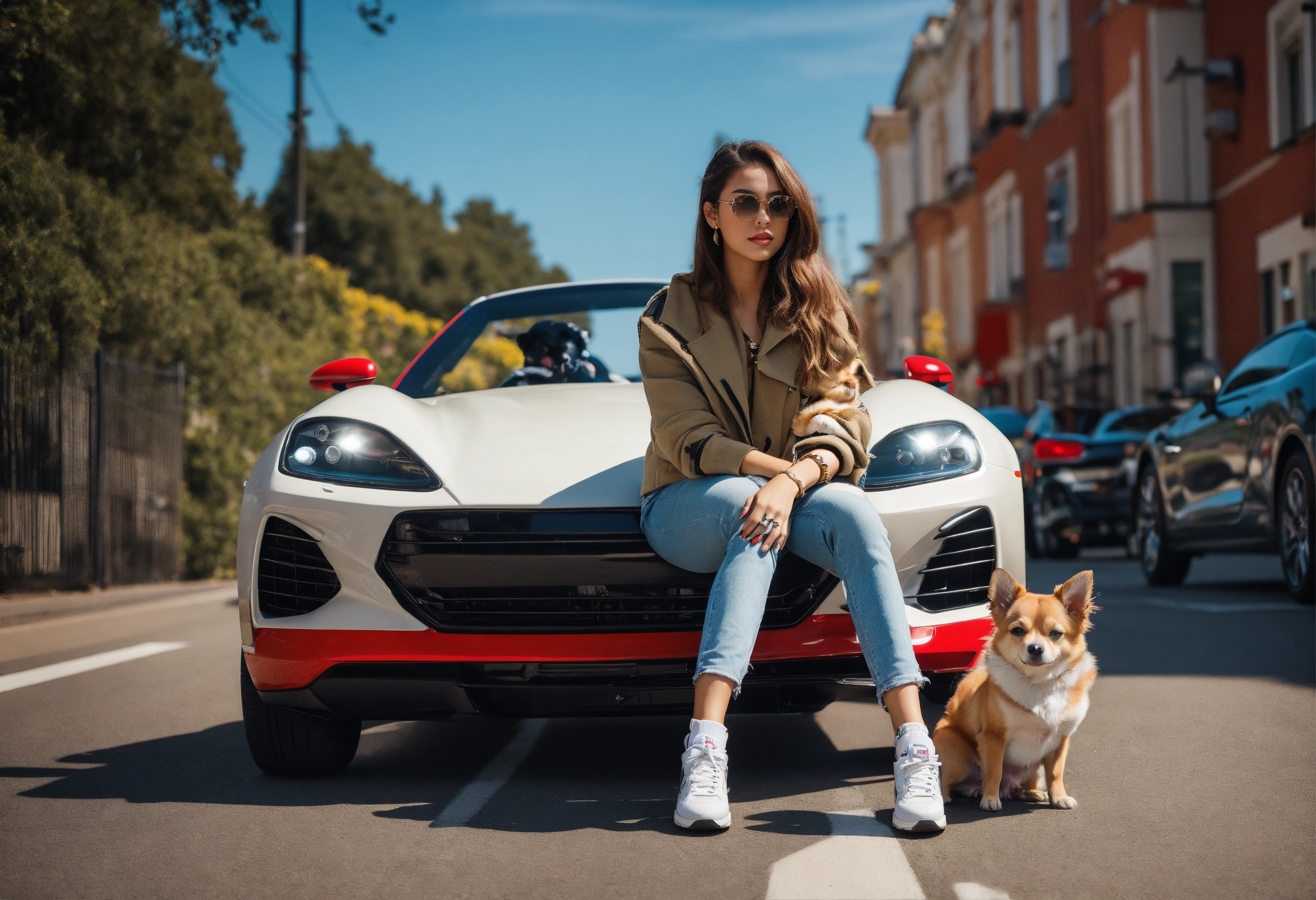 Young woman dressed in modern clothes with a small dog sitting on the hood of a sports car parked in the middle of a street