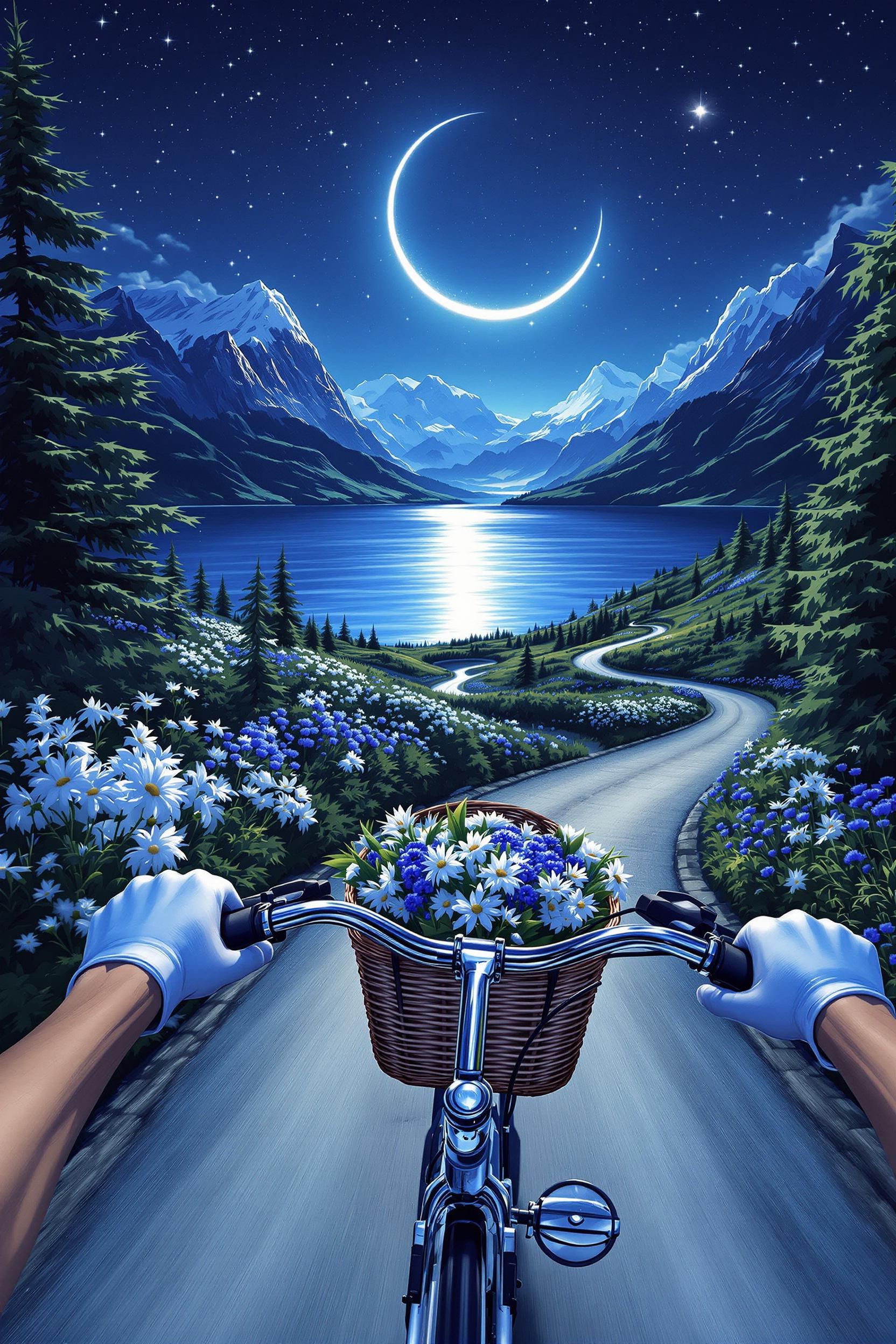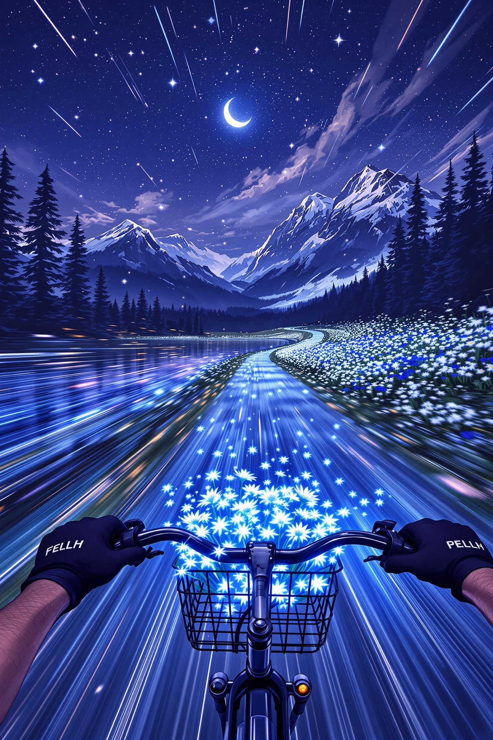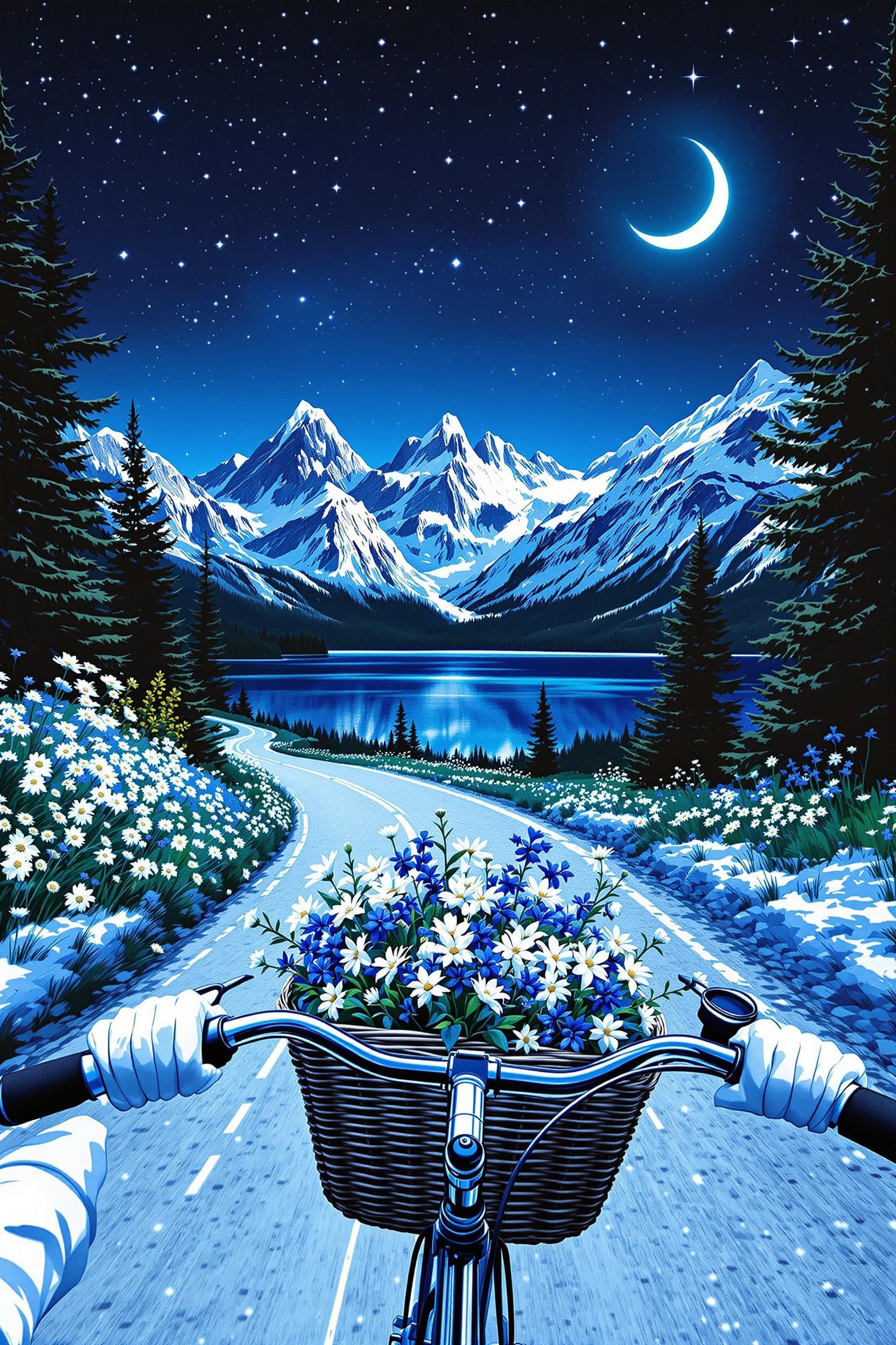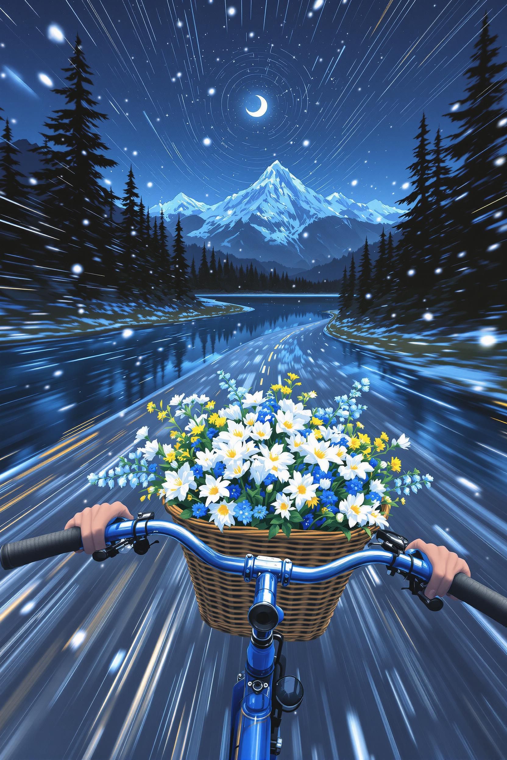 Breathtakingly beautiful scene from a first-person perspective the girl rides a bicycle with her hands so tightly gripped on the handlebars that only the handlebars can be seen, and the basket is filled with glowing moonflowers, silver edelweiss and deep blue gentian, colourful against the night sky. the bikes travelled along a winding gravel road beside a crystal-clear alpine lake, its still waters reflecting the constellations and crescent moons twinkling in the starry sky. black pine forests loomed on either side, mountain peaks were jagged and hazy, and snowflakes gently drifted down from the tops of the mountains. under the soft starlight, the air shimmers with a cool glow. the mysterious and serene atmosphere hinted at a different flavour. 80s anime illustration. focus on conveyinh immense speed