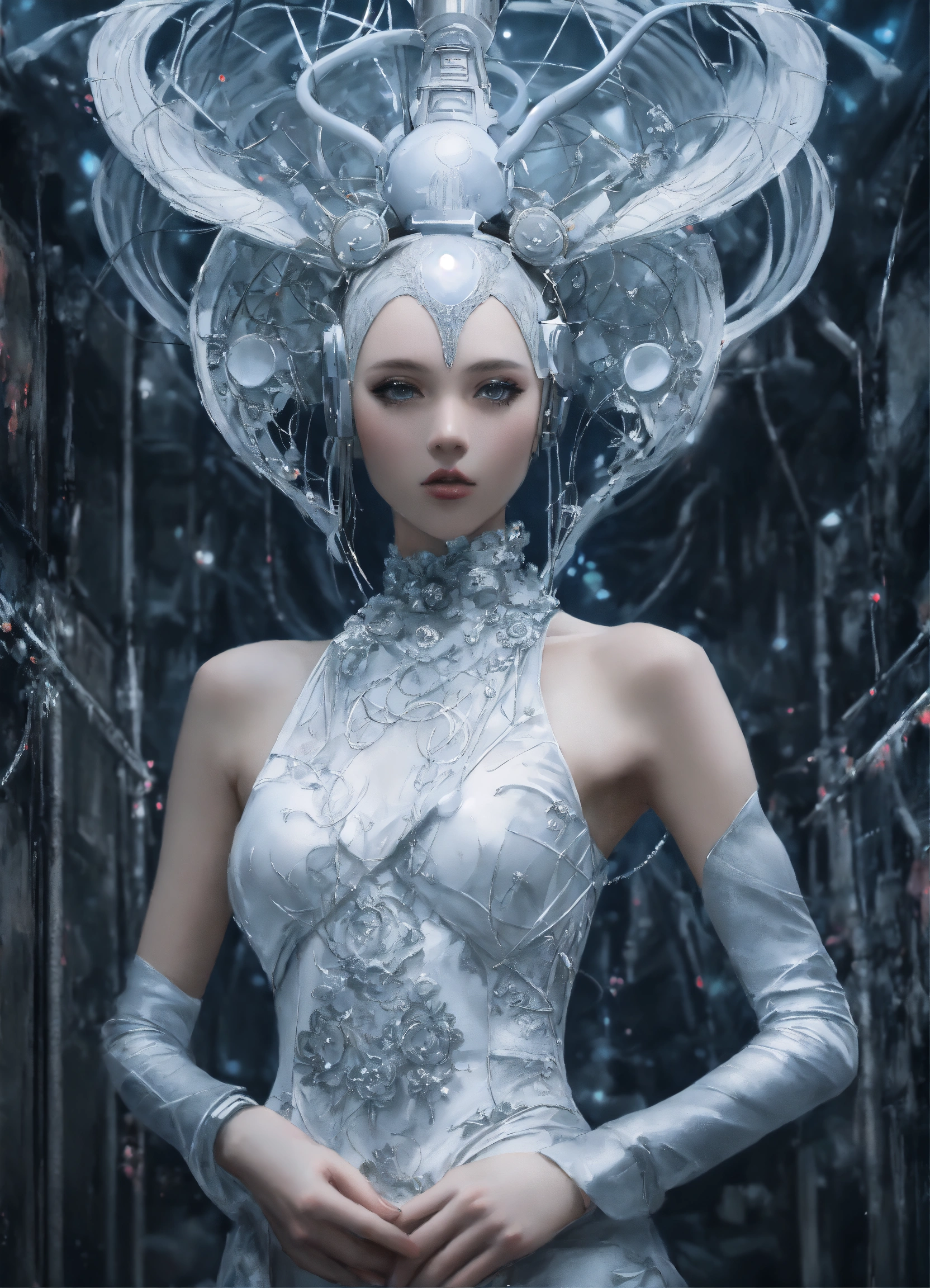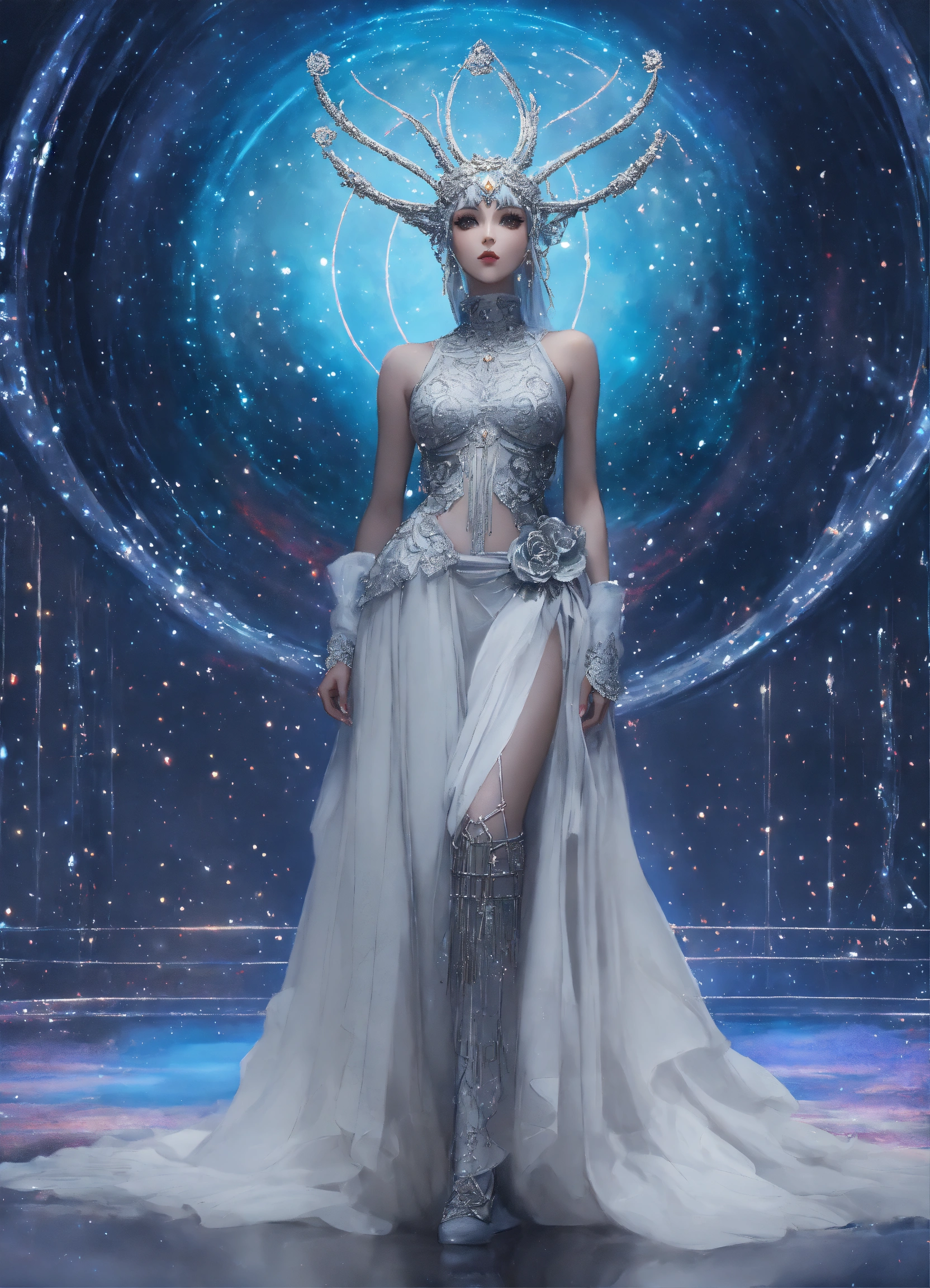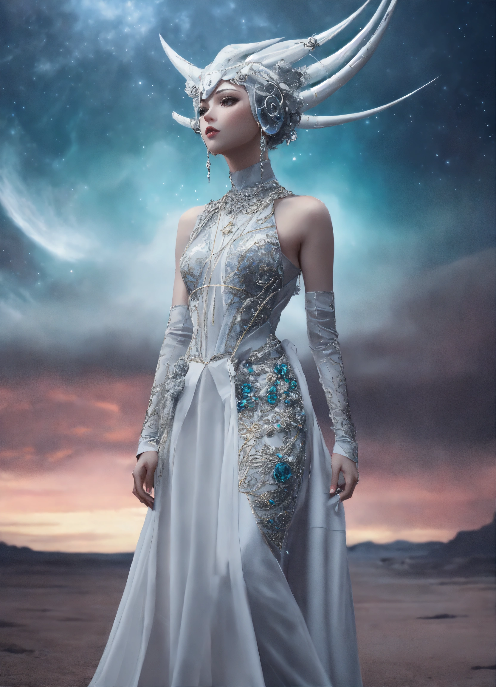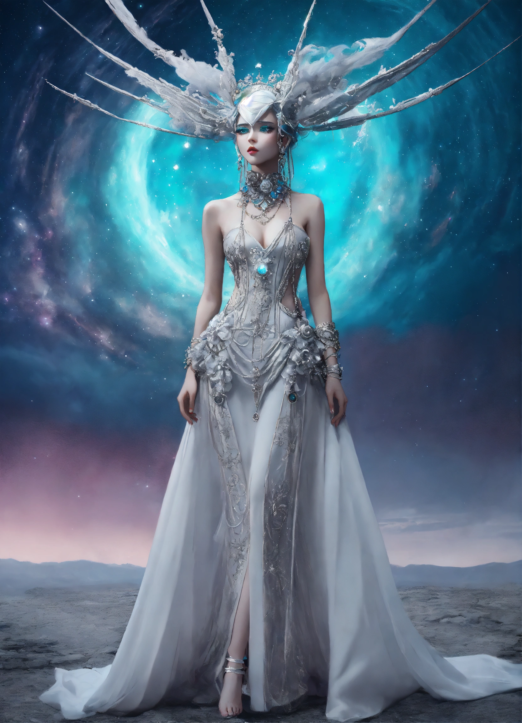 Ethereal minimalist alien race cybergoth fashion goddess photography painting, in the style of dark pastel color pearl white and silver, highly detailed clothings, long dress full body wide shot, mouving pose, painting oel on canvas, intricate, sharp_focus, concept_art, backround cosmic sky
