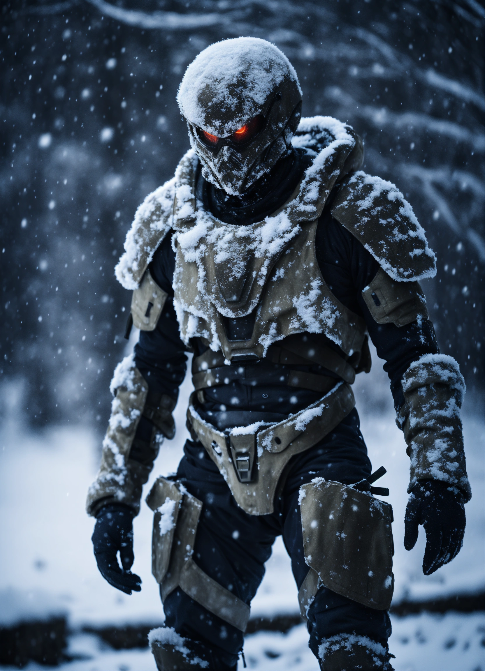 A alien soldier monster, full body portrait in a lanscape, wearing white winter, during a snow storm, dark lighting, intricate details, depth of field, in a cold snowstorm, outdoors, night