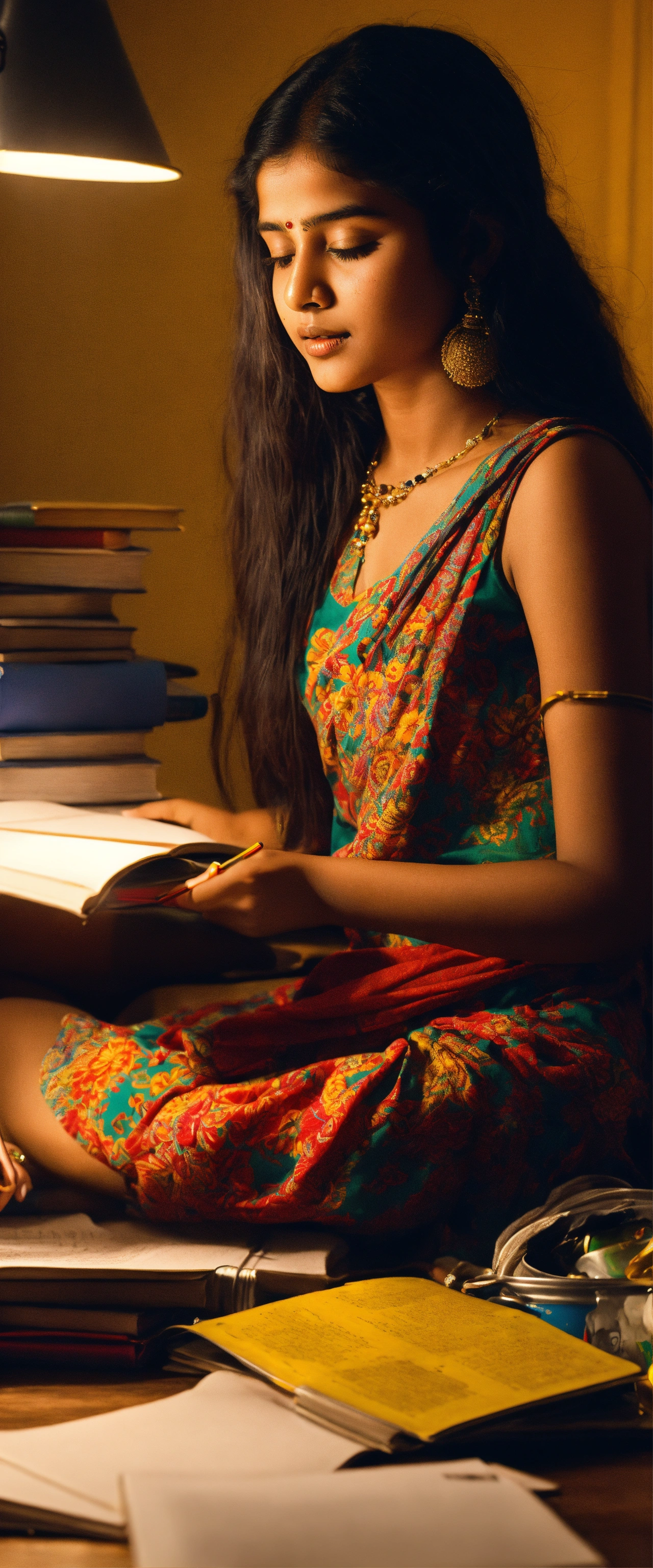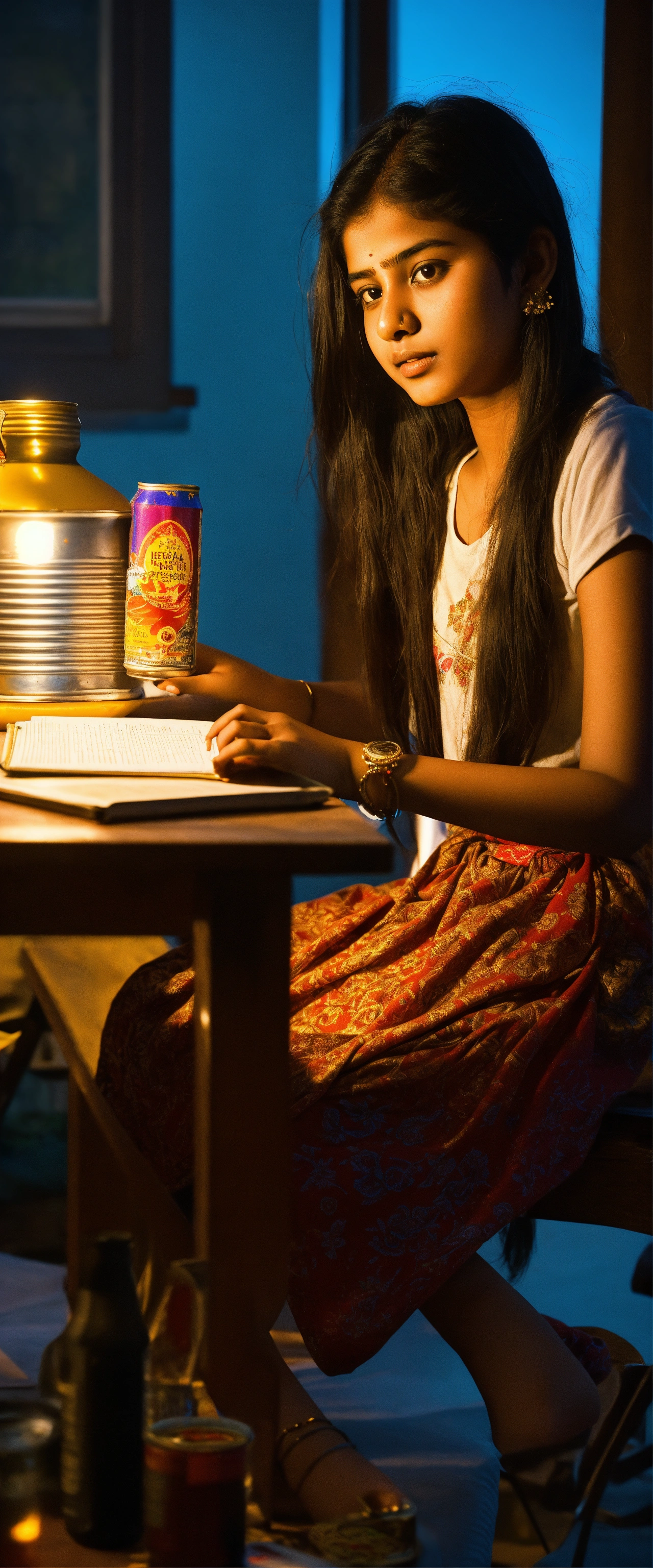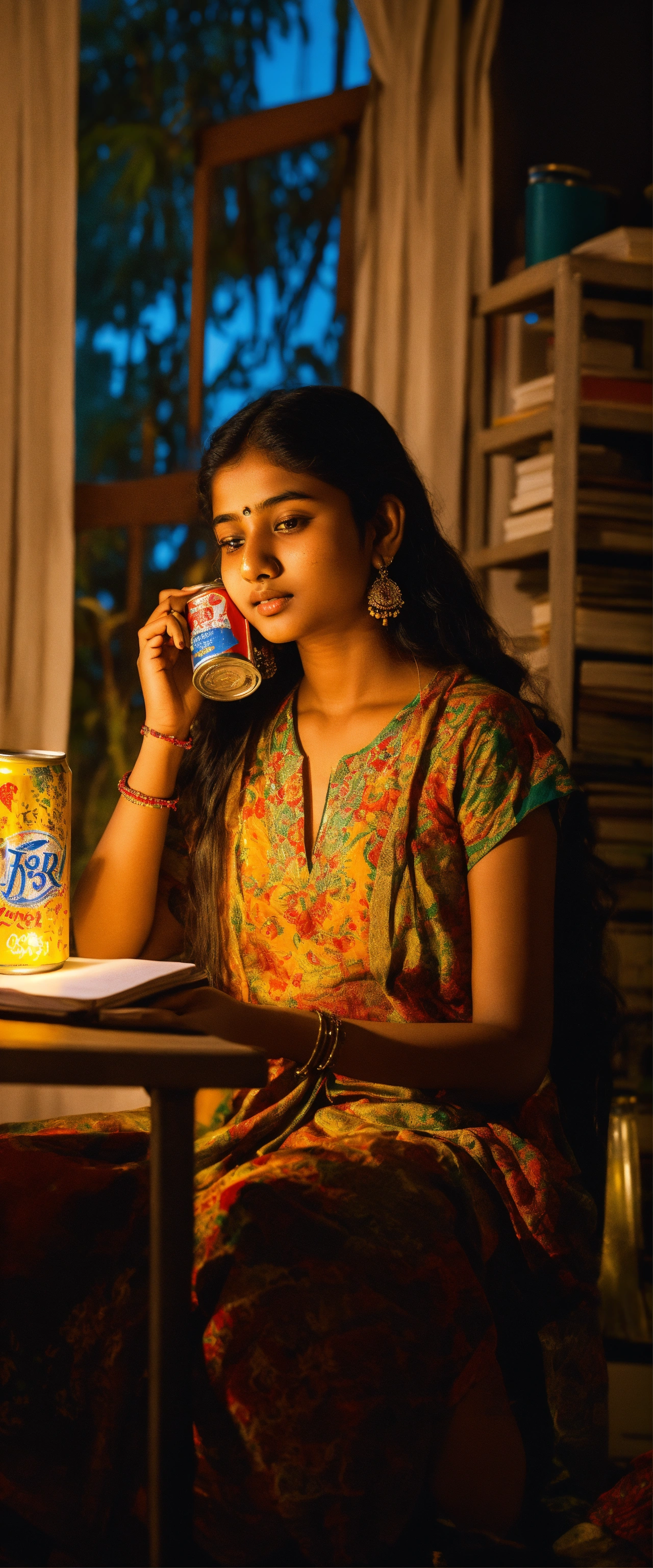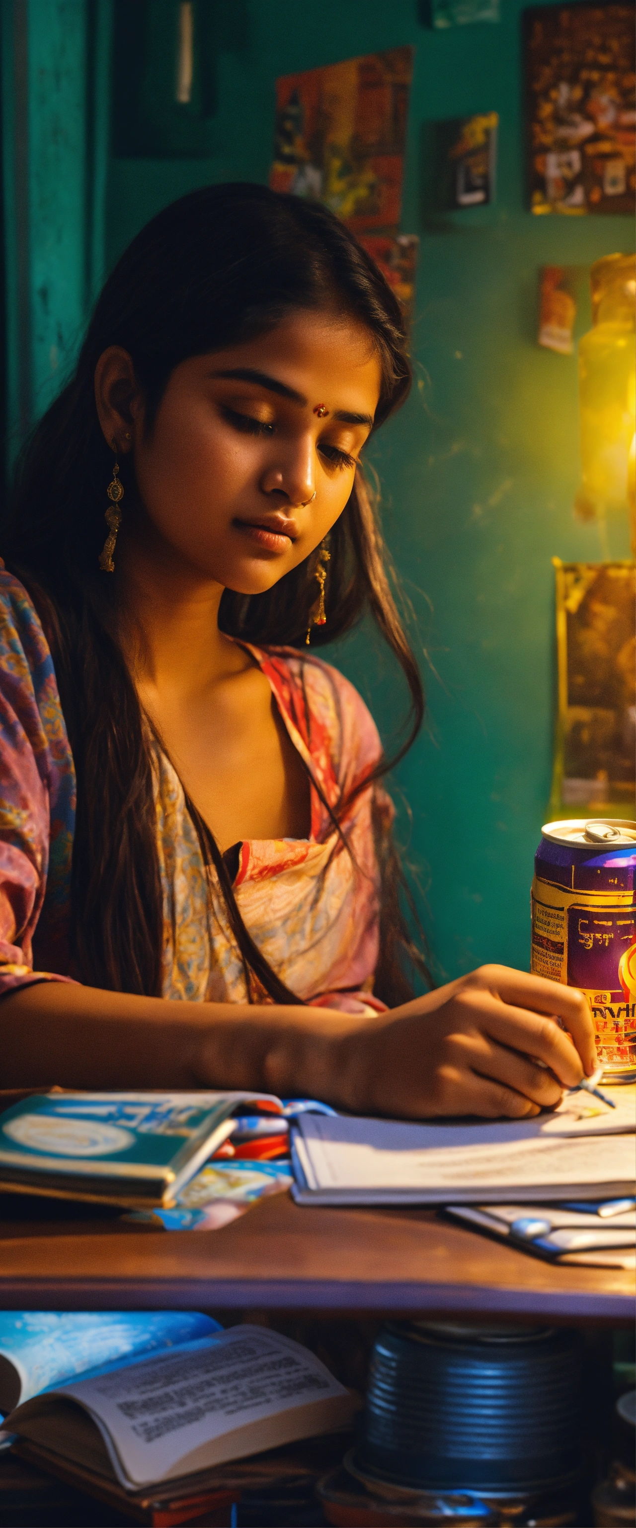 Bengali girl is 16 year old having a canned bevarage while studying, make the girl with a hippie look sitting on a study table with a can, make it look like she is working late night