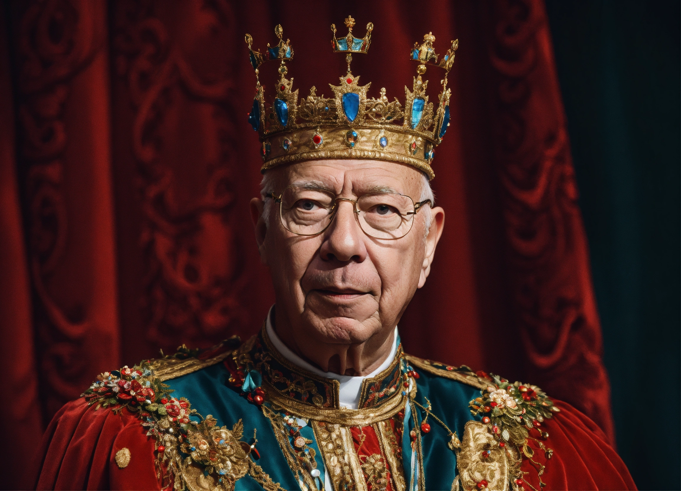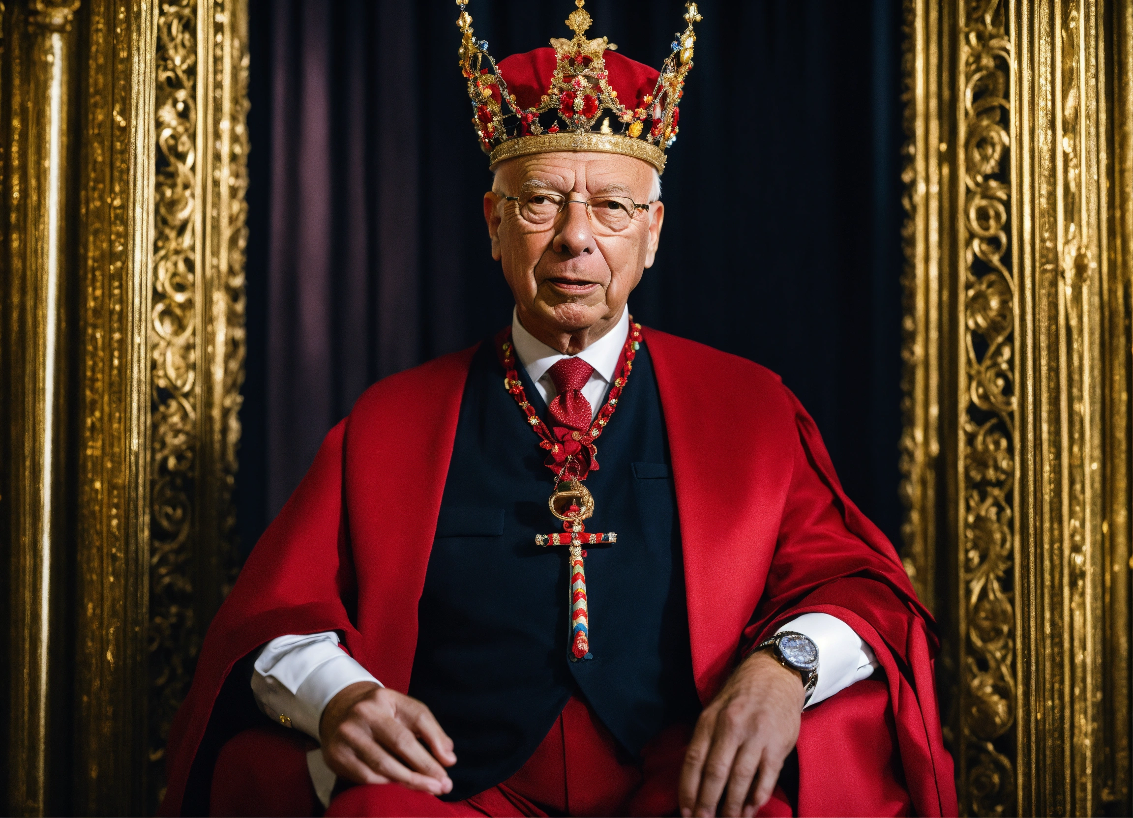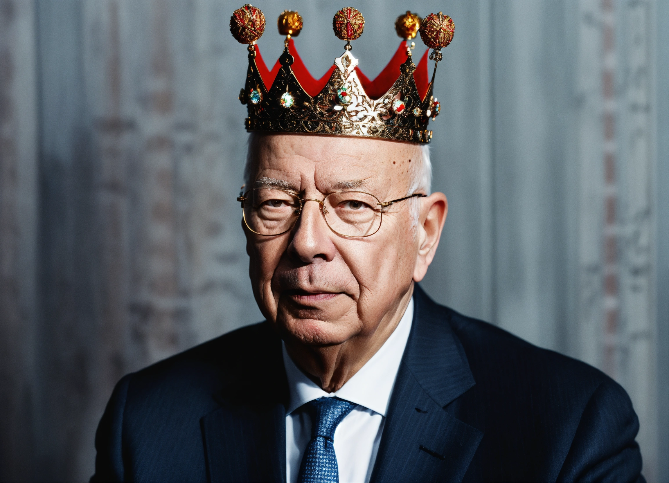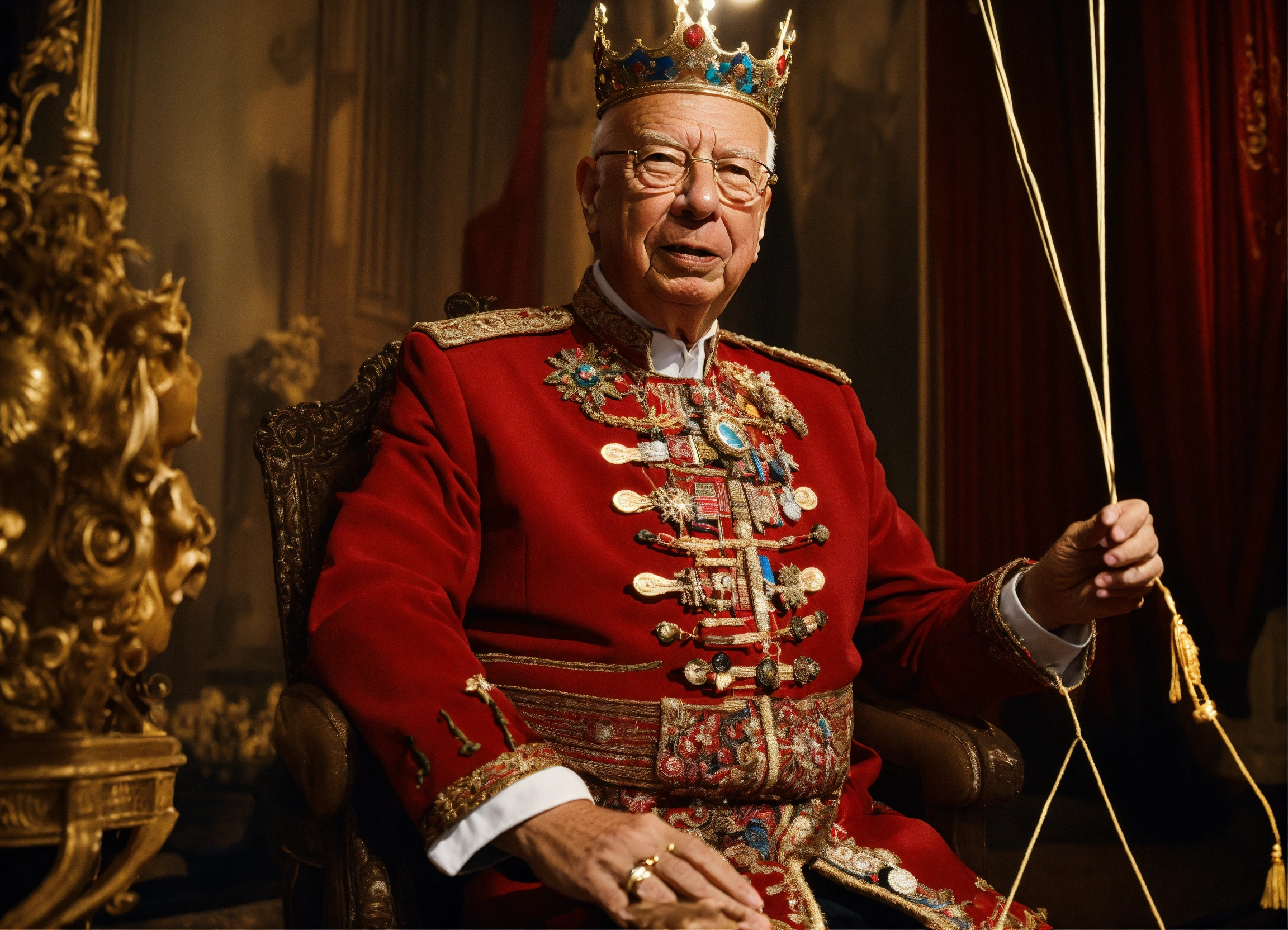 Klaus schwab wearing a crown and holding the strings of marionette's