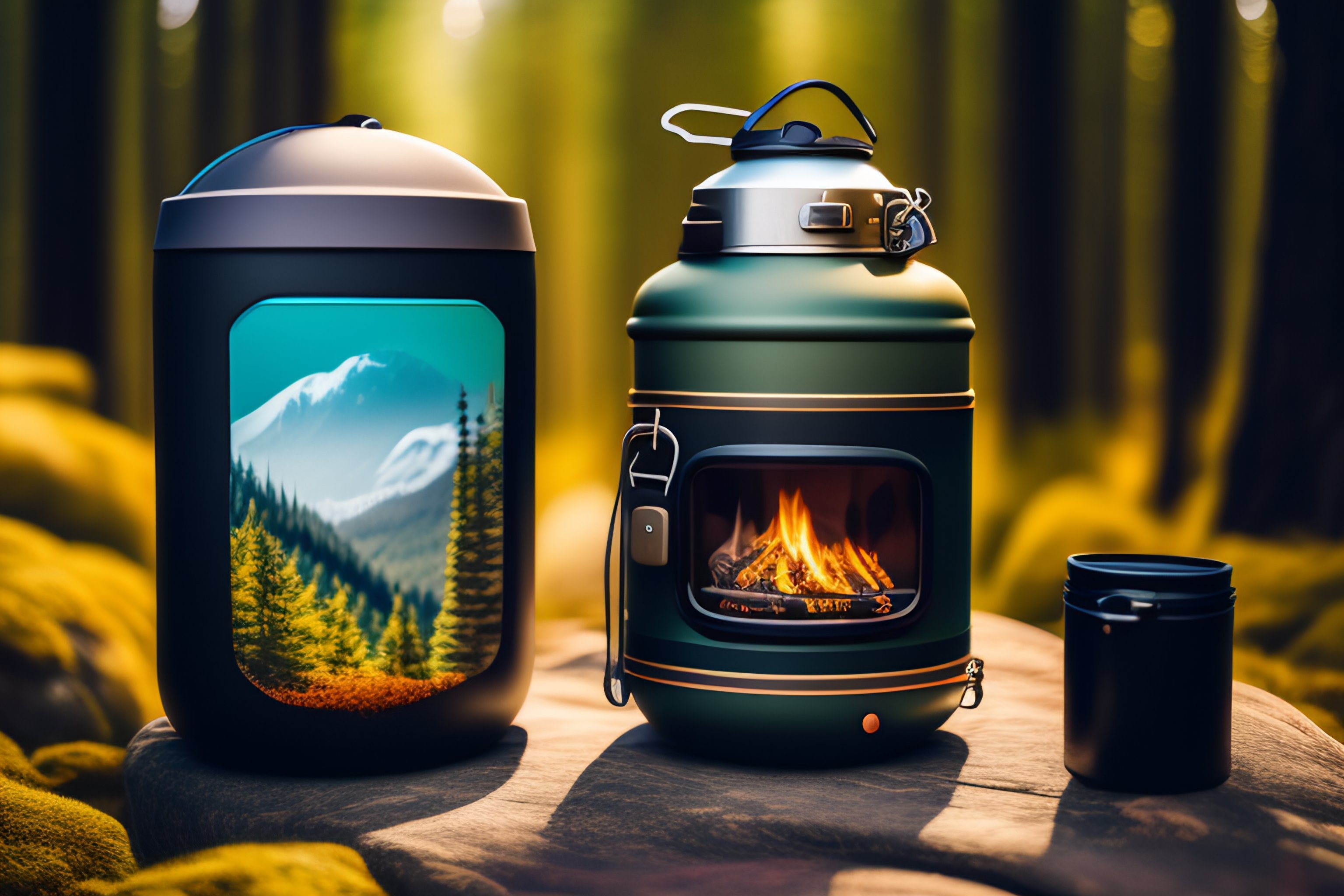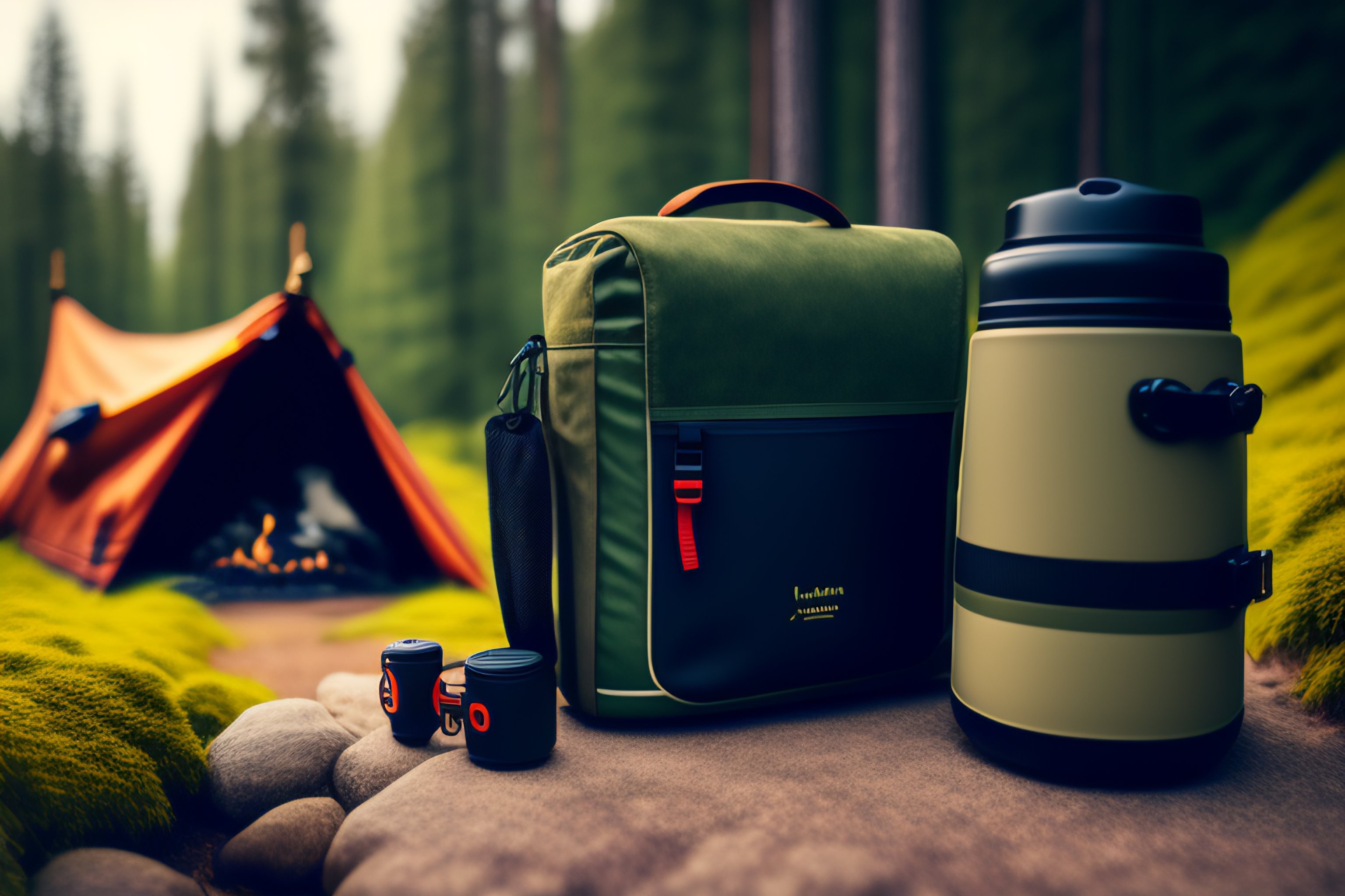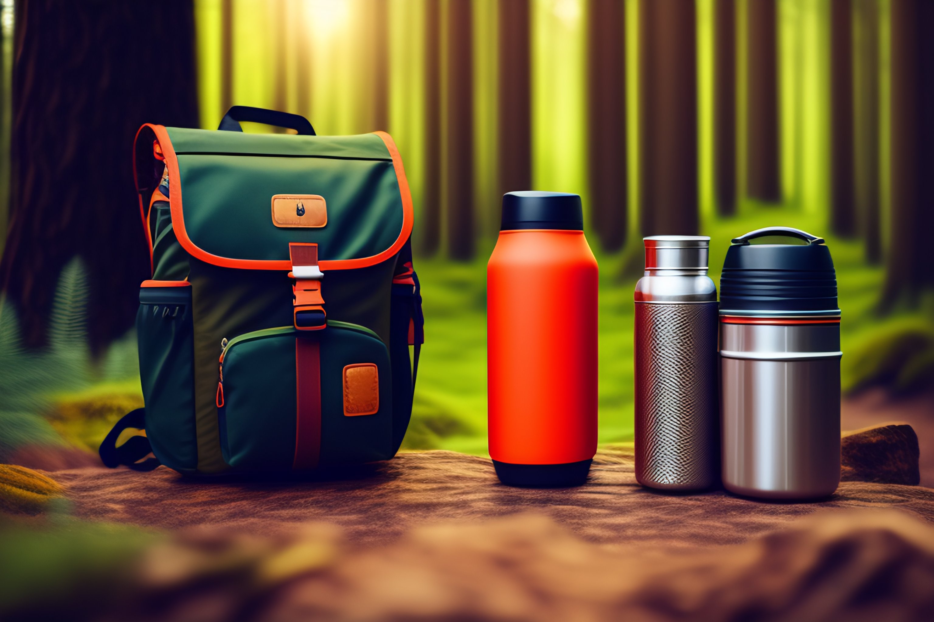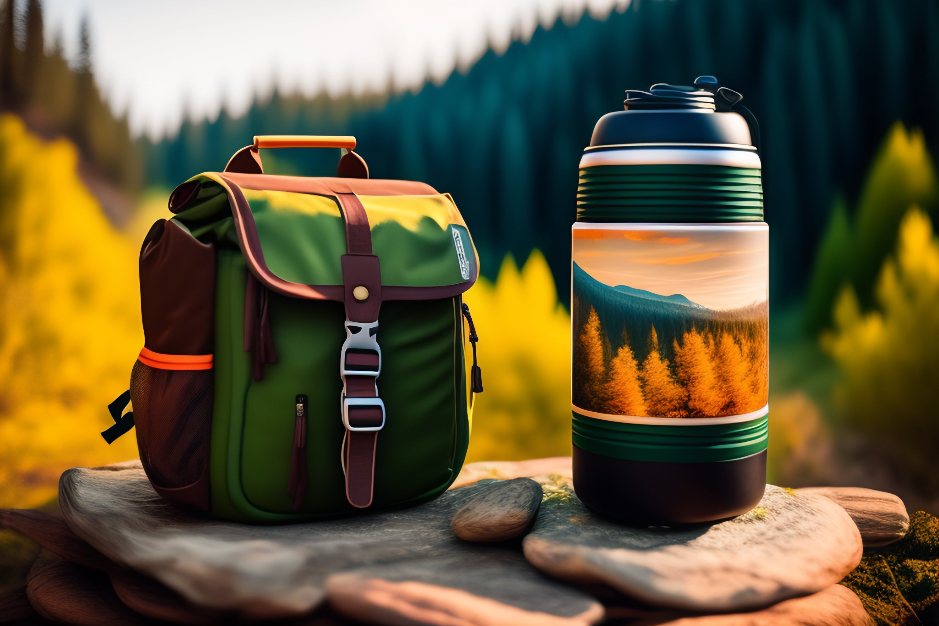 Lifestyle hiking camping equipment retro photo camera backpack and thermos outdoor forest nature on background fireplace cabin