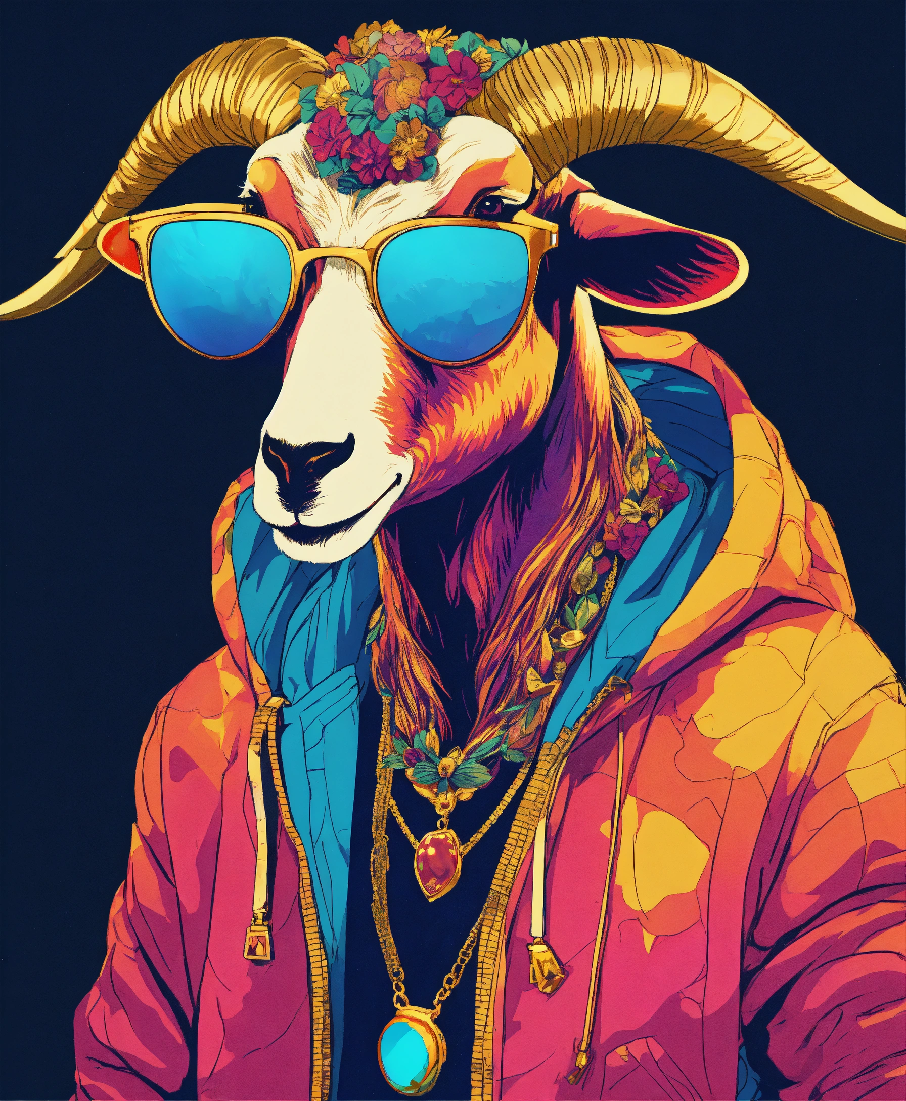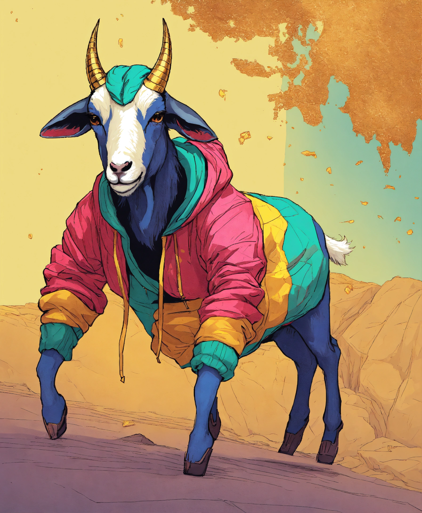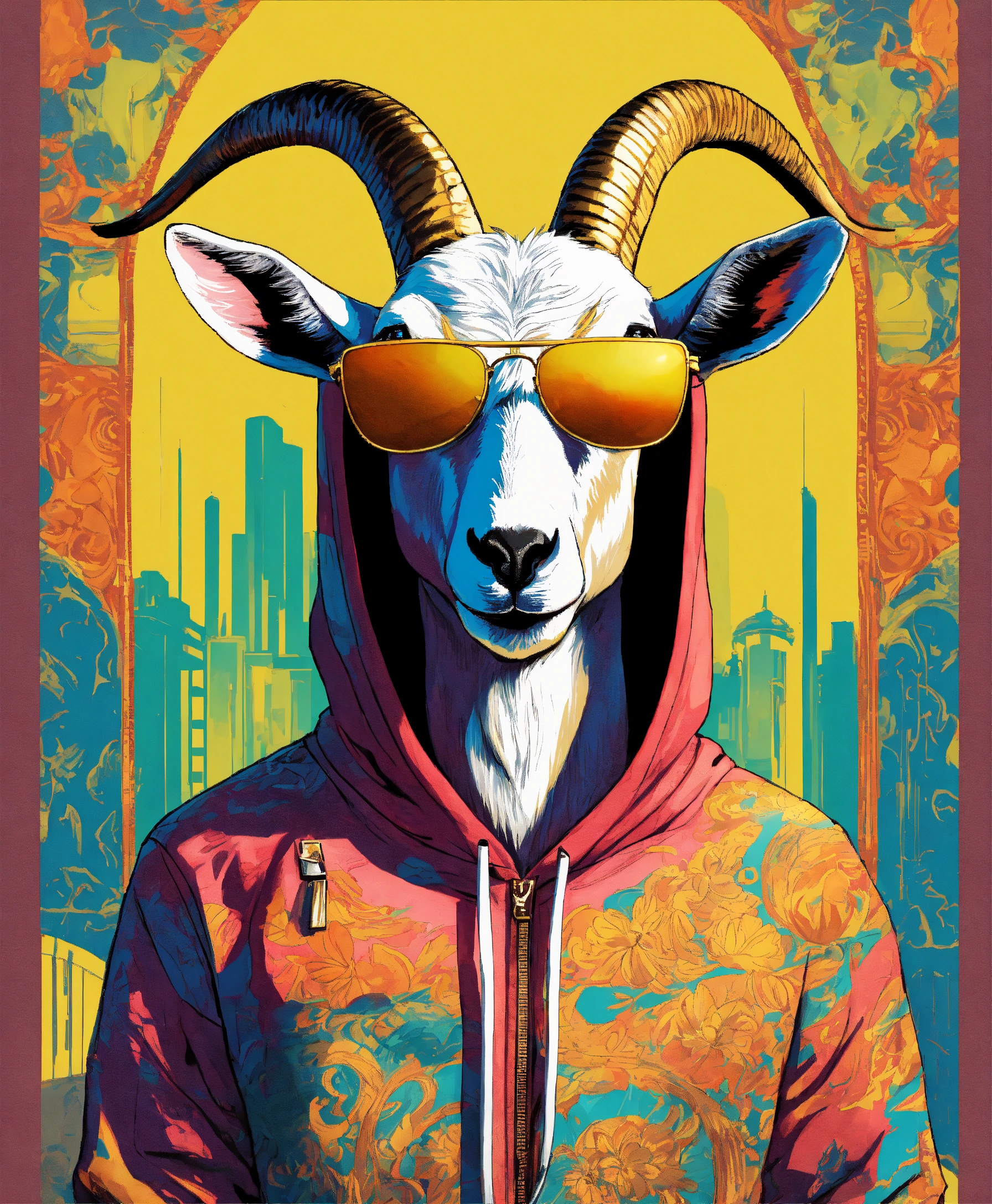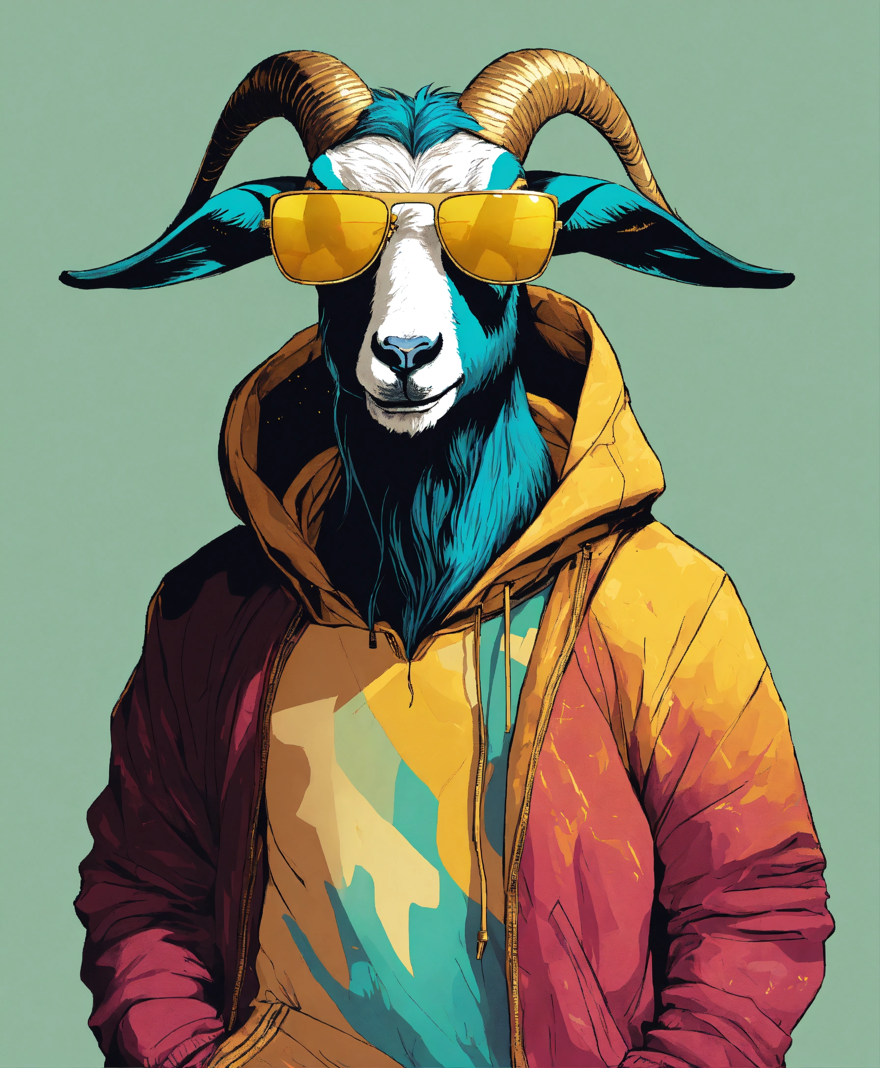 Full body anthropomorphic multicolored goat with gold sunglasses and hoodie graphic novel