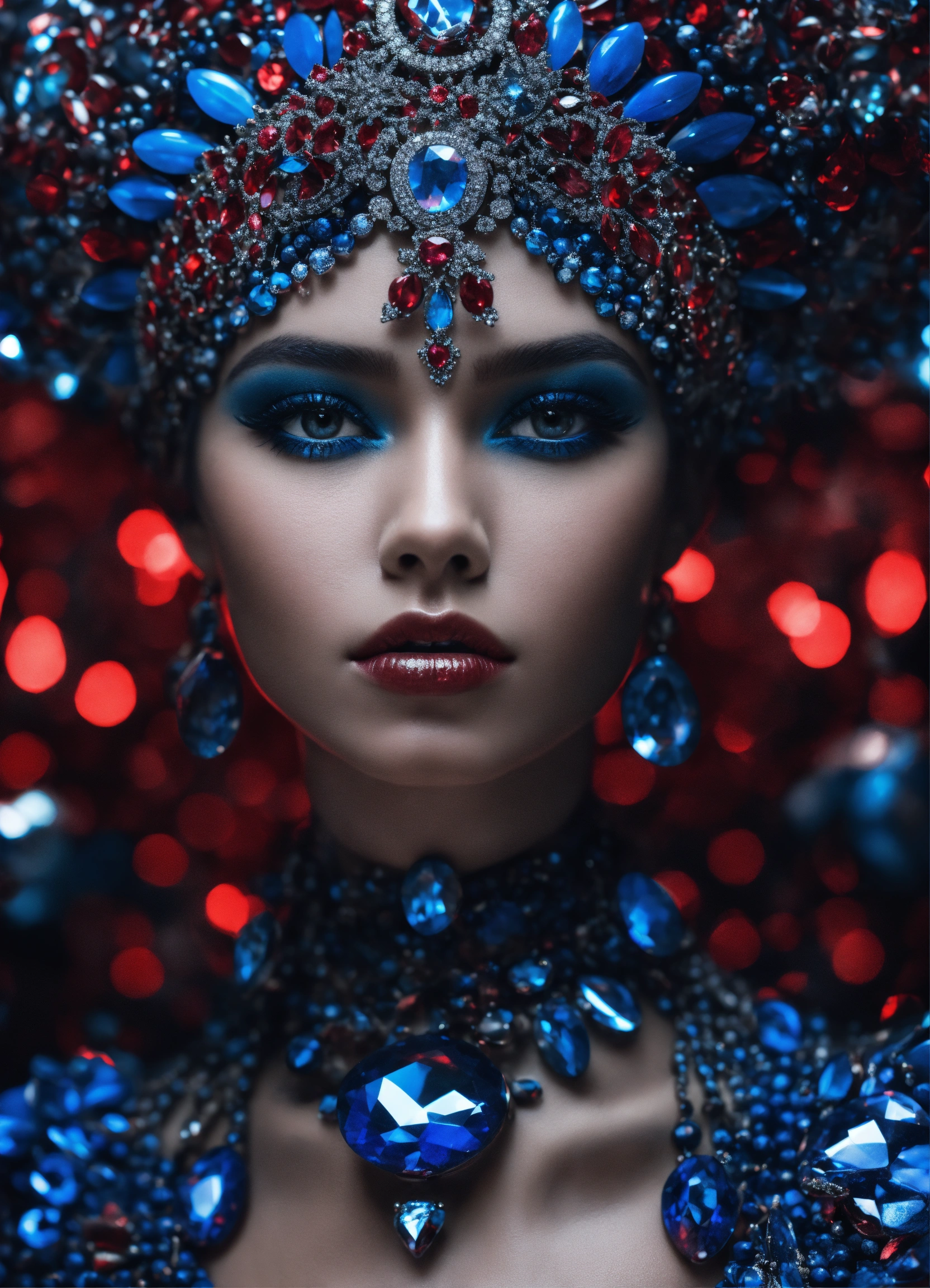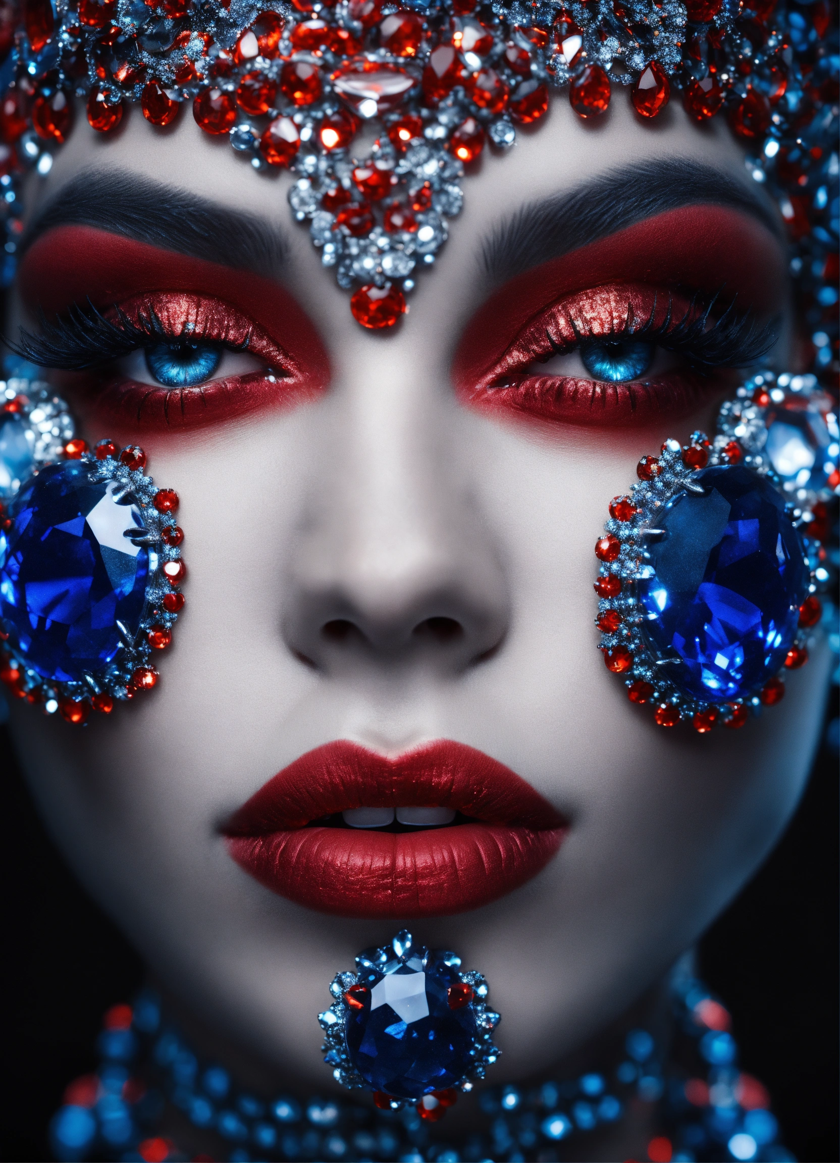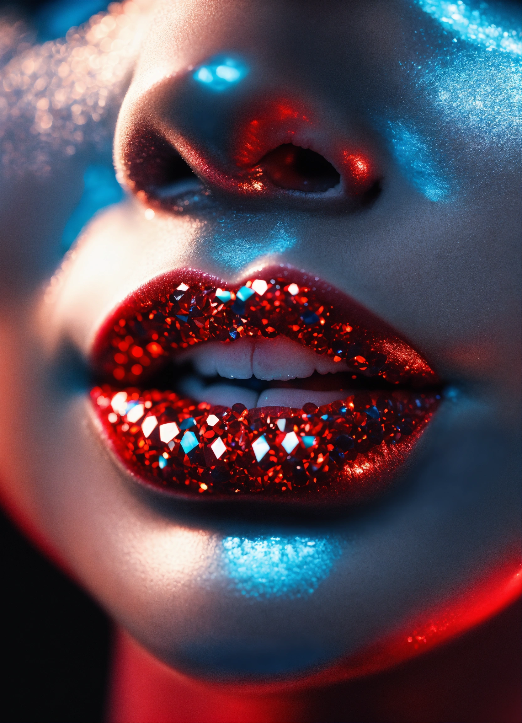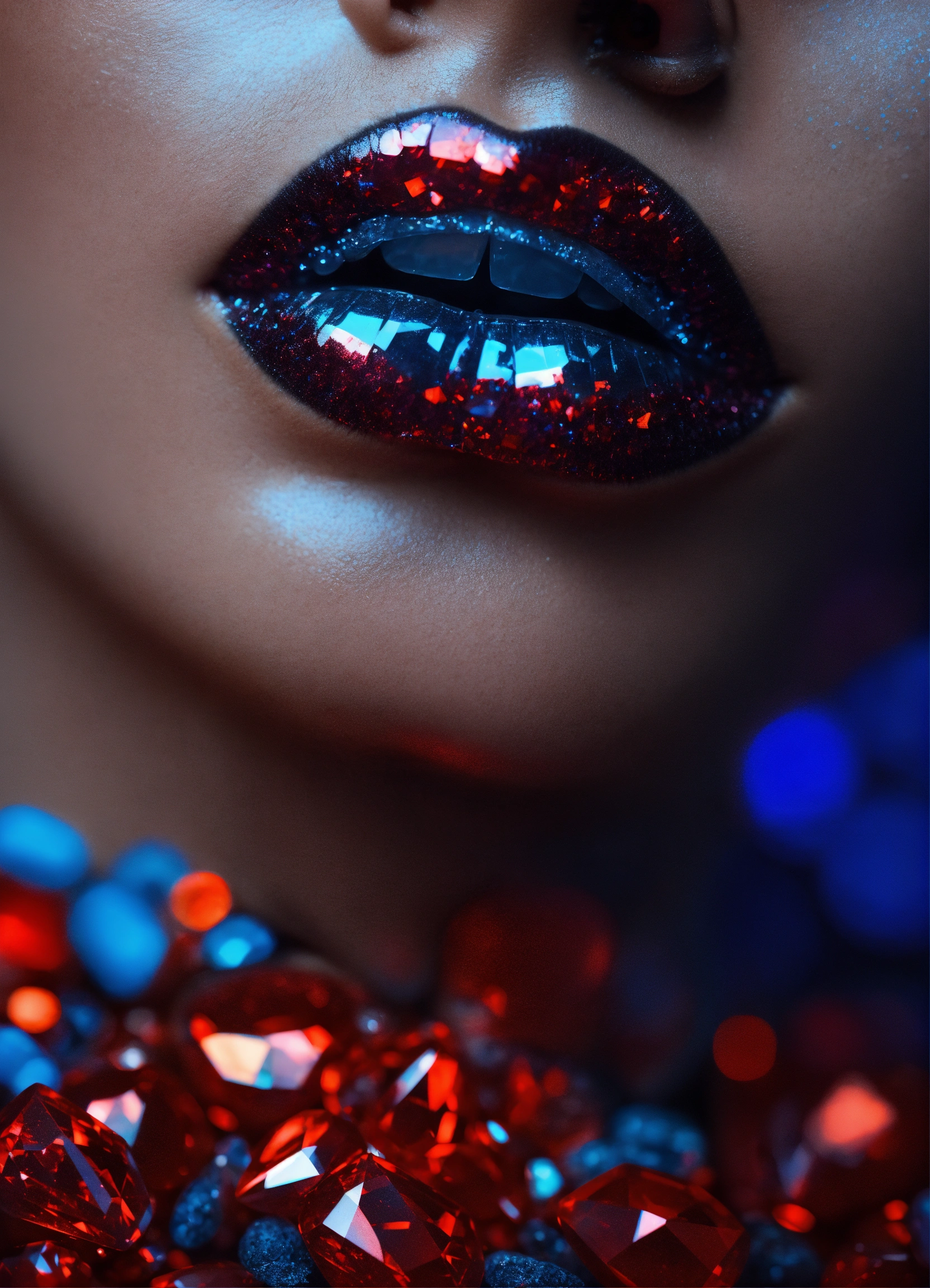 Photorealistic, black and white photography, close up, beauty shot, model face, lips, glowing, glittering, covered with blue and red gemstones, highly detailed, 8k, q2