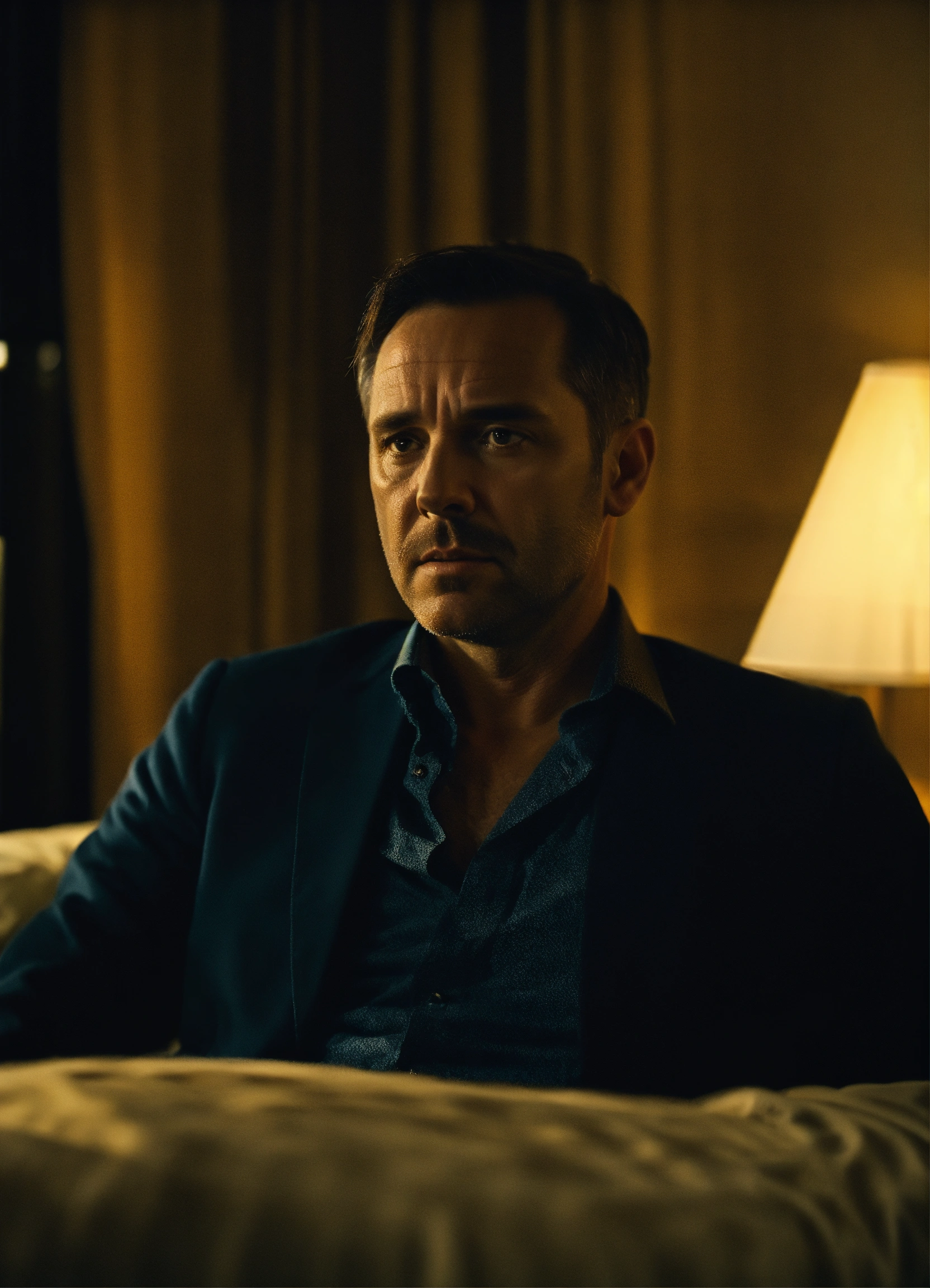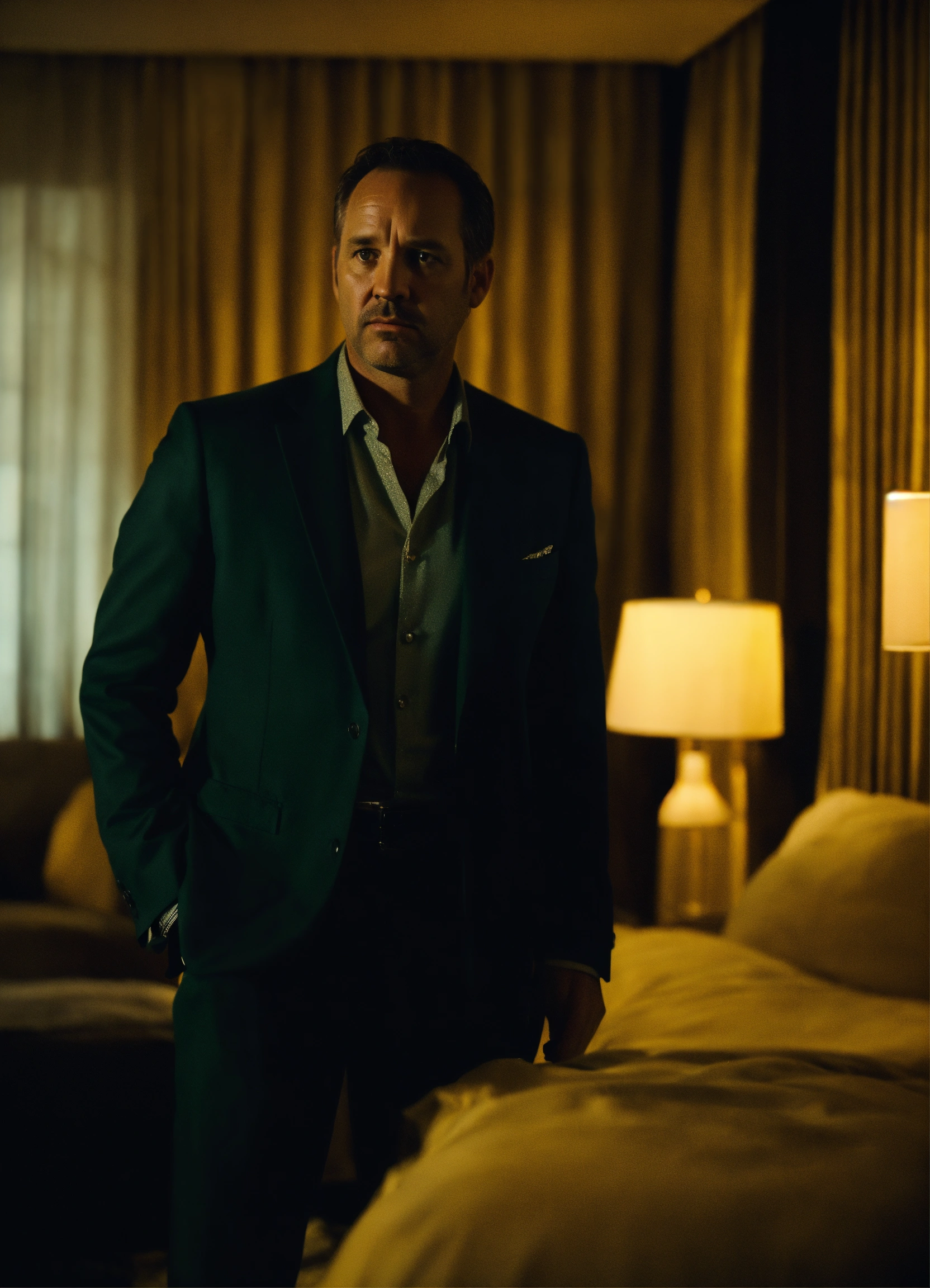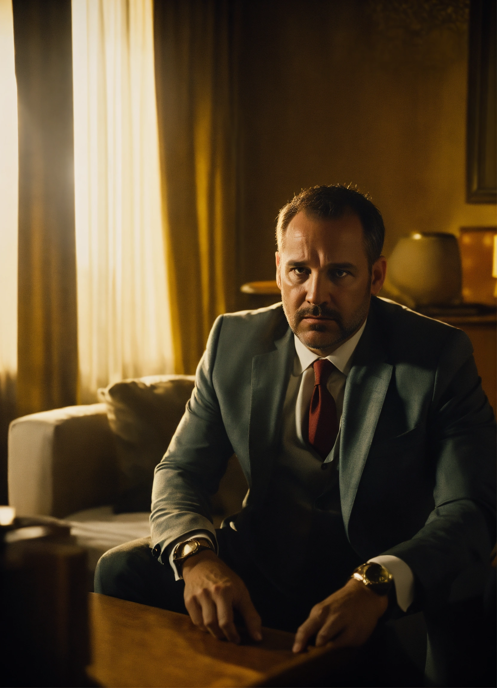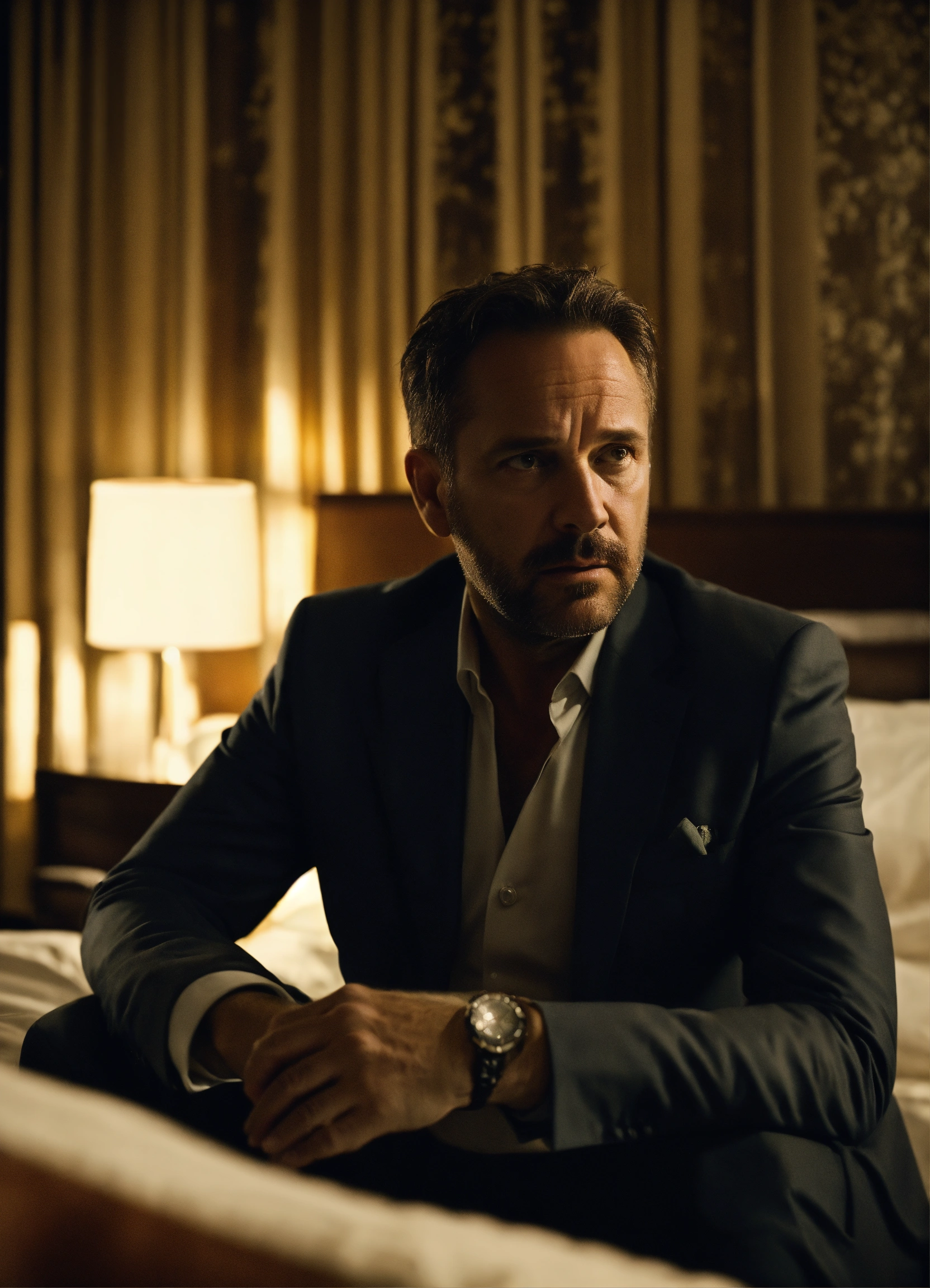Zoom of a cynical, ironic look of a 45-year-old, rich man, hotel room in the background (cinematic, suspense film, diffused light)