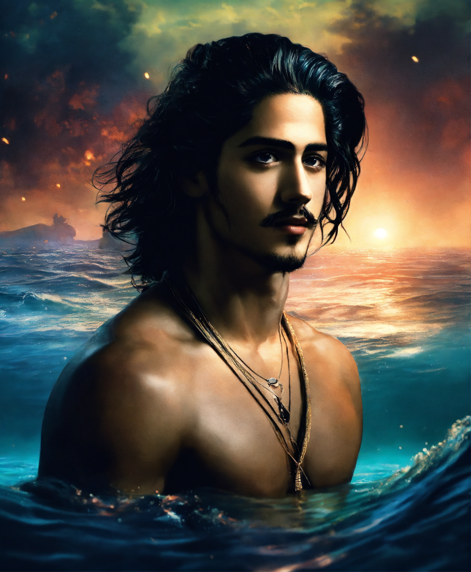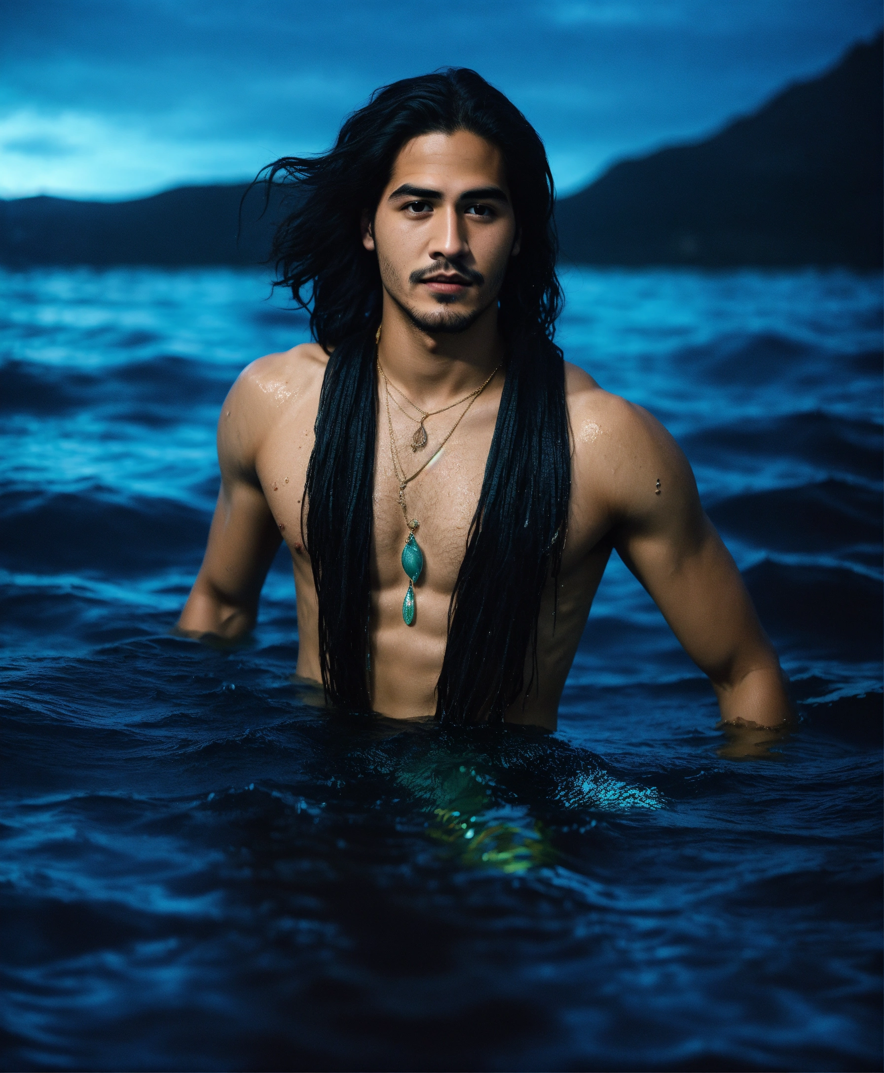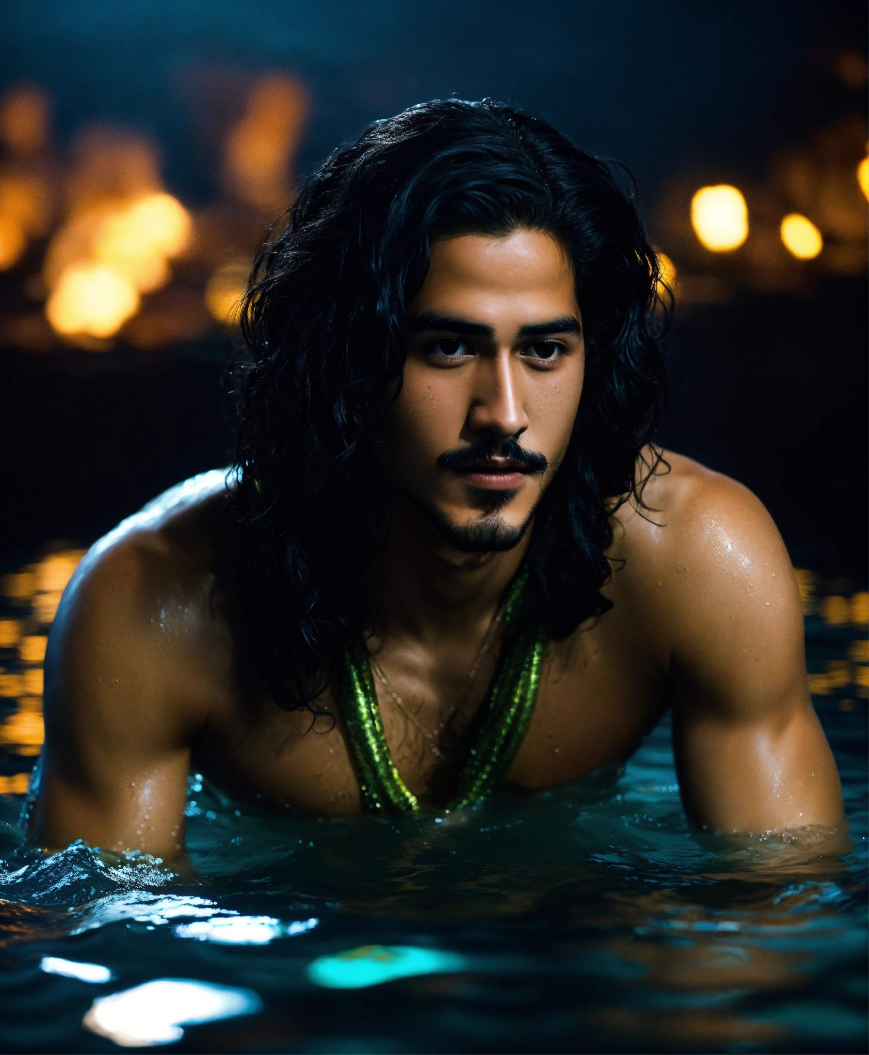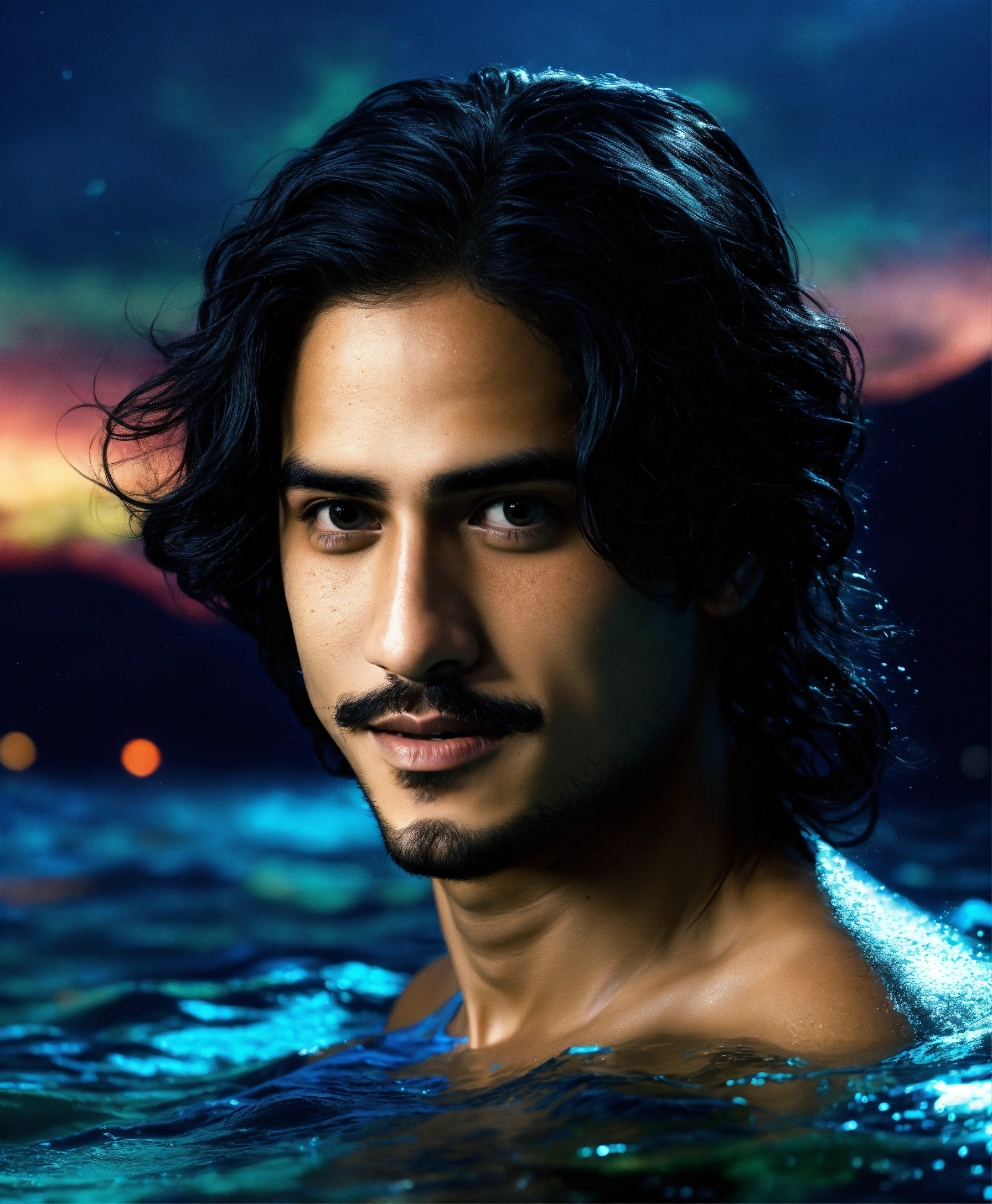20 year old avan jogia as a merman, long ponytail black hair, dark merman tail, swimming in the dark ocean