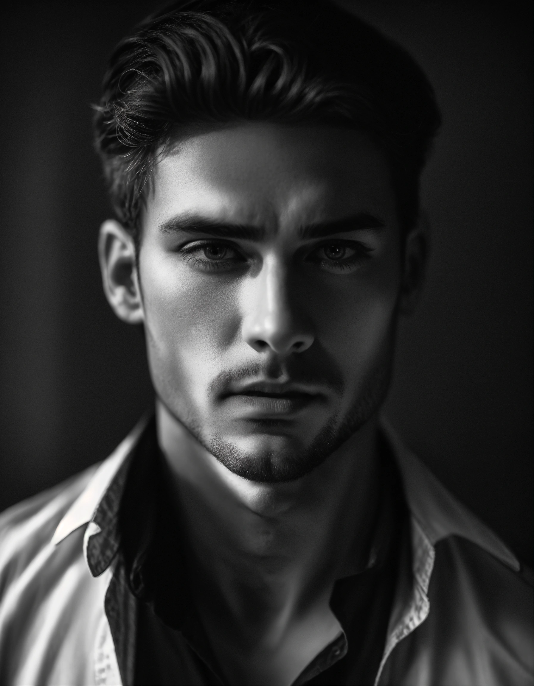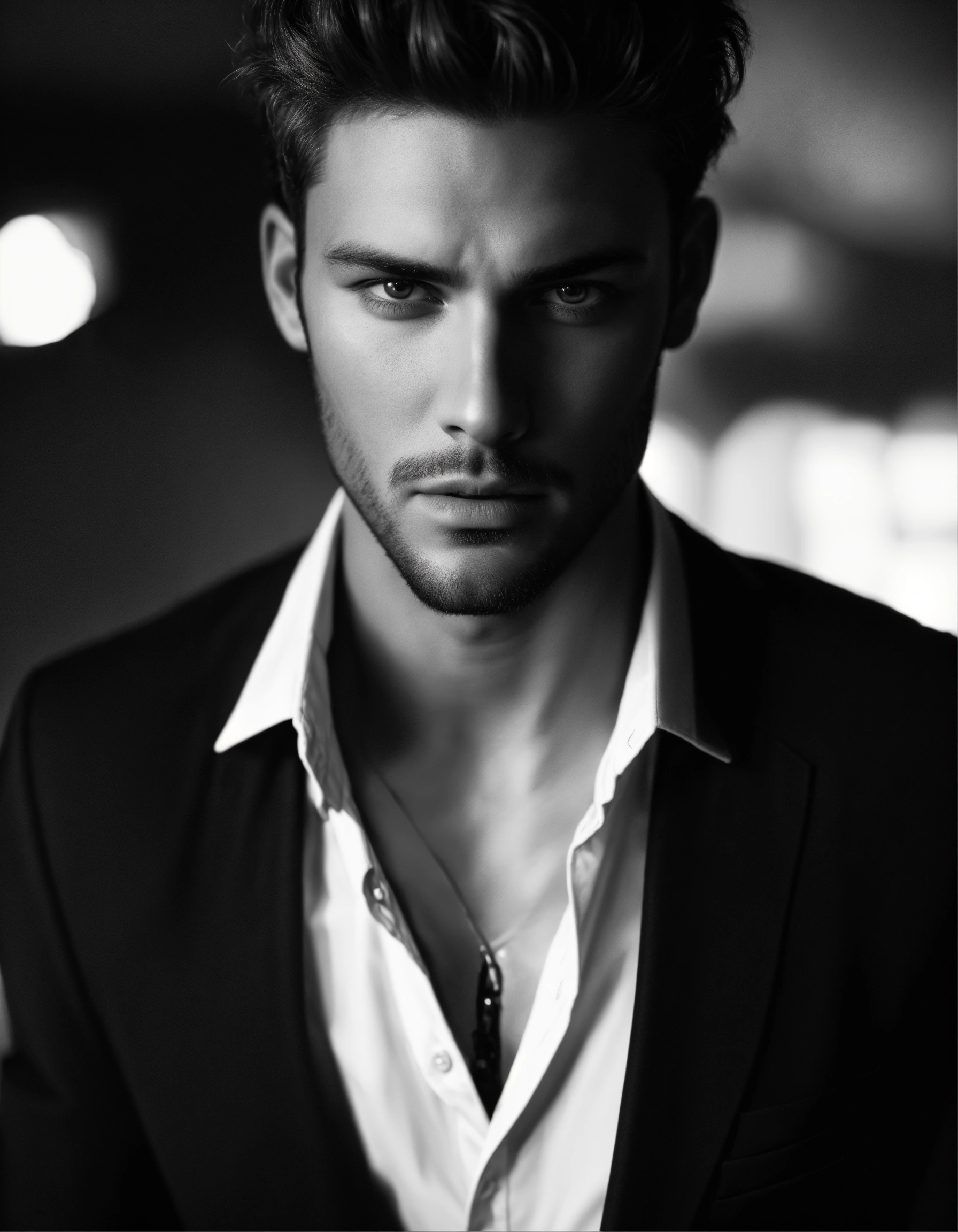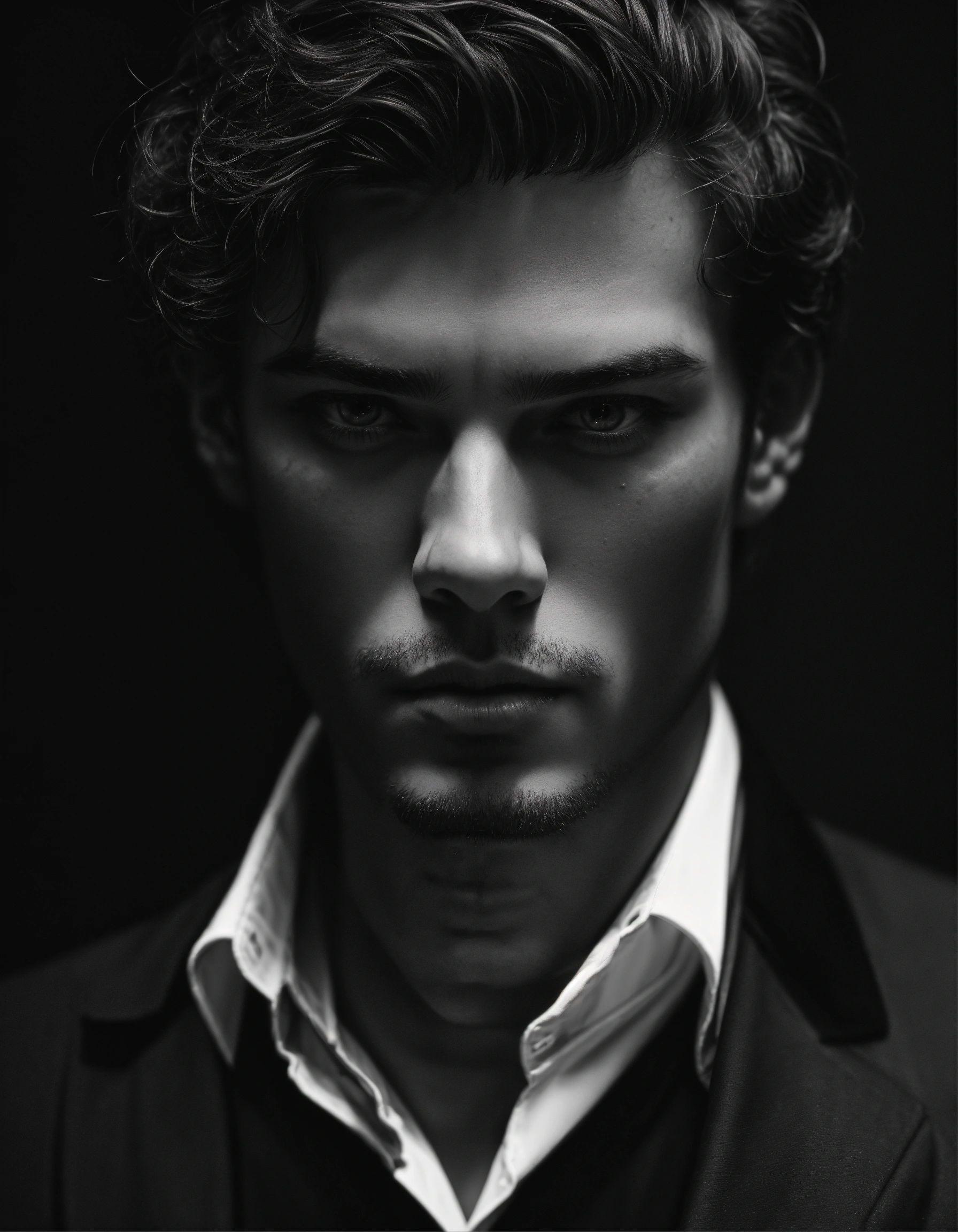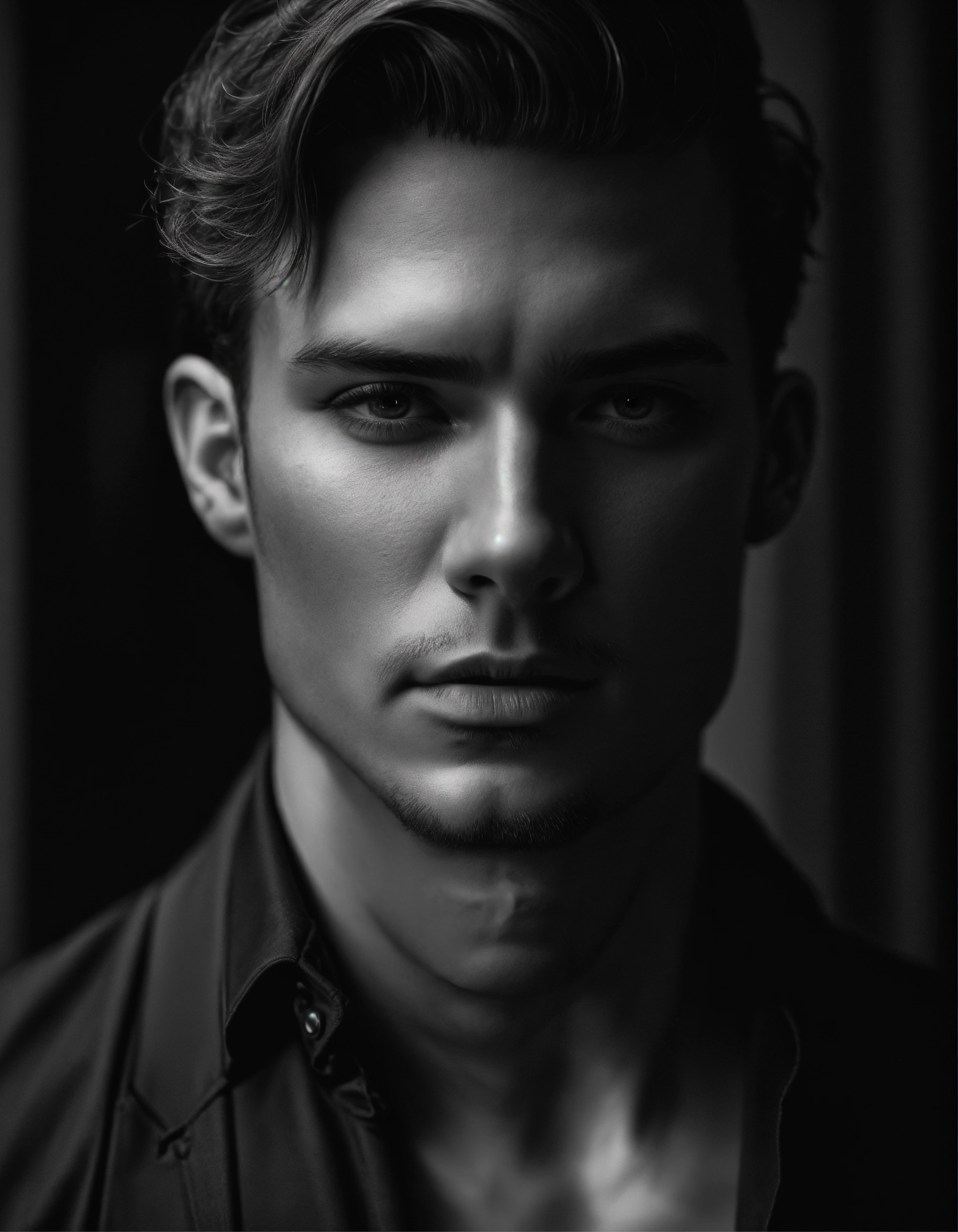 Photo of male model, black and white, realistic, portrait, not painted, very detailed faces, skin with pores, 4k, dark suit, black plain background, skin not smoothed, face from left to right, desire in the eyes, half profile, glowering, looking into the camera, dark shirt.