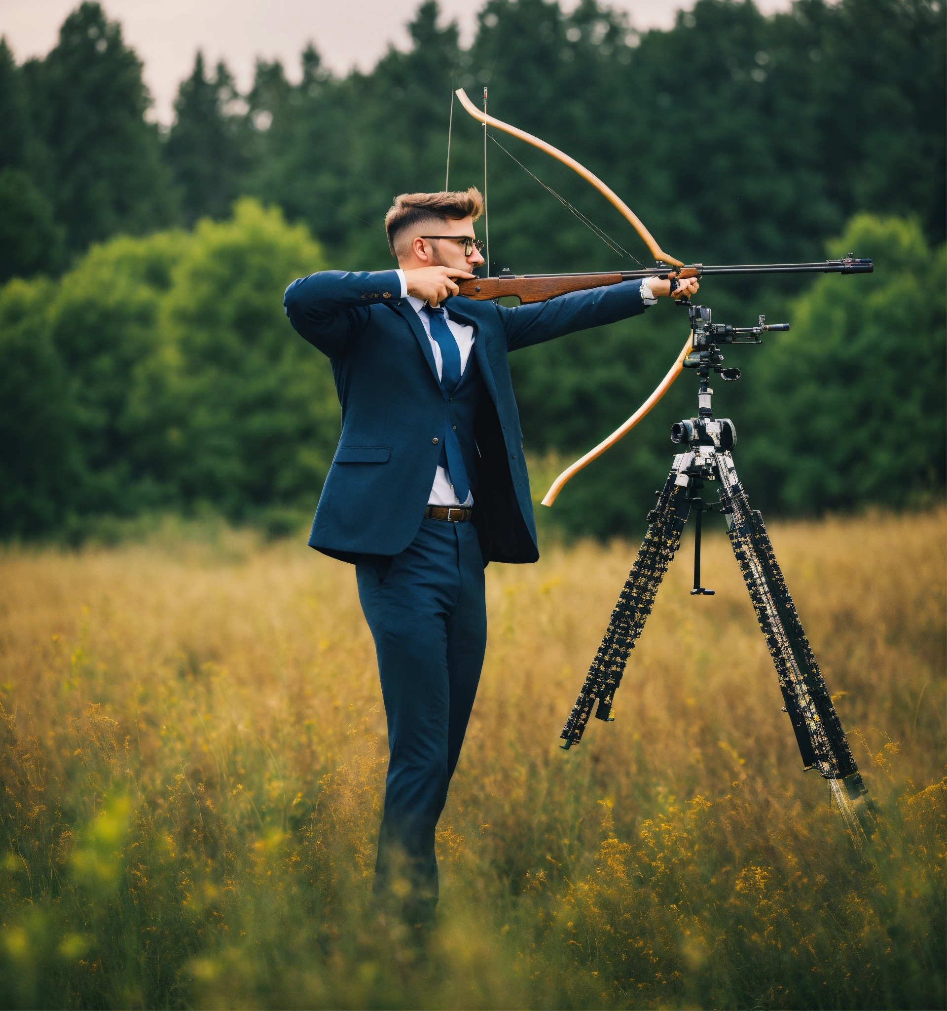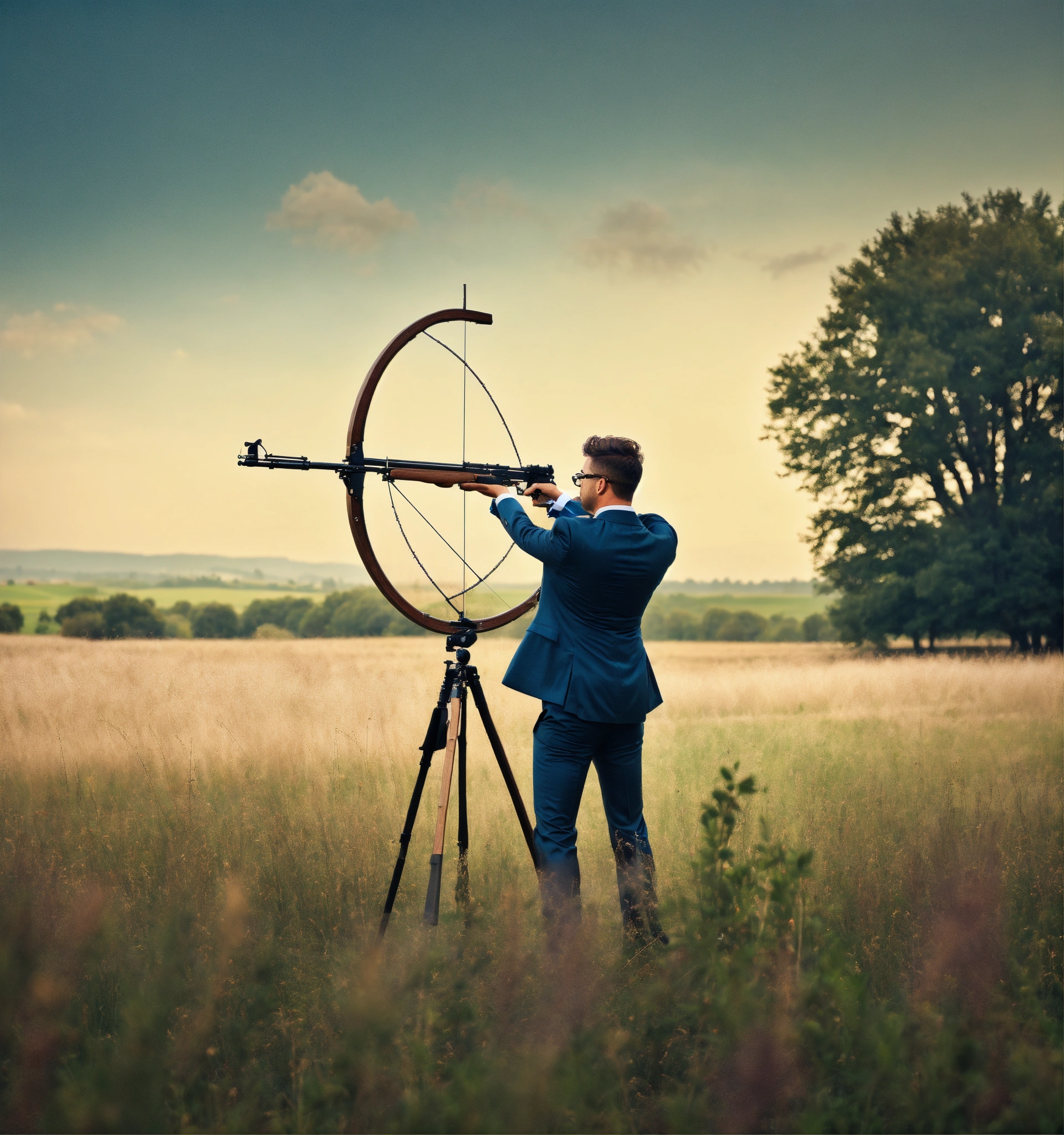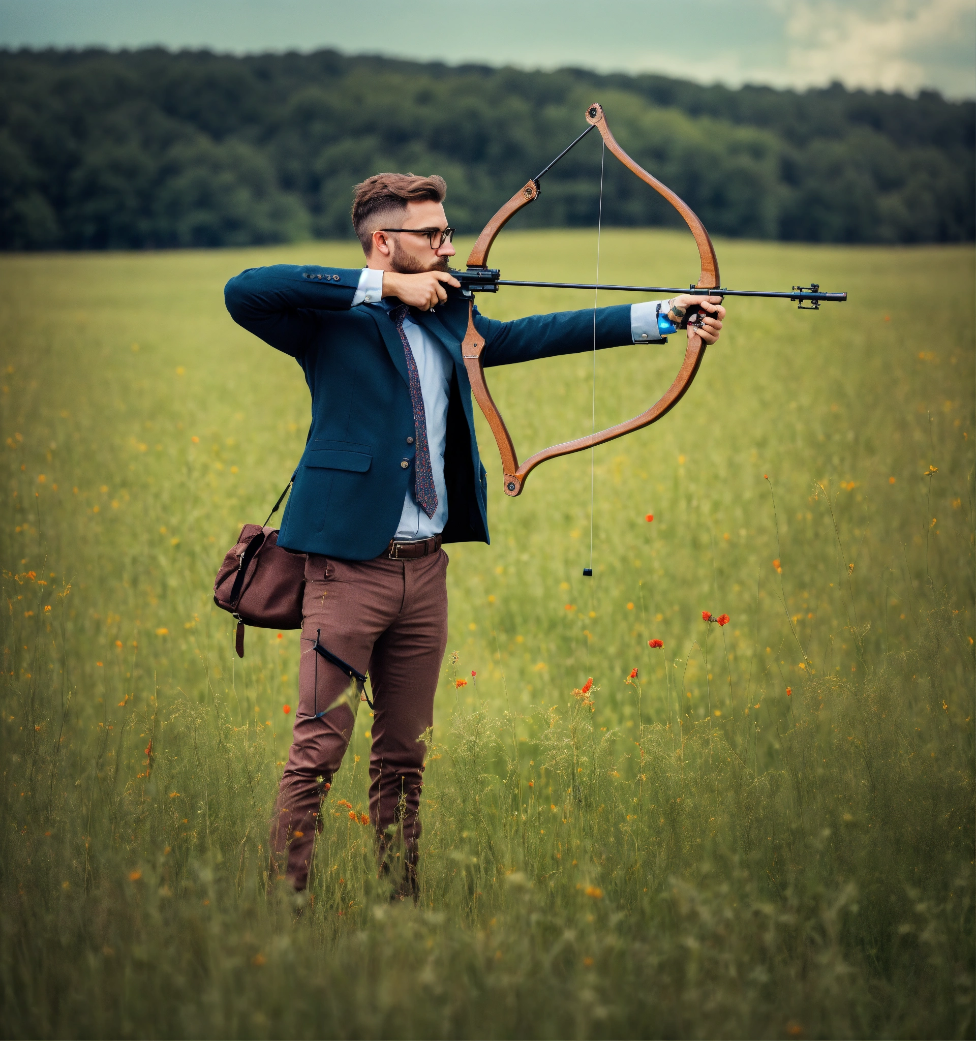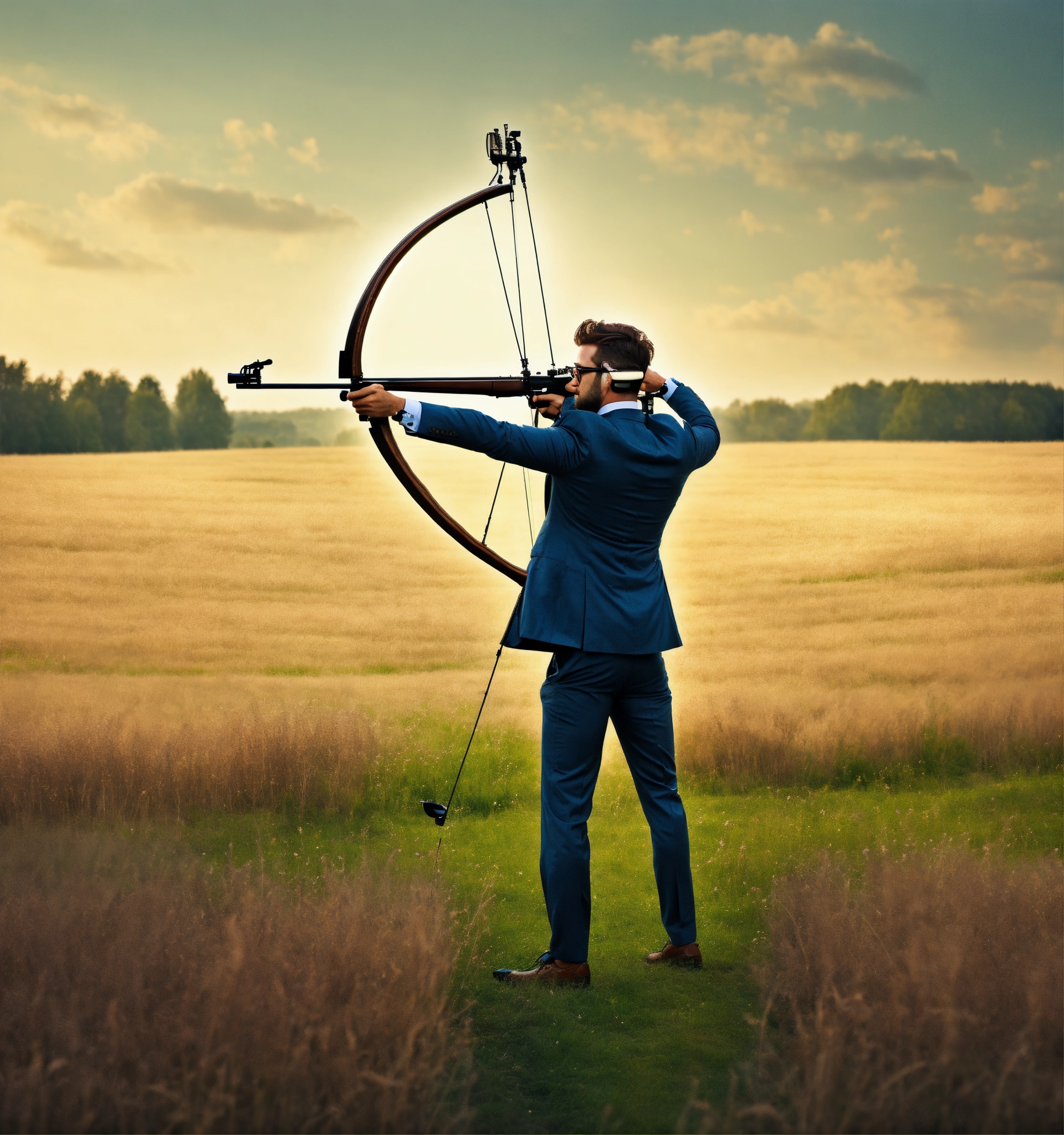 A hipster businessman standing in a field with bow aiming to a target