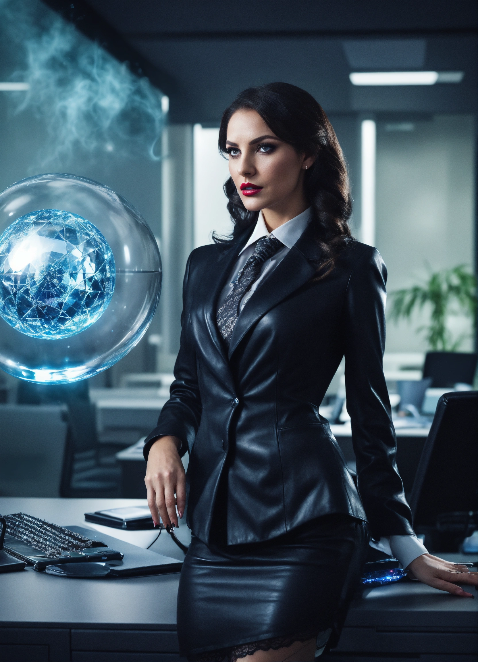 Beautiful gorgeous evil woman, powerful sinister office boss in black leather & lace & entrancing high heeled boots, evil diabolical casting a bewitching amulet with her eyes at work in the corporate office, becoming mindless with her mind numbing words, you feel her power she exerts on your thoughts & mind, the most powerful secretary in the corporate office, all obey her deeply hypnotizing suggestions helpless under her extremely powerful spell, corporate office takeover is inevitable if you look into her mind controlling eyes & full shimmering lips, she rules over everyone effortlessly with a snap of her manicured fingers & the words sleep deep weak magic controlled office puppet, smoke-filled crystal ball in the background, listen & obey every word she utters, trapped in her powerful magical mind control with no escape you can't look away, frozen in place, most powerful woman in the corporation.