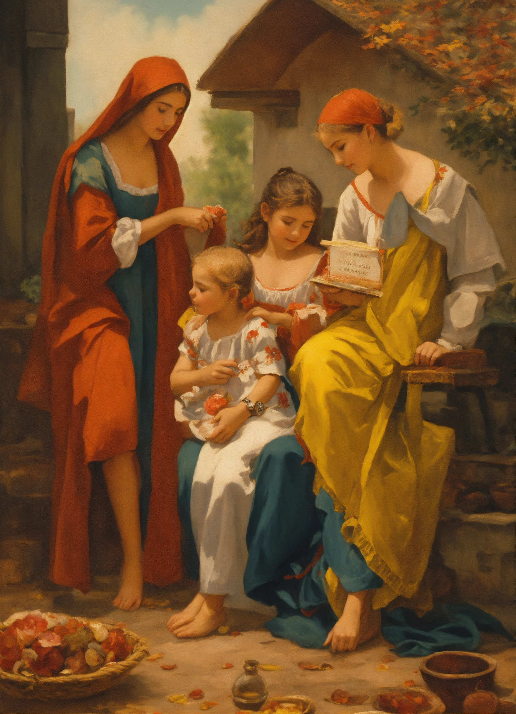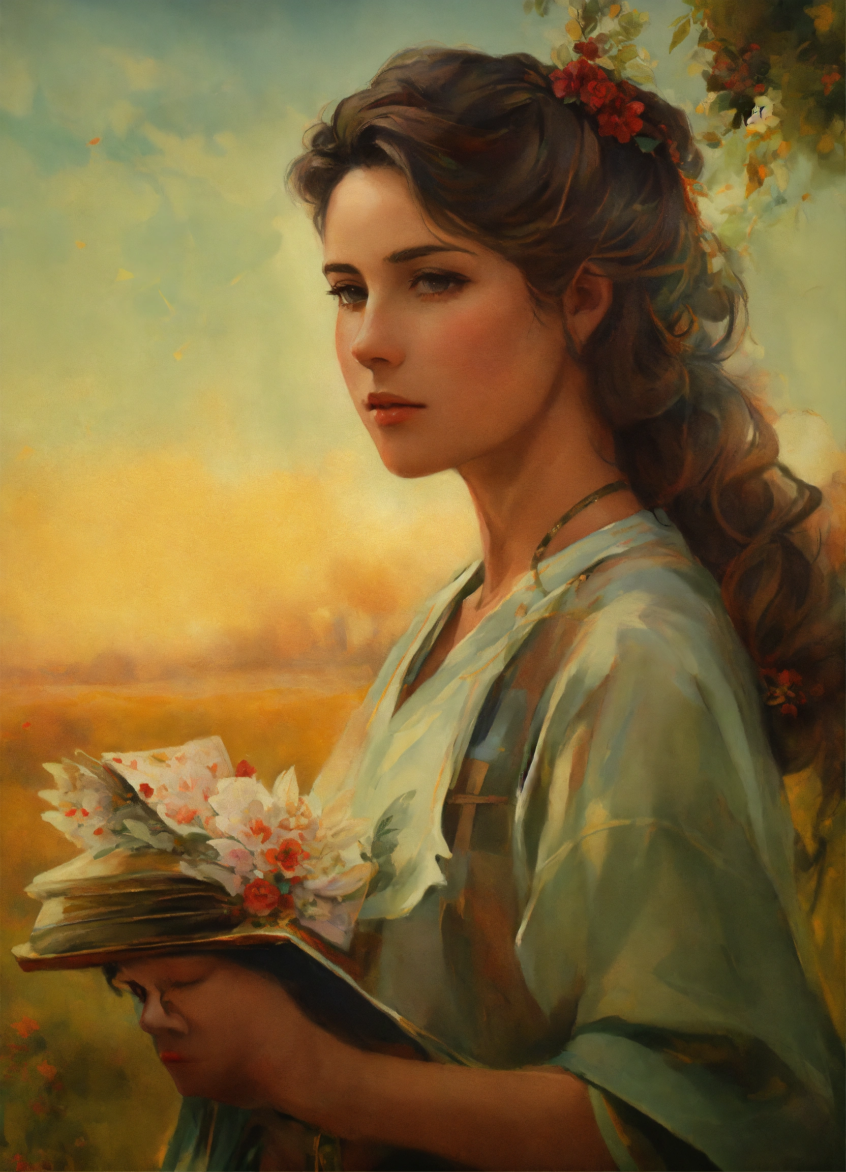 Un retrato cálido y conmovedor que represente a una mujer fuerte, cariñosa y joven, con rasgos de una doctora dedicada y una madre amorosa de una nina rubia pequena. puede ser un retrato en medio de una consulta médica, con un estetoscopio alrededor de su cuello, pero con una mirada suave y amable. a su lado, sutiles representaciones del paso del tiempo, como arena cayendo de un reloj de arena o hojas de calendario flotando. a su alrededor, la silueta de una familia, representando su papel de pilar en el hogar. los colores deben ser cálidos, transmitiendo amor, admiración y gratitud.