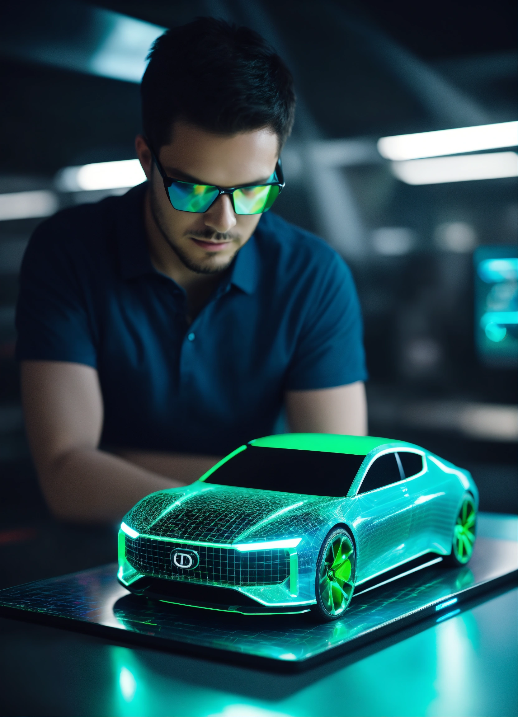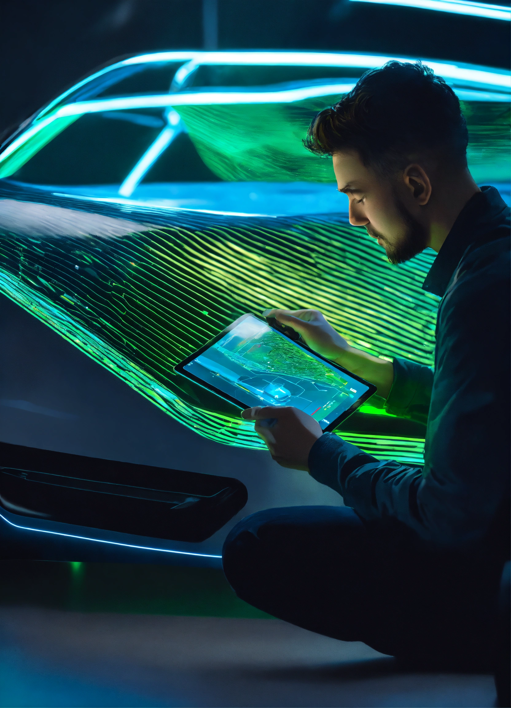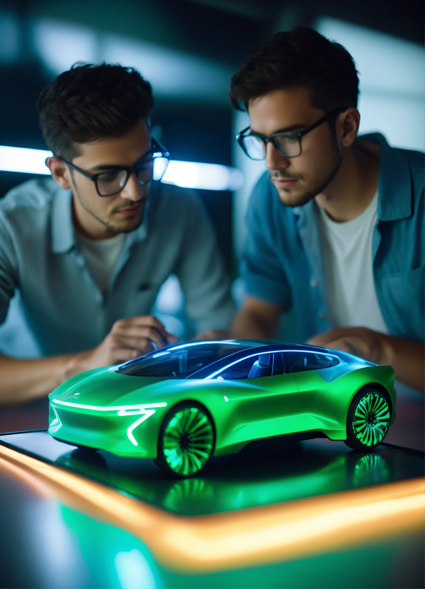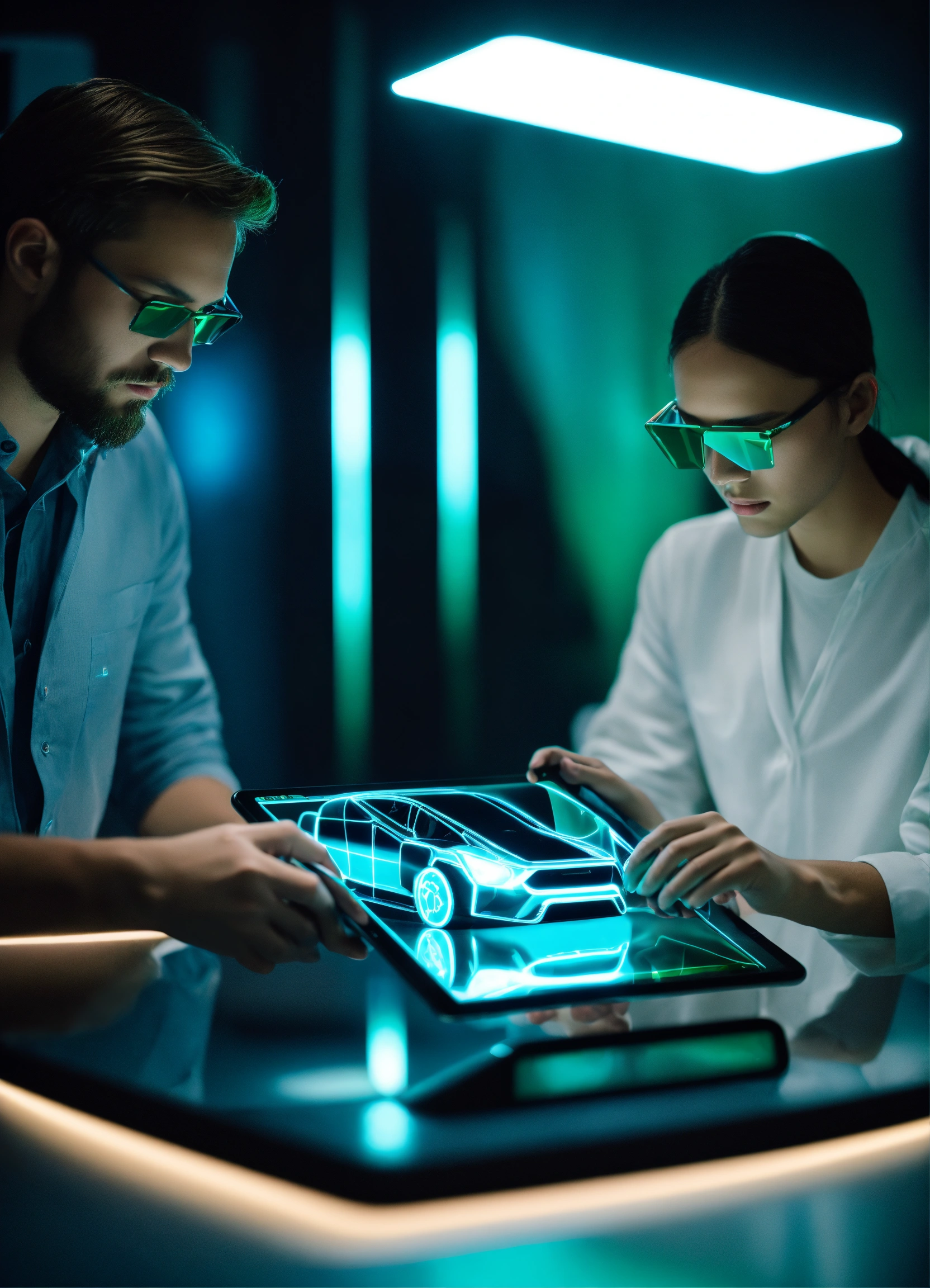 Car design engineers using holographic application on digital tablet. develop a modern and innovative high-tech ecological electric car with sustainable standards. they test the aerodynamic qualities. color green, blue, minimal. hiper realistic fashion technology. 35mm. award winning photography.
