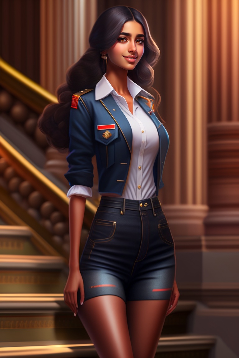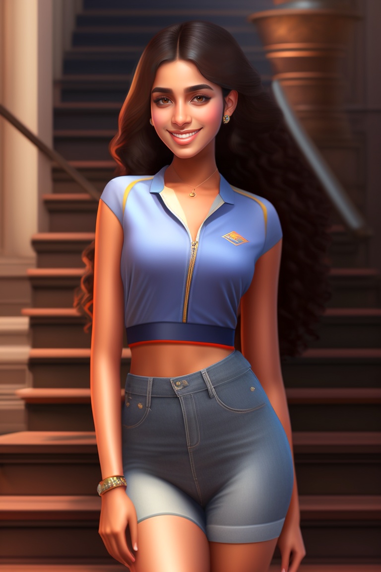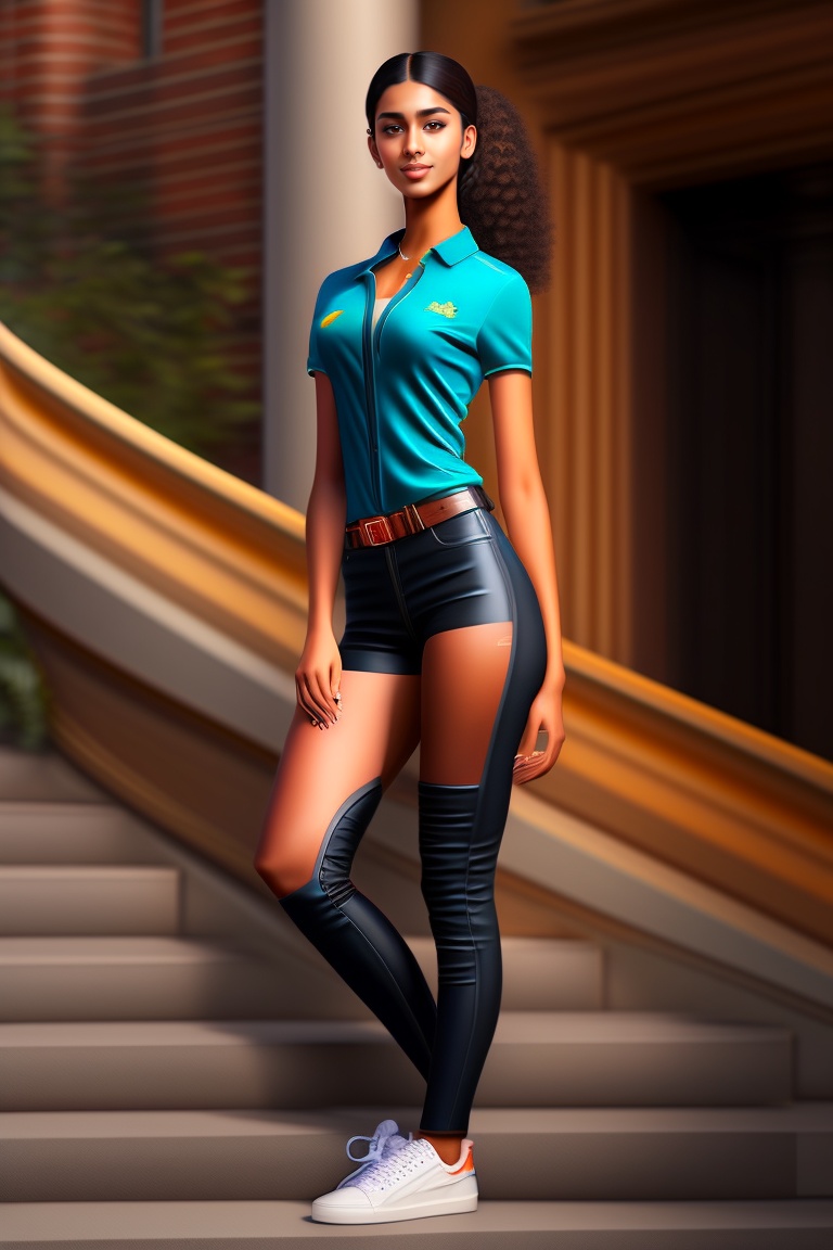 Hyper realistic, college girl, cute face, tall, skinny, indian, confident, standing on stairs with hands on her hips
