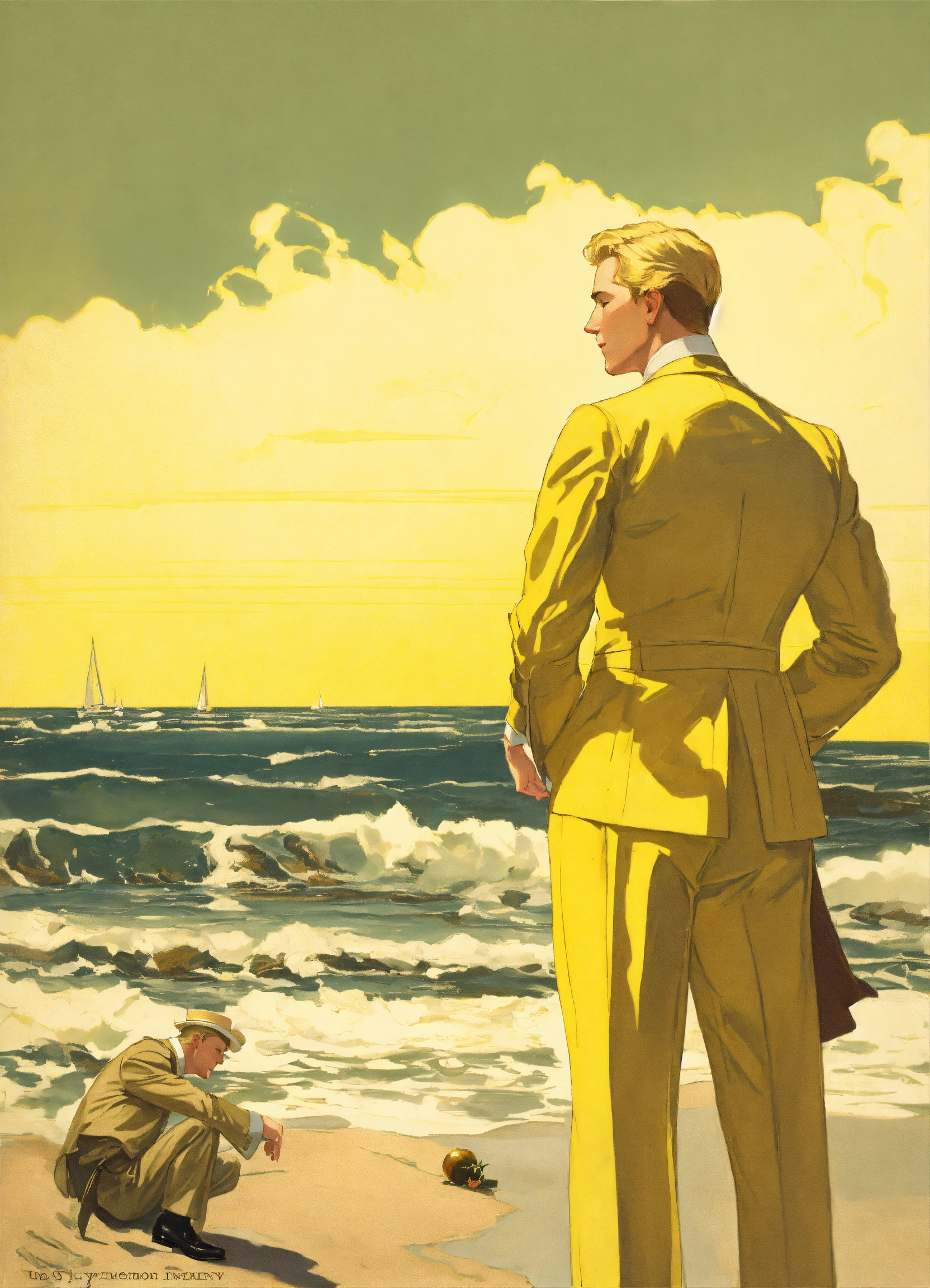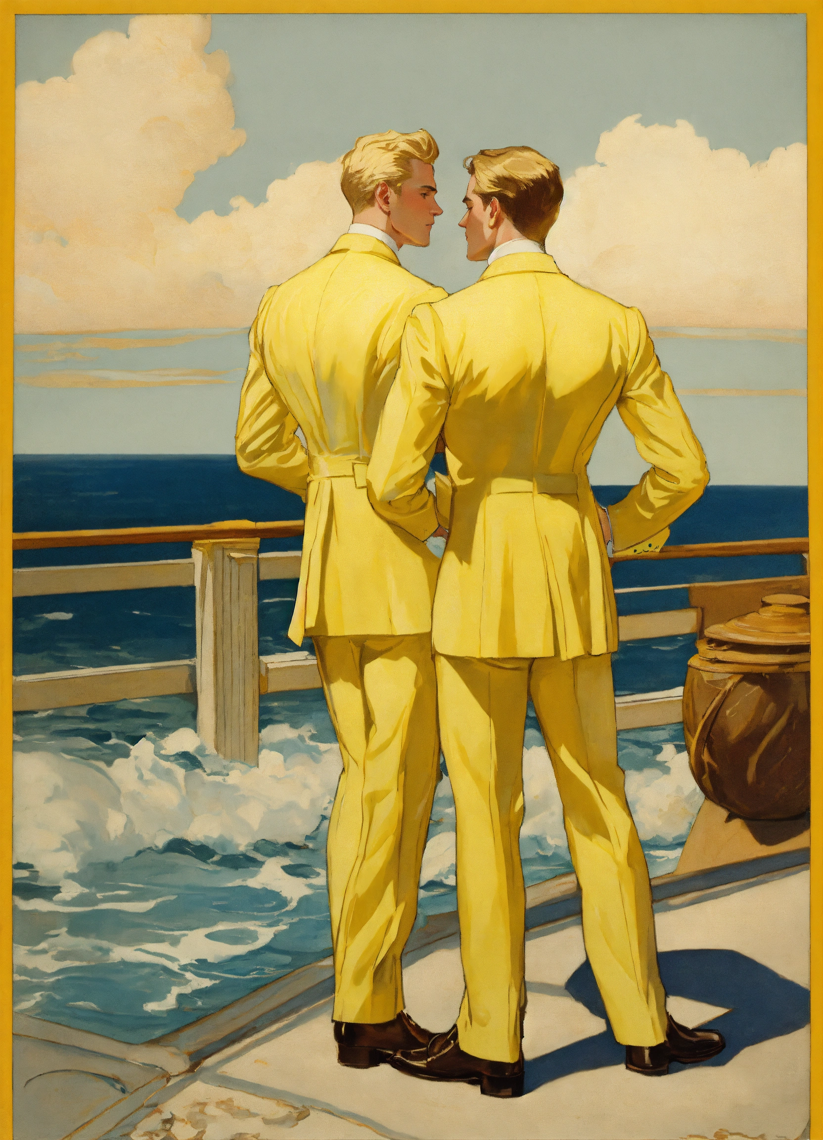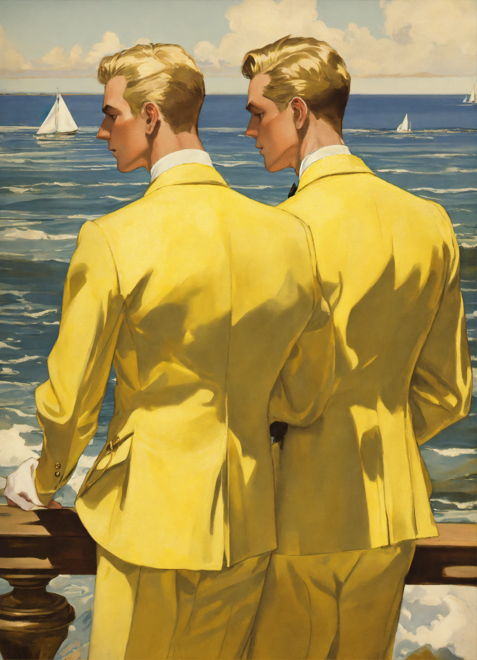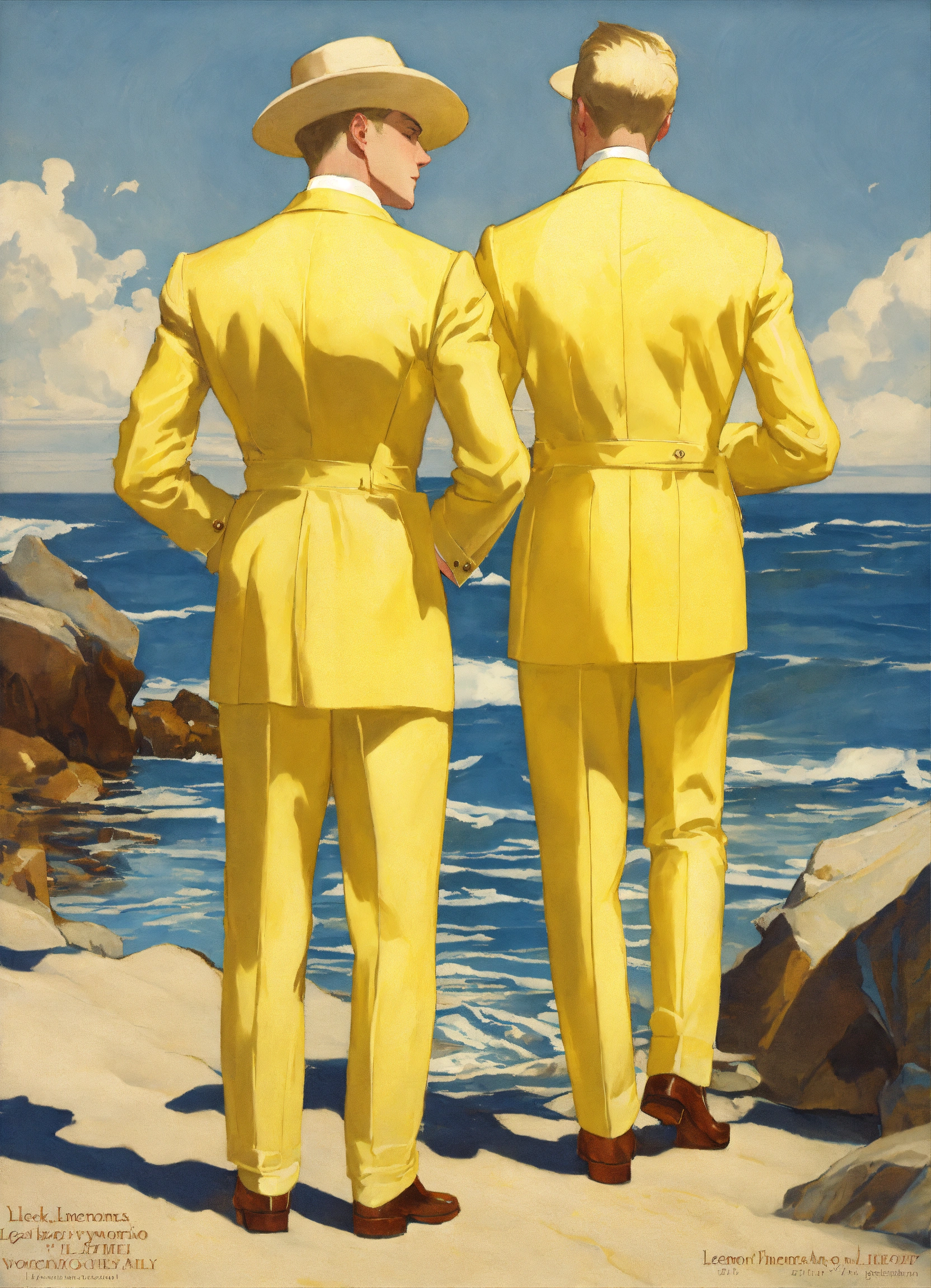 Back side two blonde gentlemen in lemon suit standing by the sea