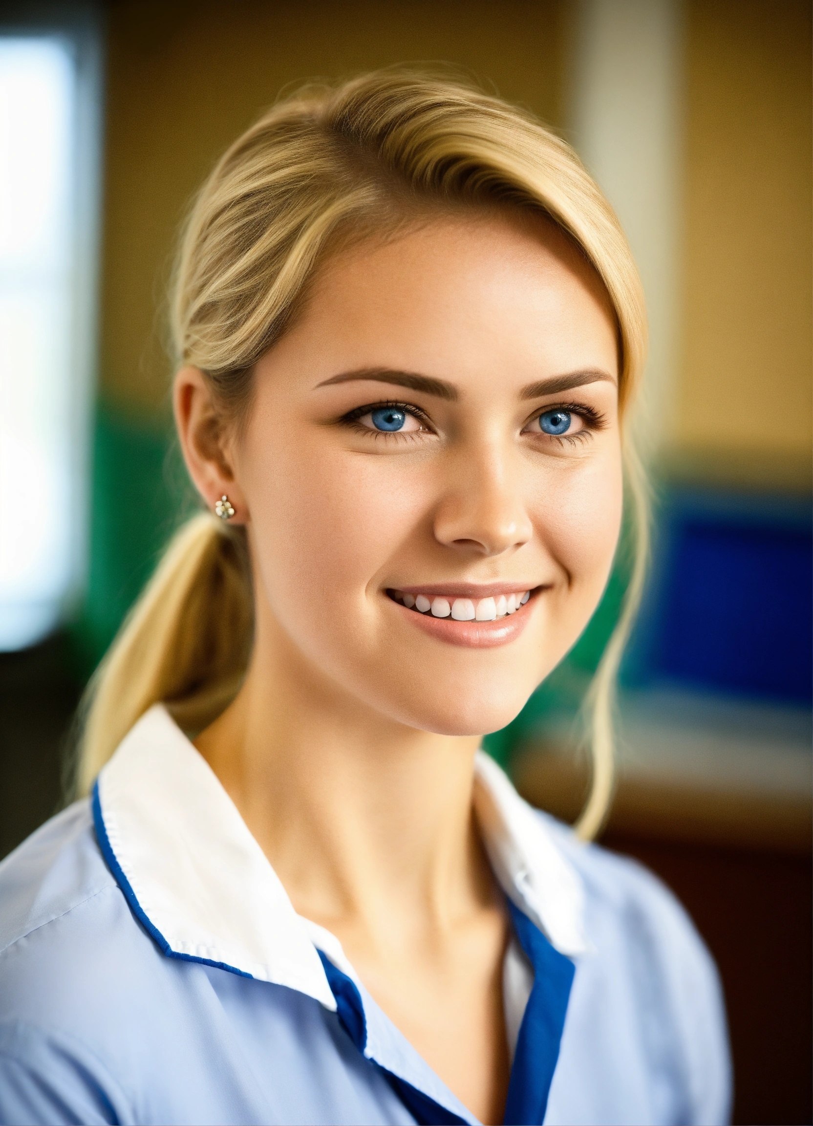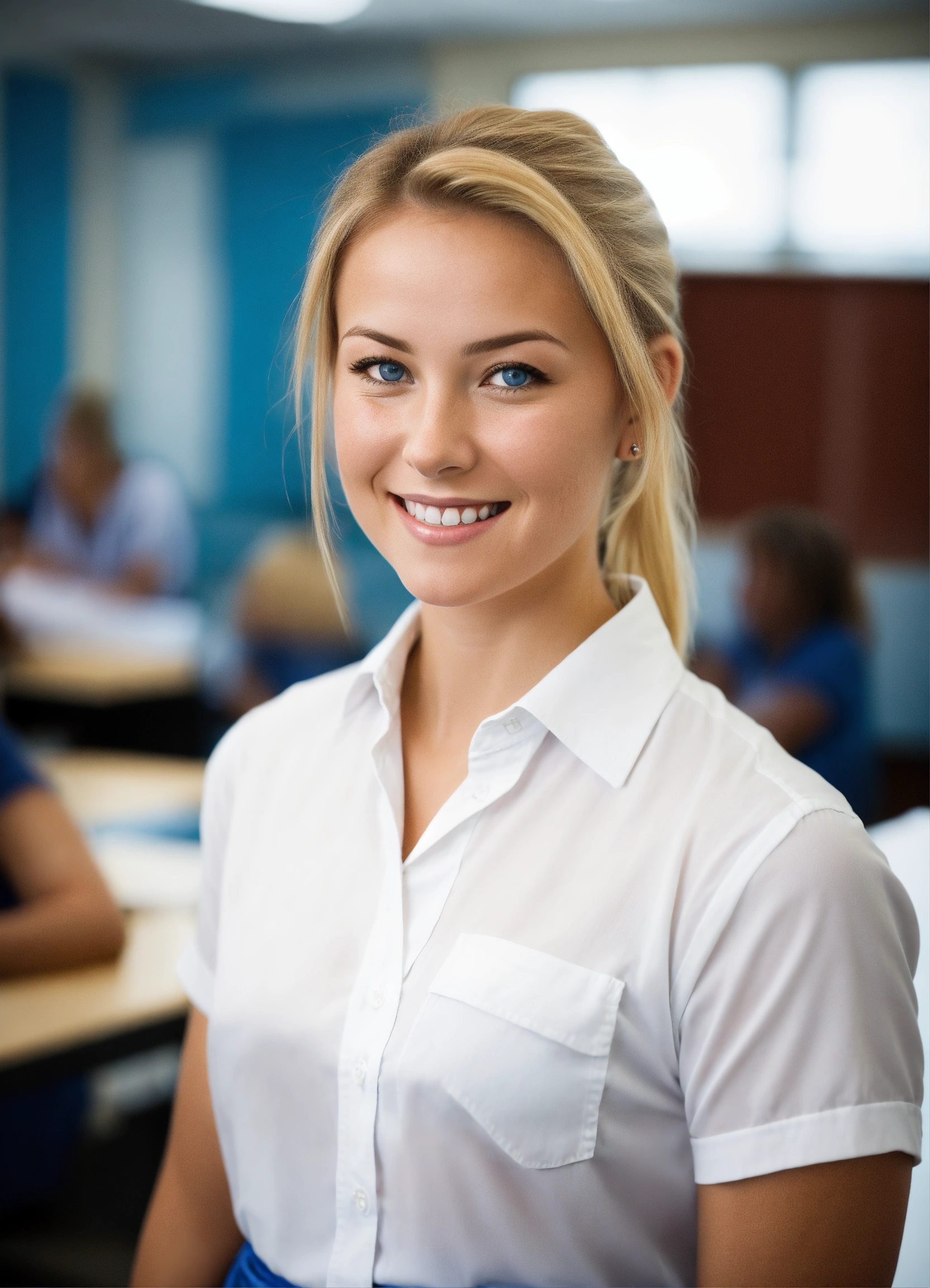Headshot of a young female teacher in her 20s with blonde hair with side swept bangs up in a ponytail, she has blue eyes, she is wearing a white shirt and a blue skirt, she is facing forward smiling, she is in a class room, realistic photo