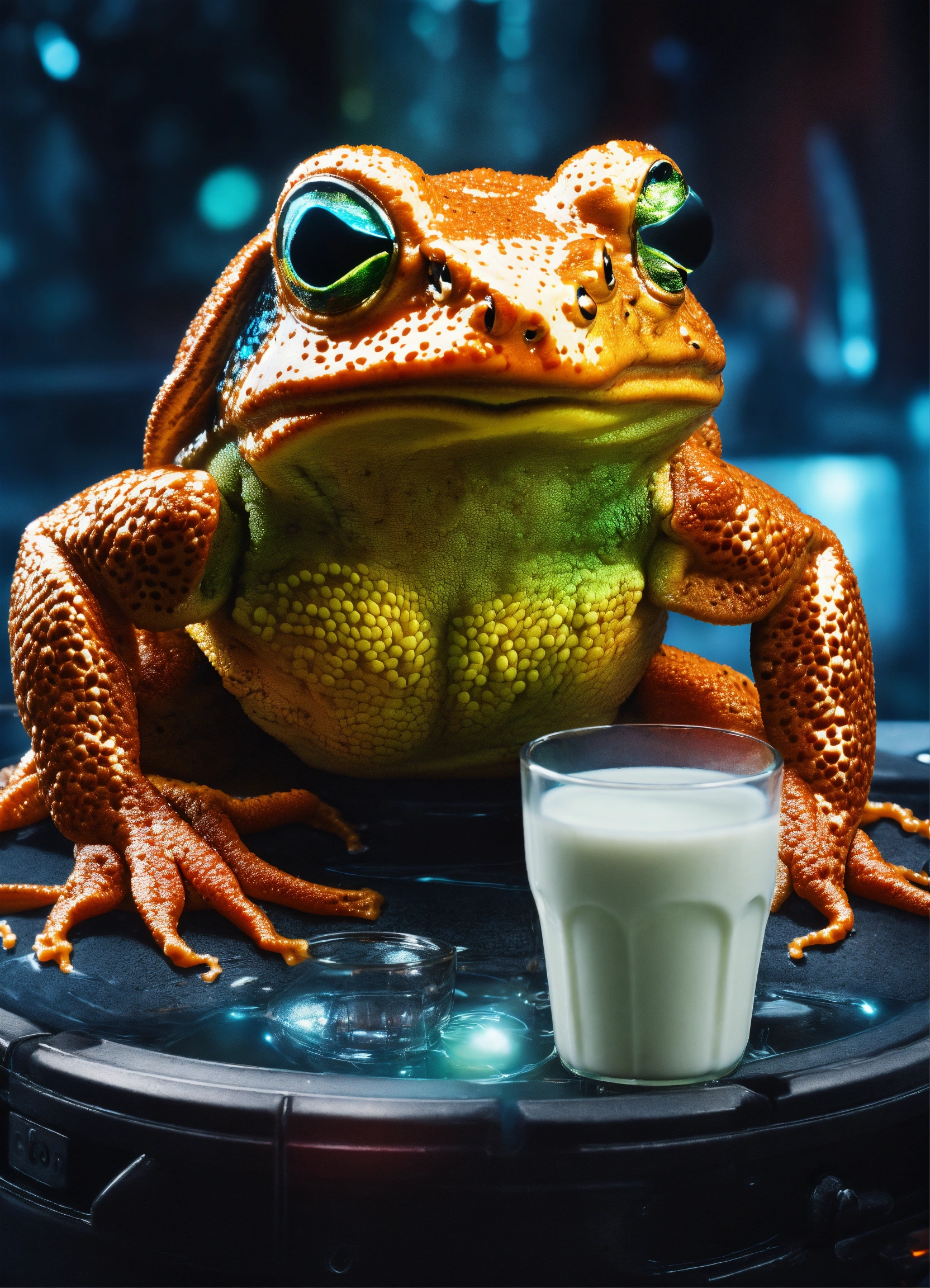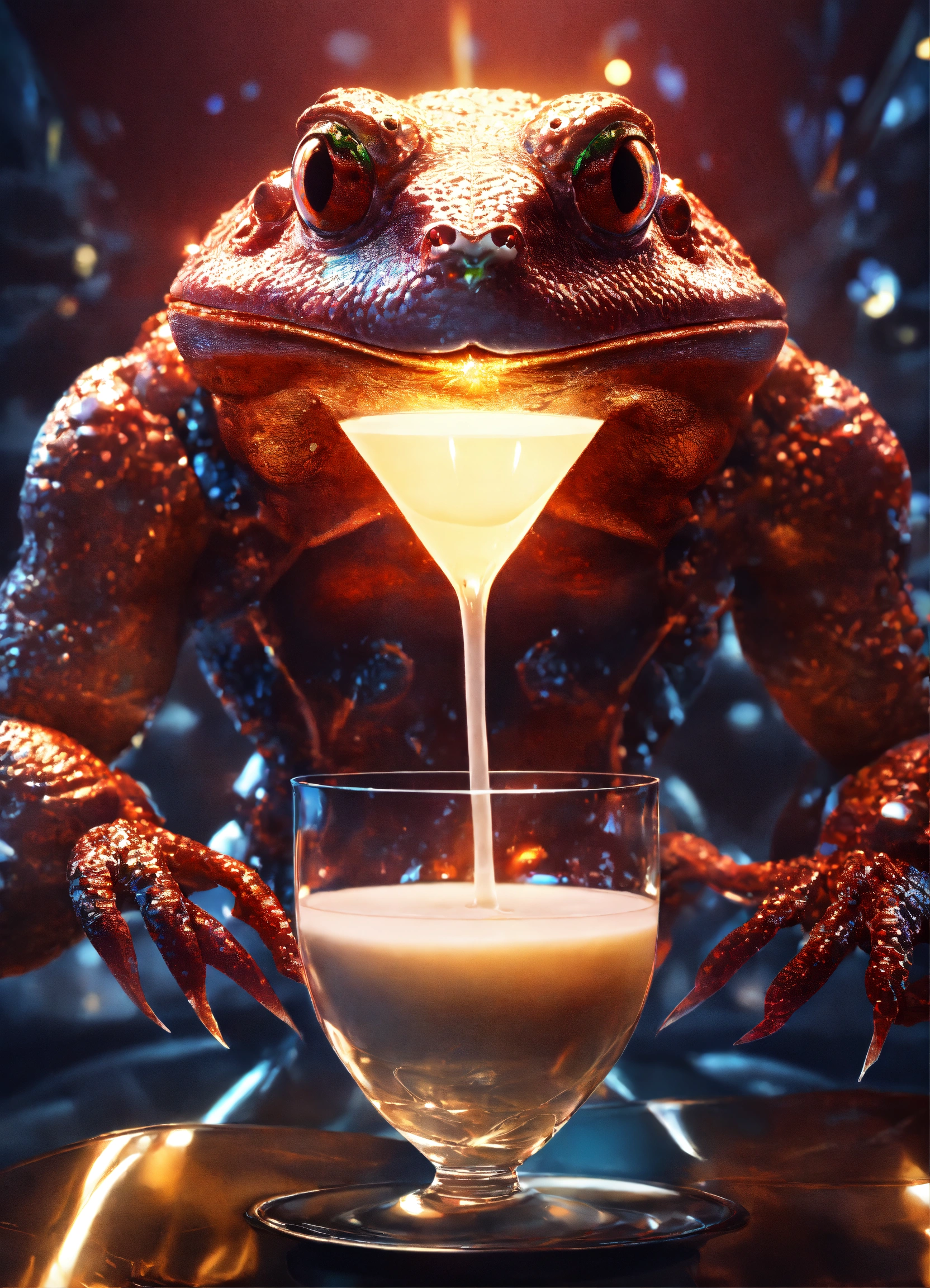 Evil demonic ai god diamond toad holding a glass of milk above a human brain, super advanced technology, futuristic, hyper digital background, extremely detailed and realistic, ominous and eery